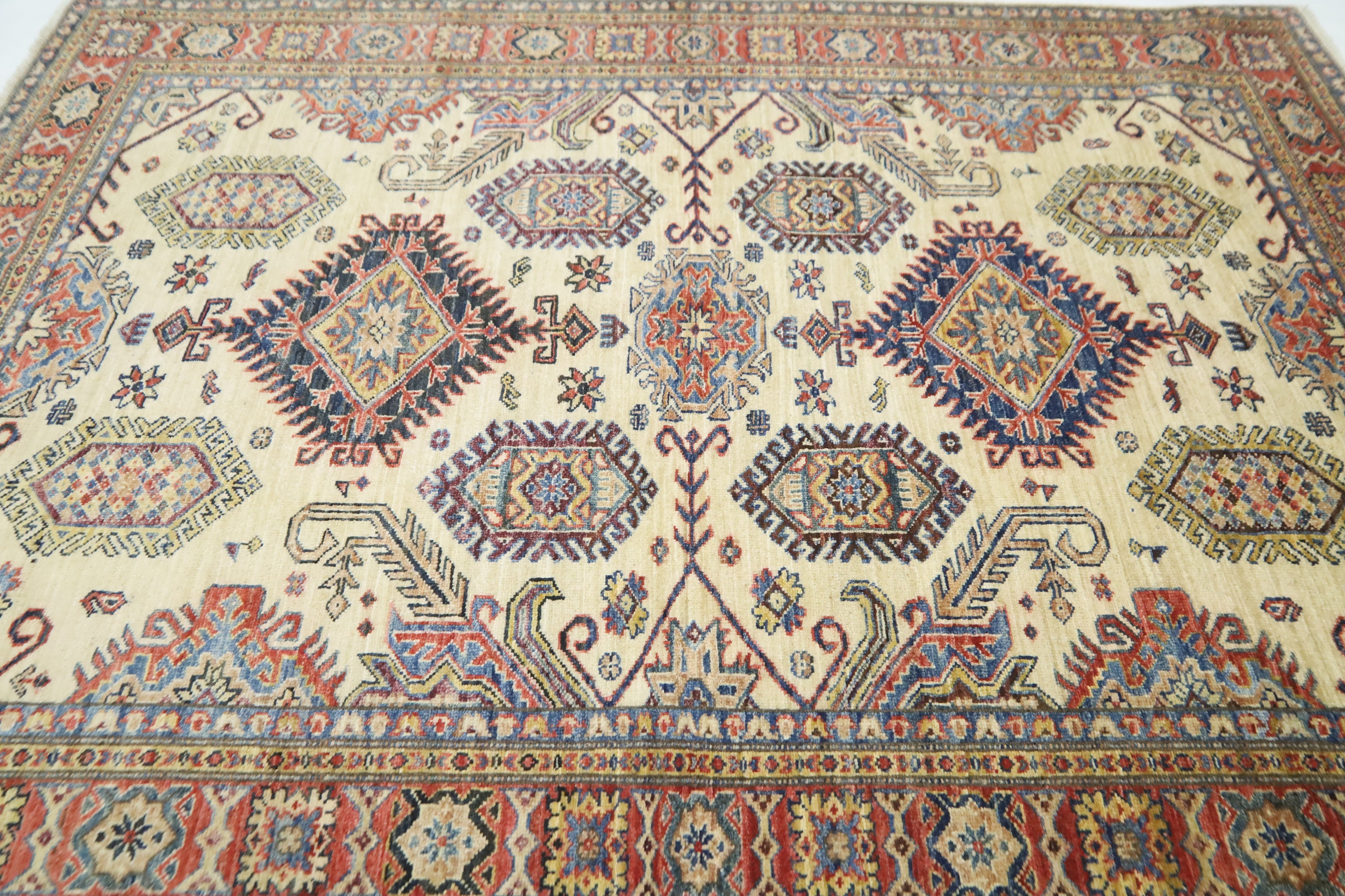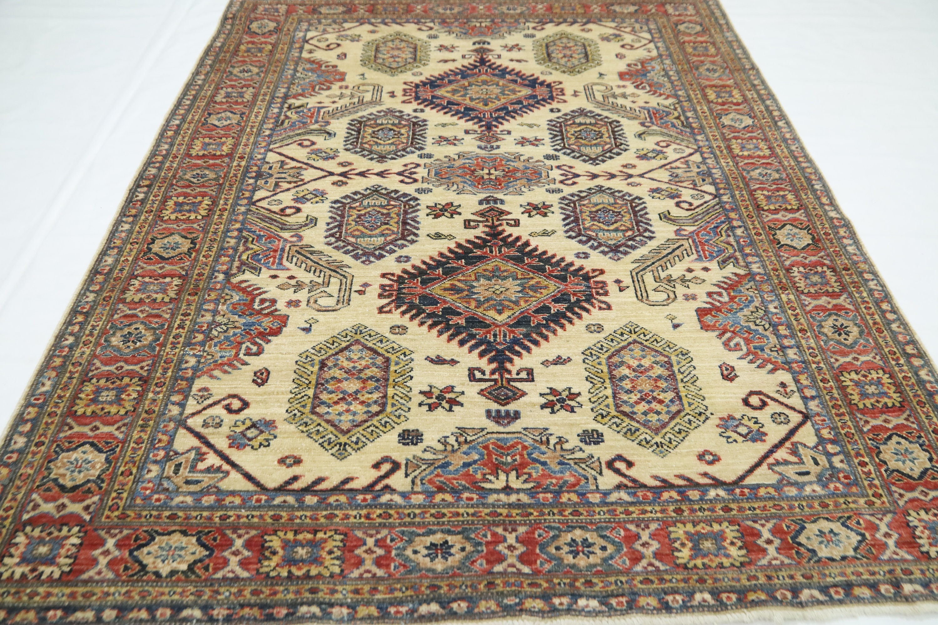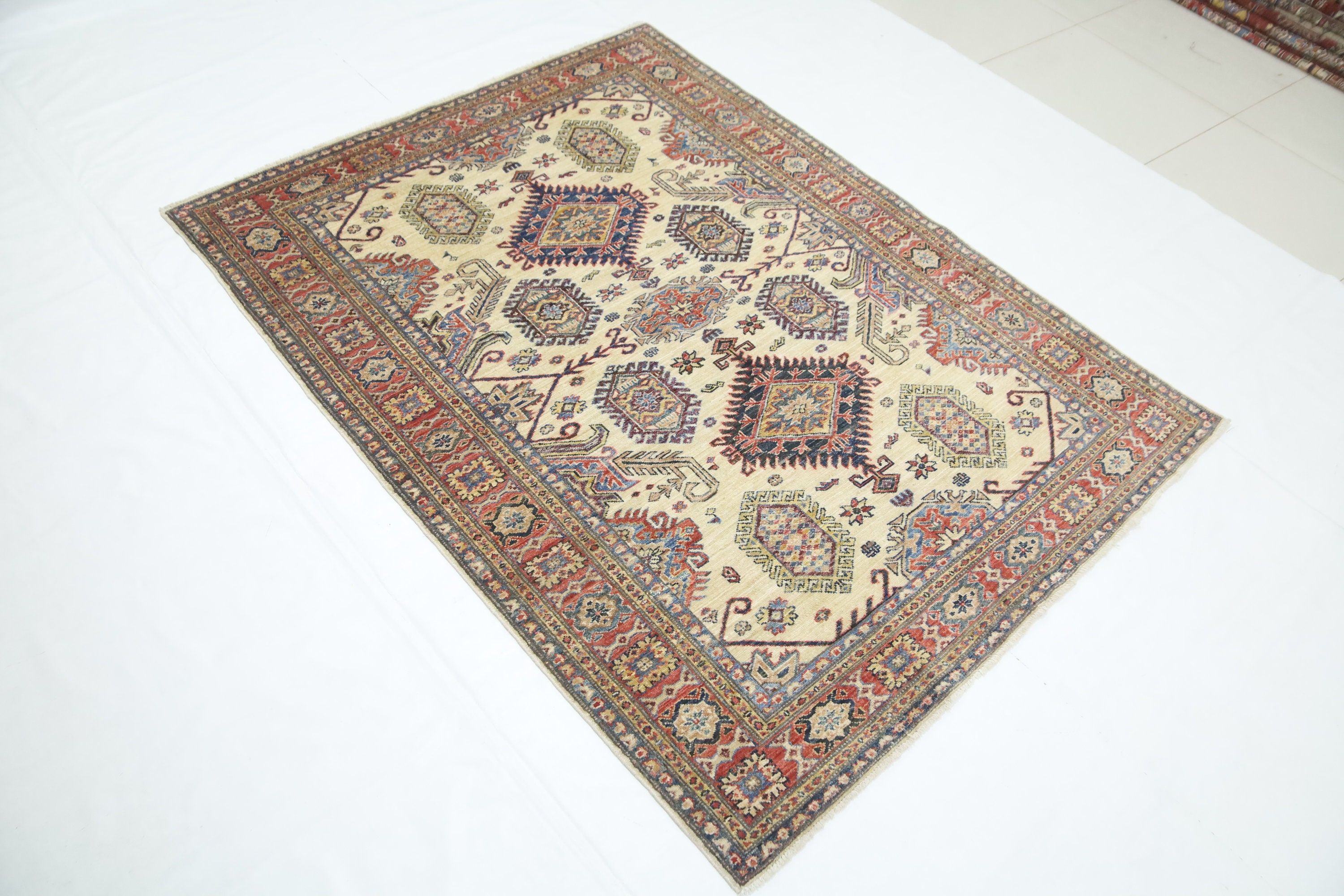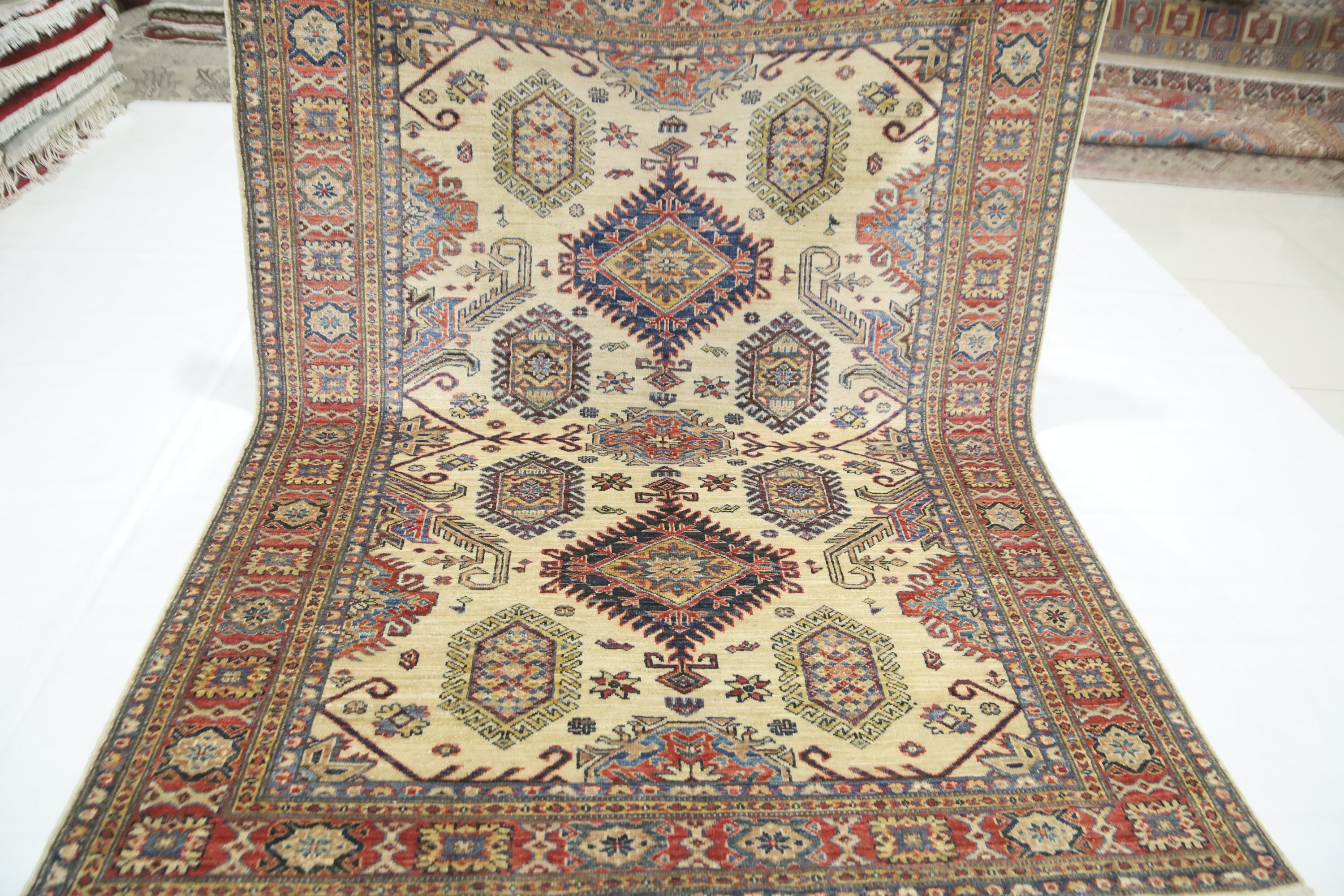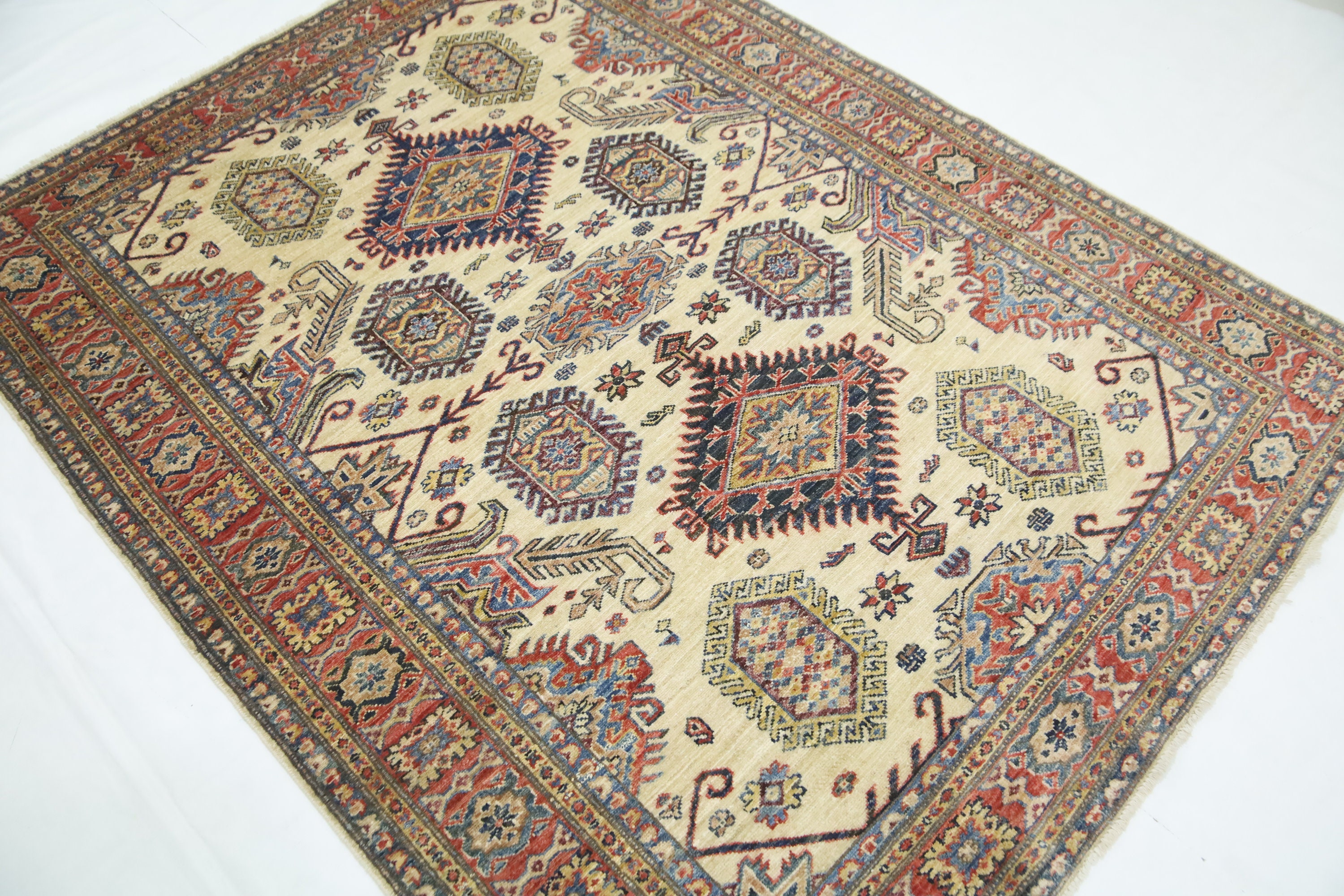 Kazak 5x7 Ft Area Rug - Beige Afghan Hand Knotted Geometric Organic Dye Wool Rug - 5x7 Kitchen Rug - Beige Bedroom Rug - Kids Room Rug