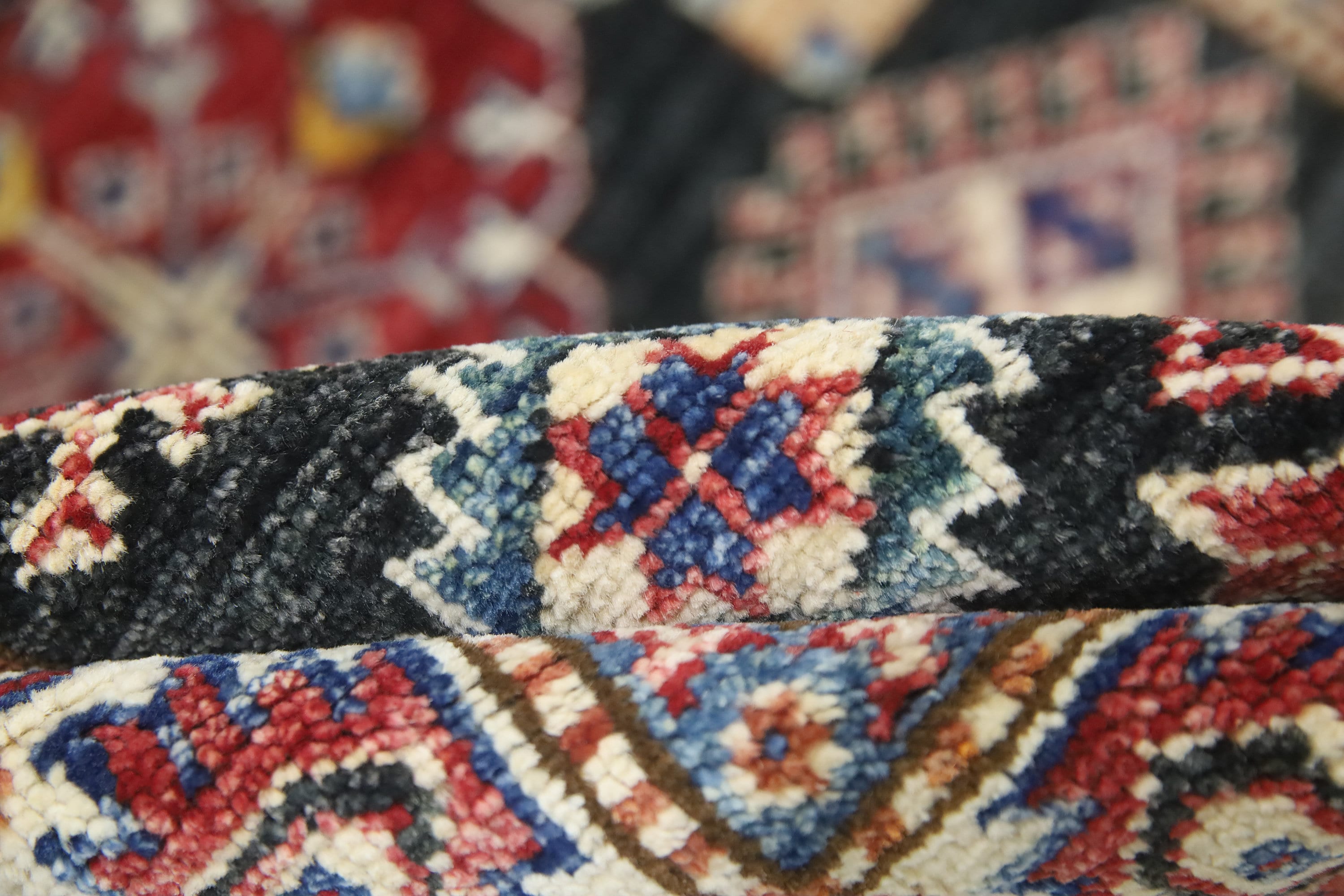 This hand-knotted pile rug is crafted using 100% natural dyes and handspun wool, giving it a rich texture and vibrant colors.