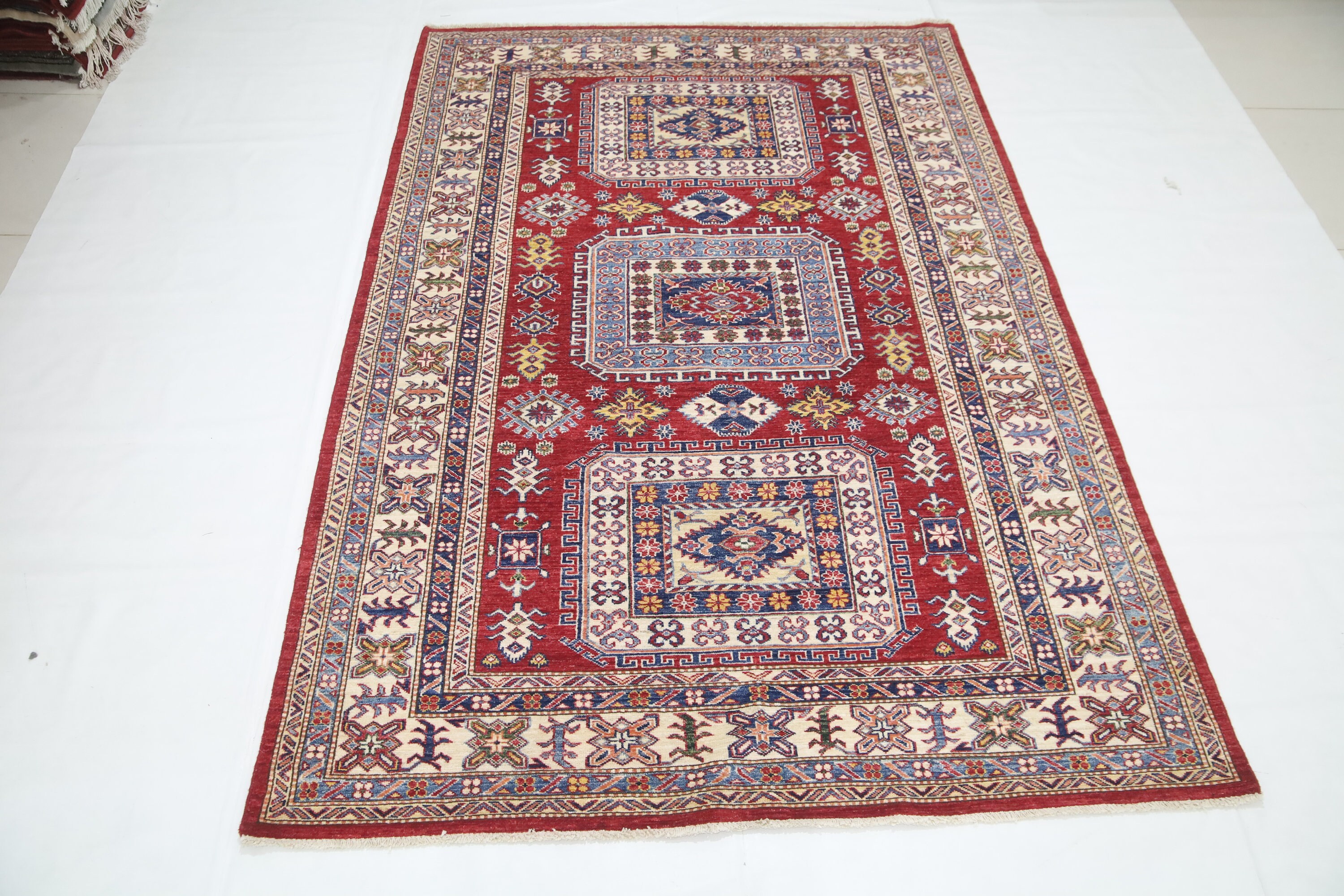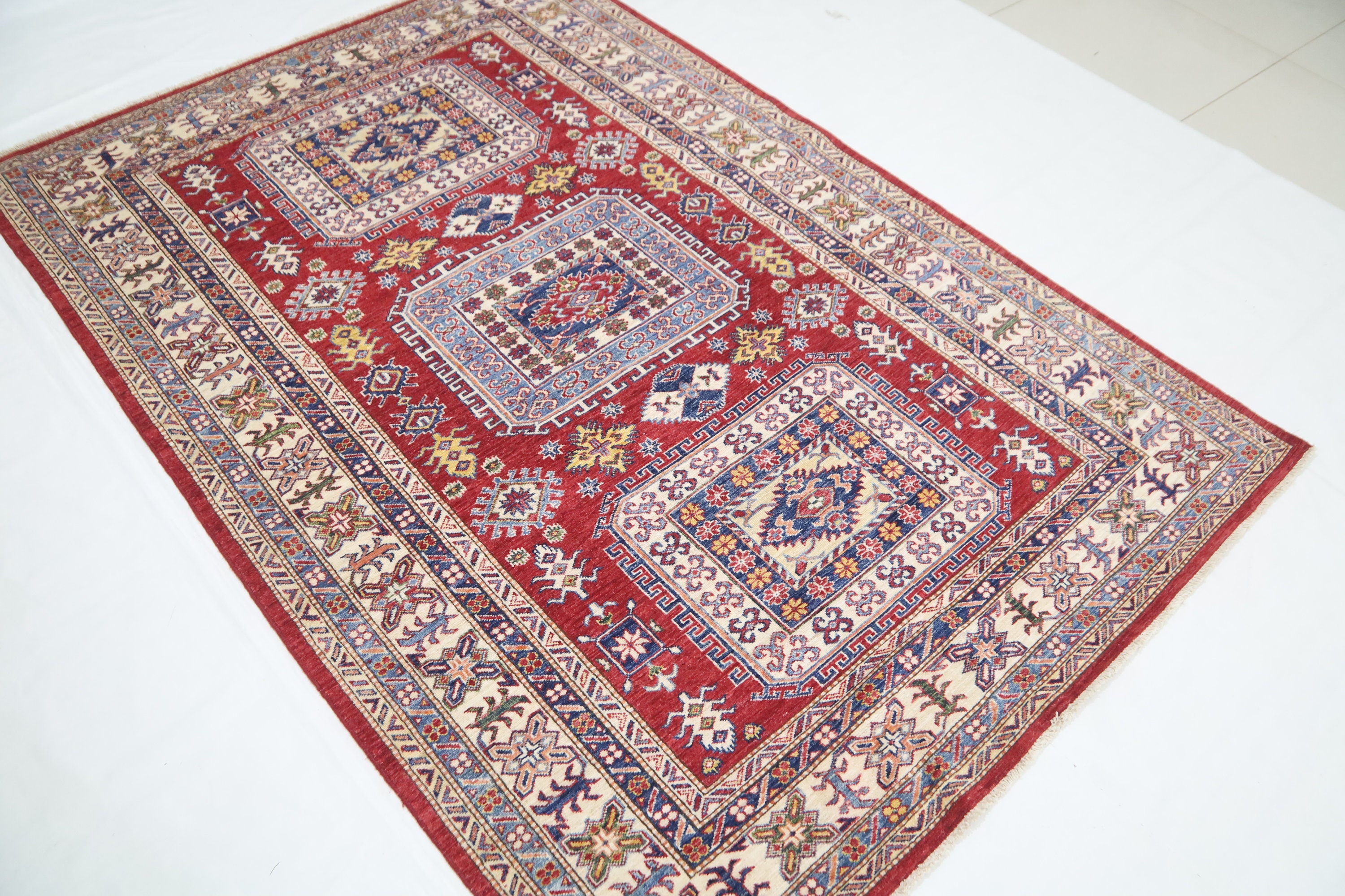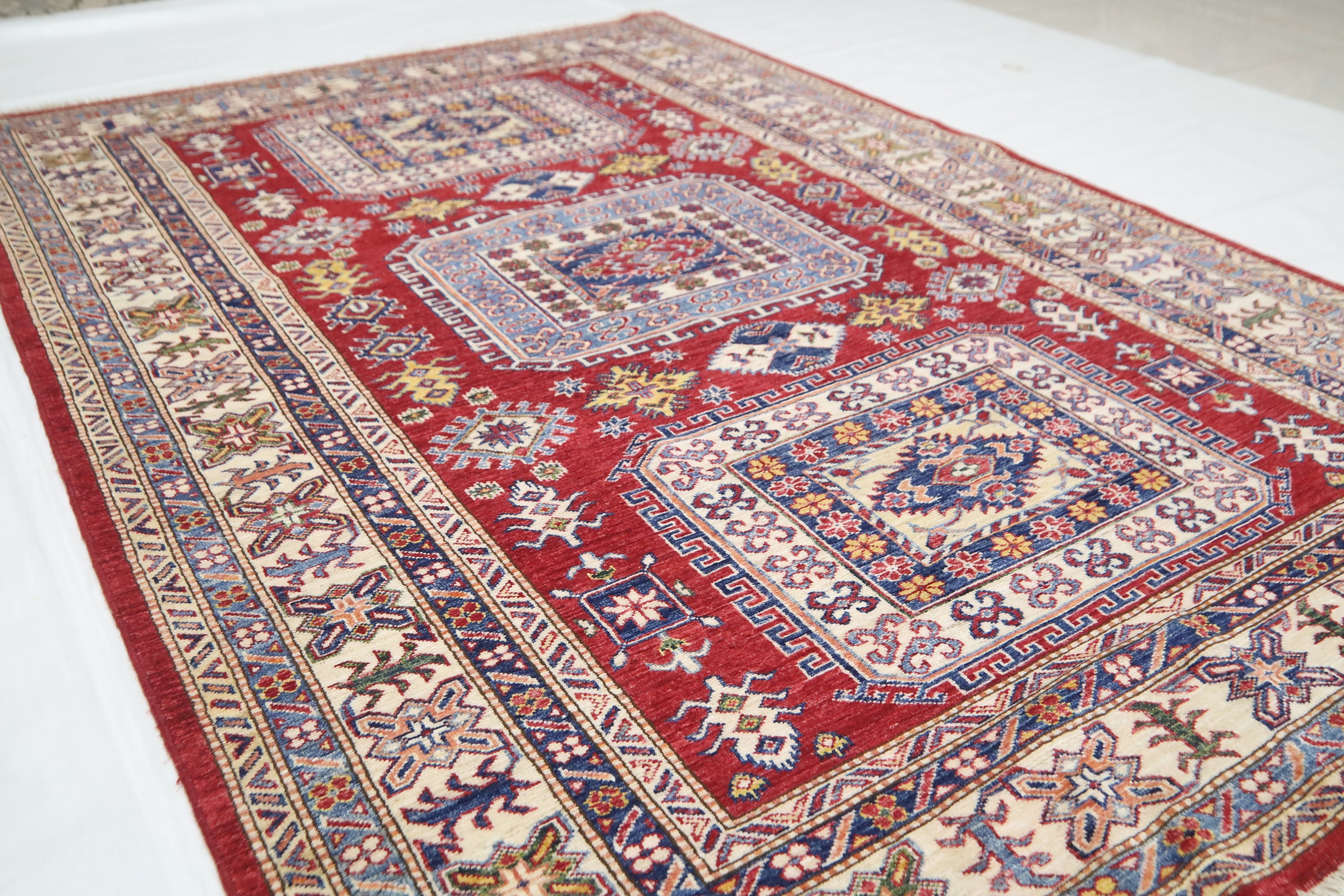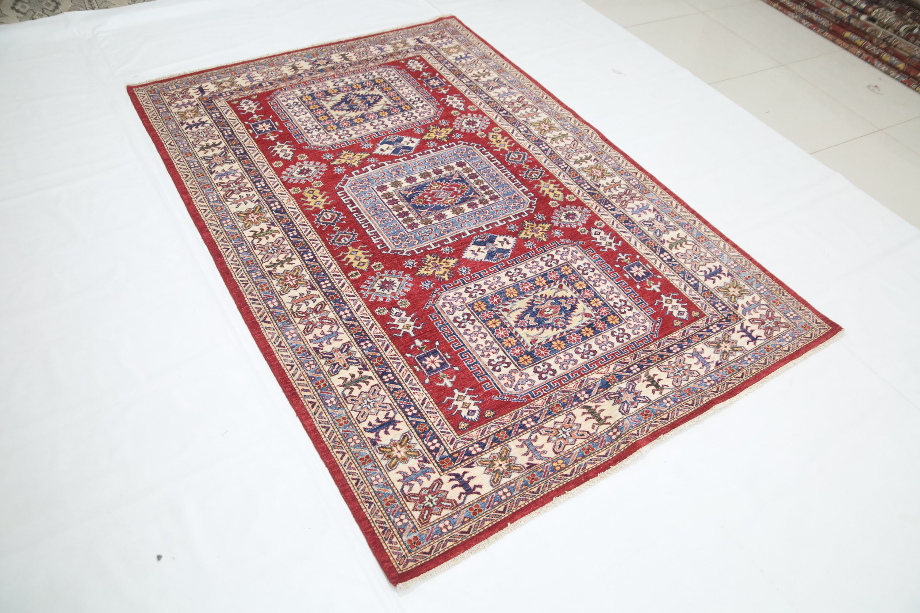 5x8 Kazak Red Area Rug - Afghan Hand Made Traditional Fine Quality Wool Rug - Geometric Rug - Entryway Rug - Bedroom Rug - Kitchen Rug