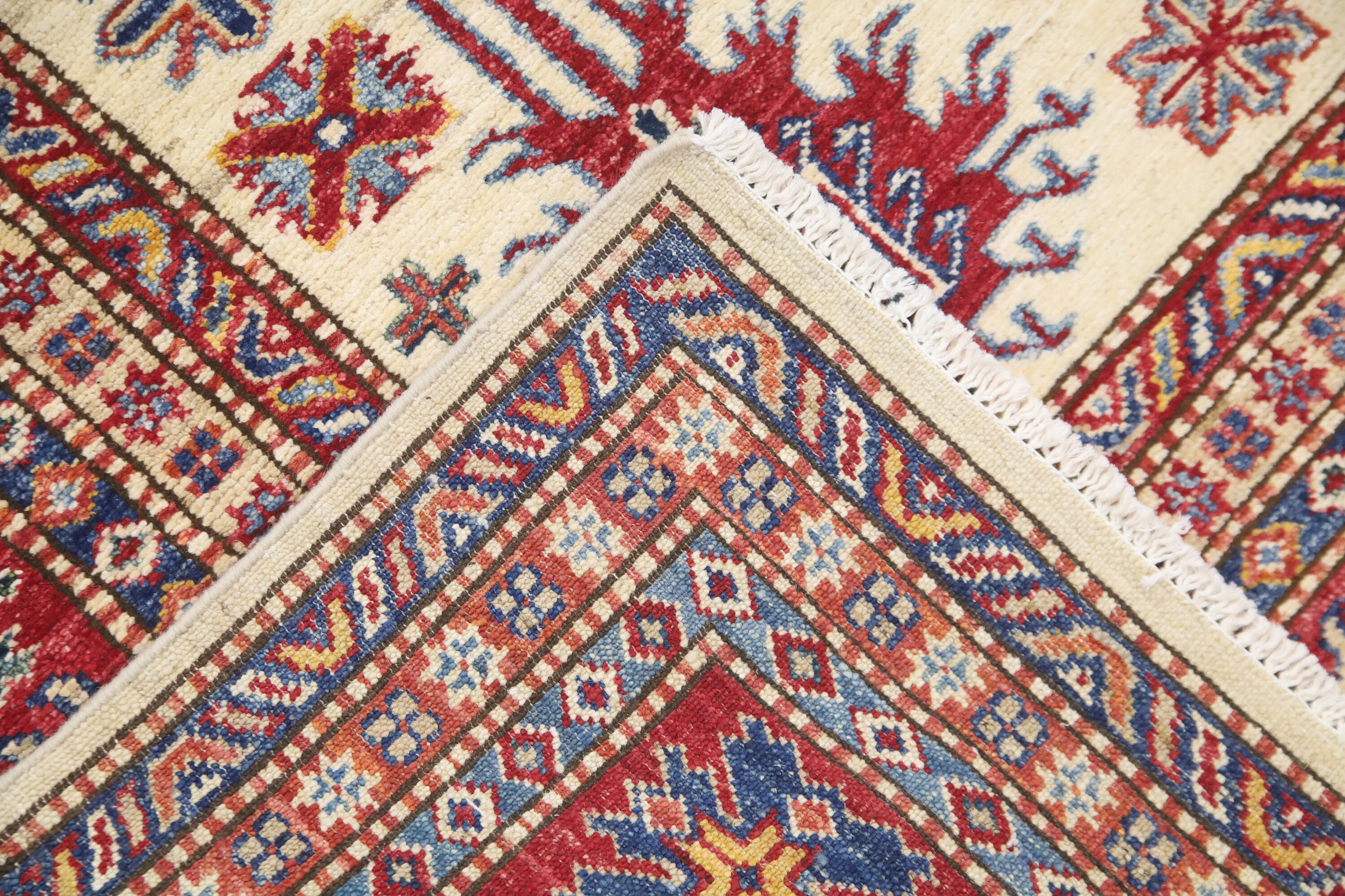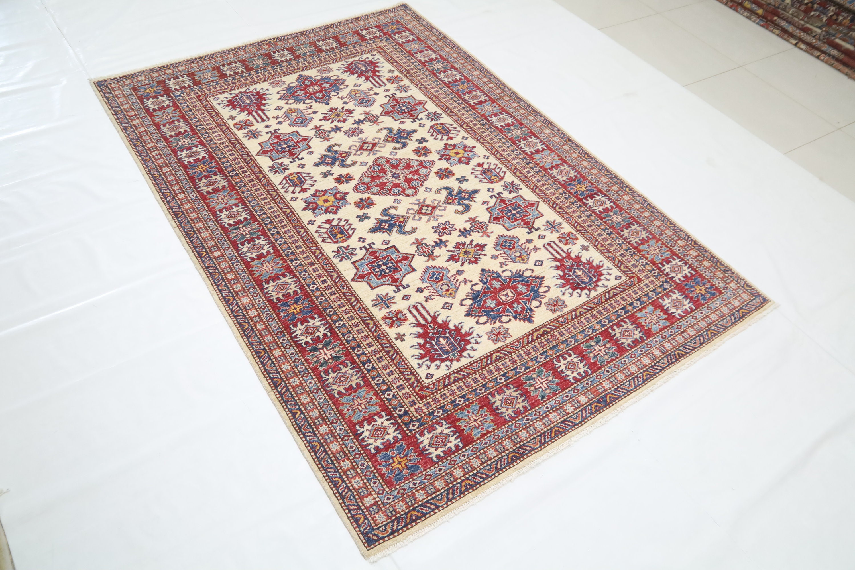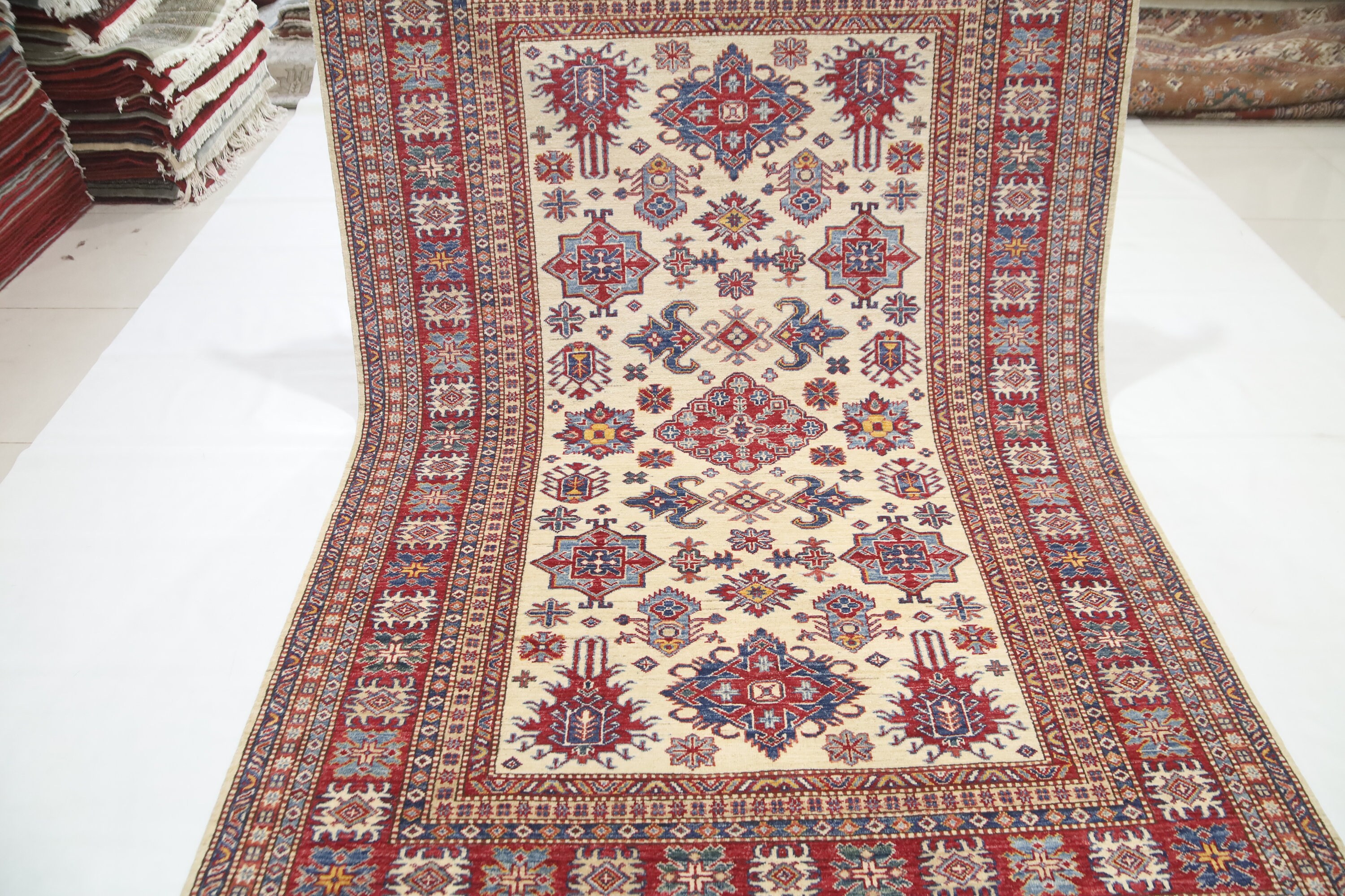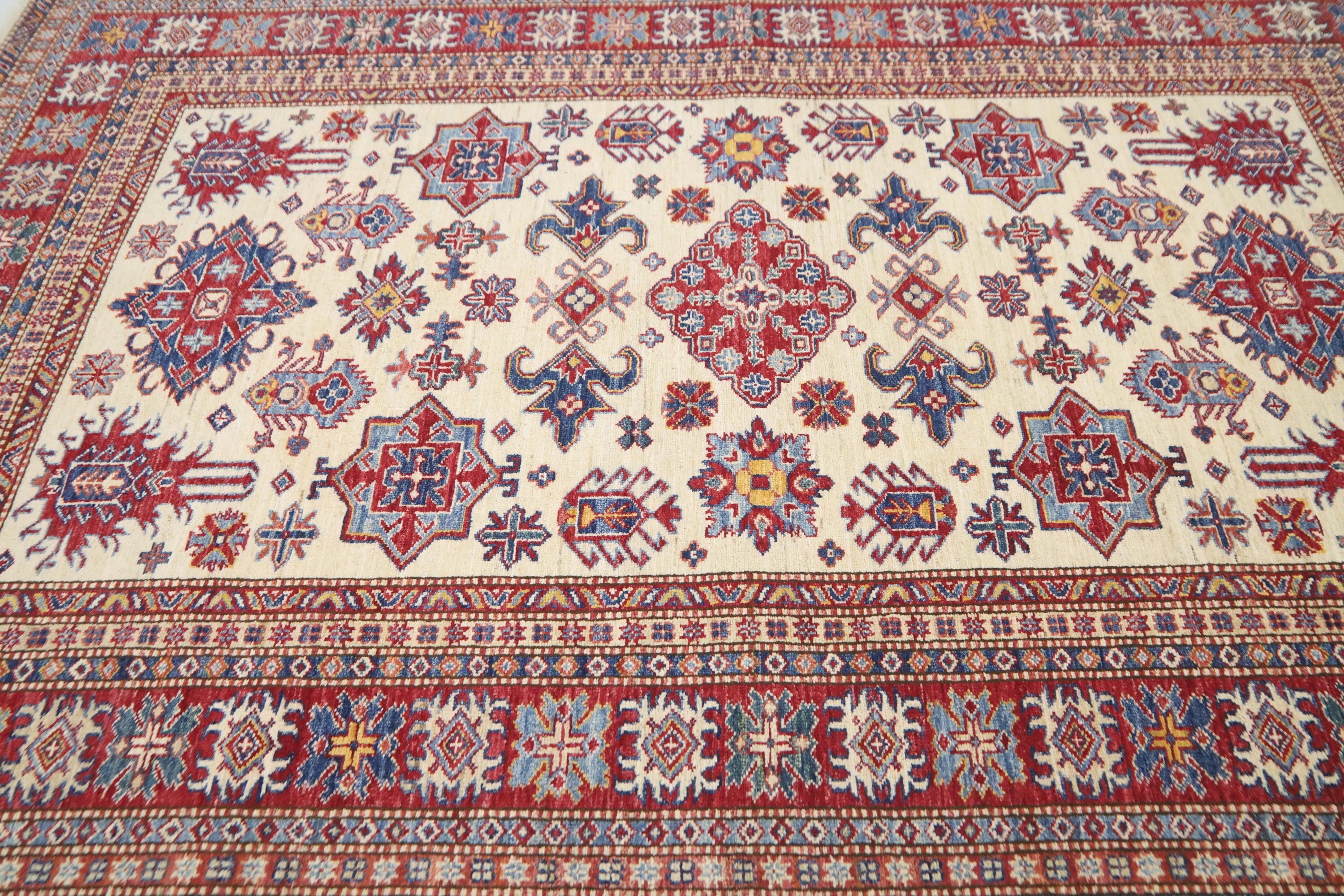 6x8 Feet Kazak Area Rug - Beige Red Afghan Hand Made Traditional Veg Dye Wool Rug - Geometric Rug - Entryway Rug - Kitchen Rug - Bedroom Rug