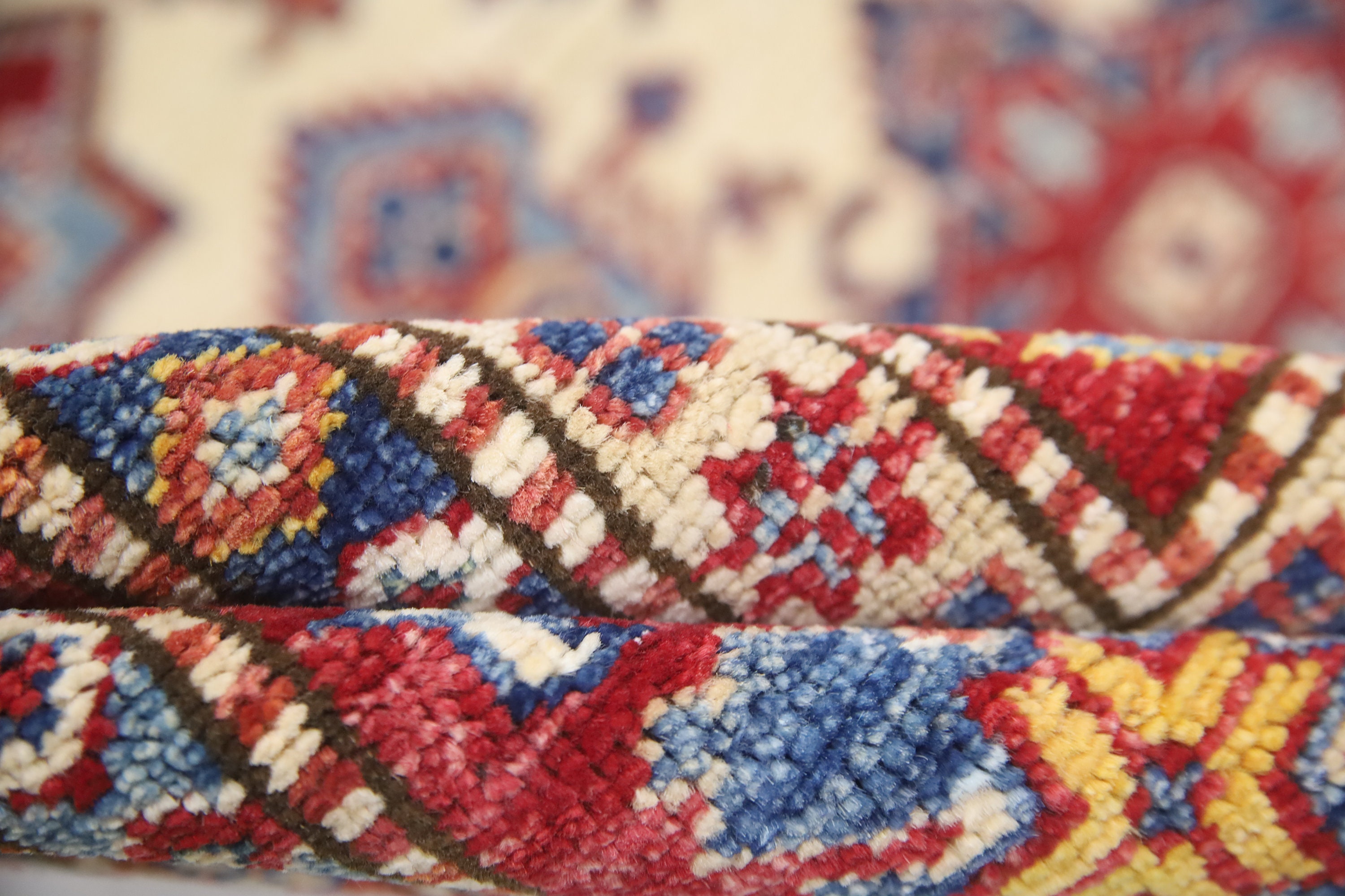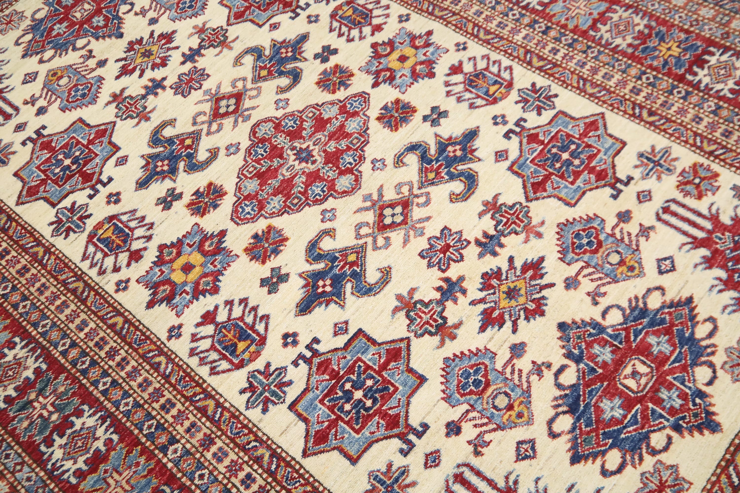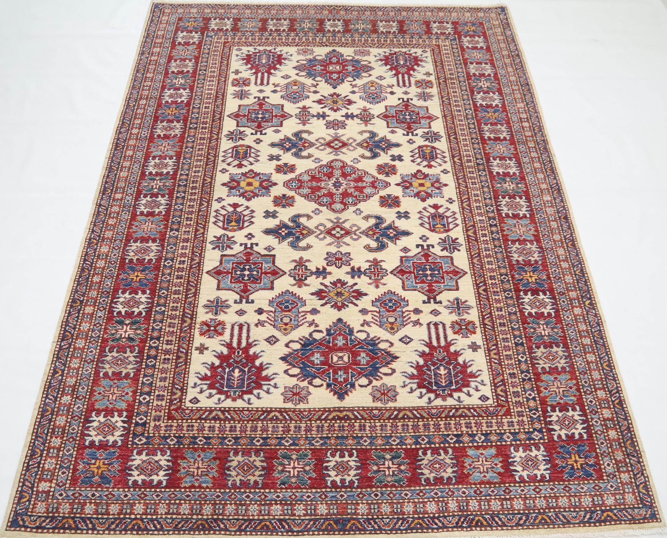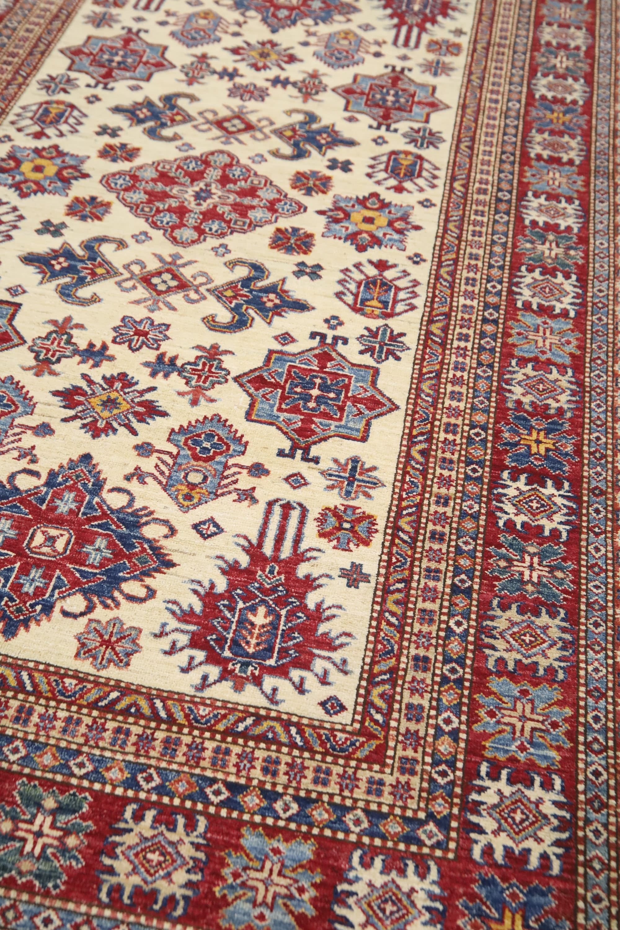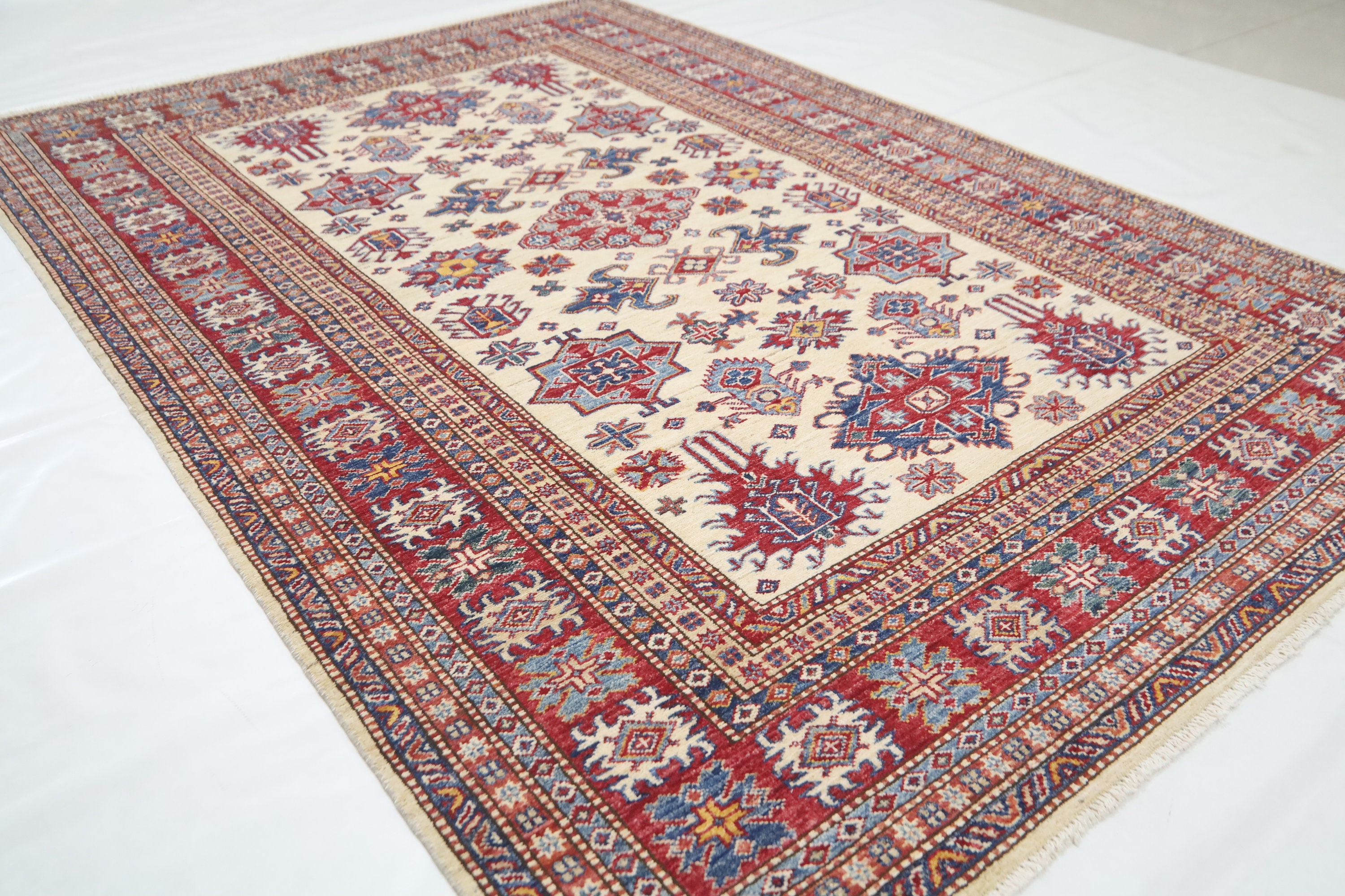6x8 Feet Kazak Area Rug - Beige Red Afghan Hand Made Traditional Veg Dye Wool Rug - Geometric Rug - Entryway Rug - Kitchen Rug - Bedroom Rug