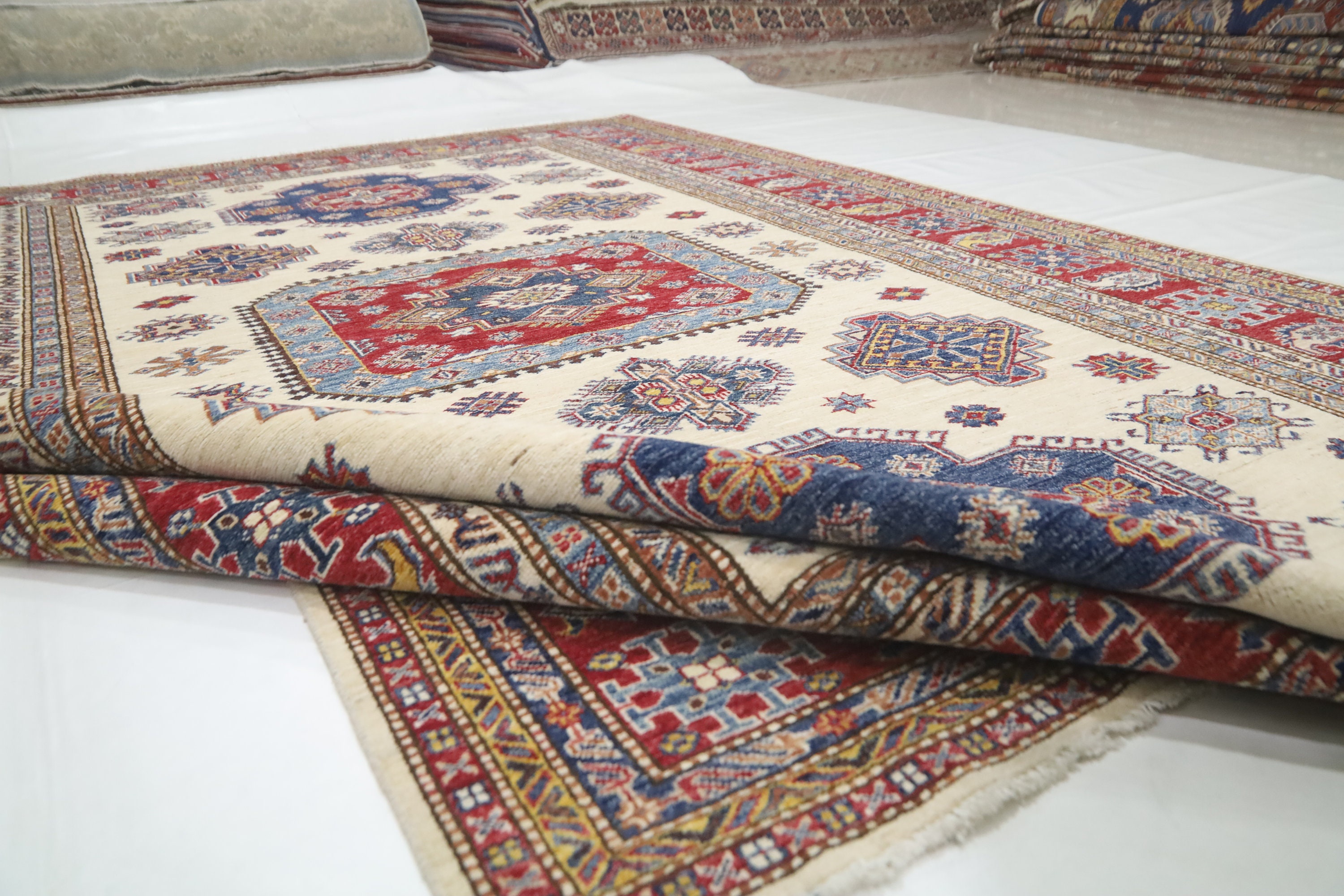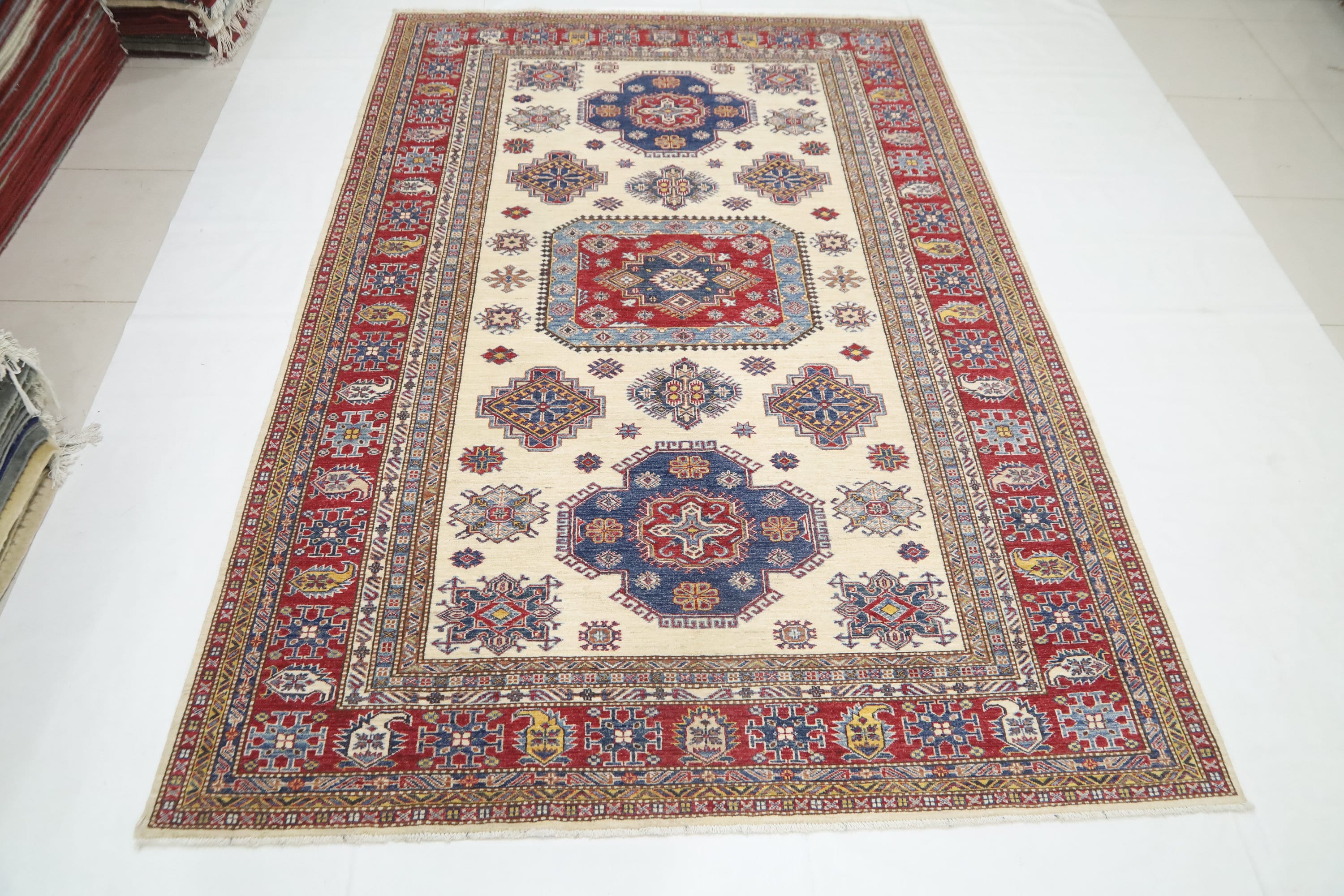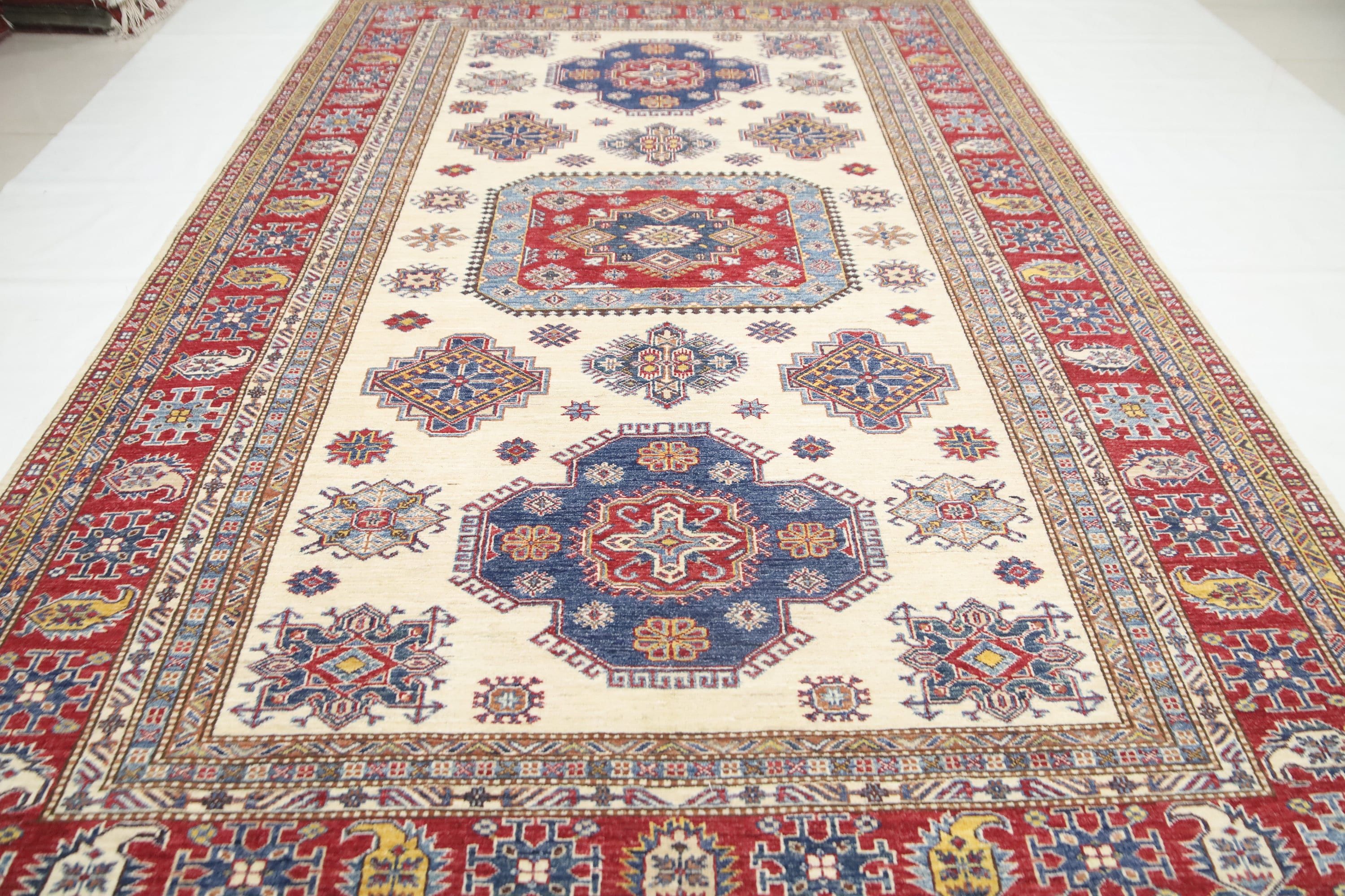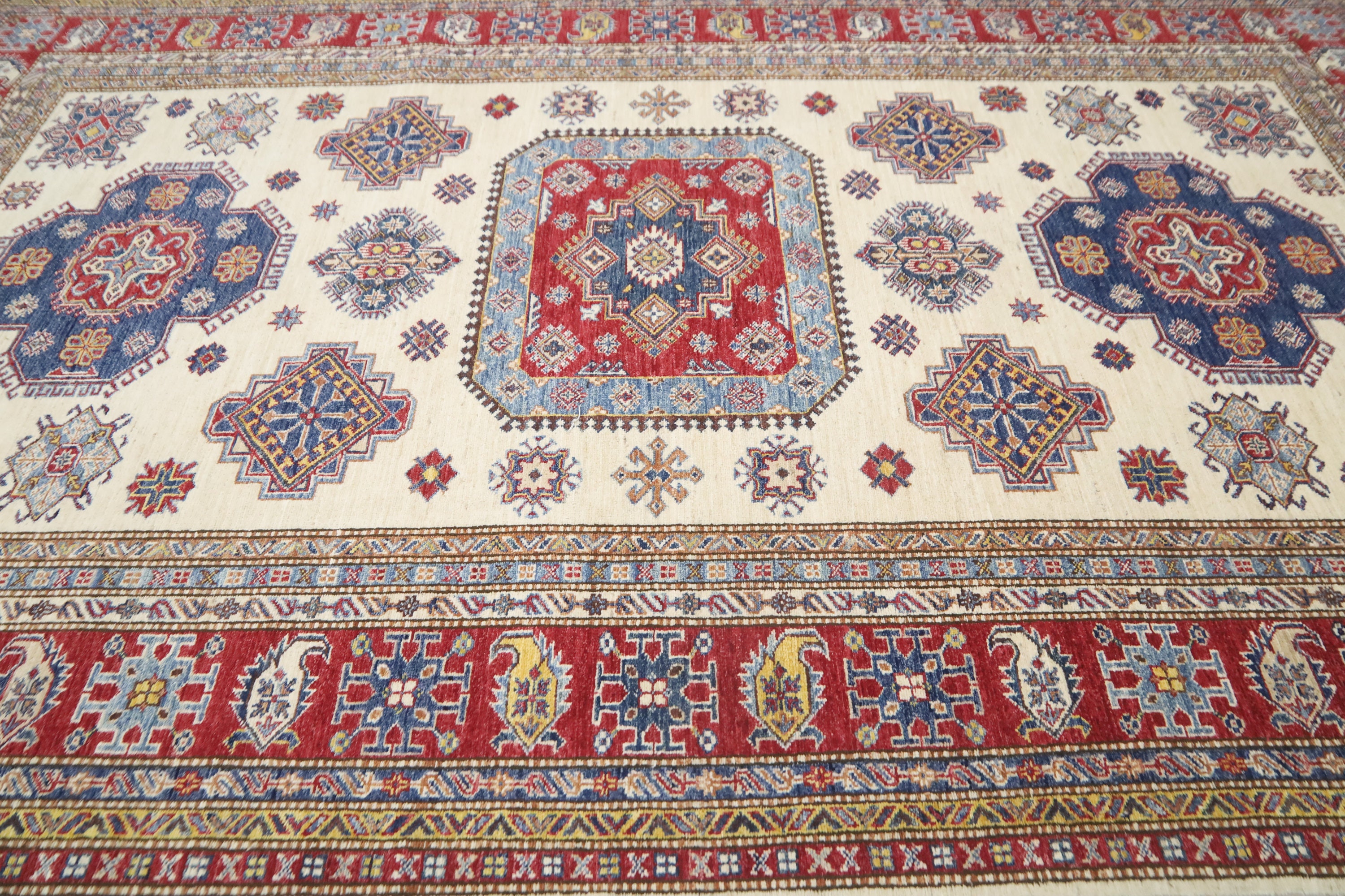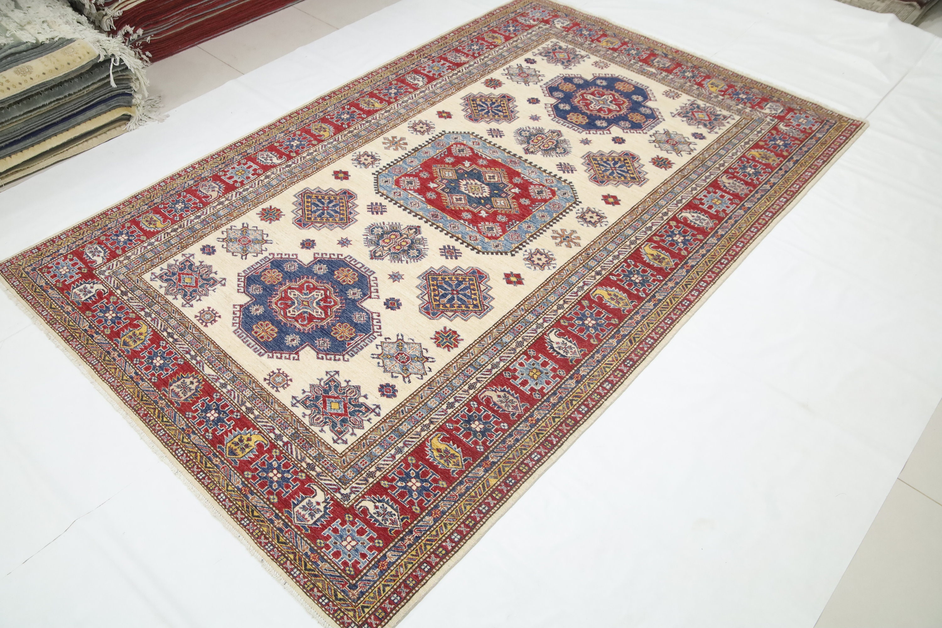 7x10 Beige Kazak Area Rug - Afghan Hand Made Geometric Design Fine Quality Wool Rug - Bedroom Rug - Living Room Rug - Dining Room Rug