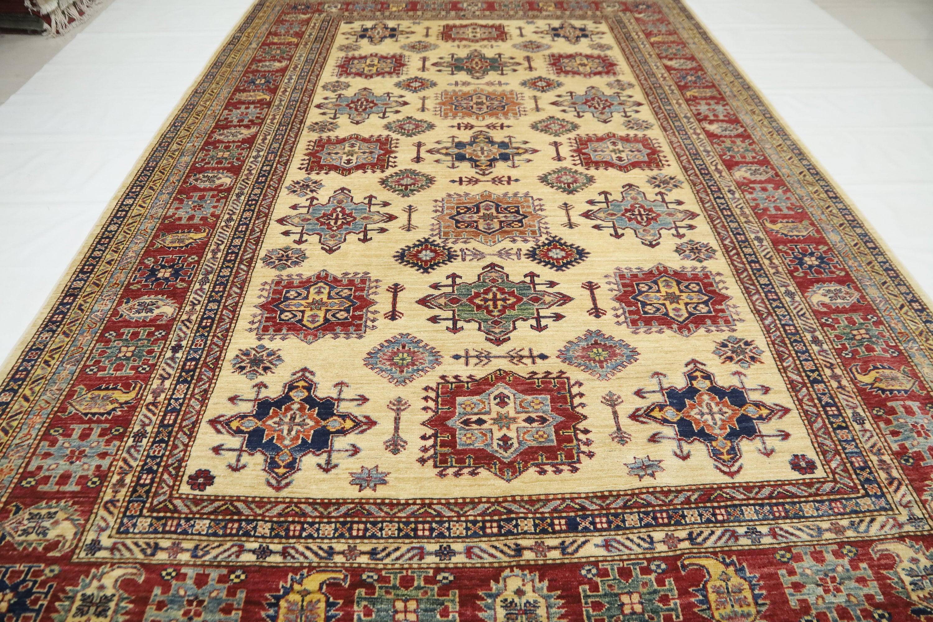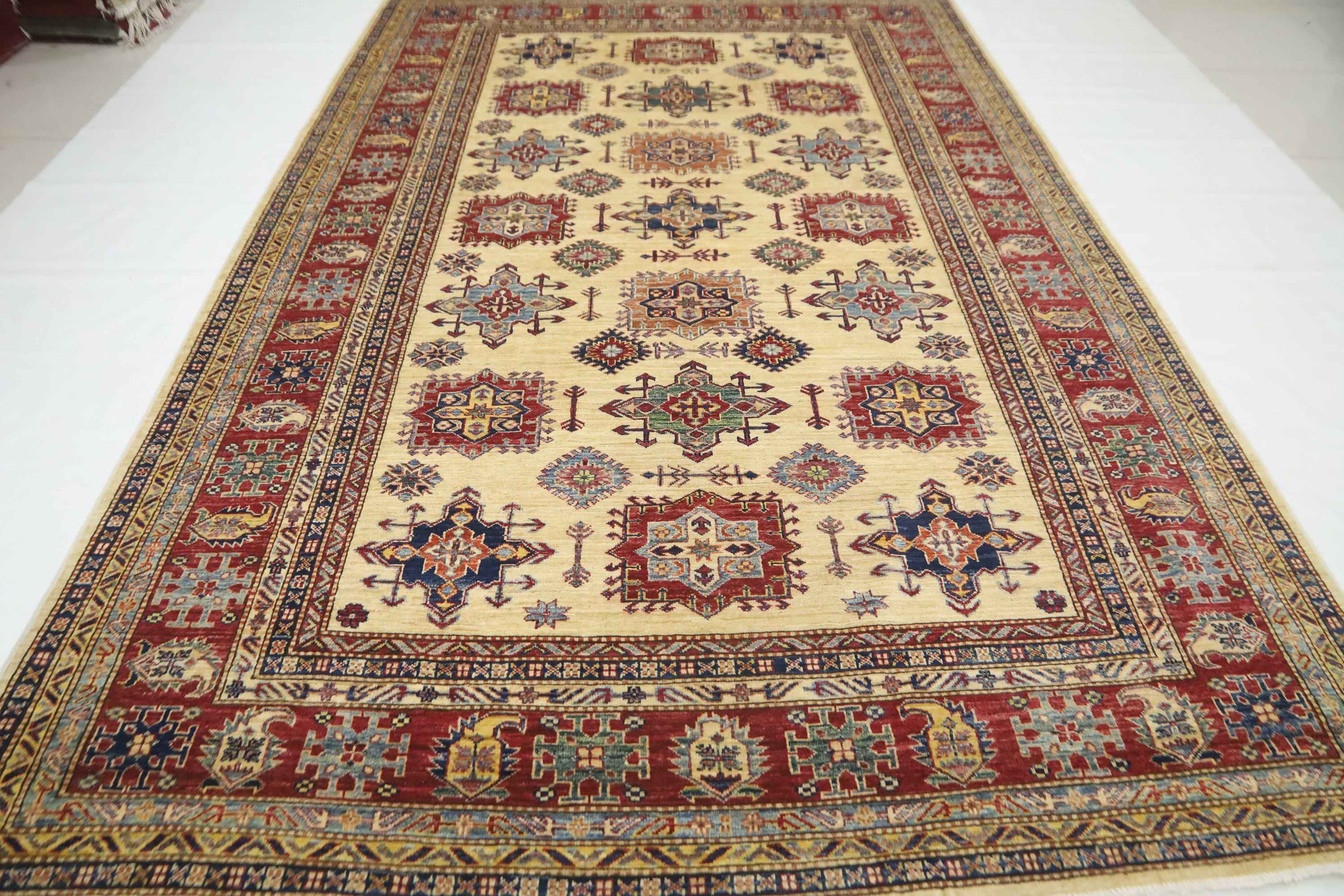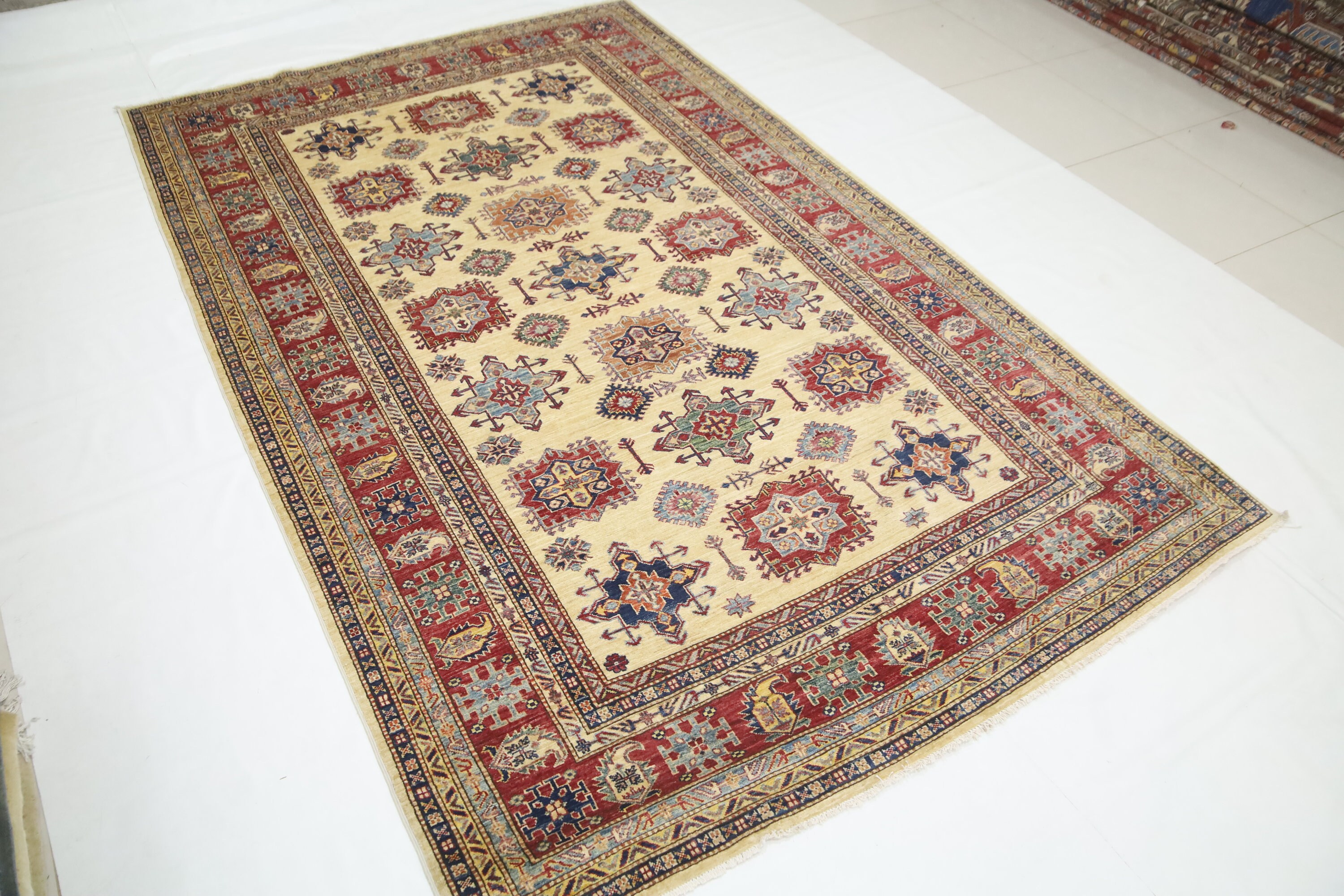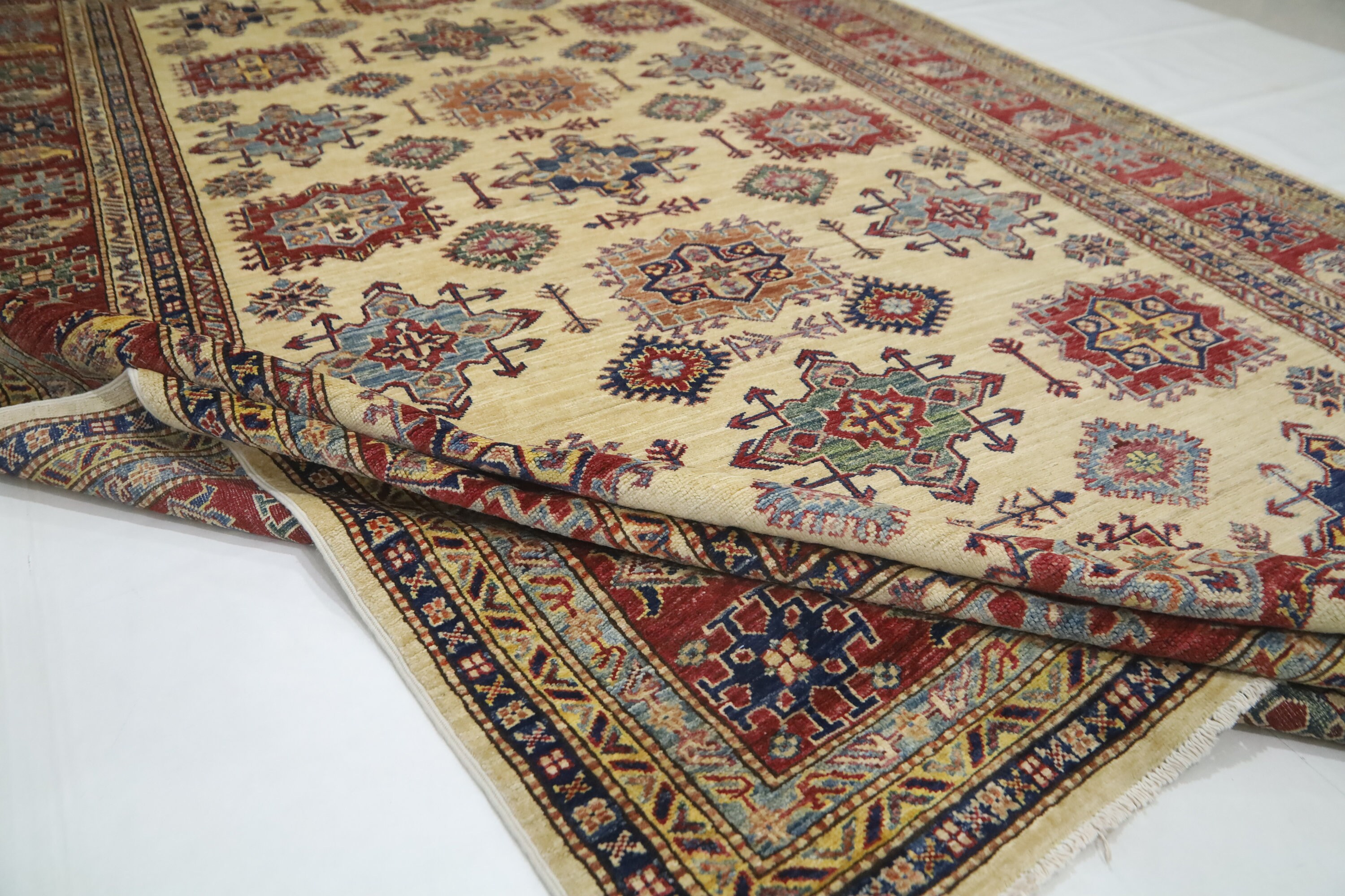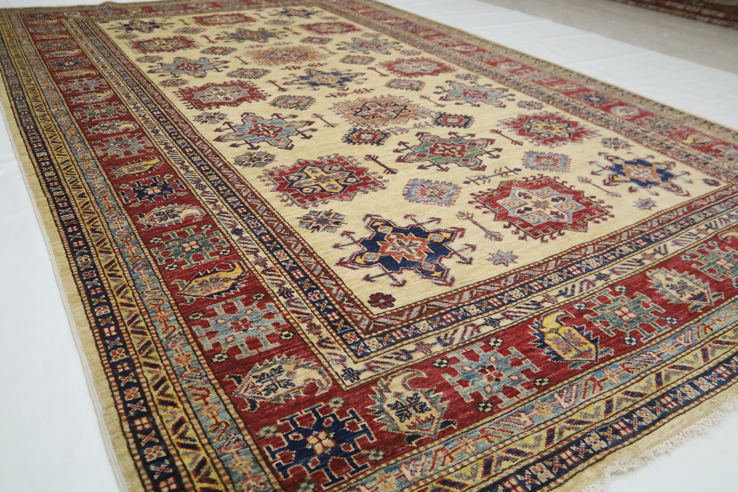7x11 Kazak Fine Quality Area Rug - Ivory Afghan Hand Made Geometric Organic Dye Wool Rug - Bedroom Rug - Dining Room Rug - Living Room Rug
