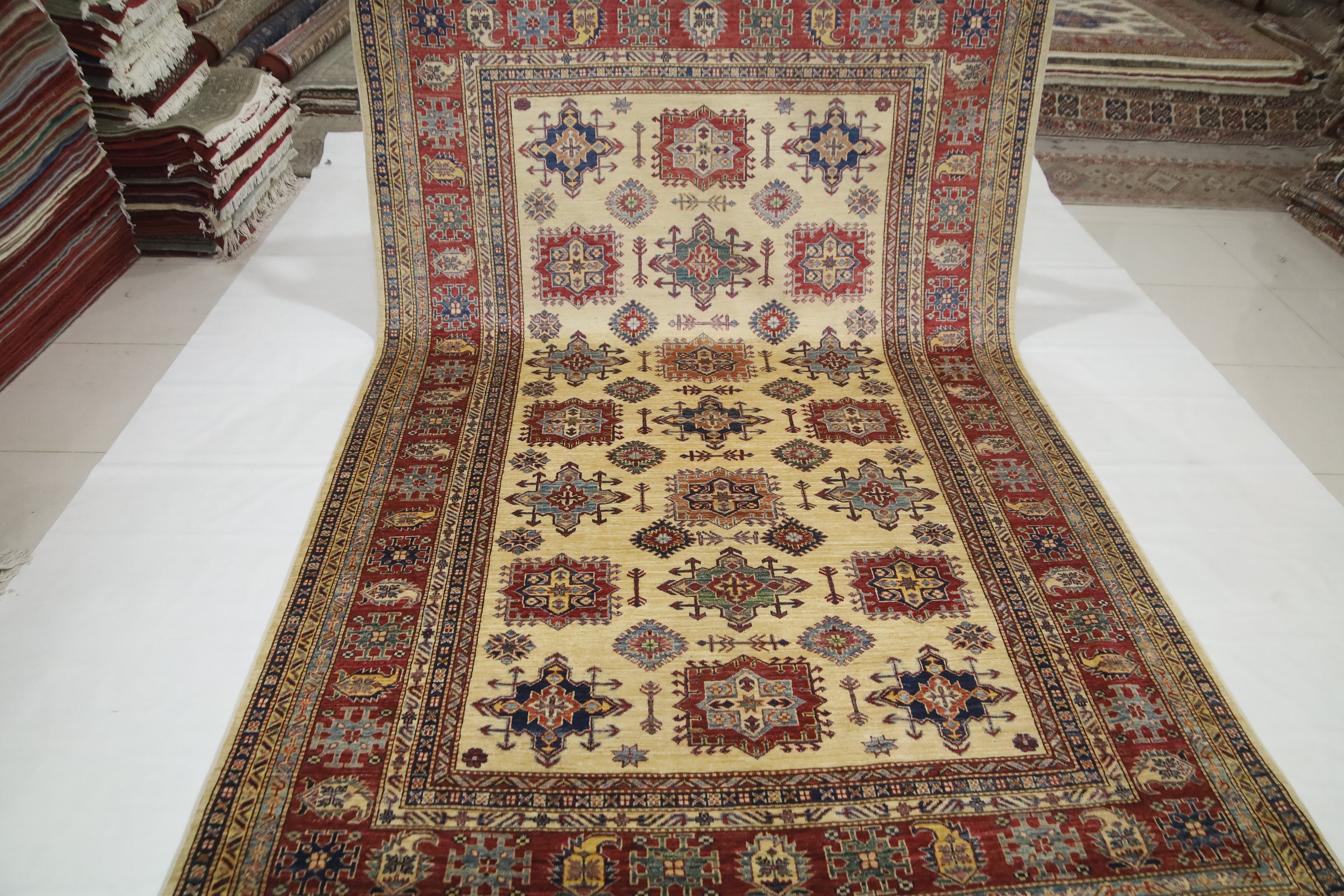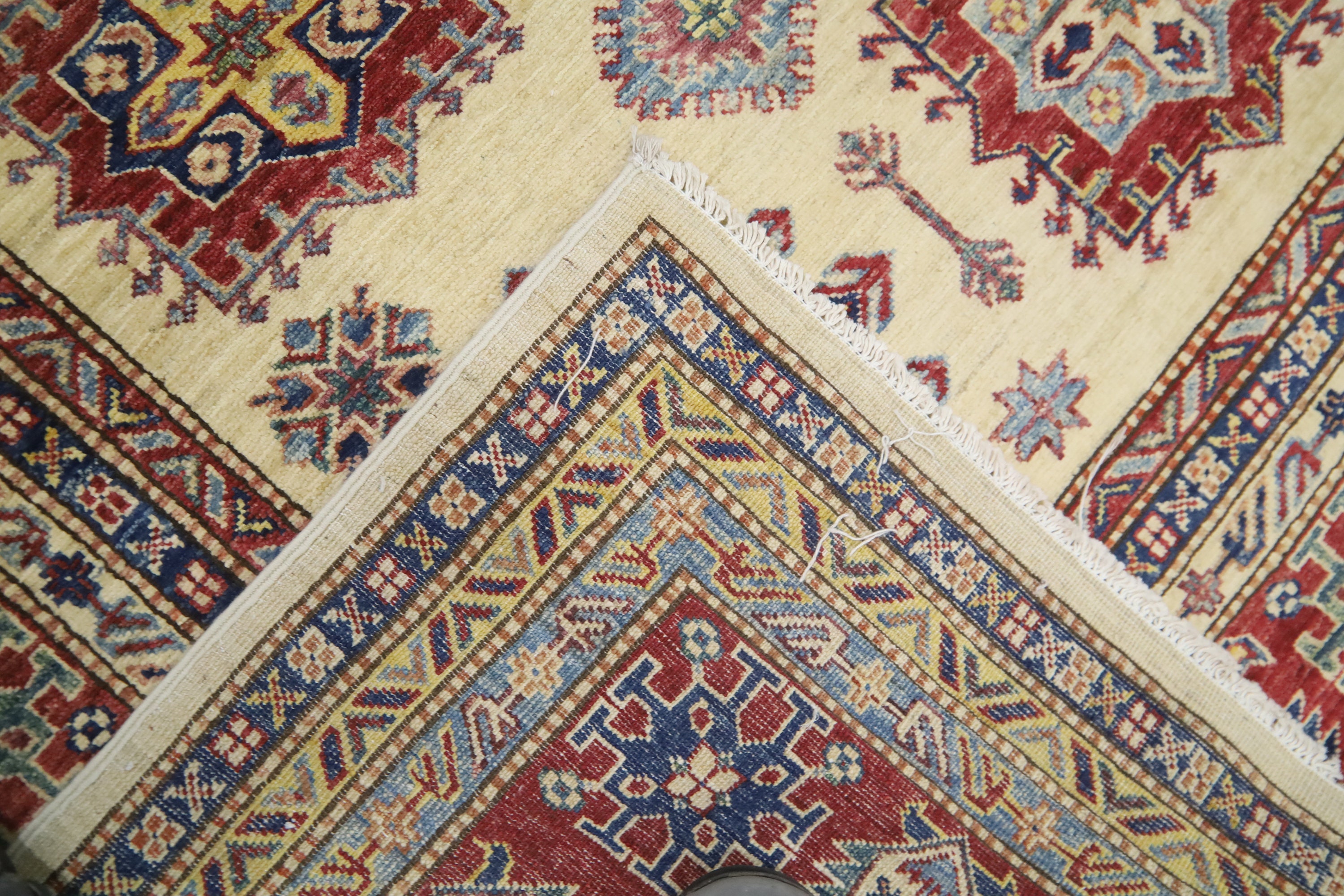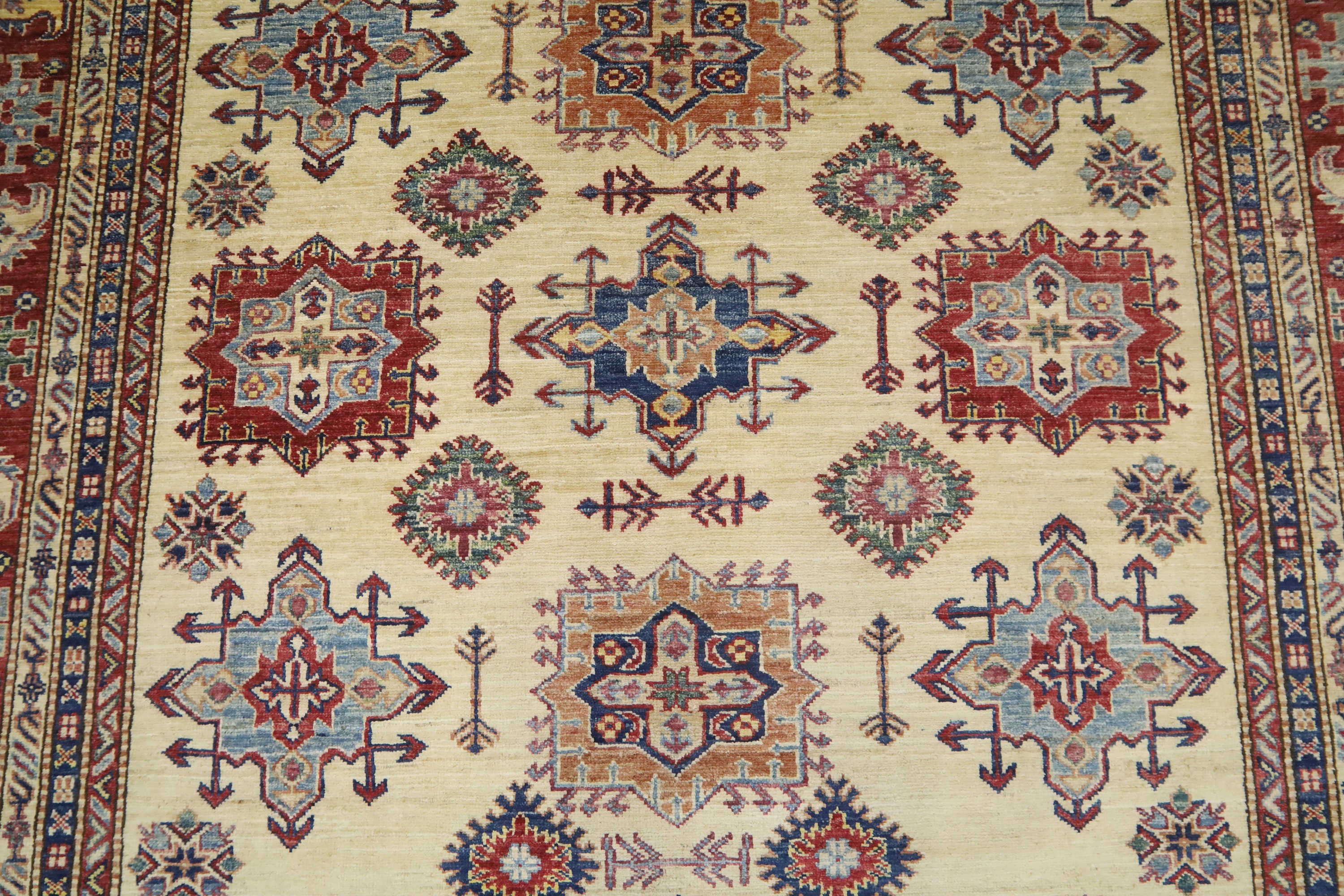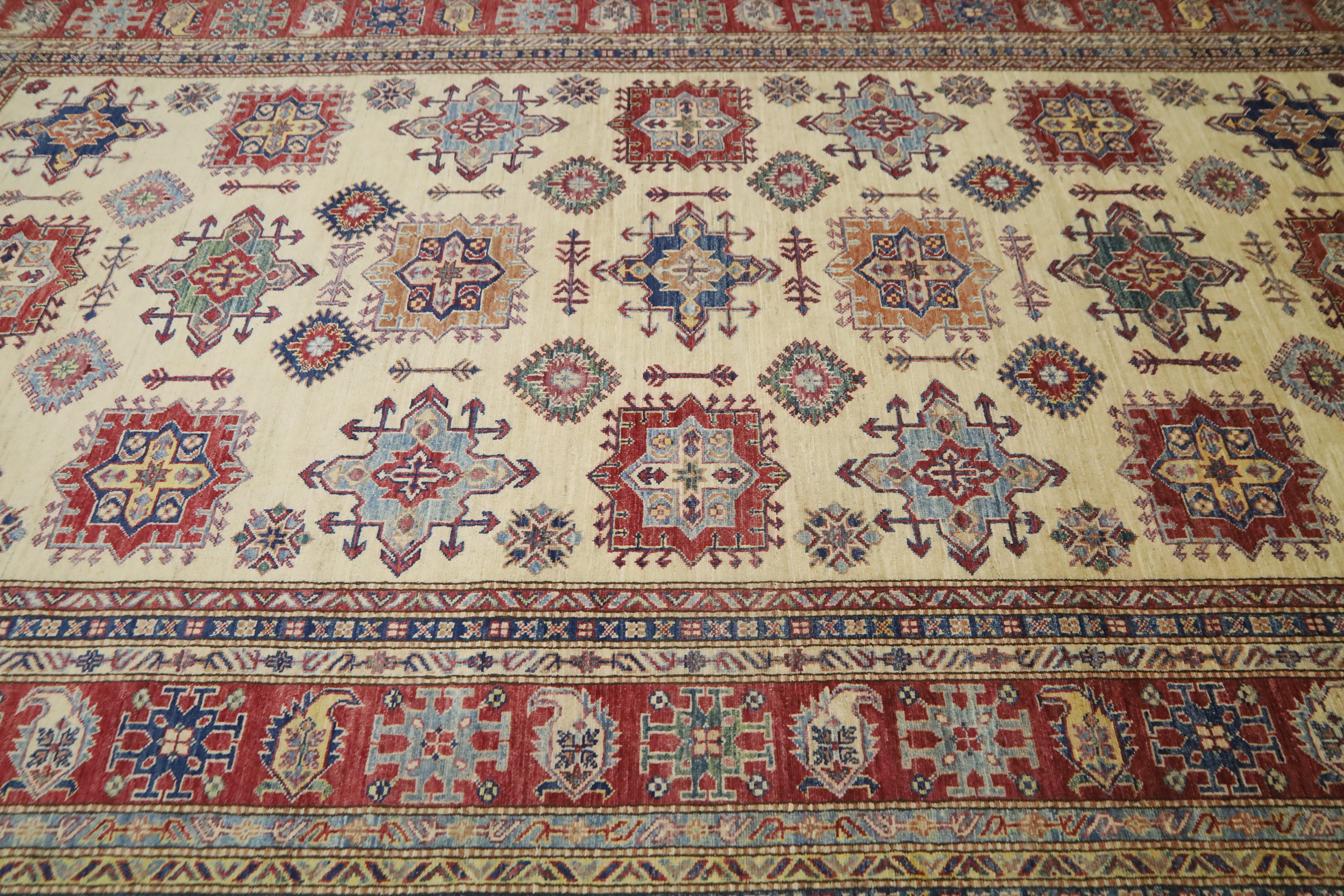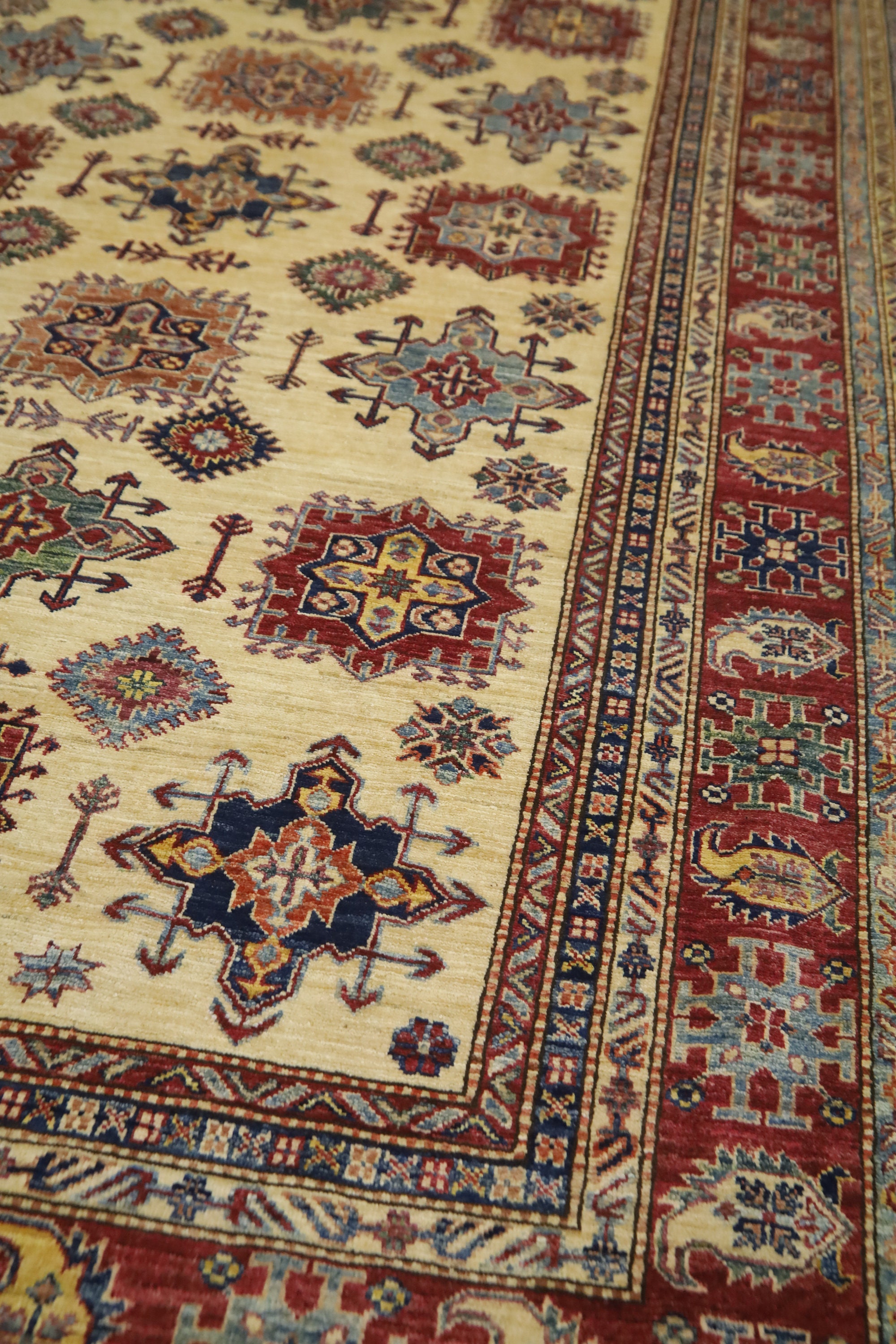 7x11 Kazak Fine Quality Area Rug - Ivory Afghan Hand Made Geometric Organic Dye Wool Rug - Bedroom Rug - Dining Room Rug - Living Room Rug