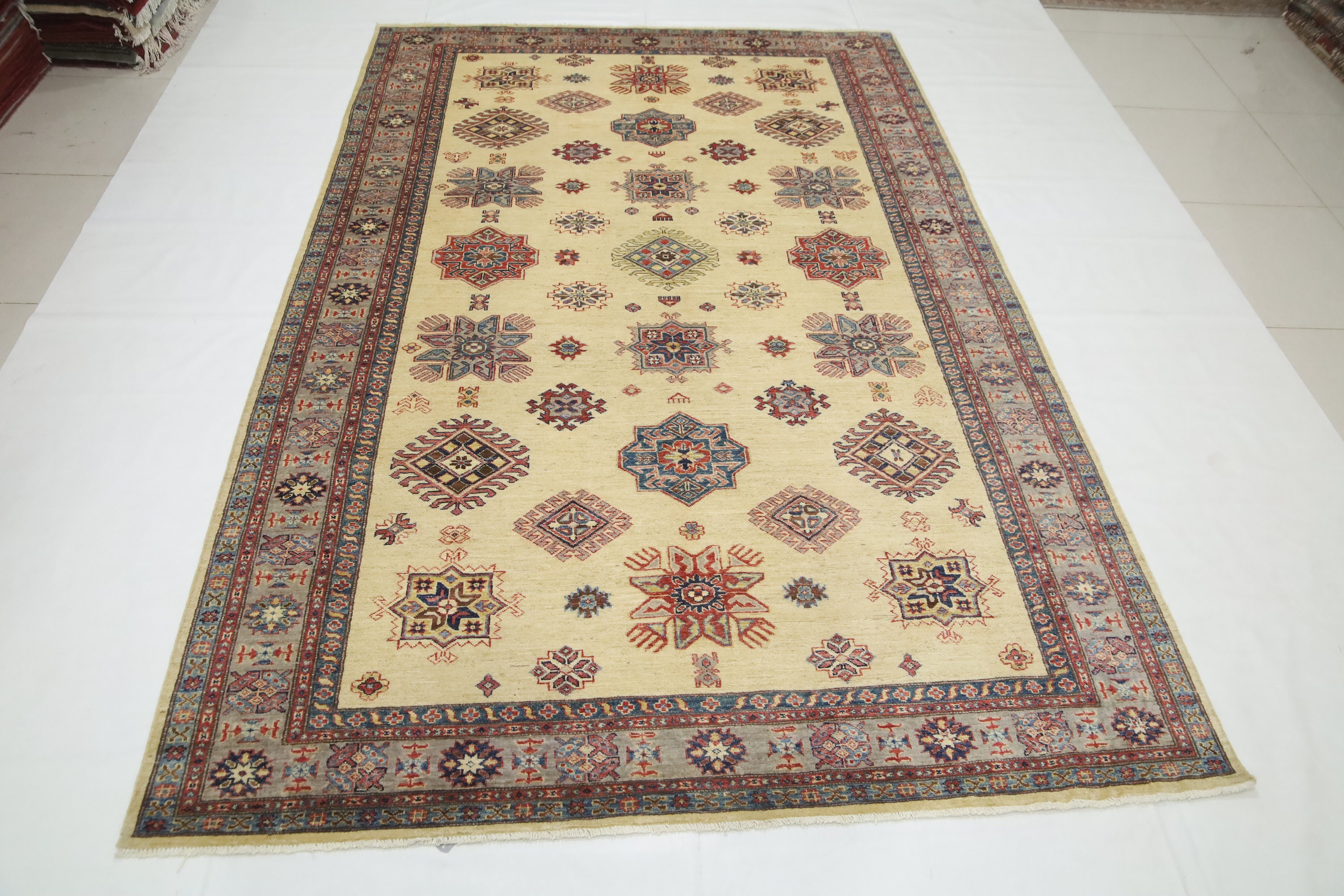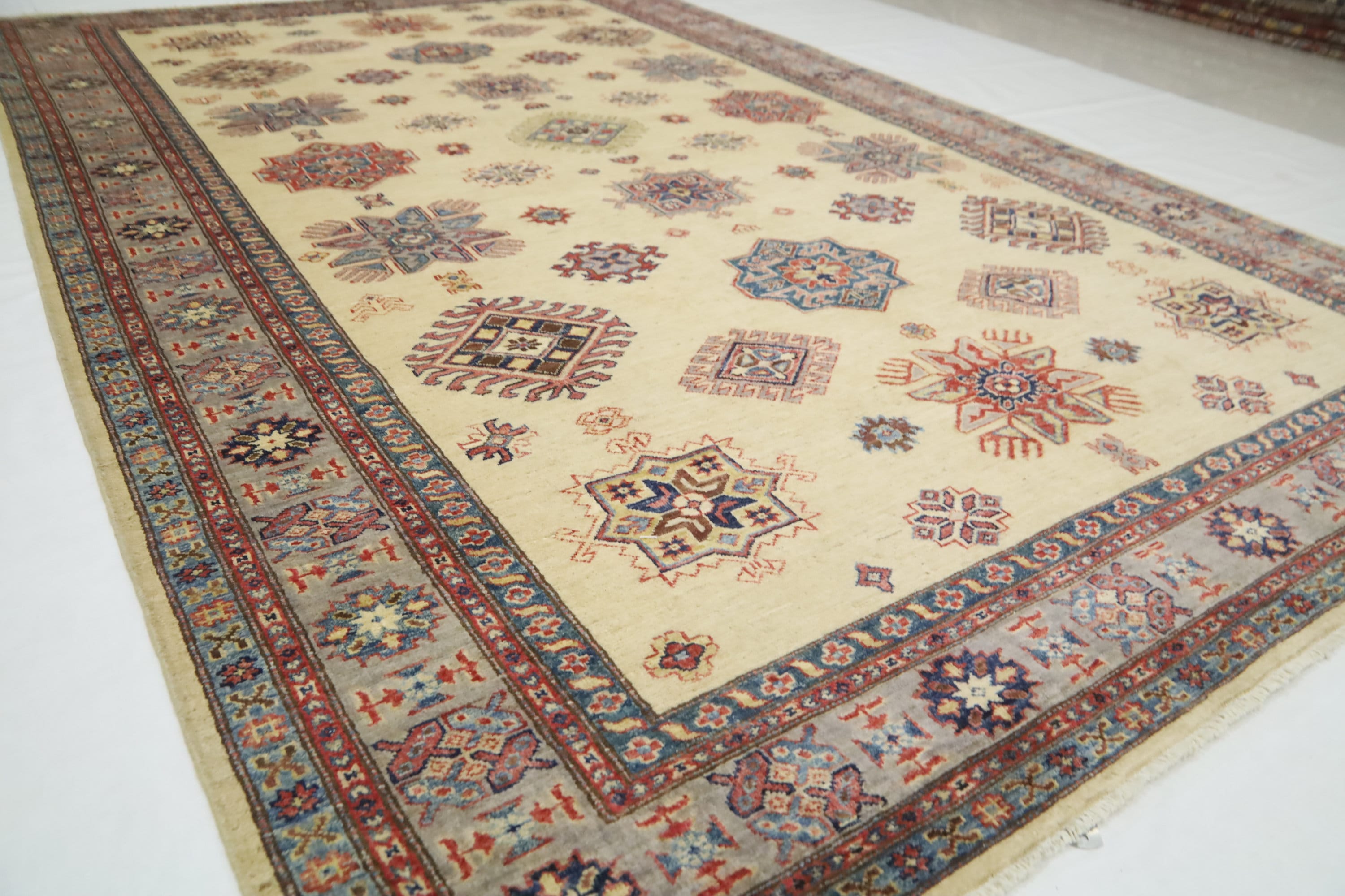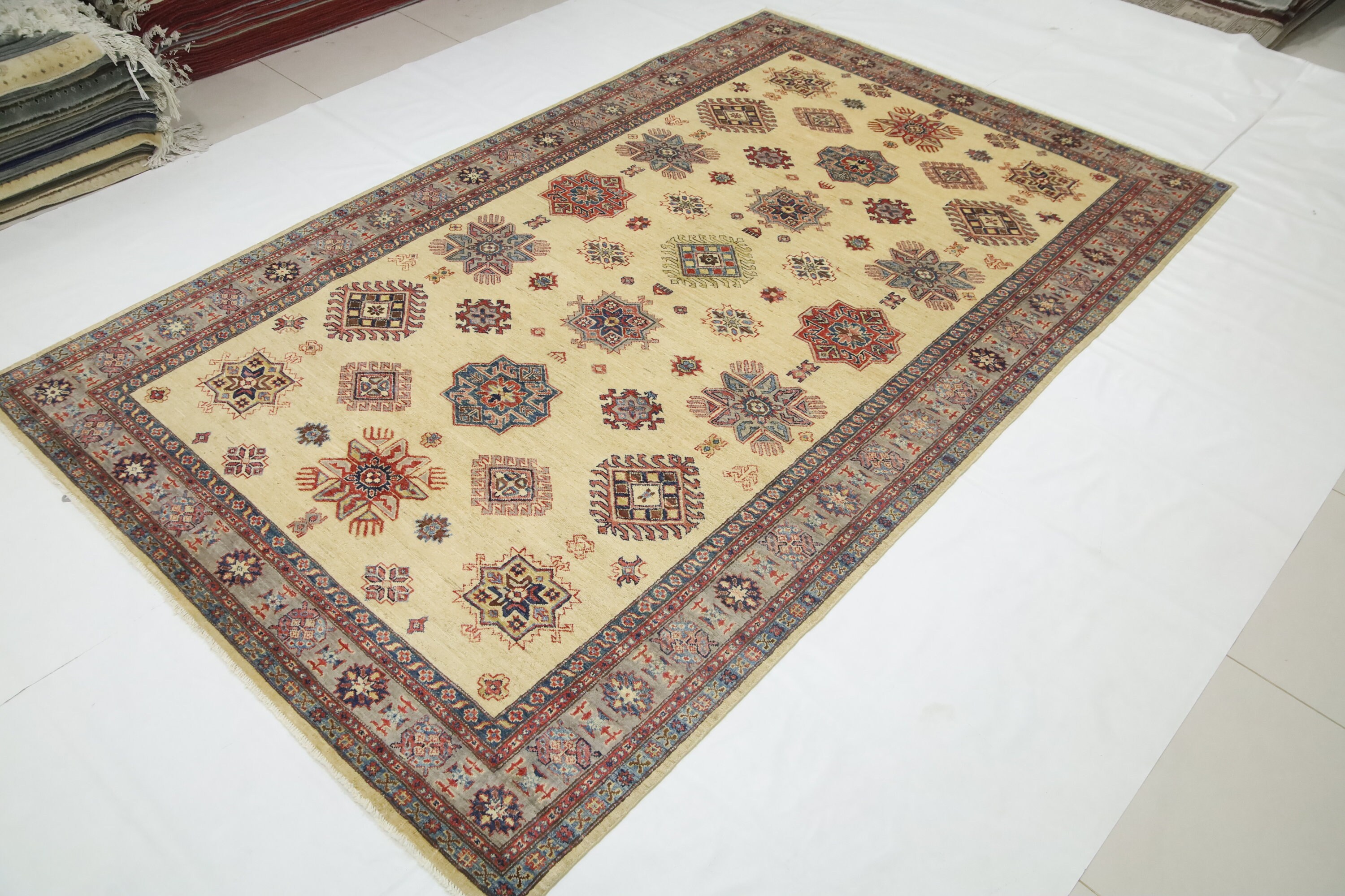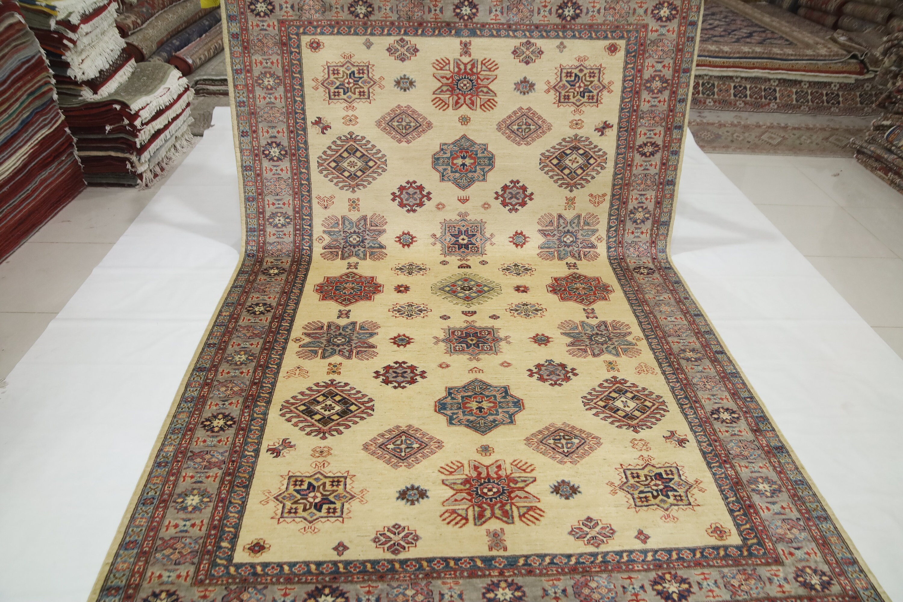 6'3x10 Kazak Area Rug - Beige Wool Rug - Afghan Hand Knotted Wool Rug - Geometric Rug - Traditional Rug - Bedroom Rug - Living Room Rug