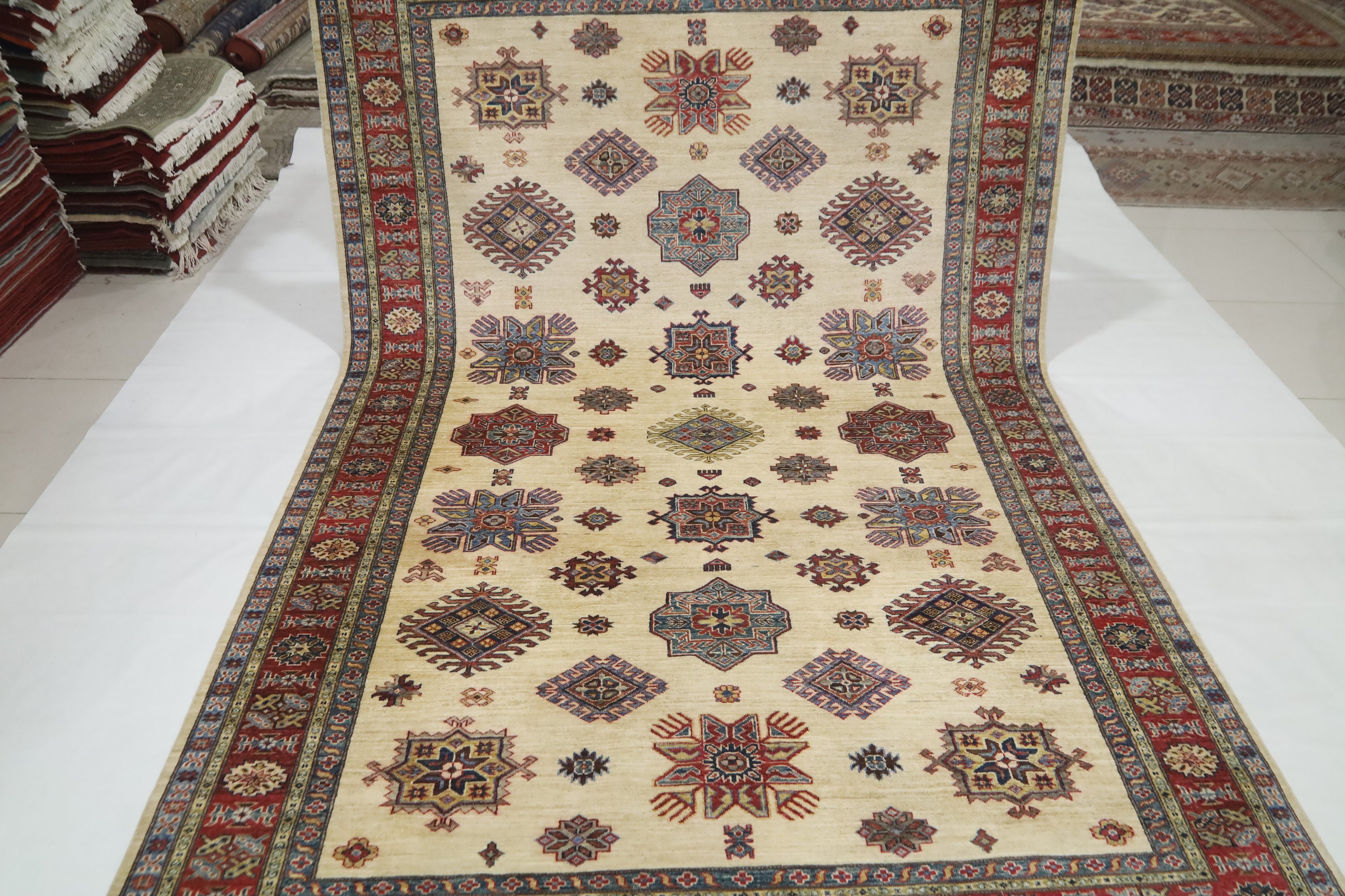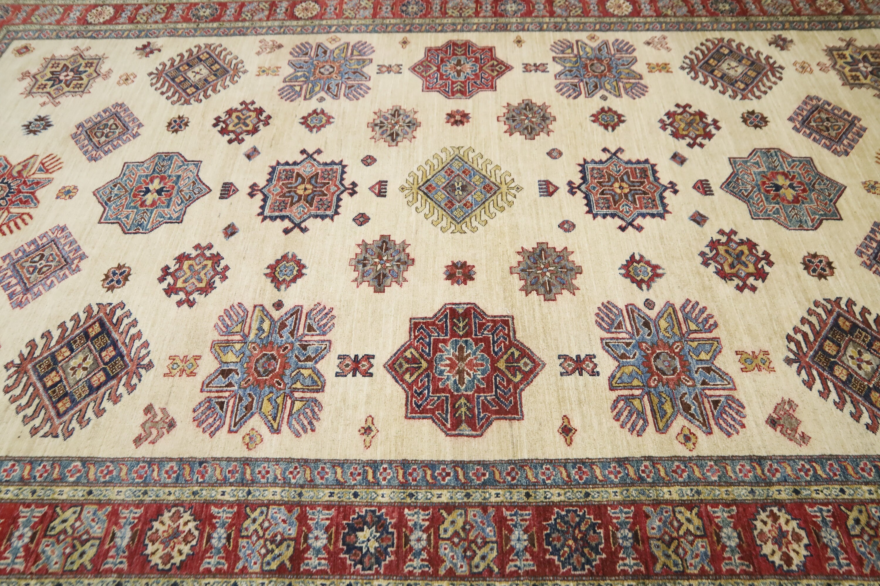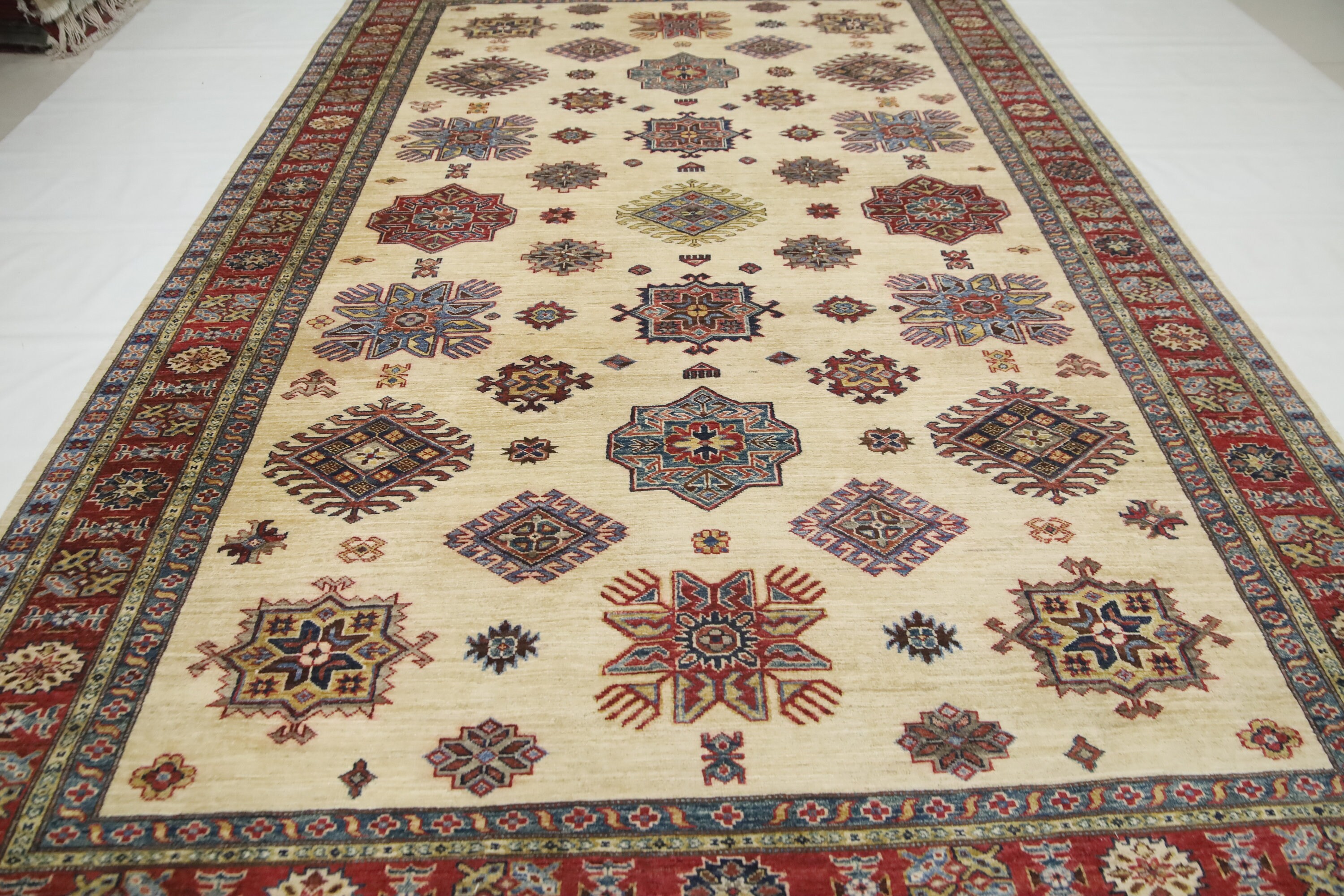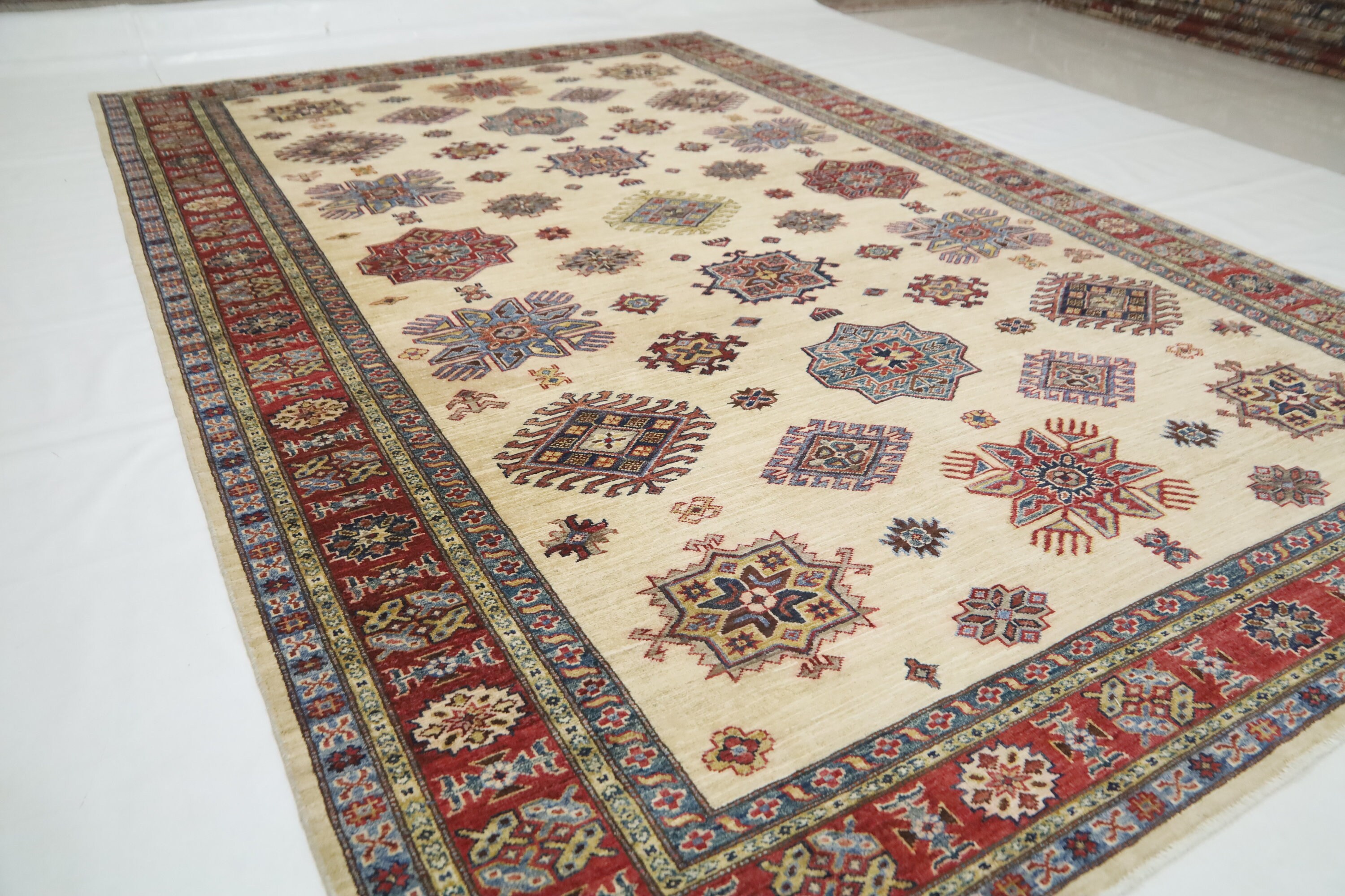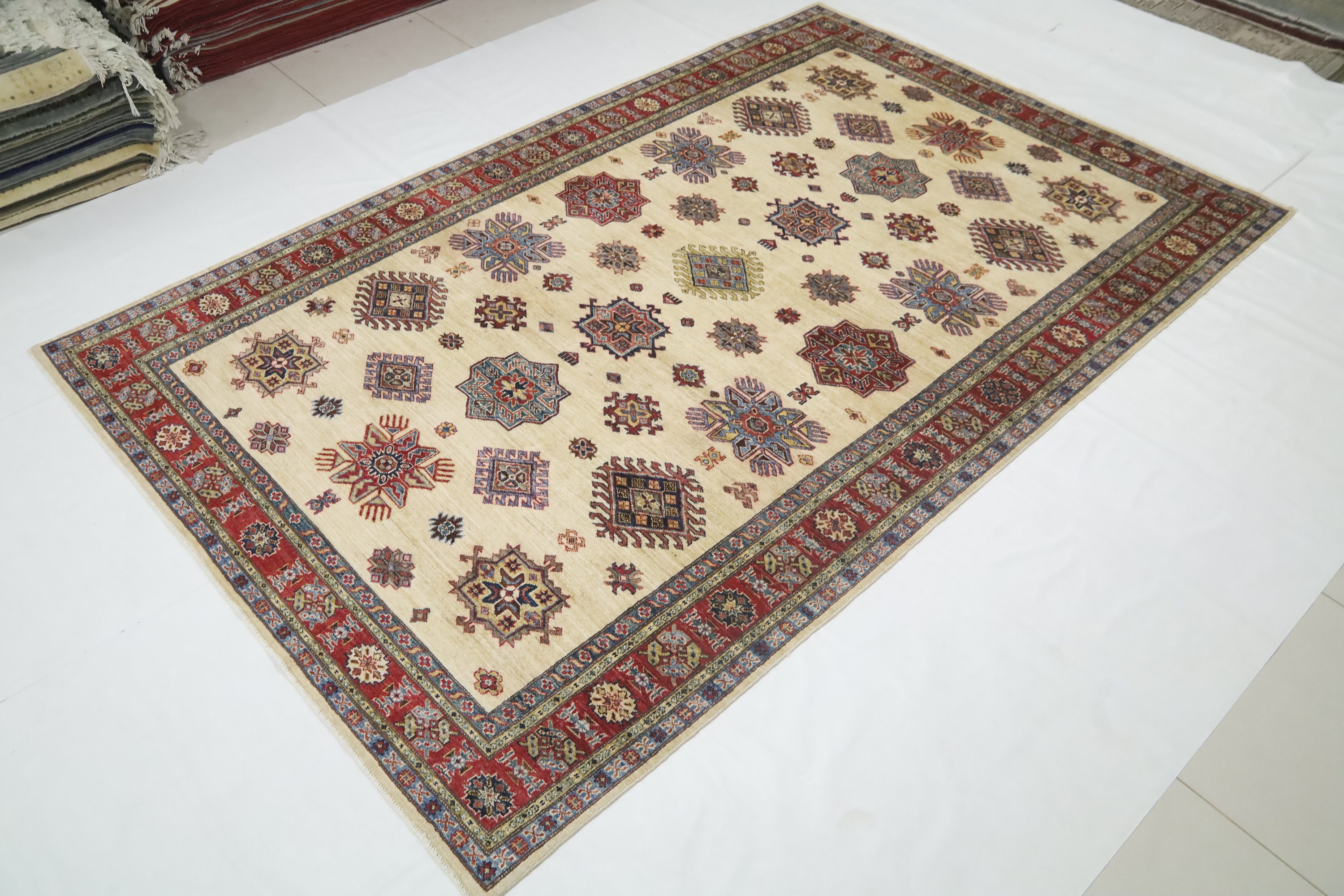 7x10 Kazak Area Rug - Beige Red Rug - Afghan Handmade Wool Rug - Veg Dye Rug - Geometric Rug - Traditional Rug - Bedroom Rug - Office Rugs