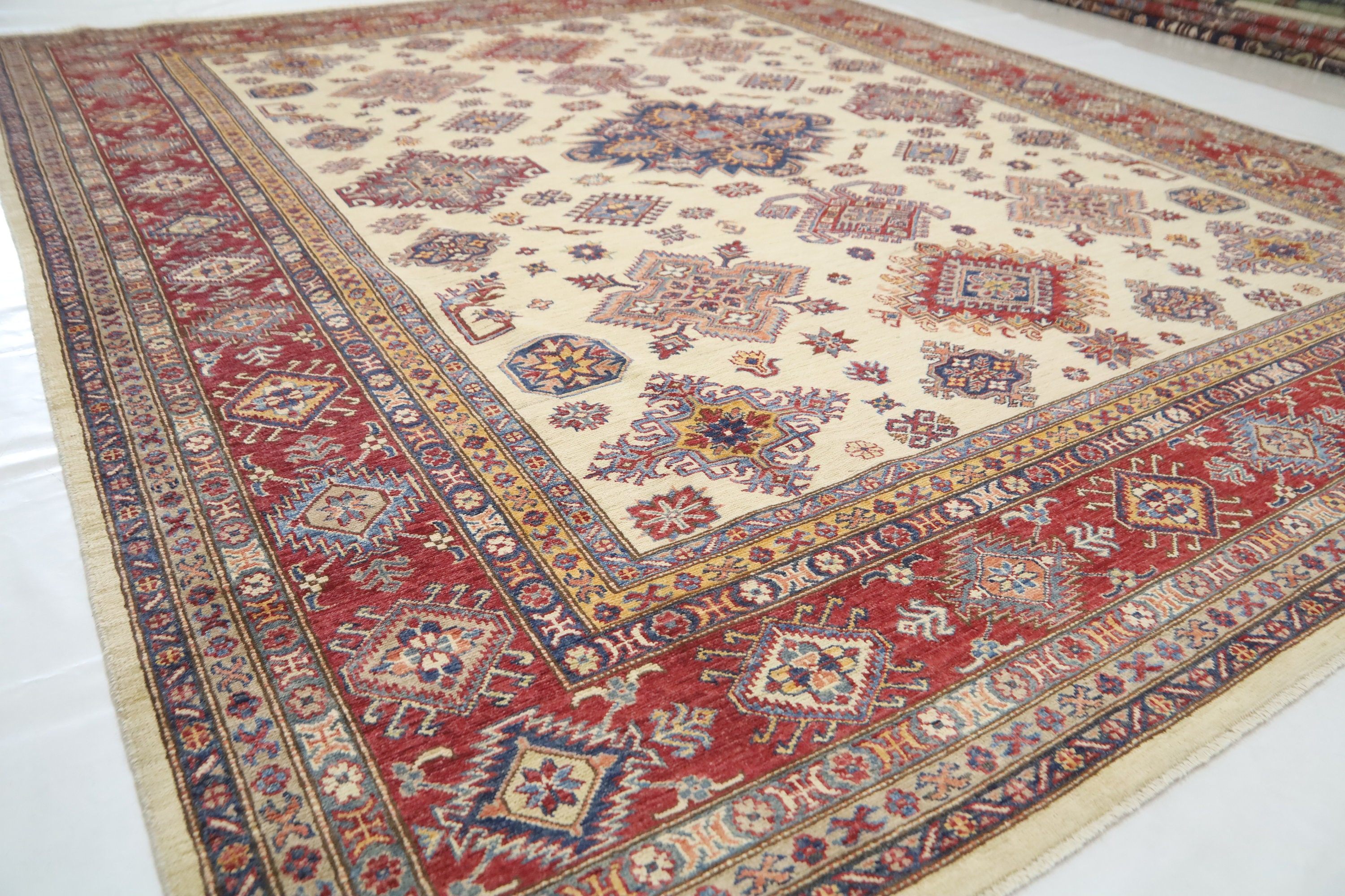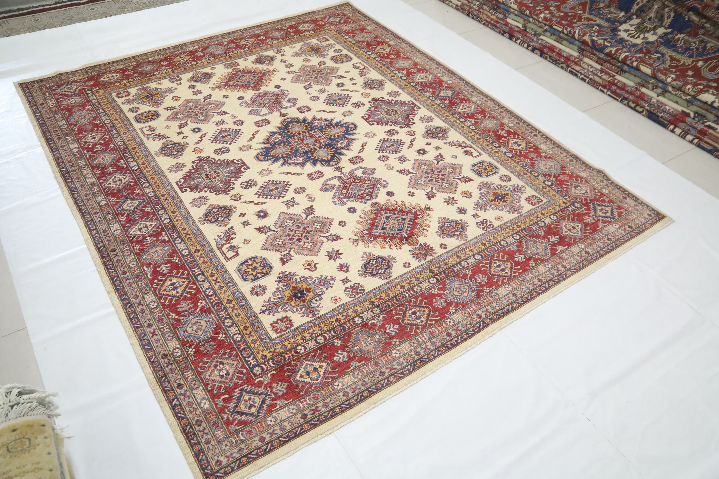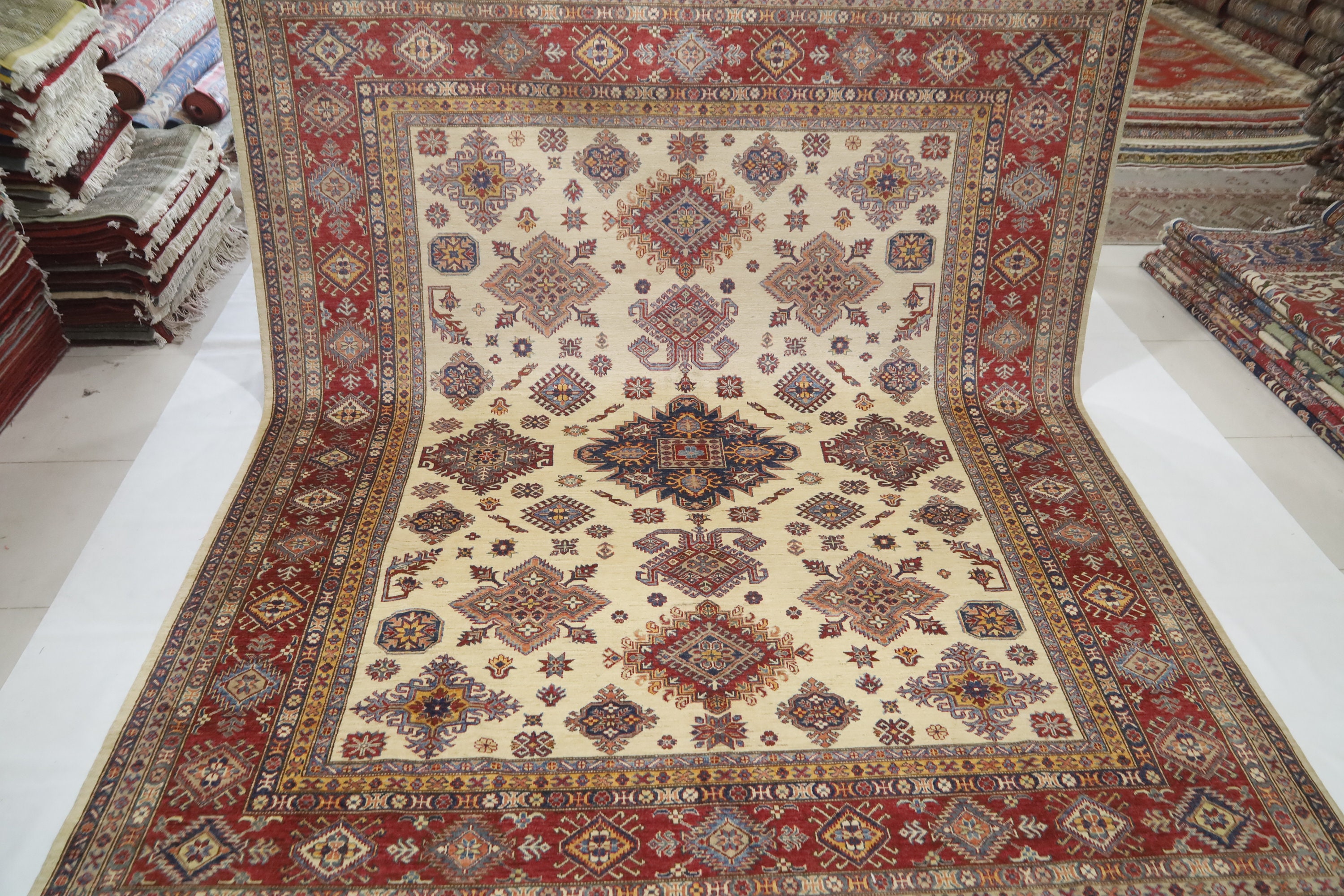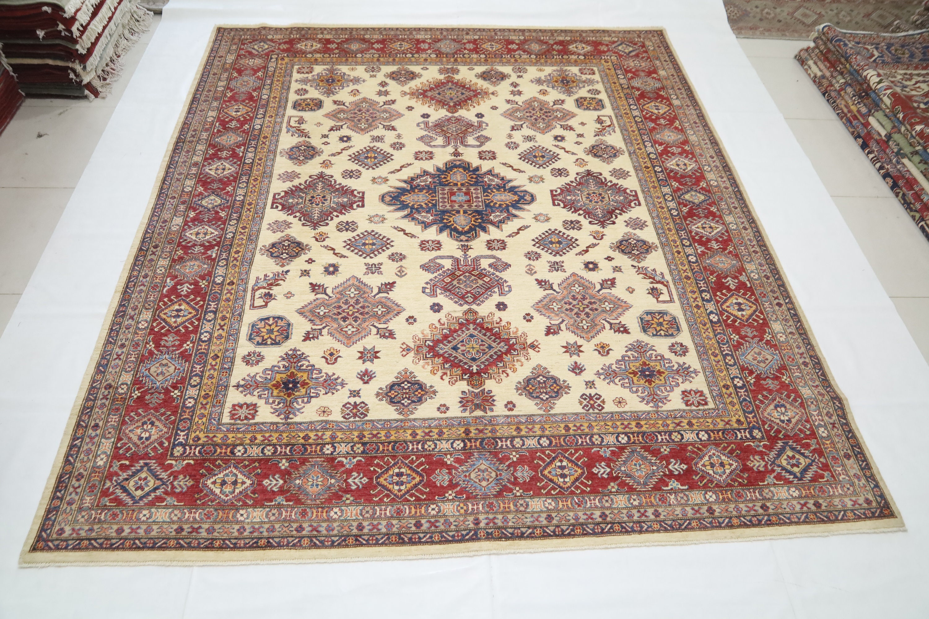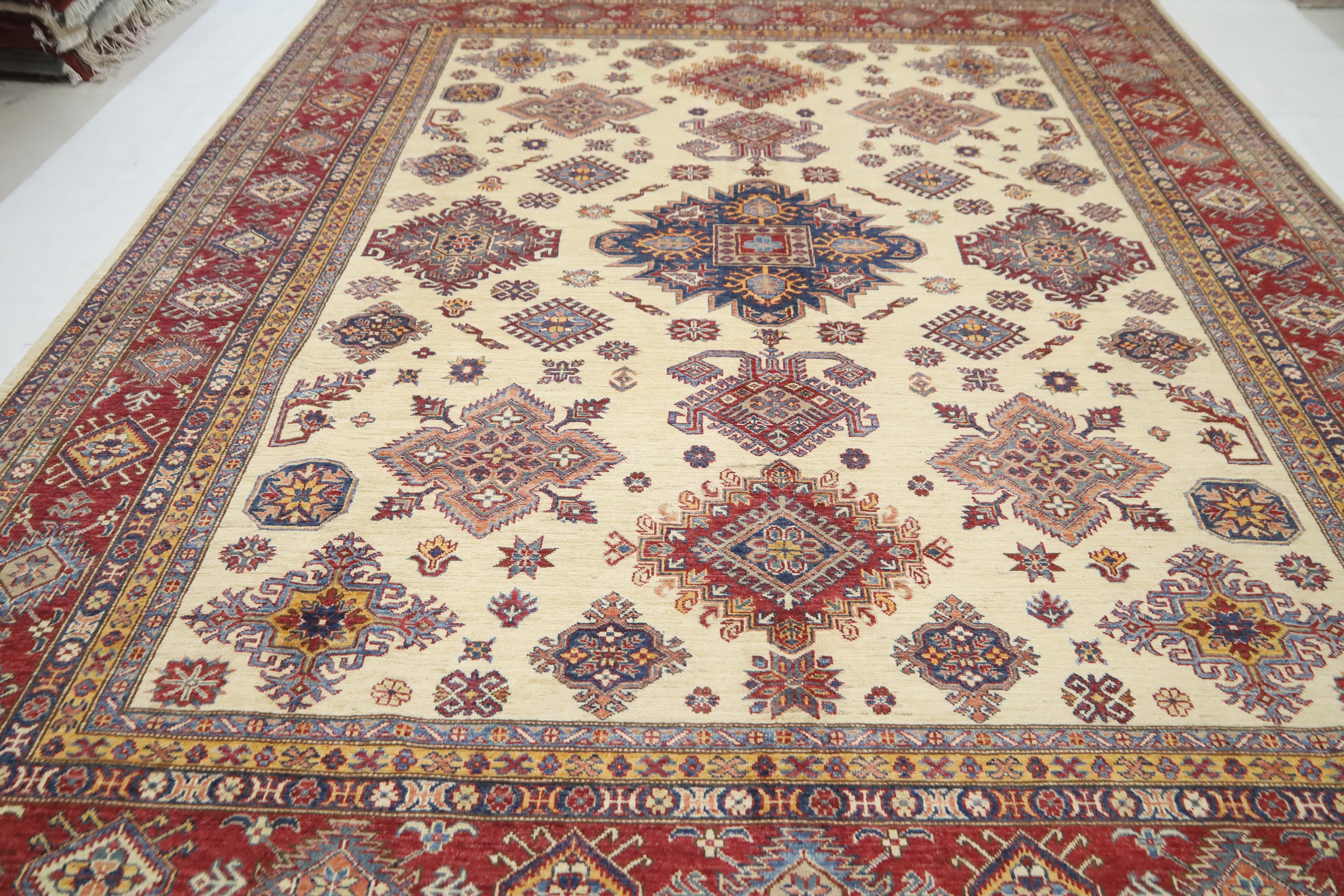 8x10 Kazak Fine Quality Area Rug - Beige Red Afghan Hand Made Geometric Design Wool Rug - Dining Room Rug - Living Room Rug - Bedroom Rug