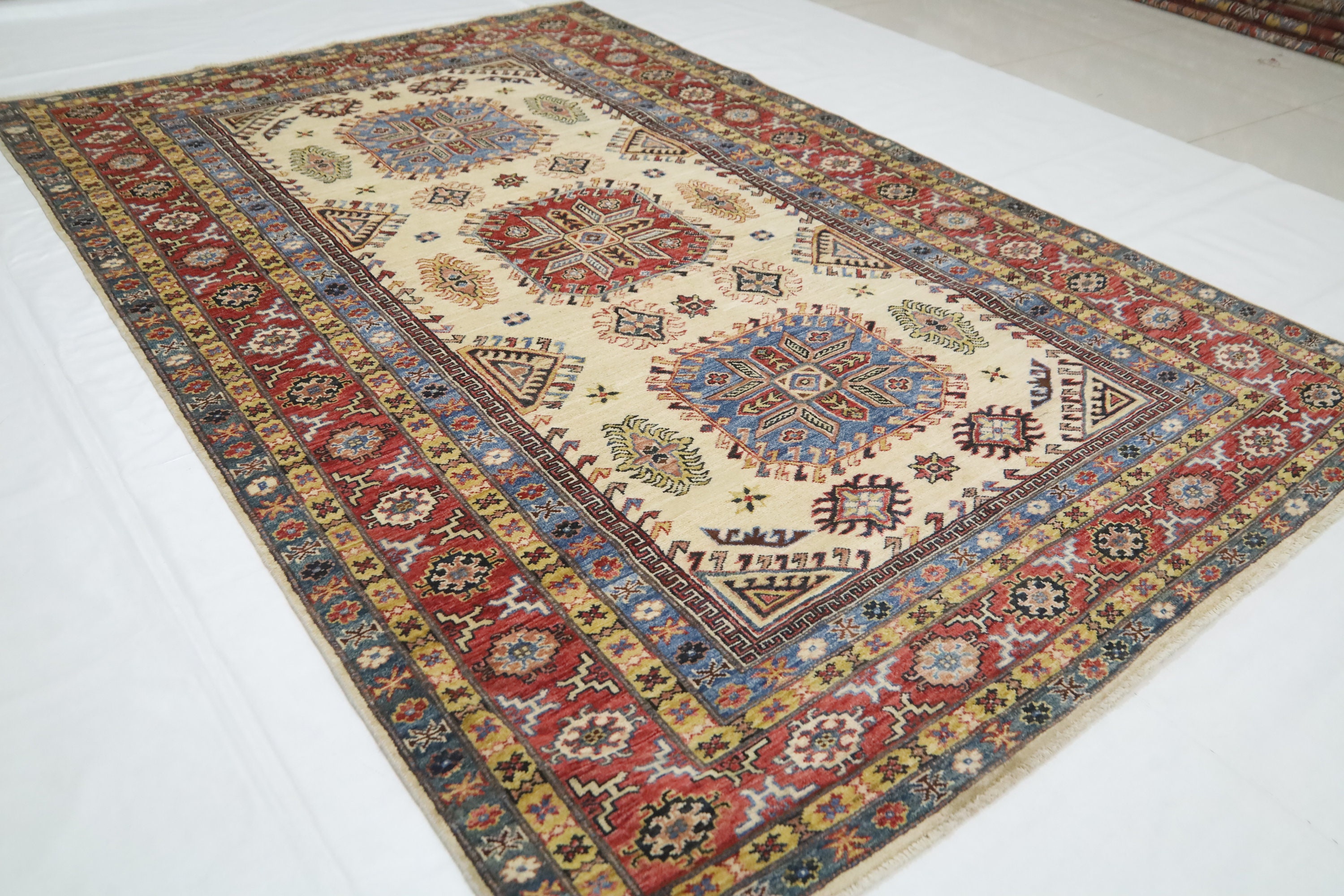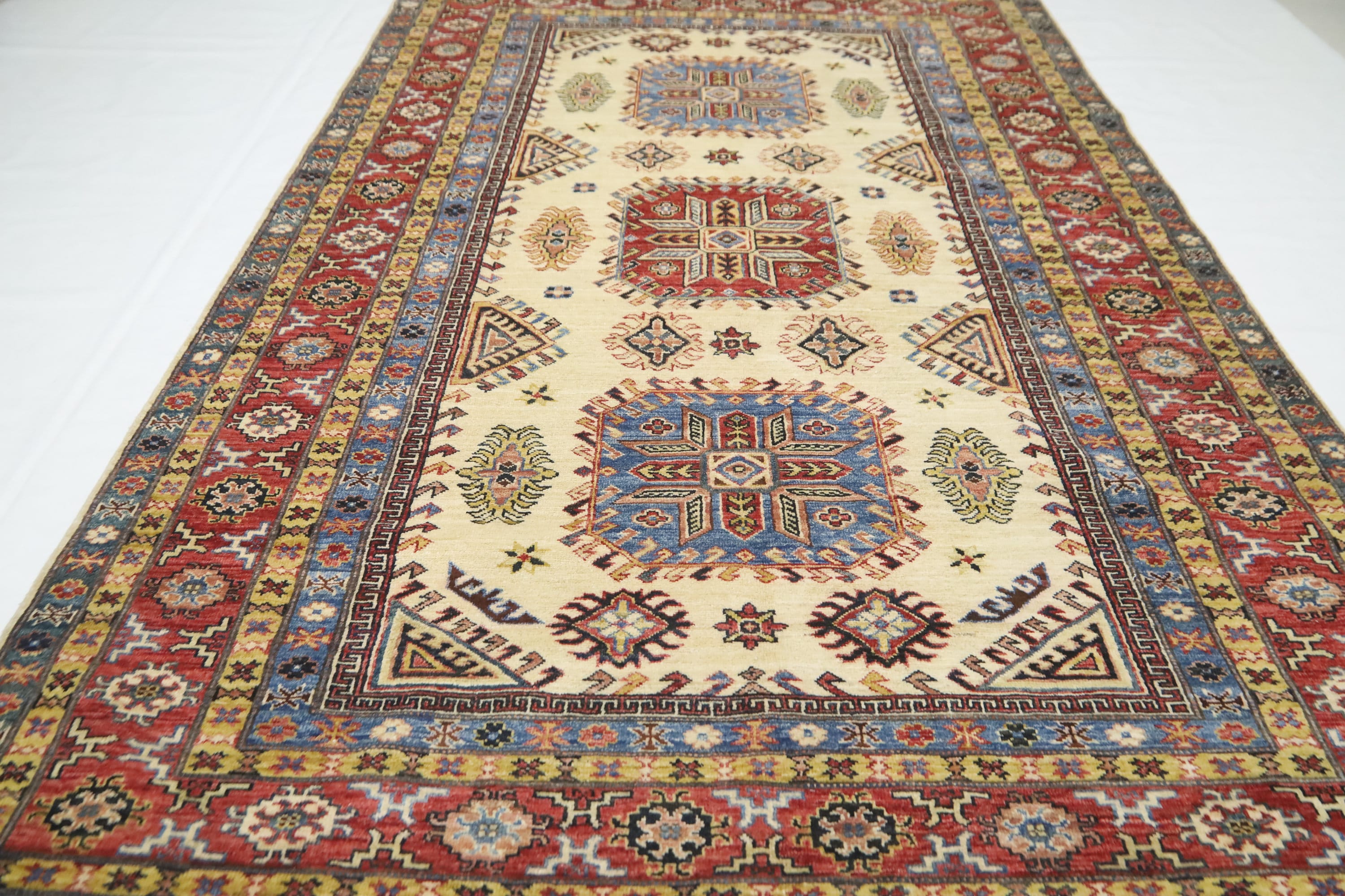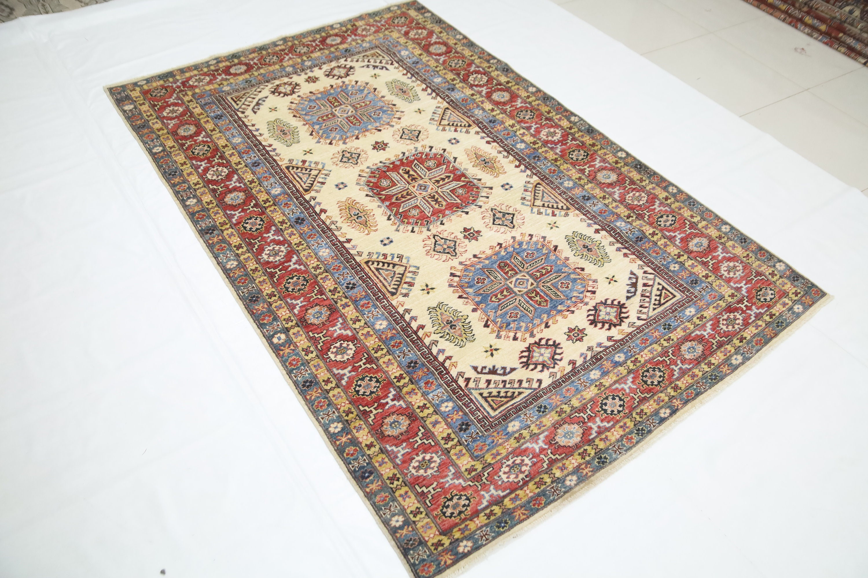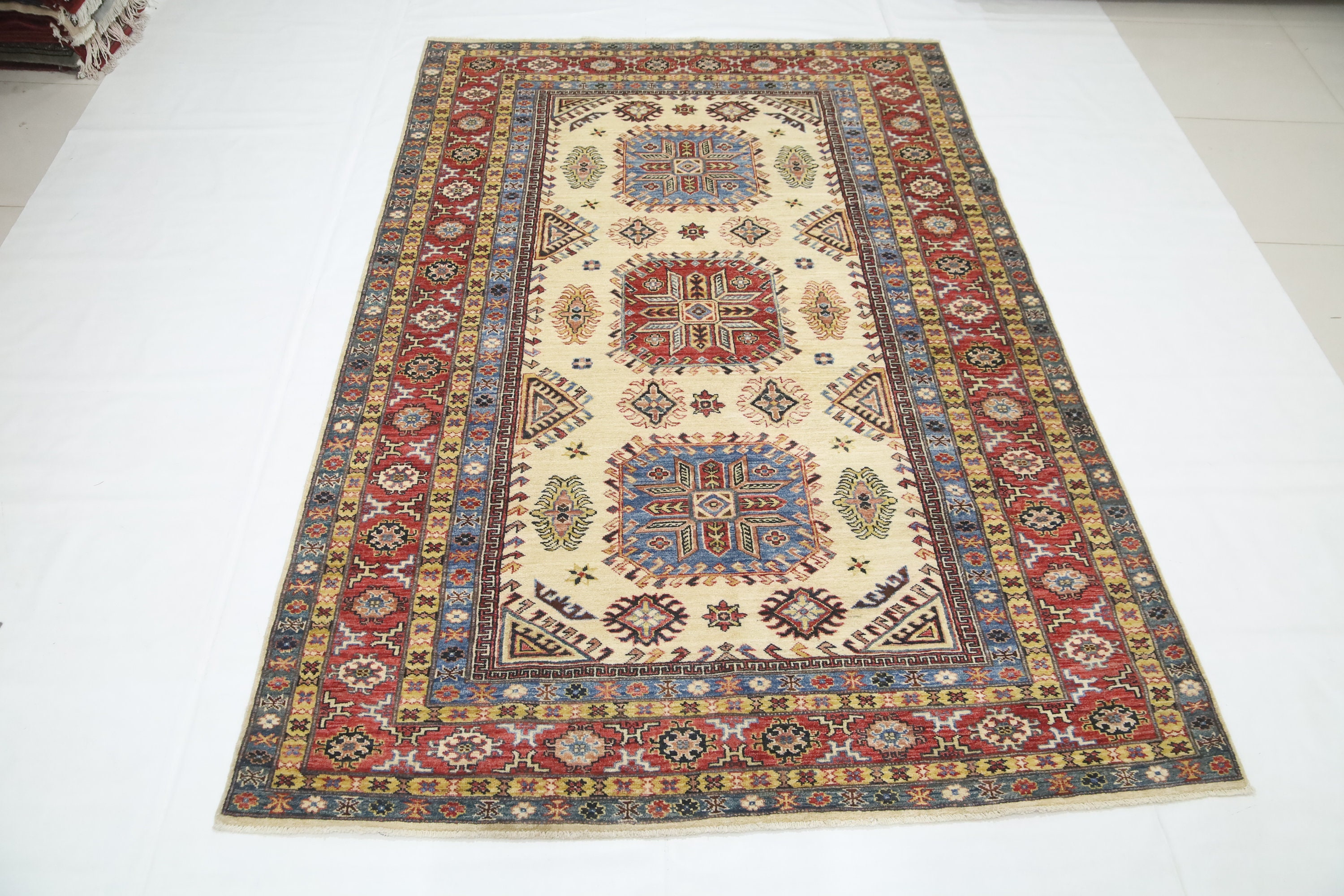 5x8 Geometric Kazak Area Rug - Beige Afghan Hand Made Oriental Fine Quality Wool Rug - Kitchen Rug - Entryway Rug - Bedroom Rug - Office Rug