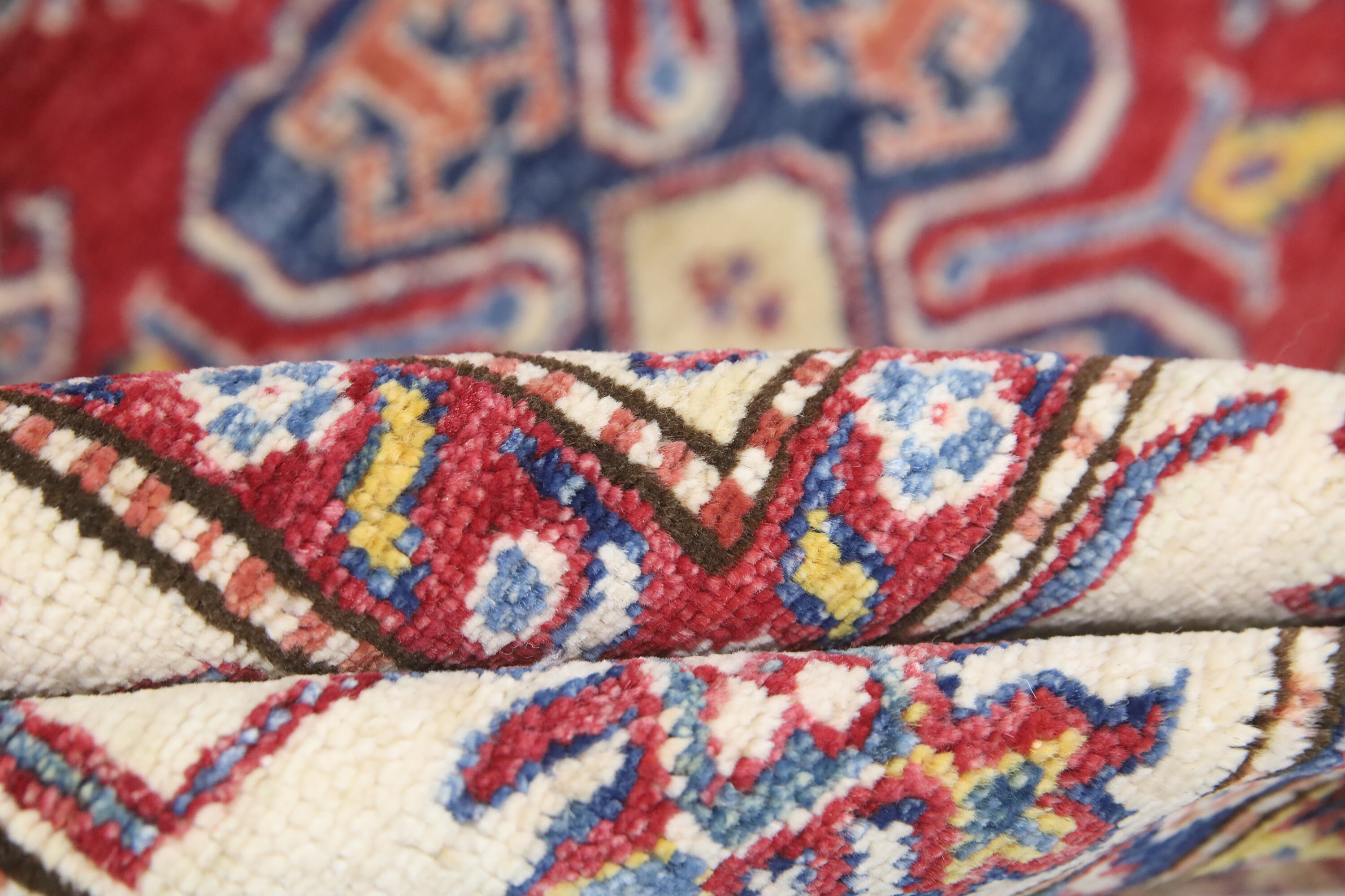 This hand-knotted pile rug is crafted using 100% natural dyes and handspun wool, giving it a rich texture and vibrant colors.