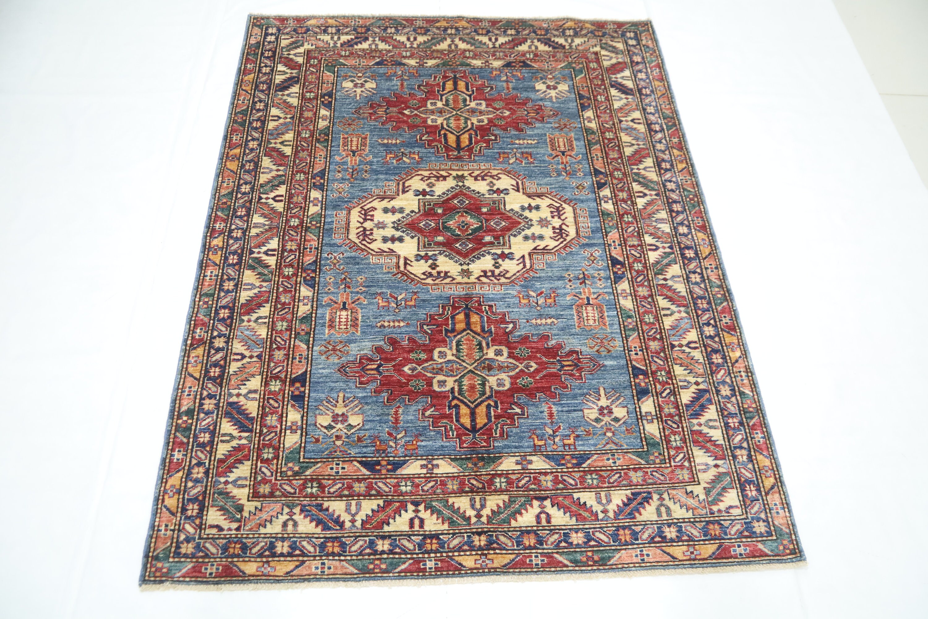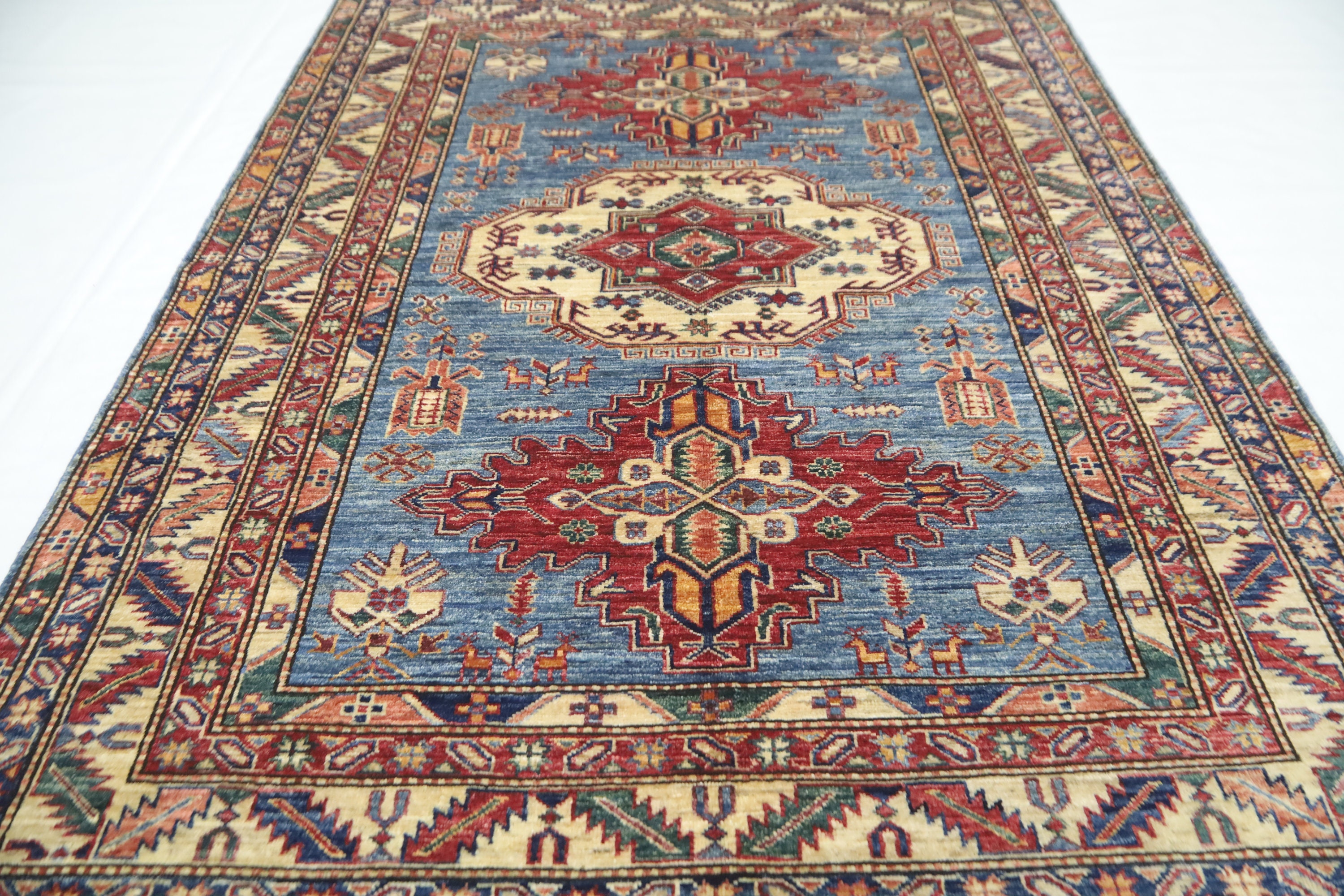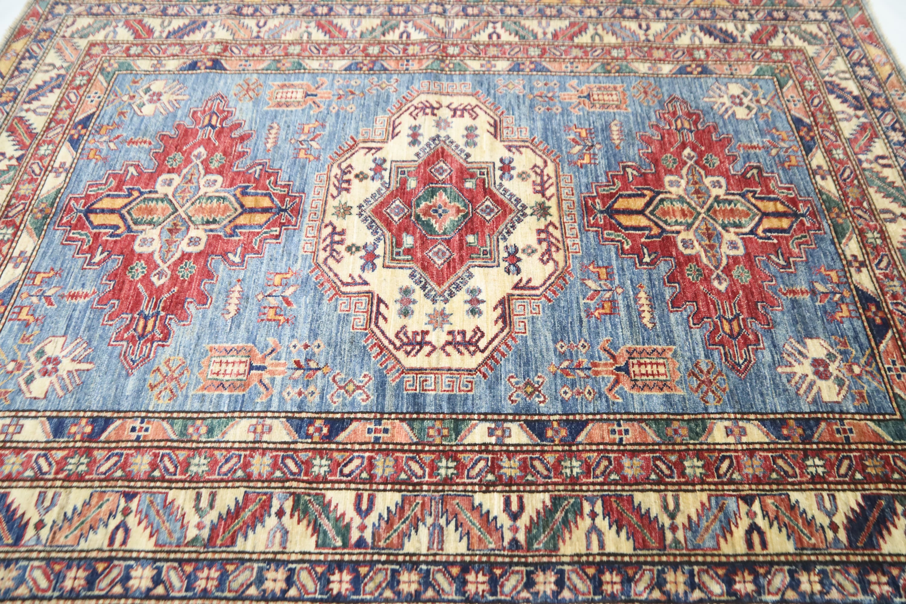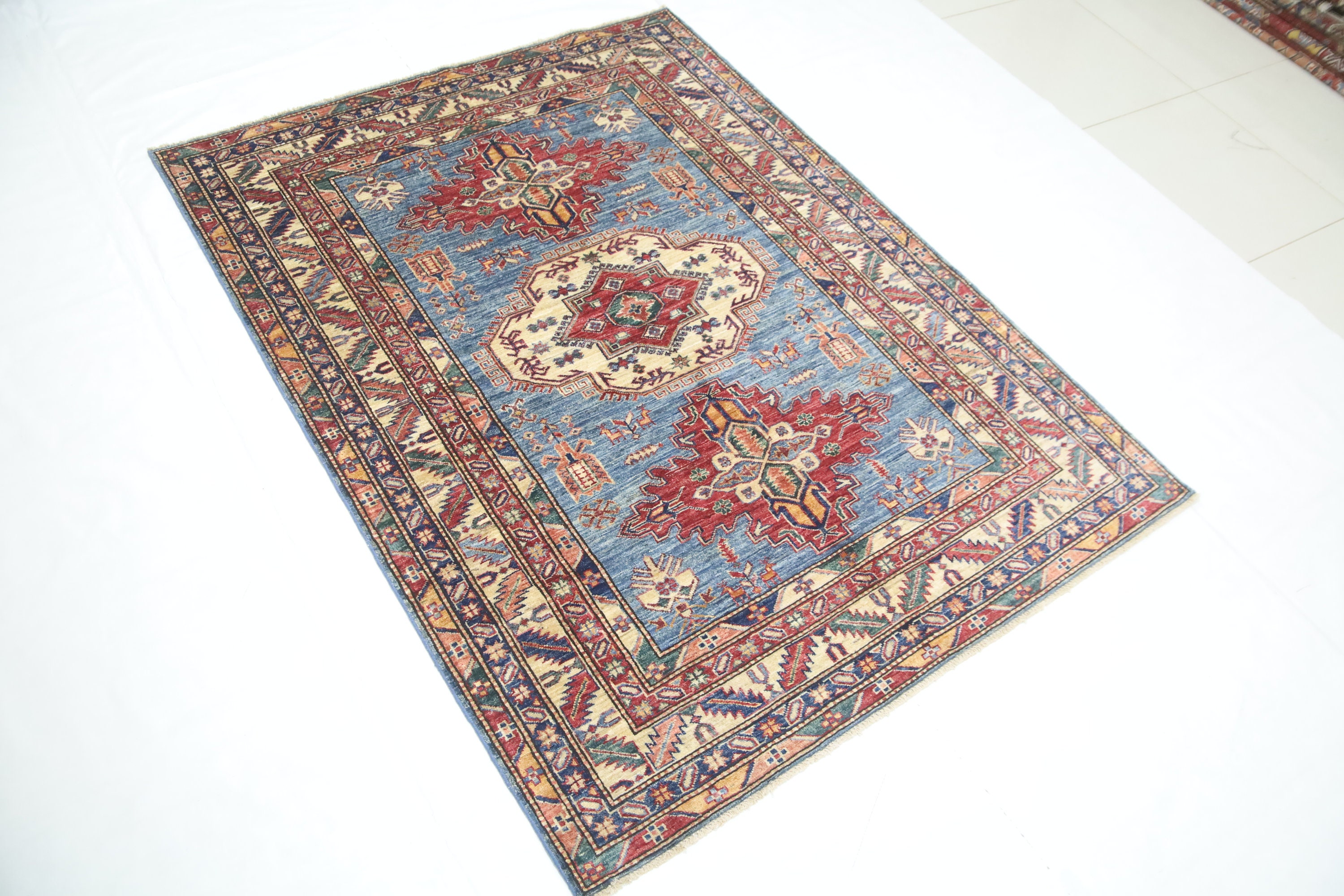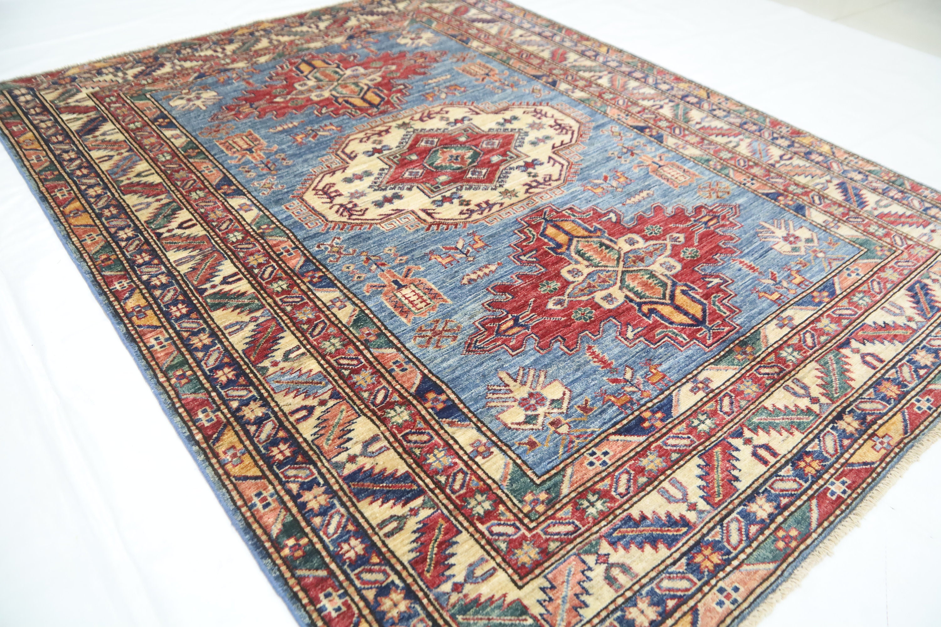 5x7 Kazak Area Rug - Blue Afghan Hand Made Traditional Organic Dye Wool Rug - Blue Rugs - Office Rug - Kitchen Rug - Bedroom Rug - Foyer Rug