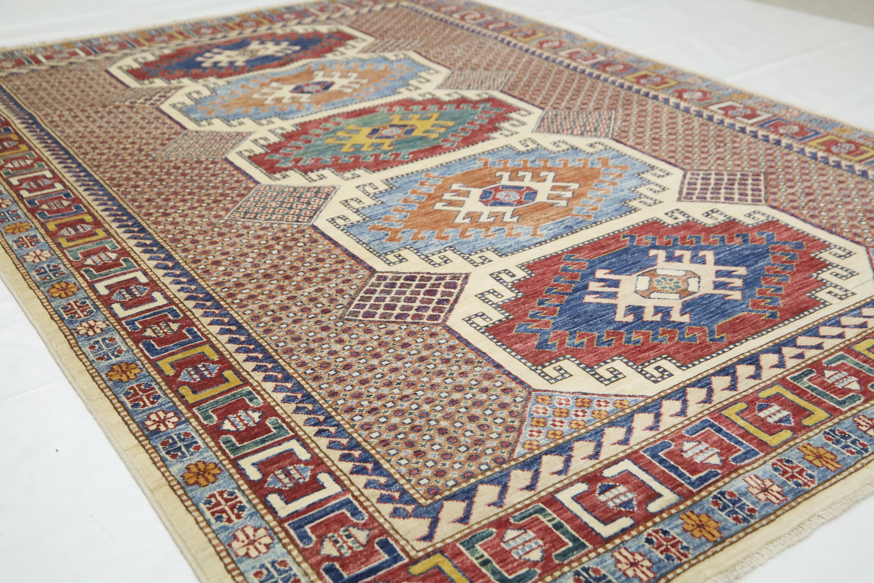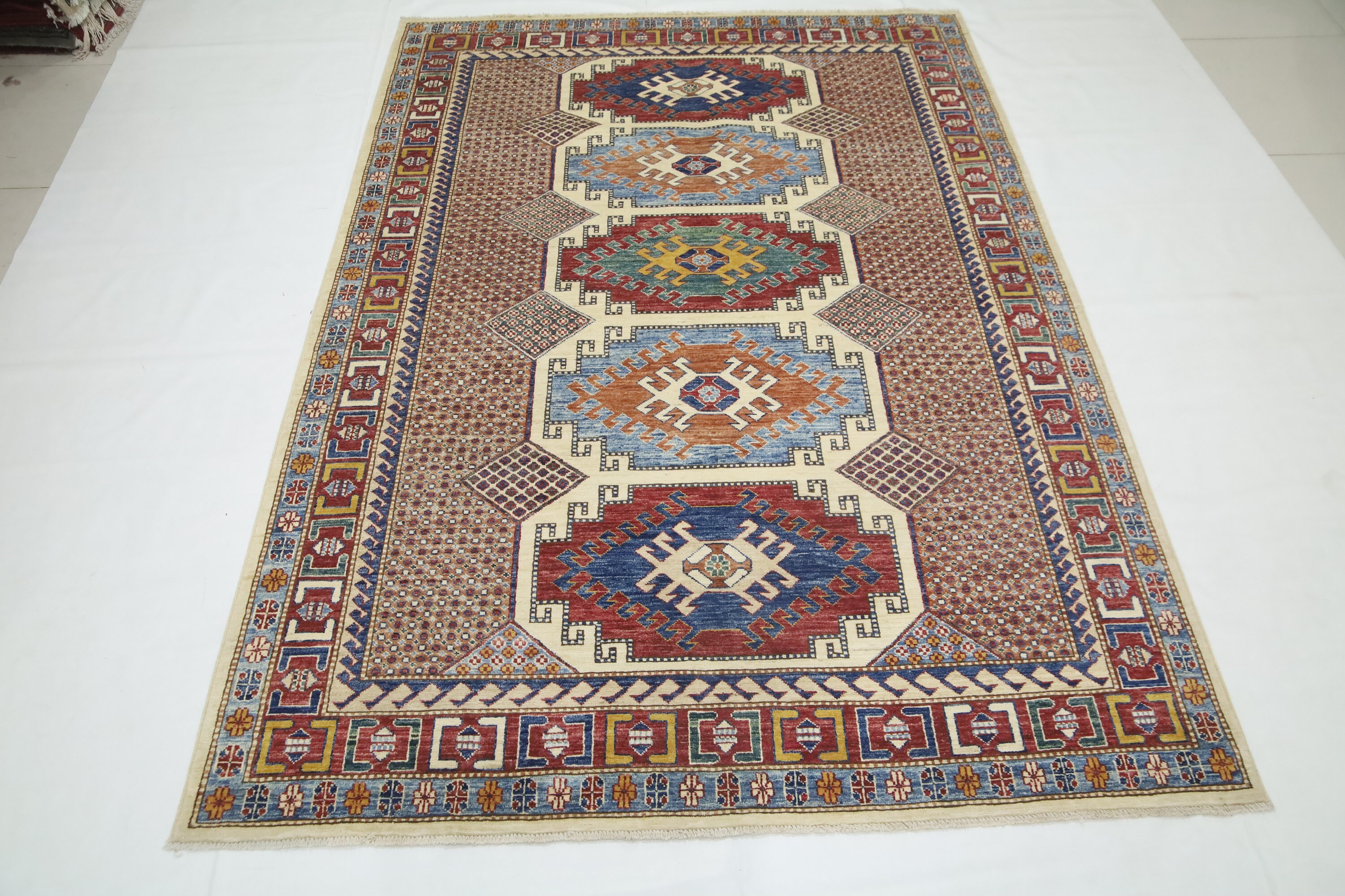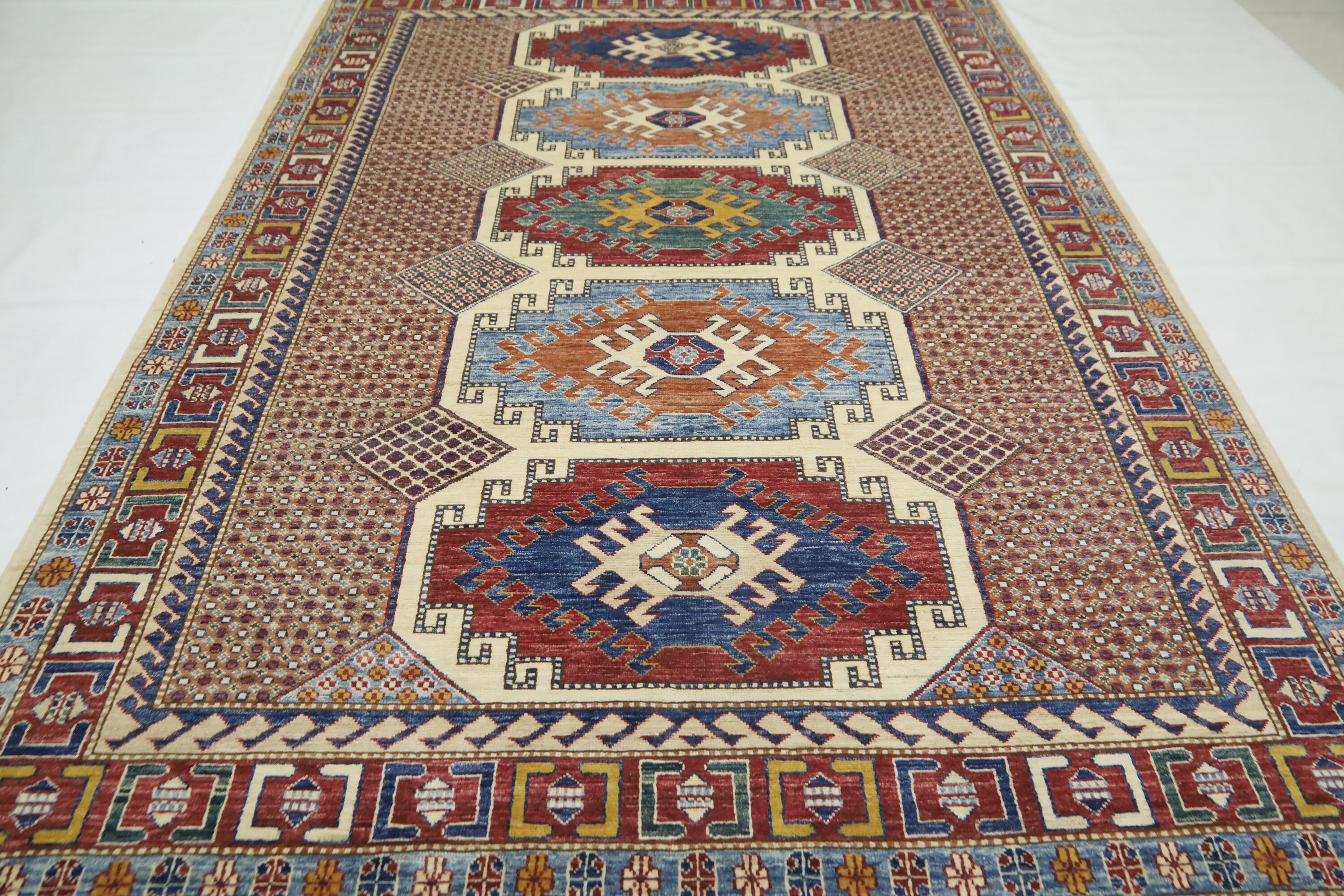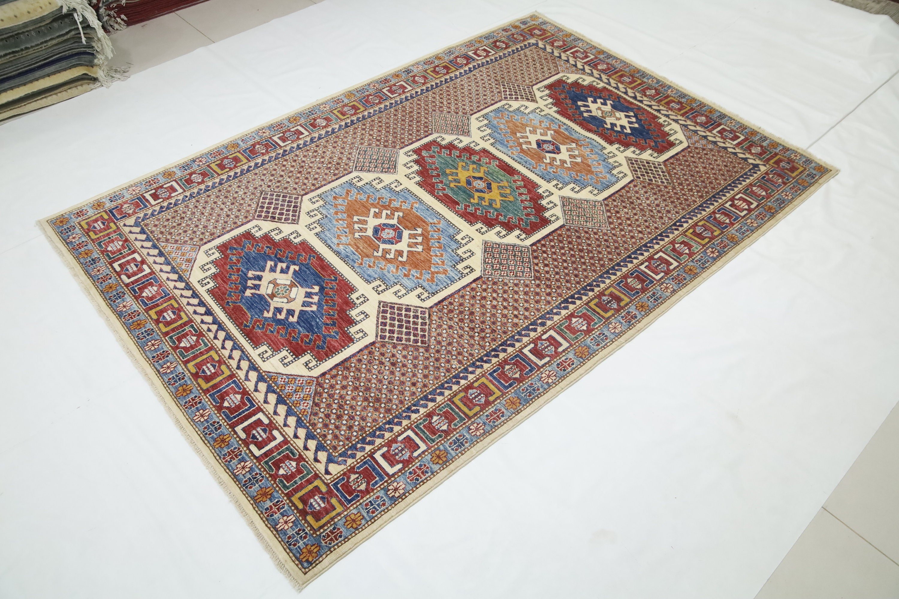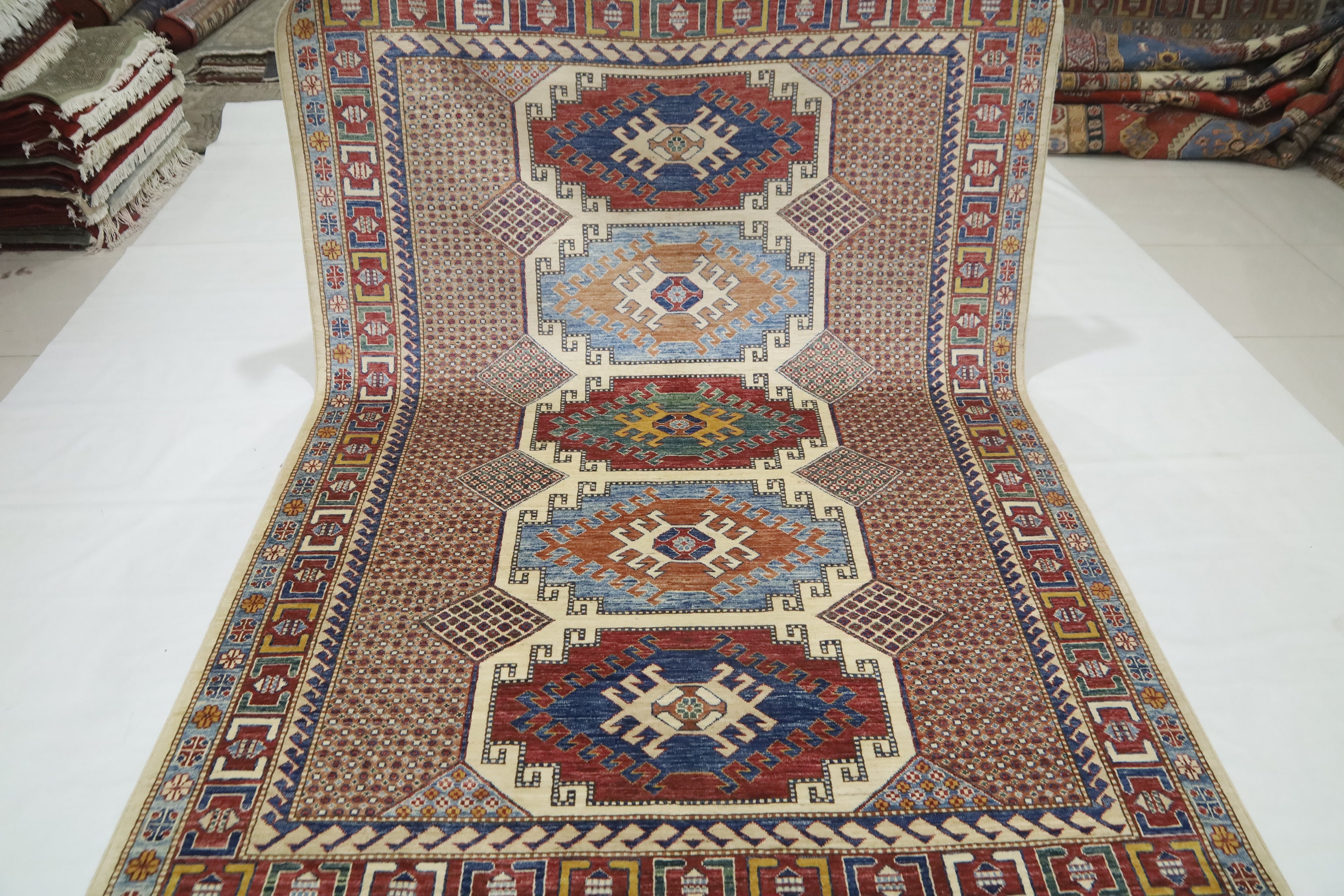 6x8 Feet Kazak Area Rug - Beige Red Rug - Afghan Hand Knotted Wool Rug - Traditional Rug - Geometric Rug - Bedroom Rug - Living Room Rug