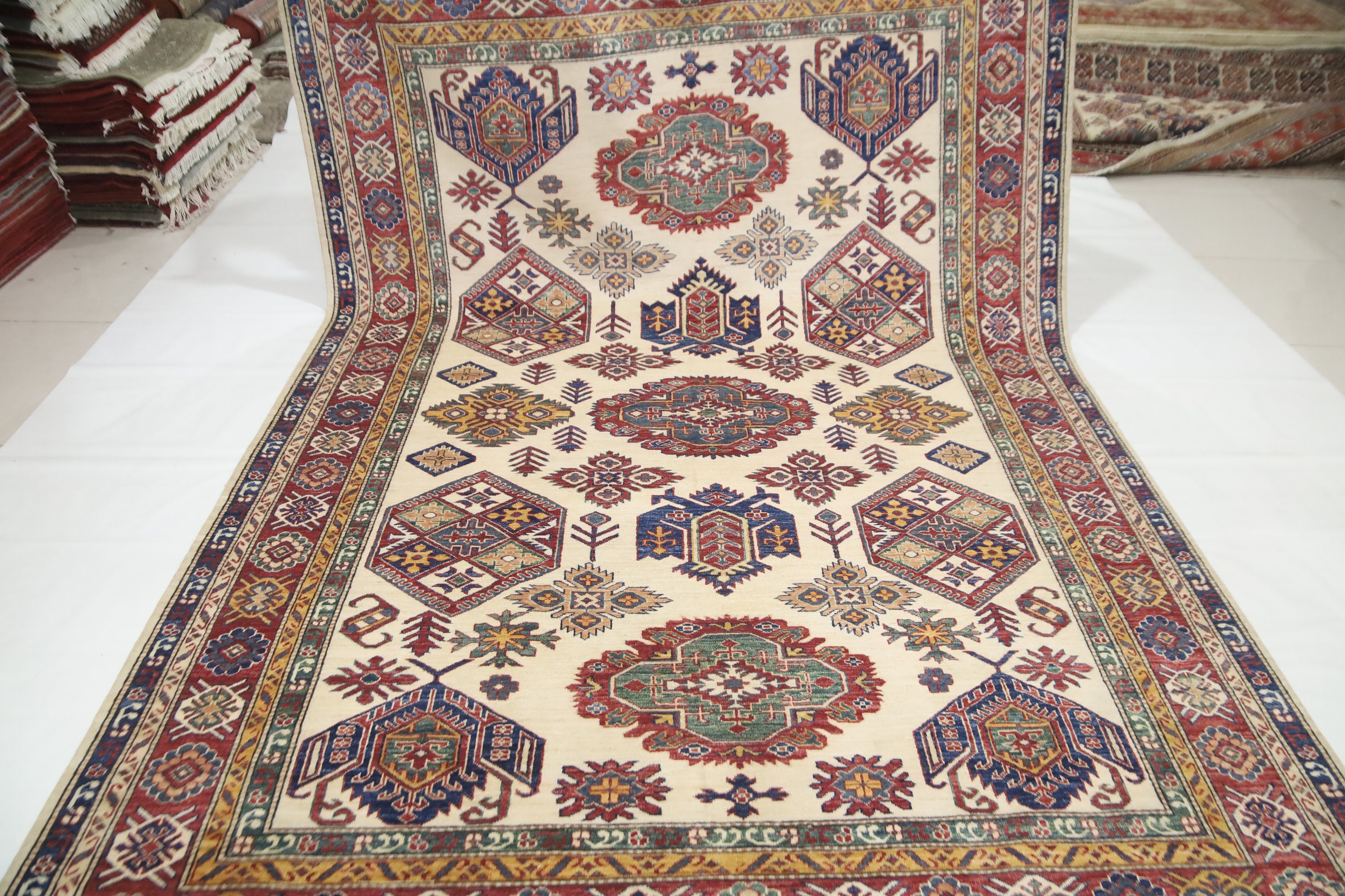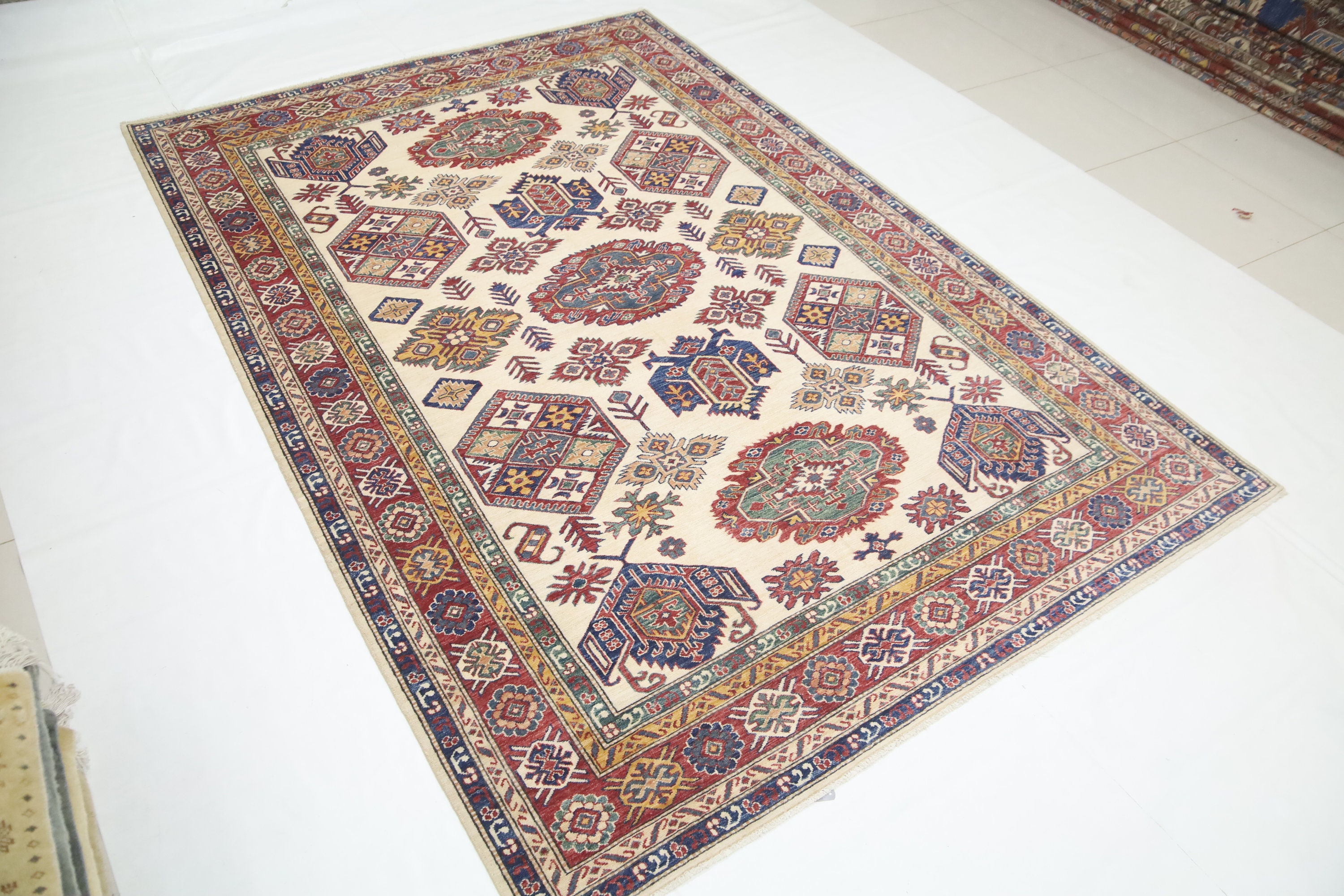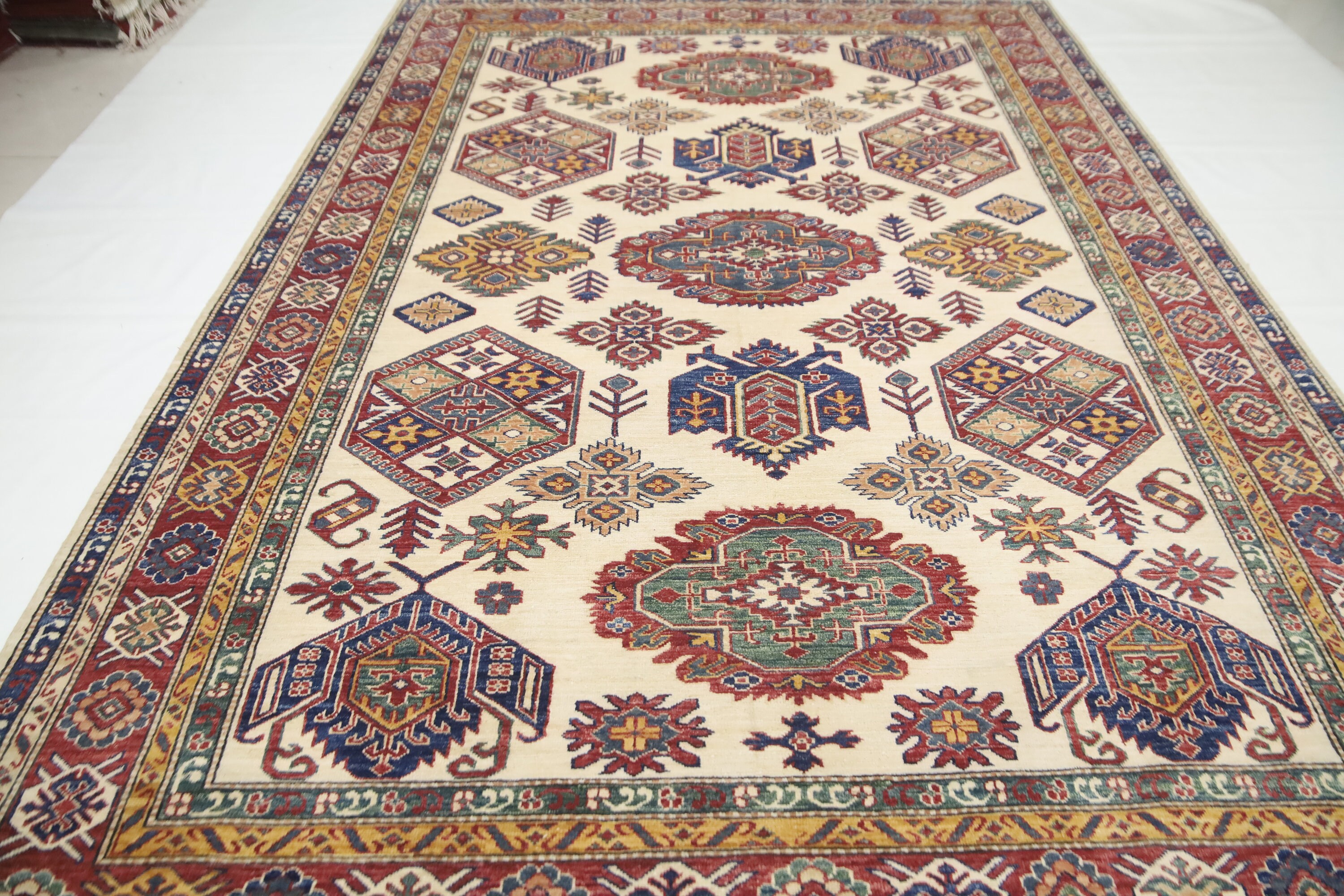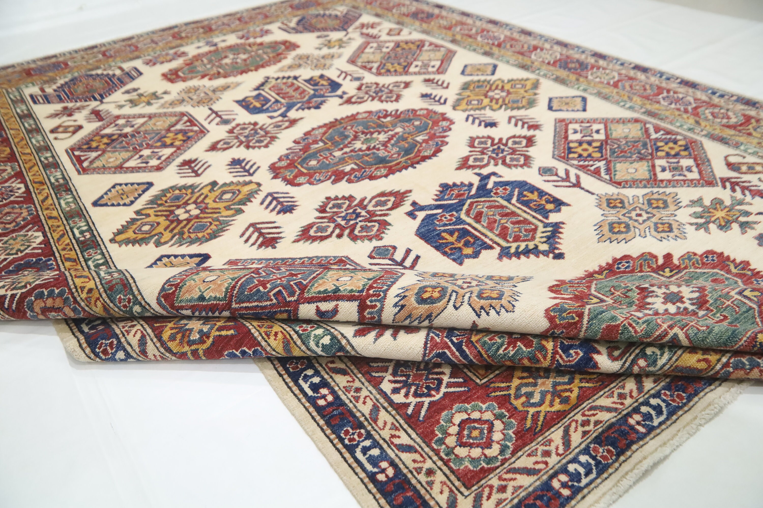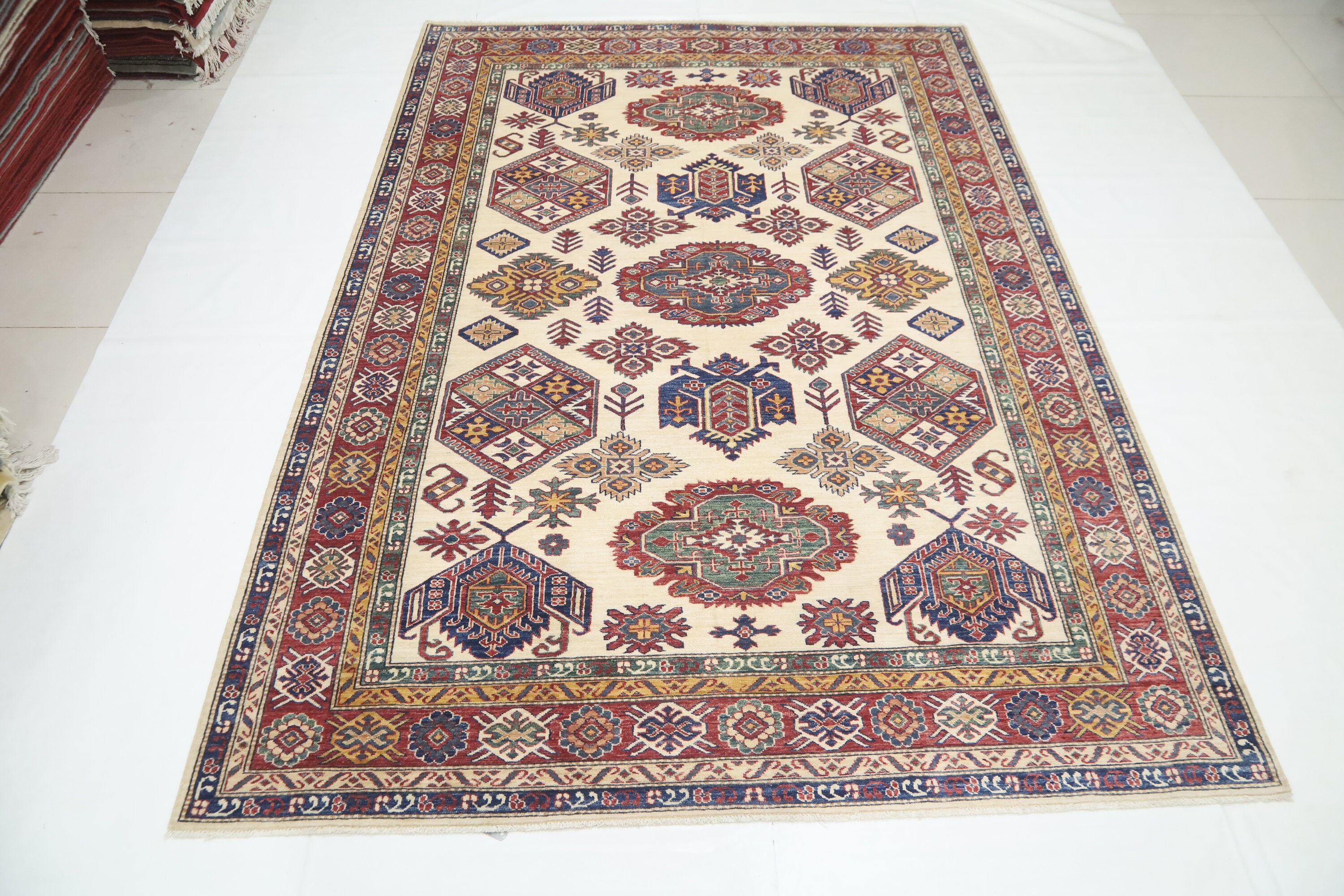 7x10 Beige Kazak Area Rug - Afghan Handmade Geometric Fine Quality Wool Rug - Caucasian Rug - Oriental Rug - Living Room Rug - Bedroom Rug