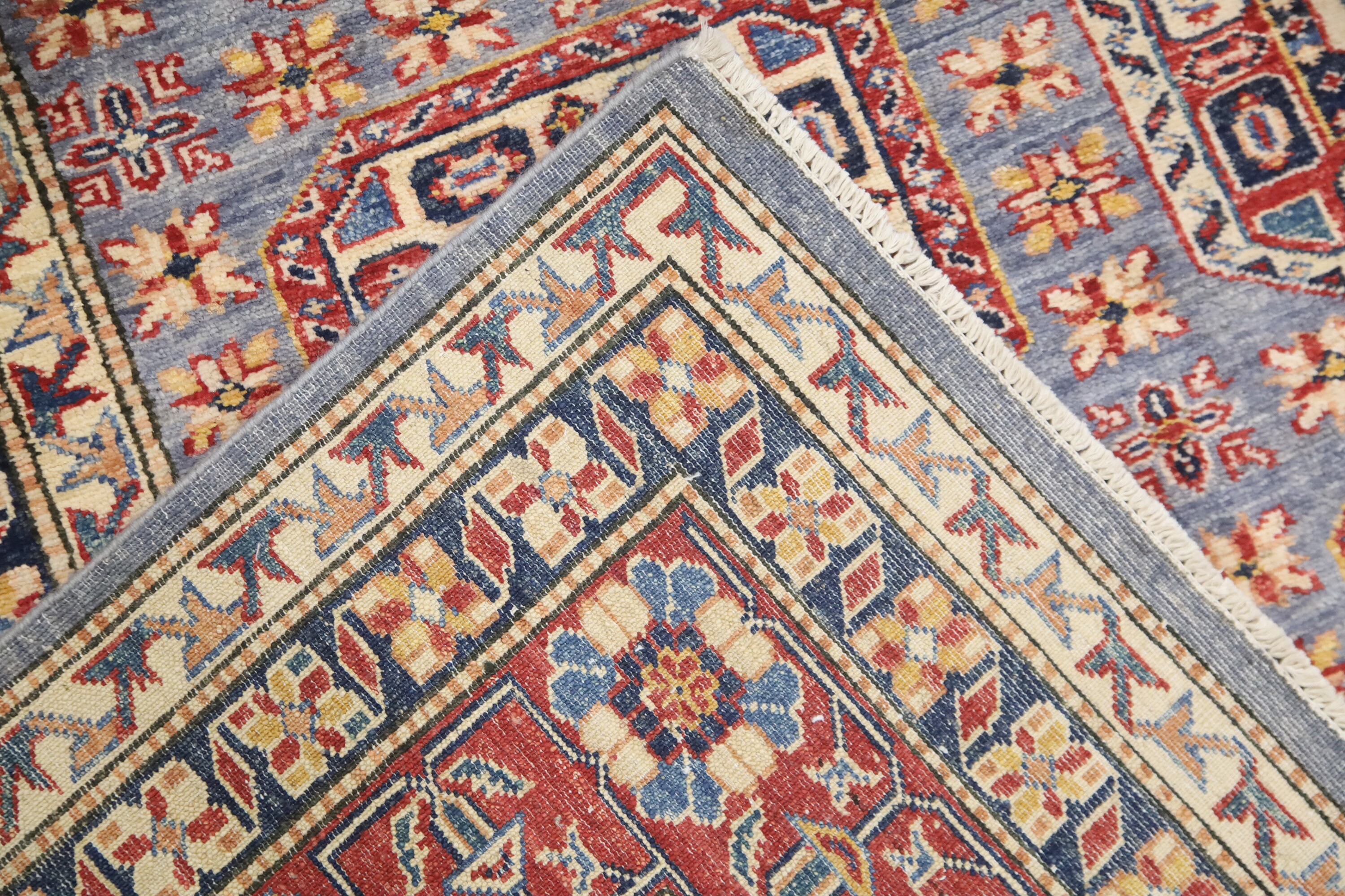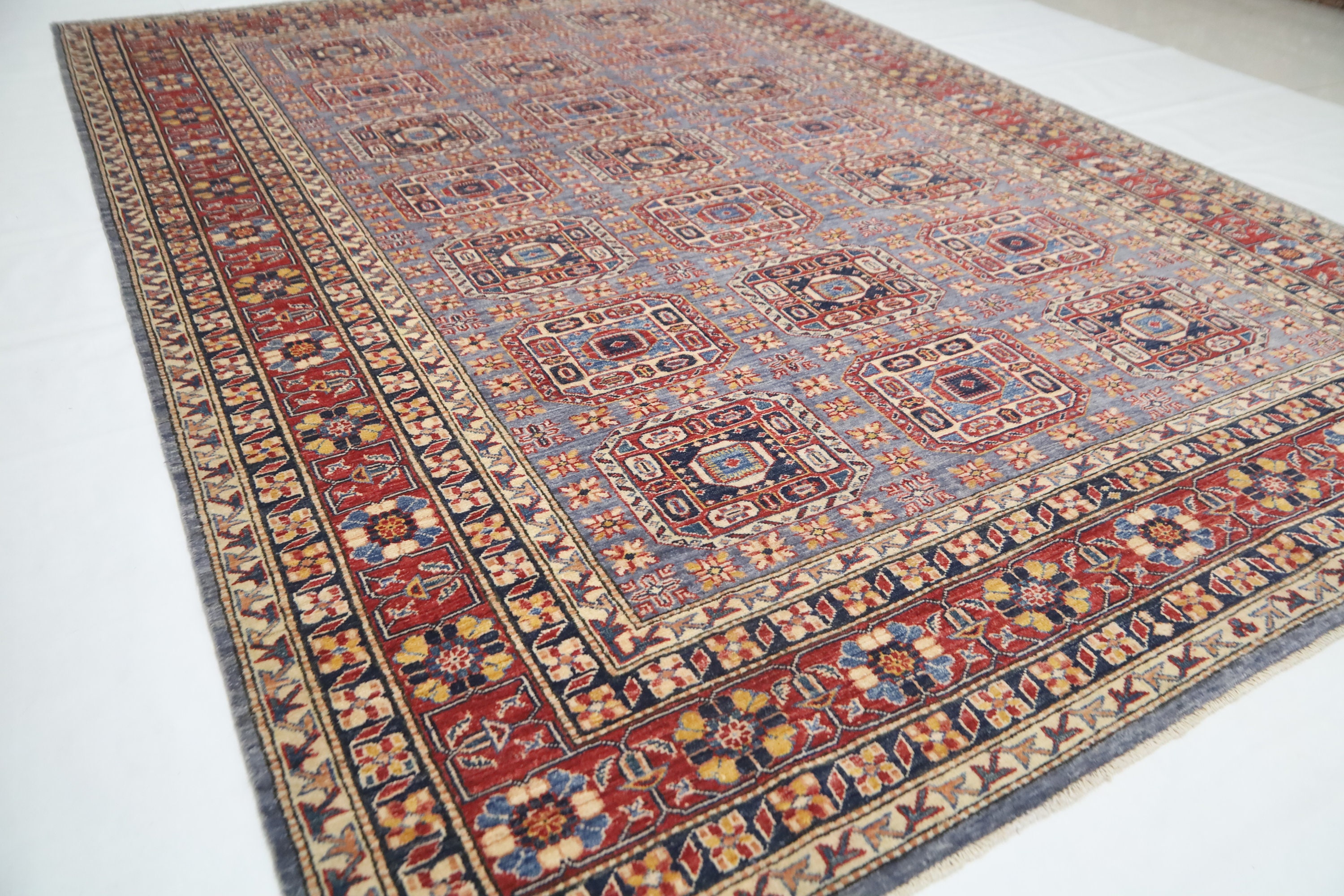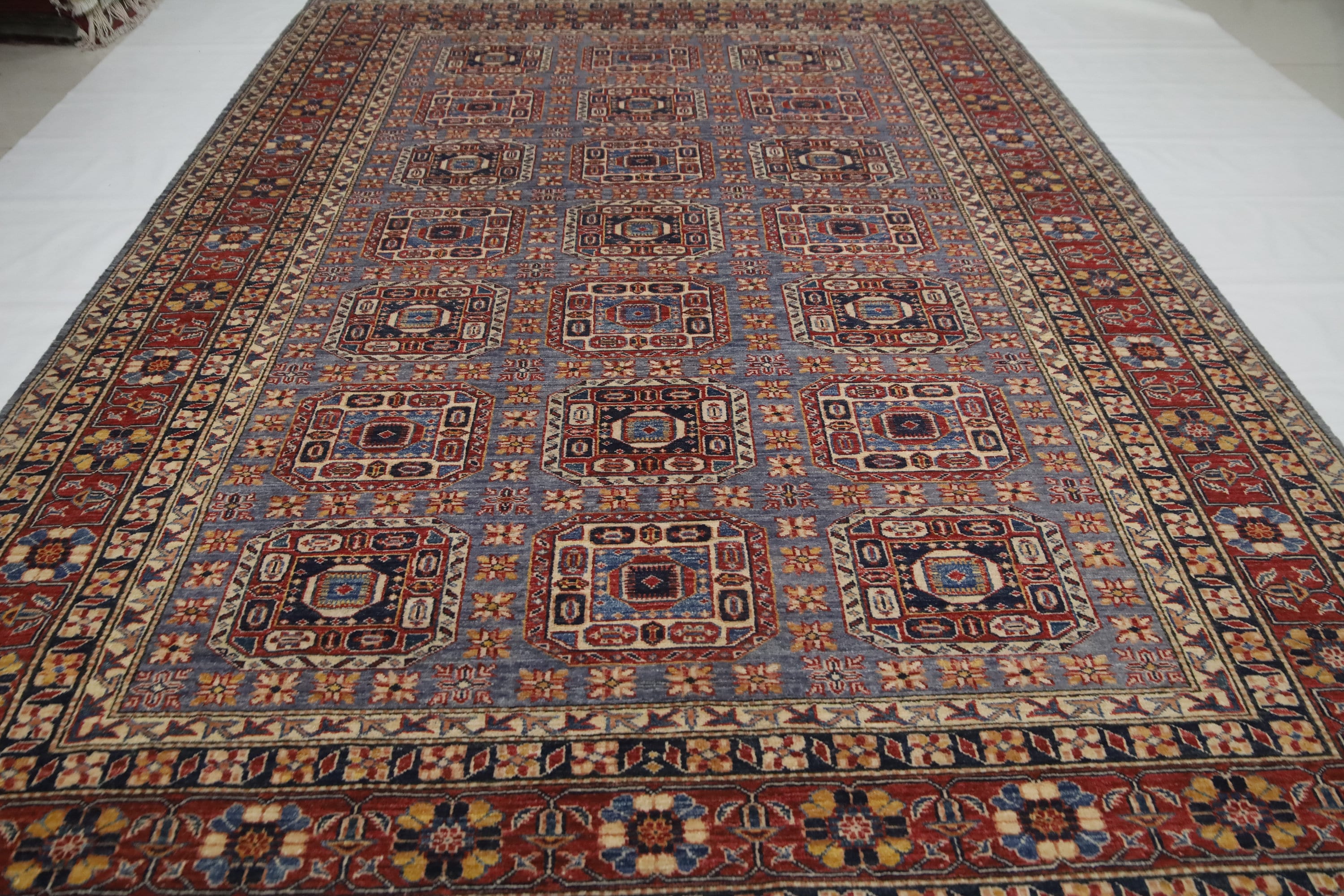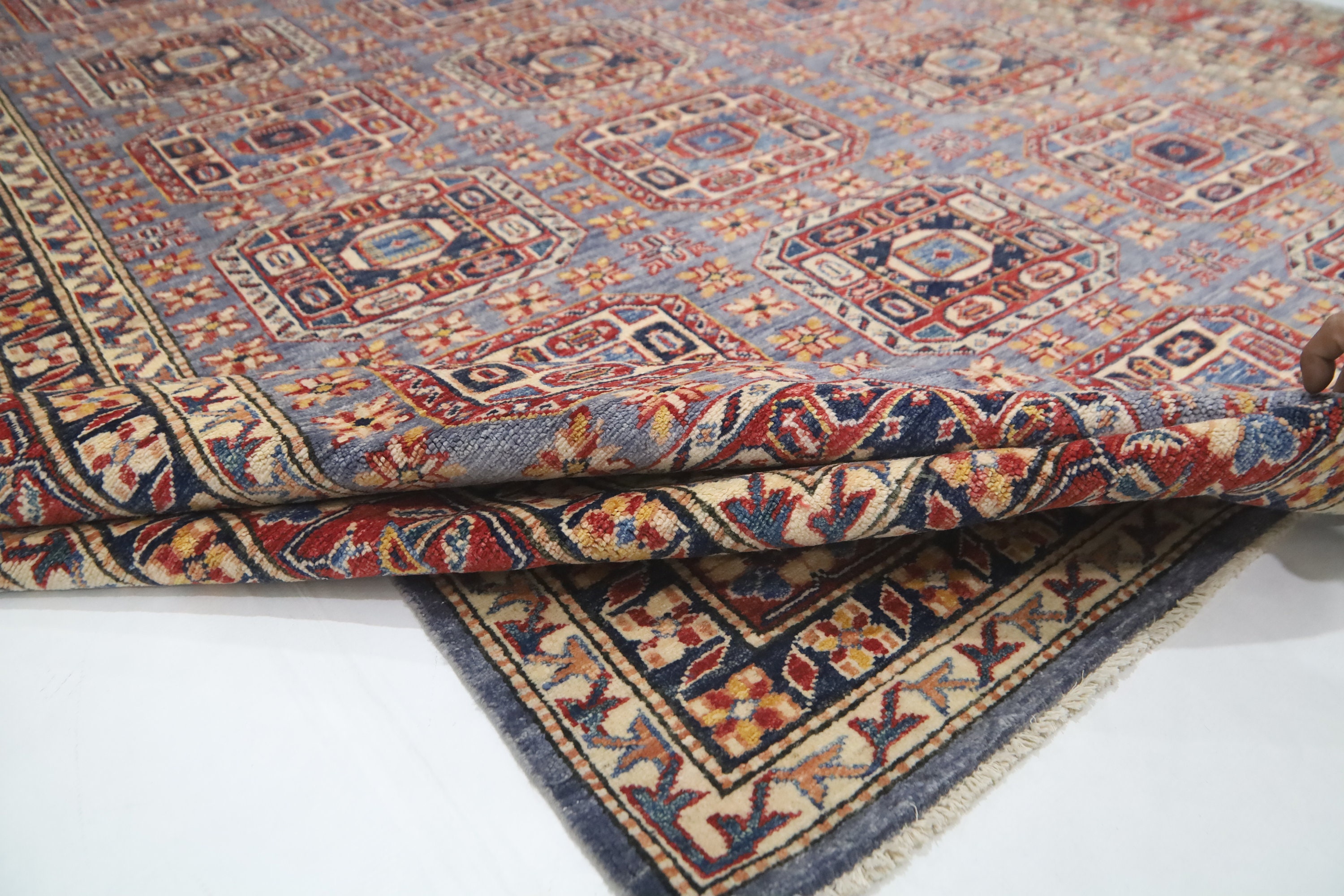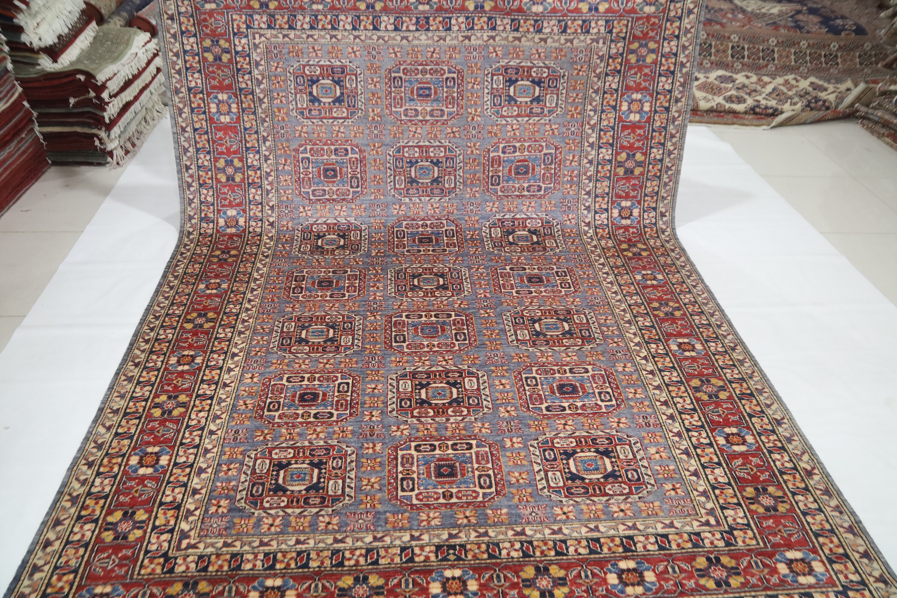 7x10 Ft Kazak Area Rug - Gray Afghan Hand Knotted Geometric Natural Dye Wool Rug - Gray Bedroom Rug - Dining Room Rug - Living Room Rug