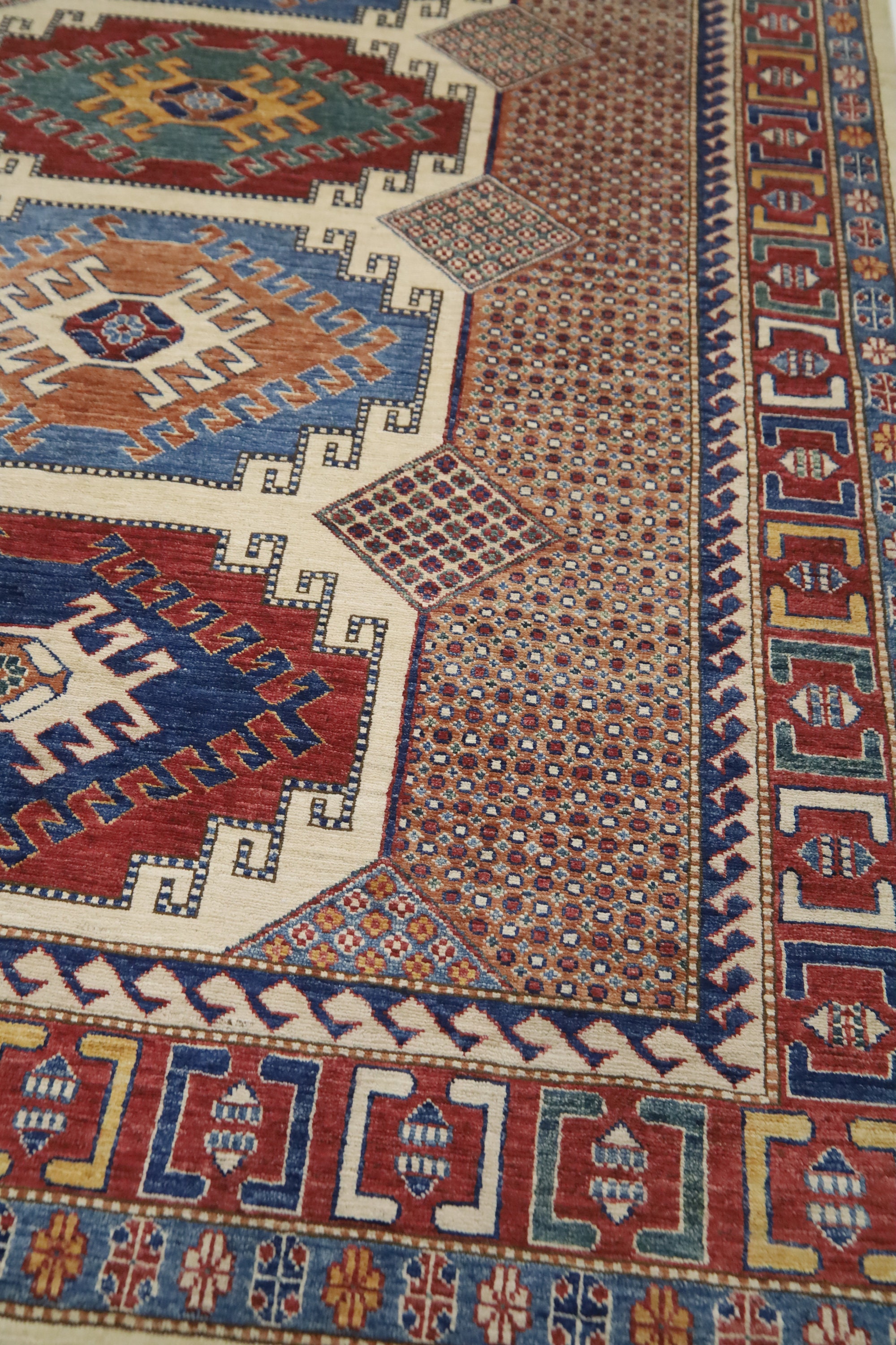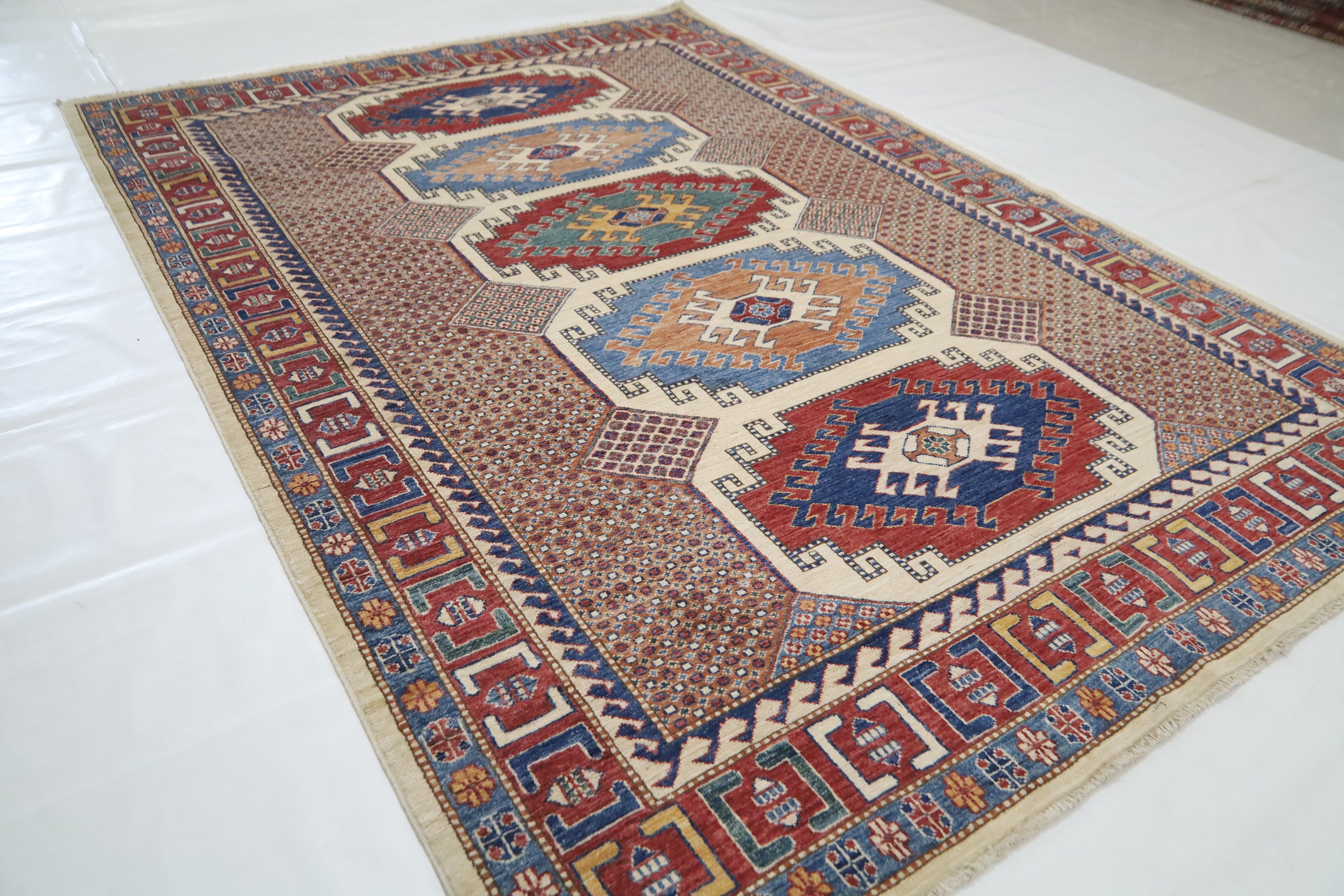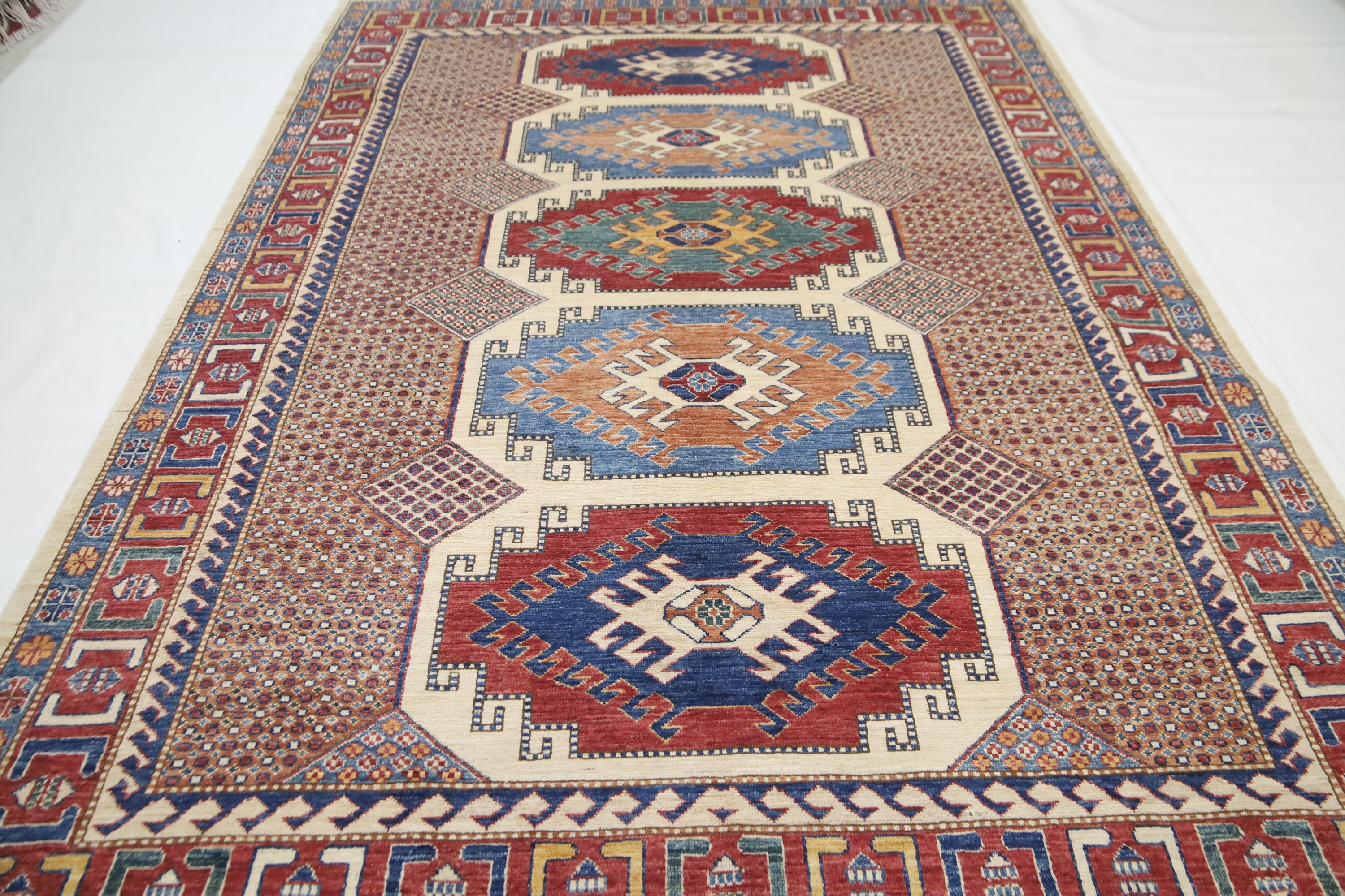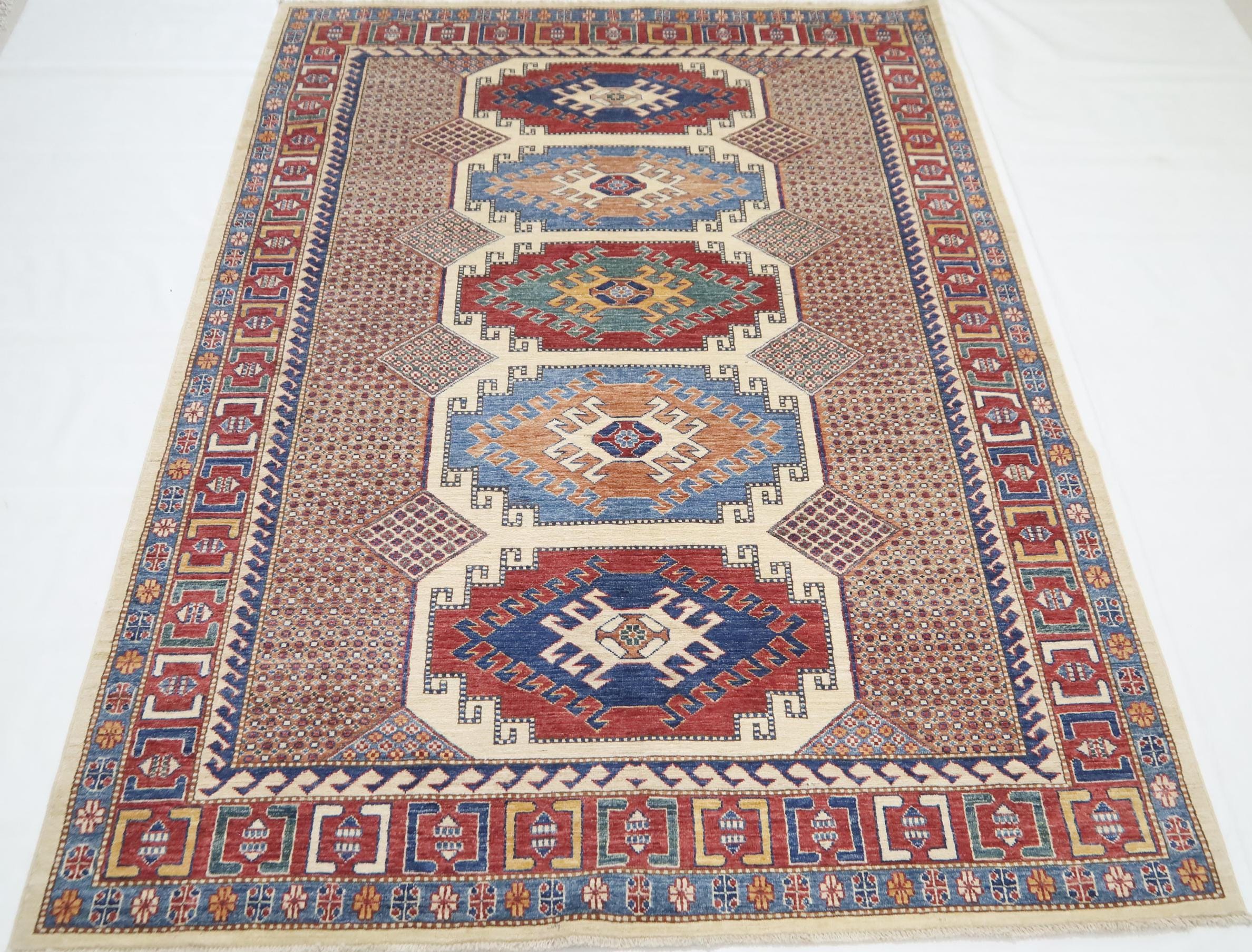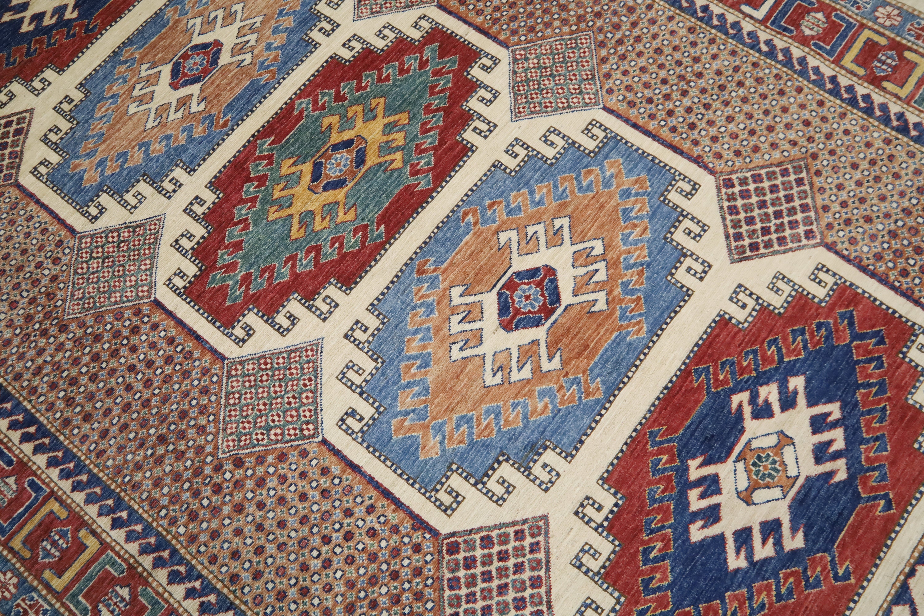 6x8 Kazak Area Rug - Multicolor Afghan Hand Made Geometric Fine Quality Wool Rug - Traditional Rug - Bedroom Rug - Living Room Rug