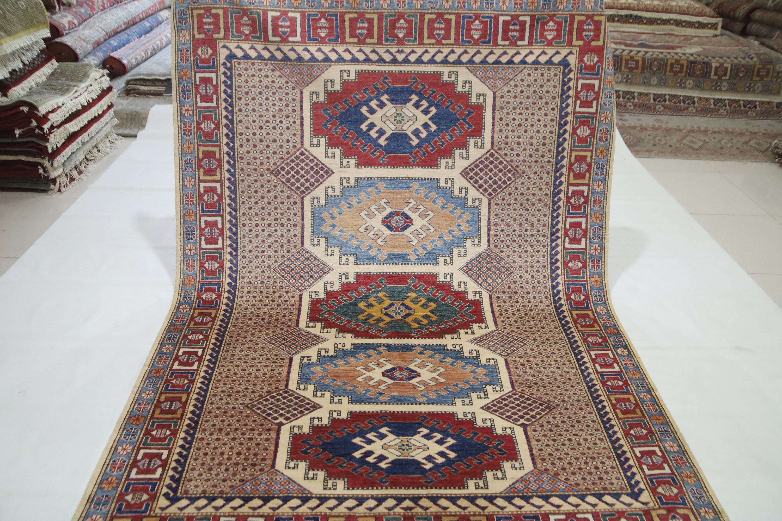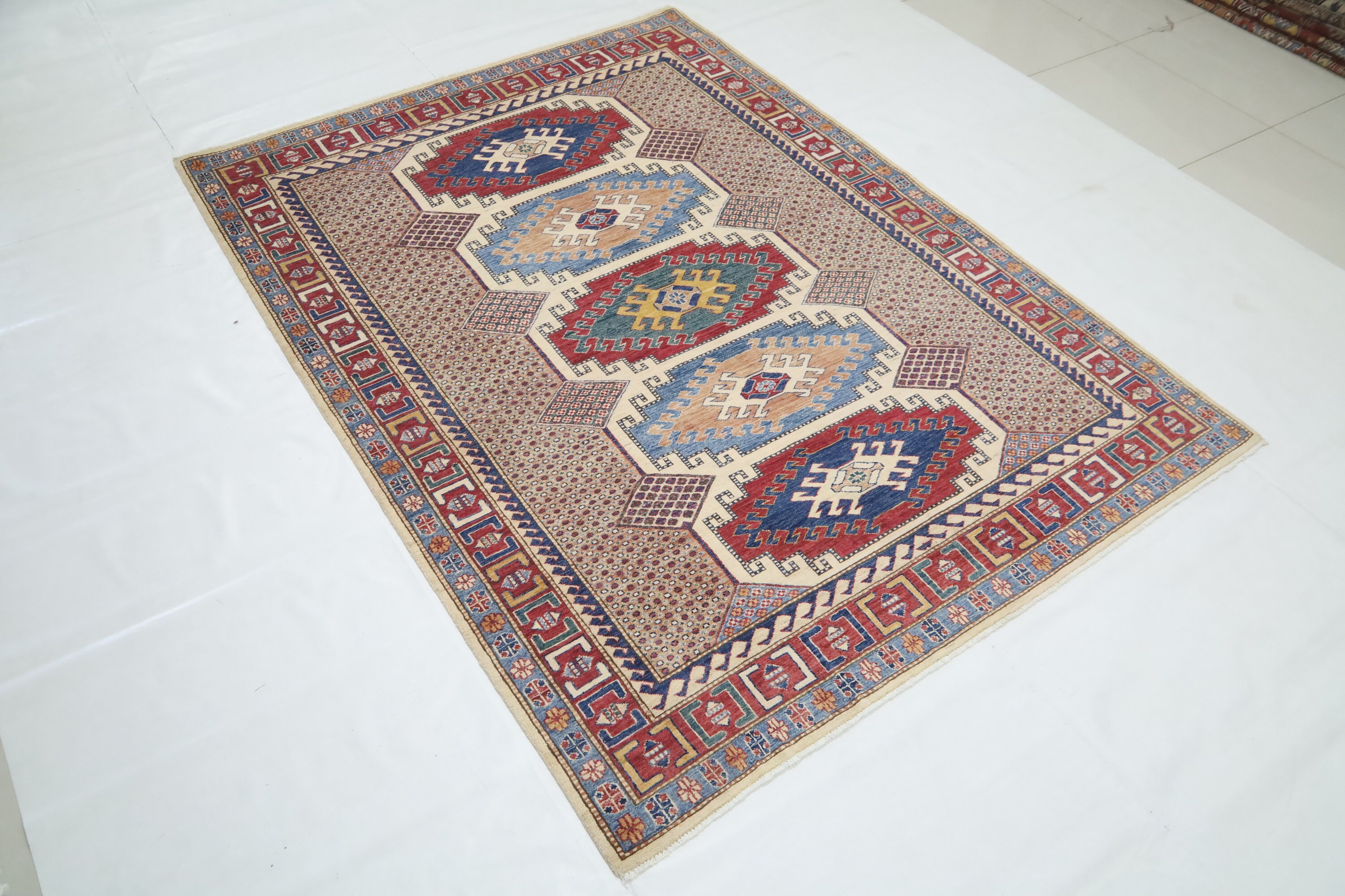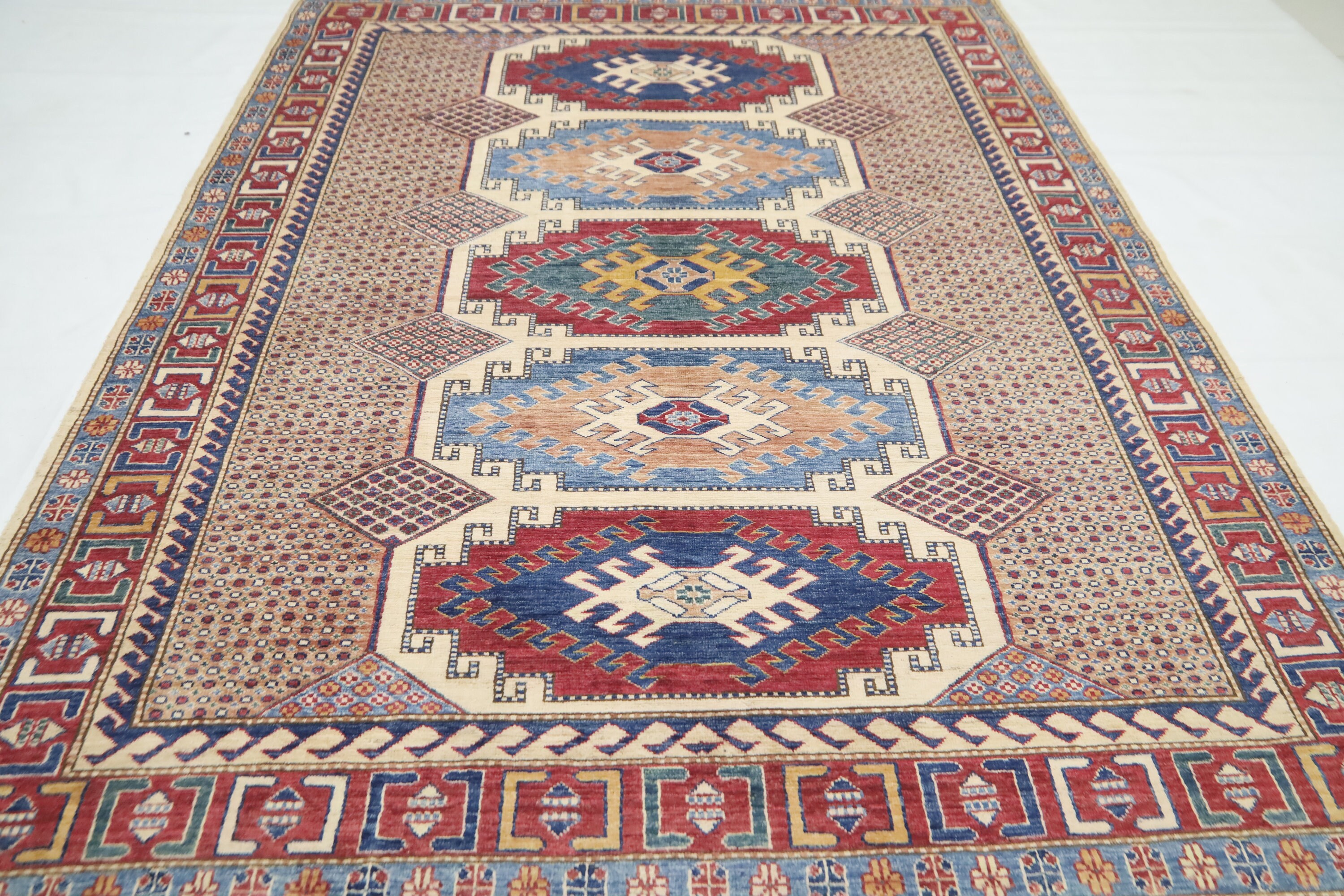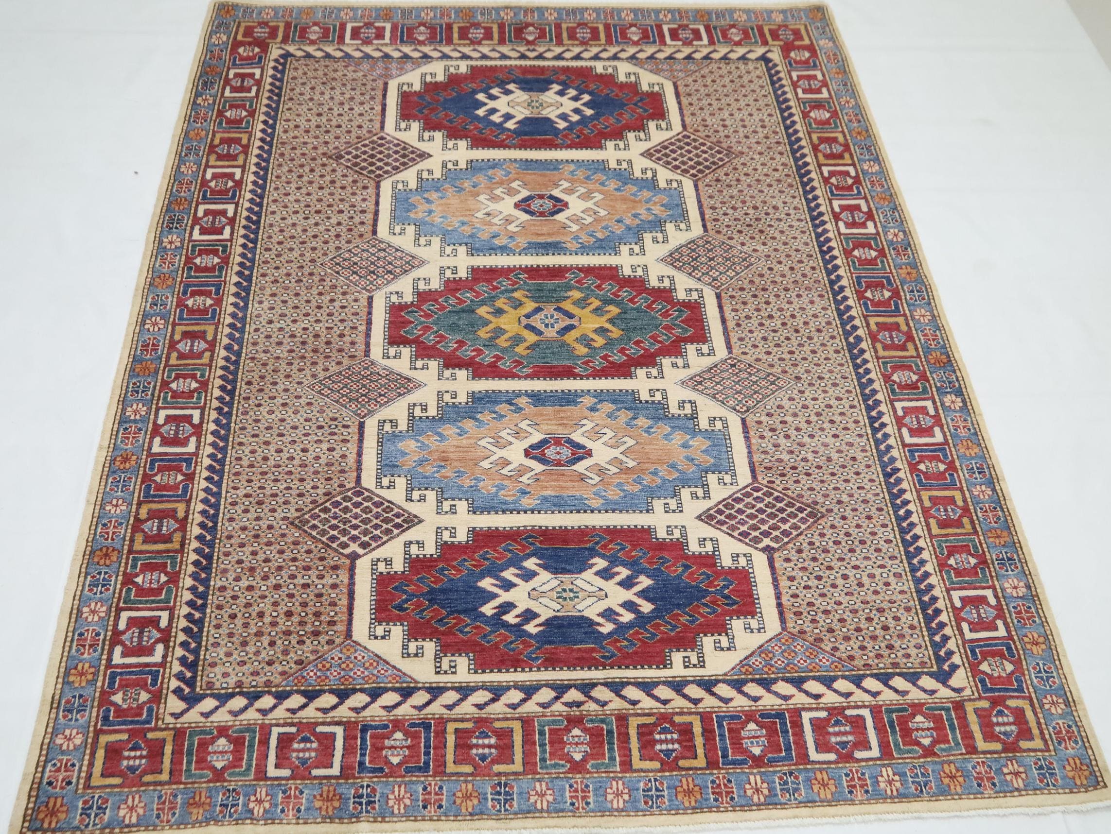 6x8 Kazak Area Rug - Light Brown Afghan Handmade Geometric Veg Dye Wool Rug - Traditional Rugs - Bedroom Rug - Living Room Rug - Office Rug