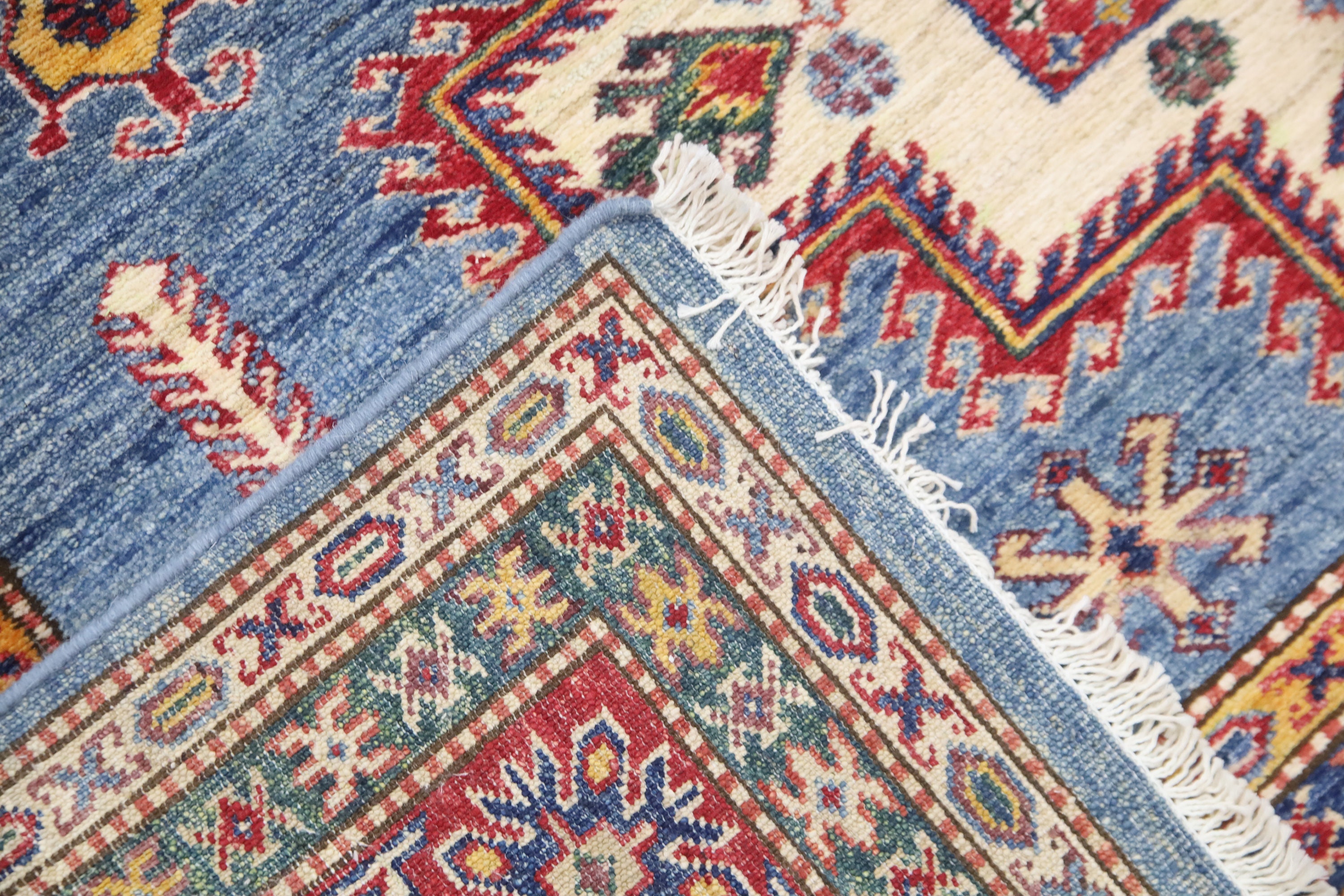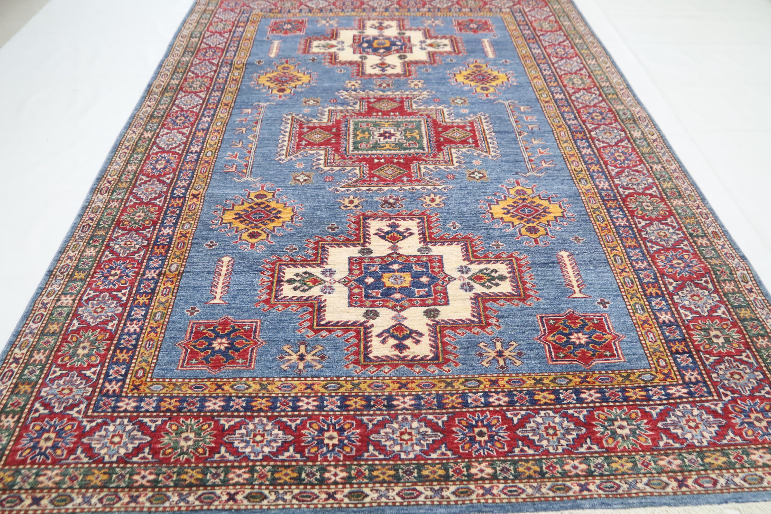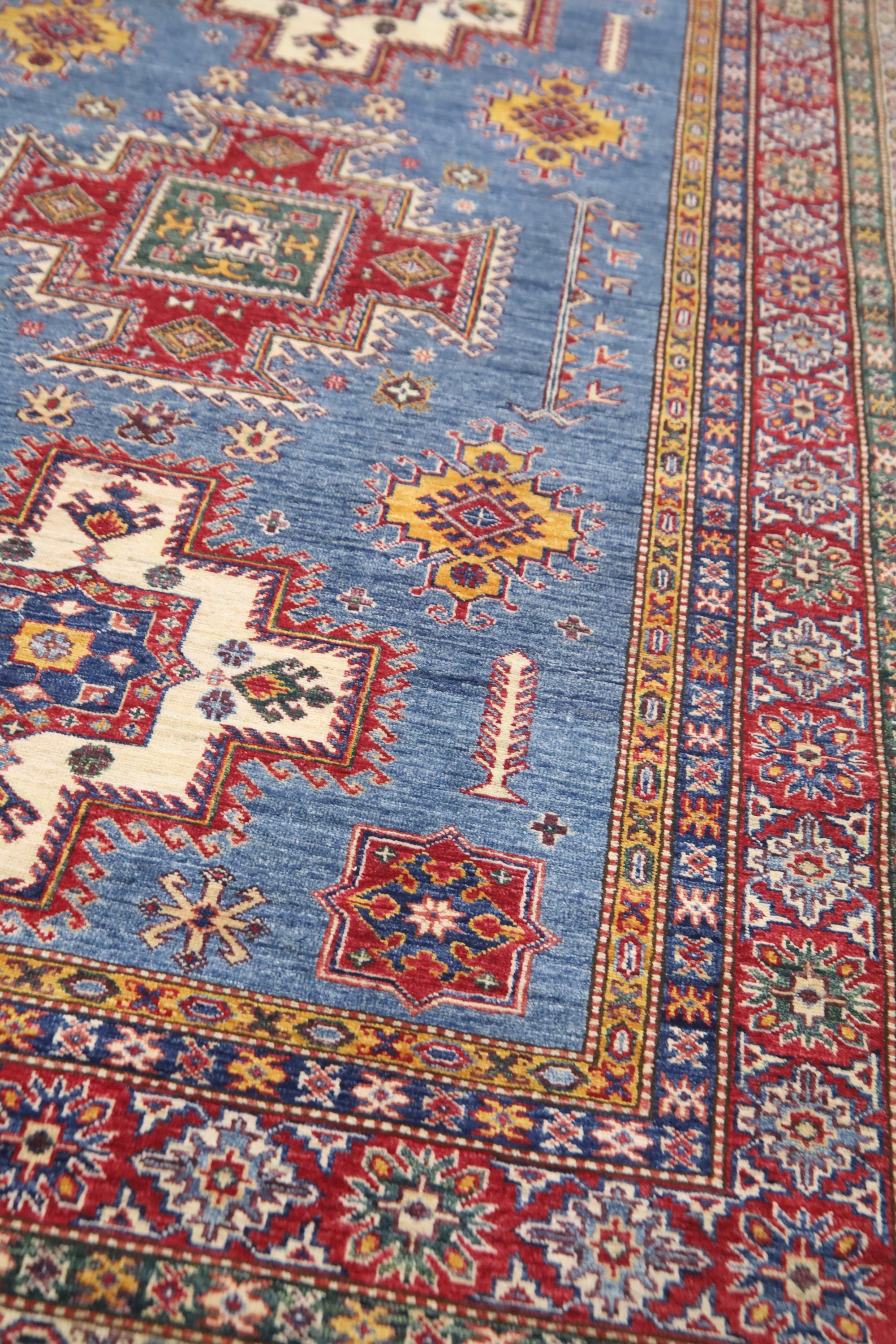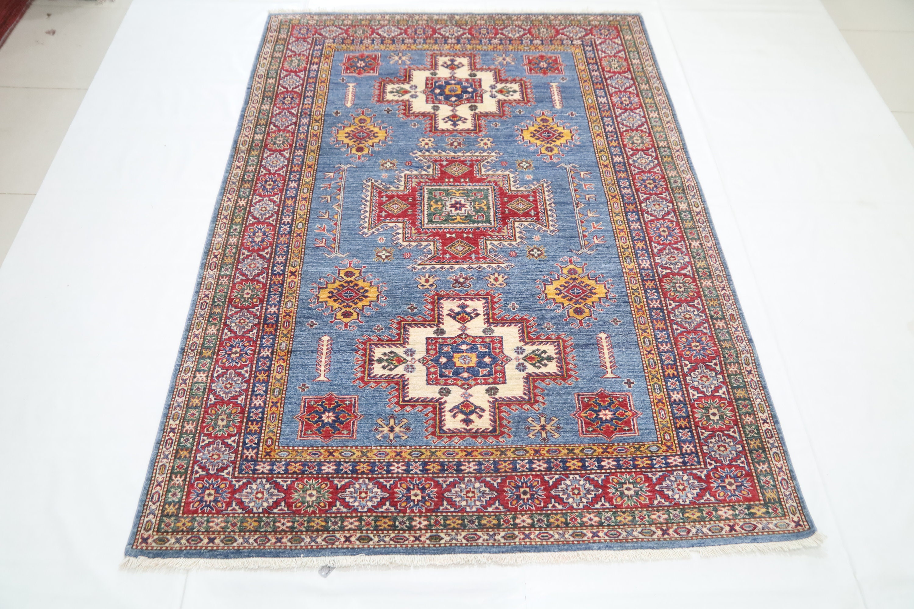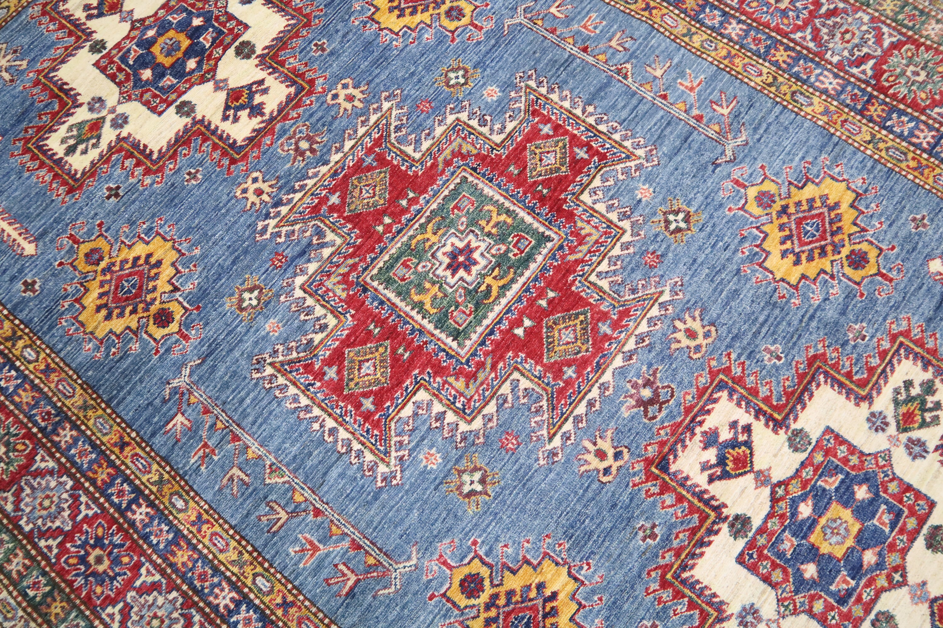 6x8 Ft Geometric Kazak Area Rug - Blue Red Afghan Hand Made Traditional Fine Quality Wool Rug - Caucasian Rug - Bedroom Rug - Kitchen Rug
