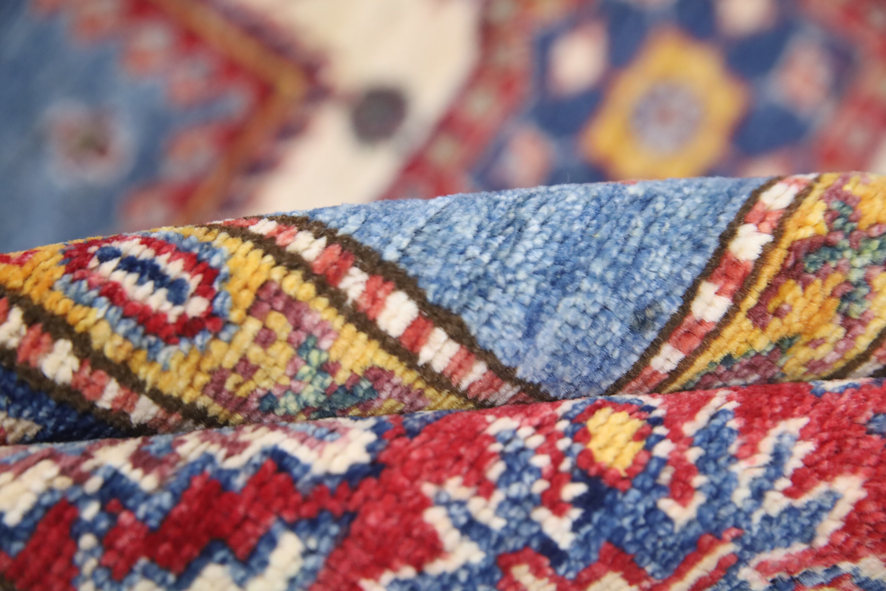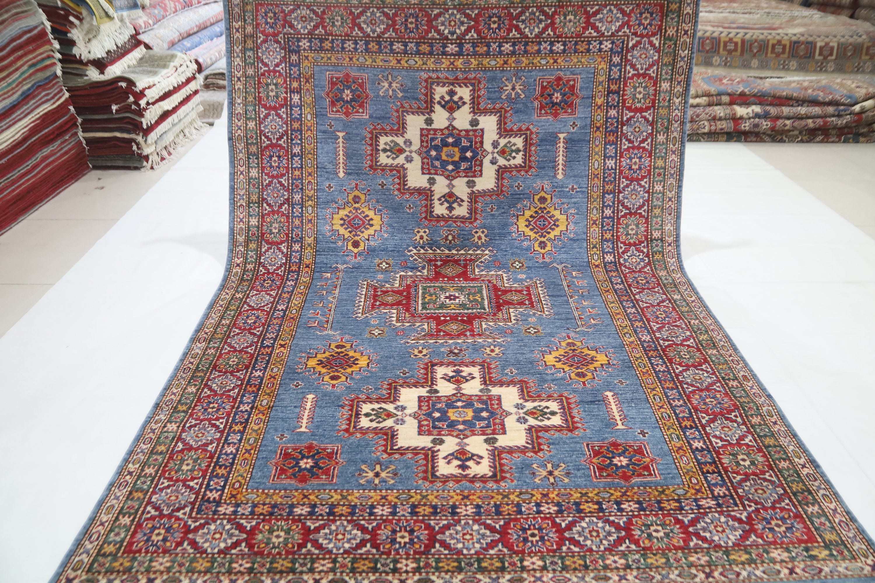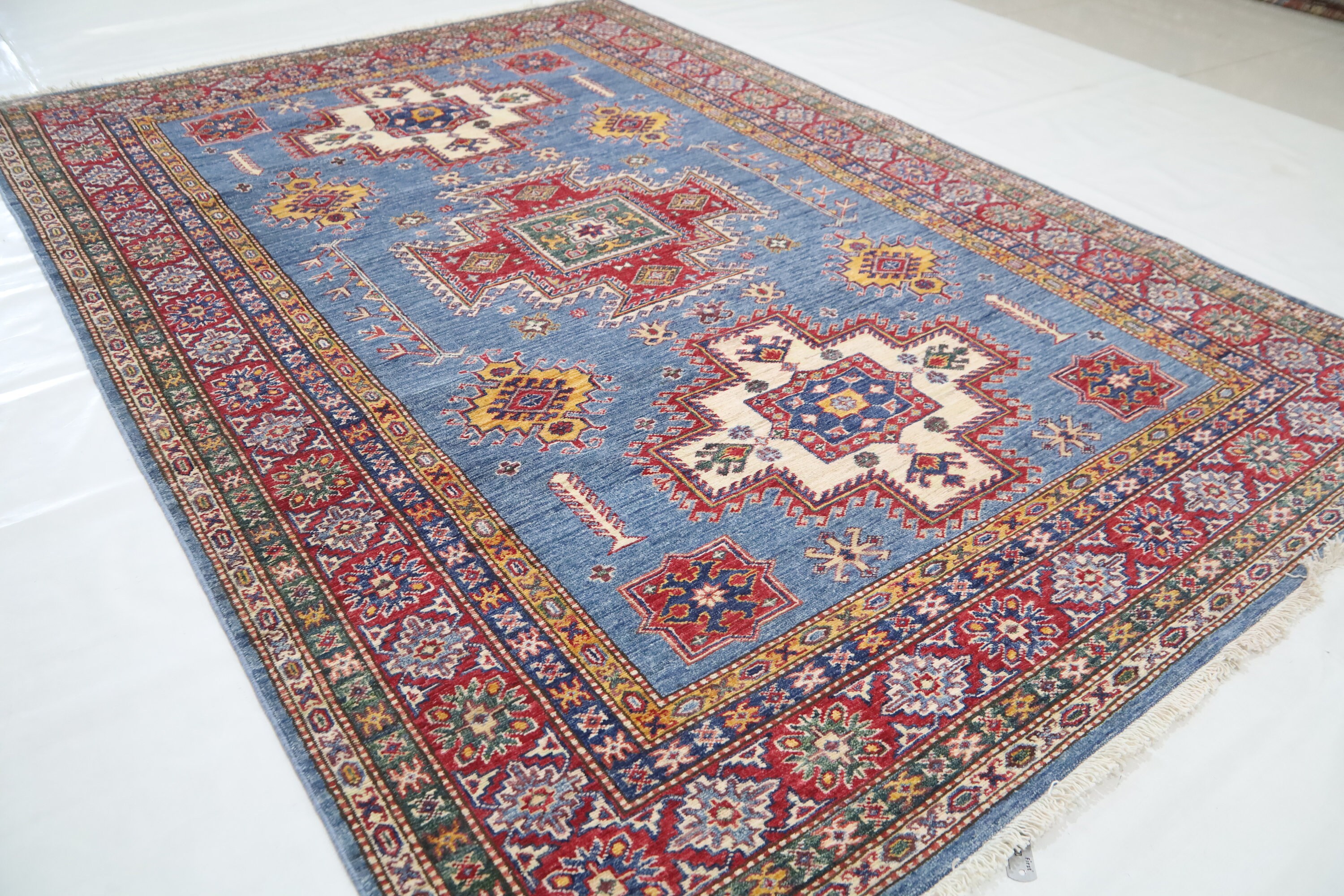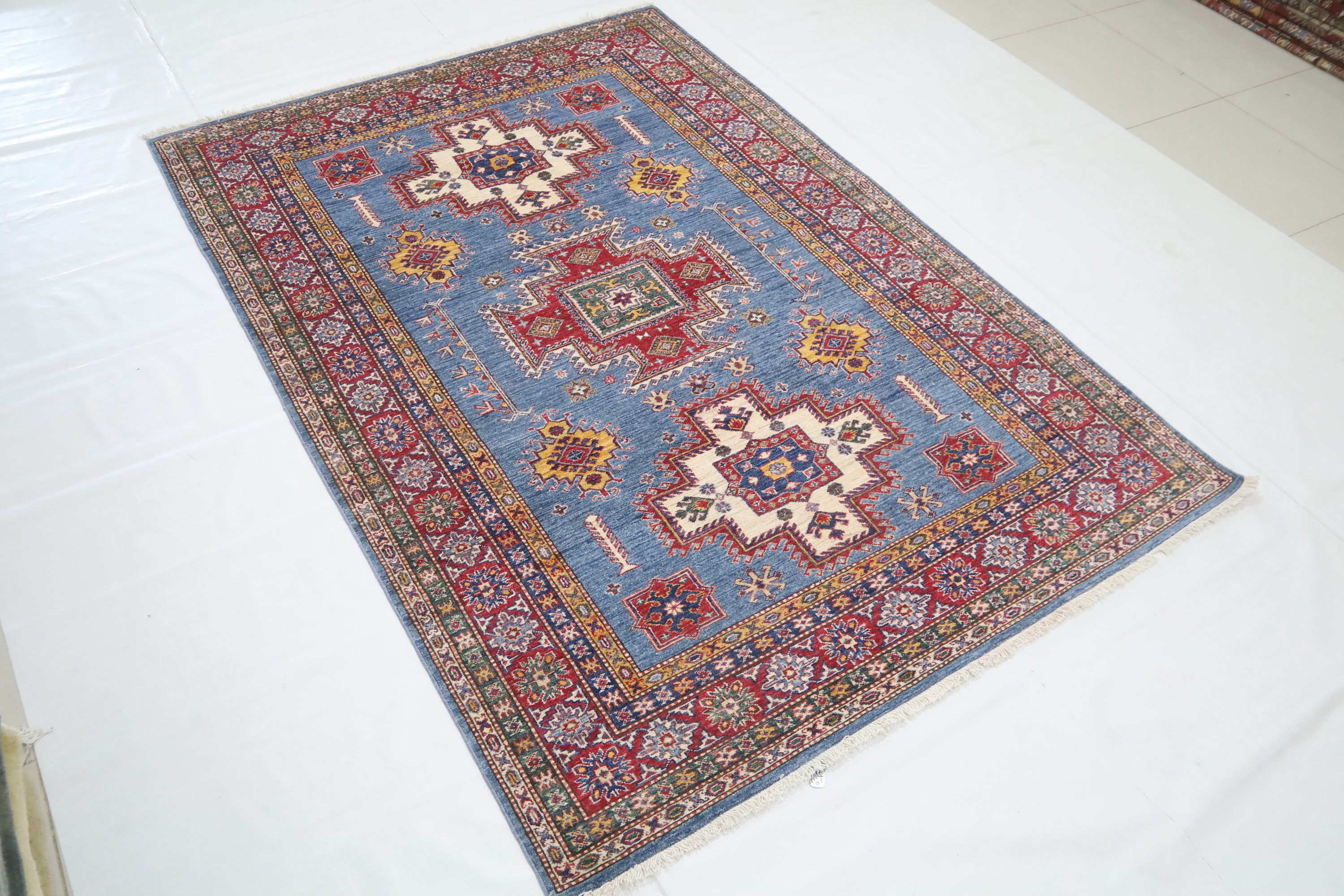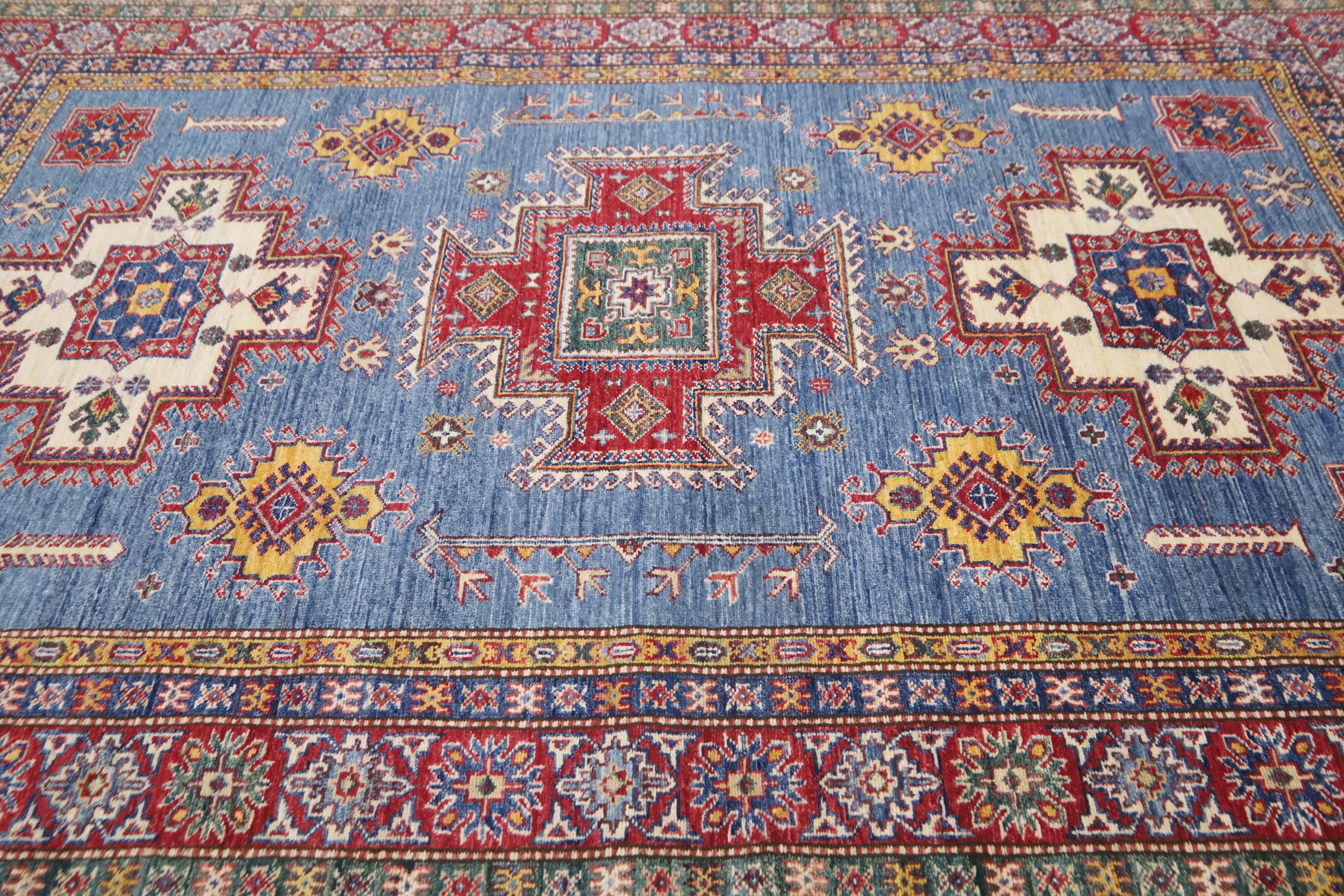 6x8 Ft Geometric Kazak Area Rug - Blue Red Afghan Hand Made Traditional Fine Quality Wool Rug - Caucasian Rug - Bedroom Rug - Kitchen Rug