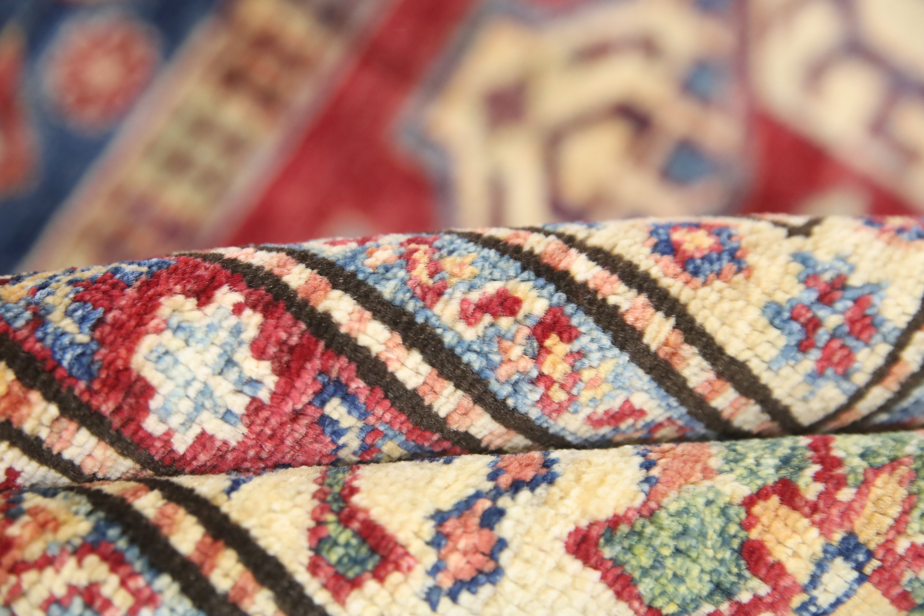 This hand-knotted pile rug is crafted using 100% natural dyes and handspun wool, giving it a rich texture and vibrant colors.
