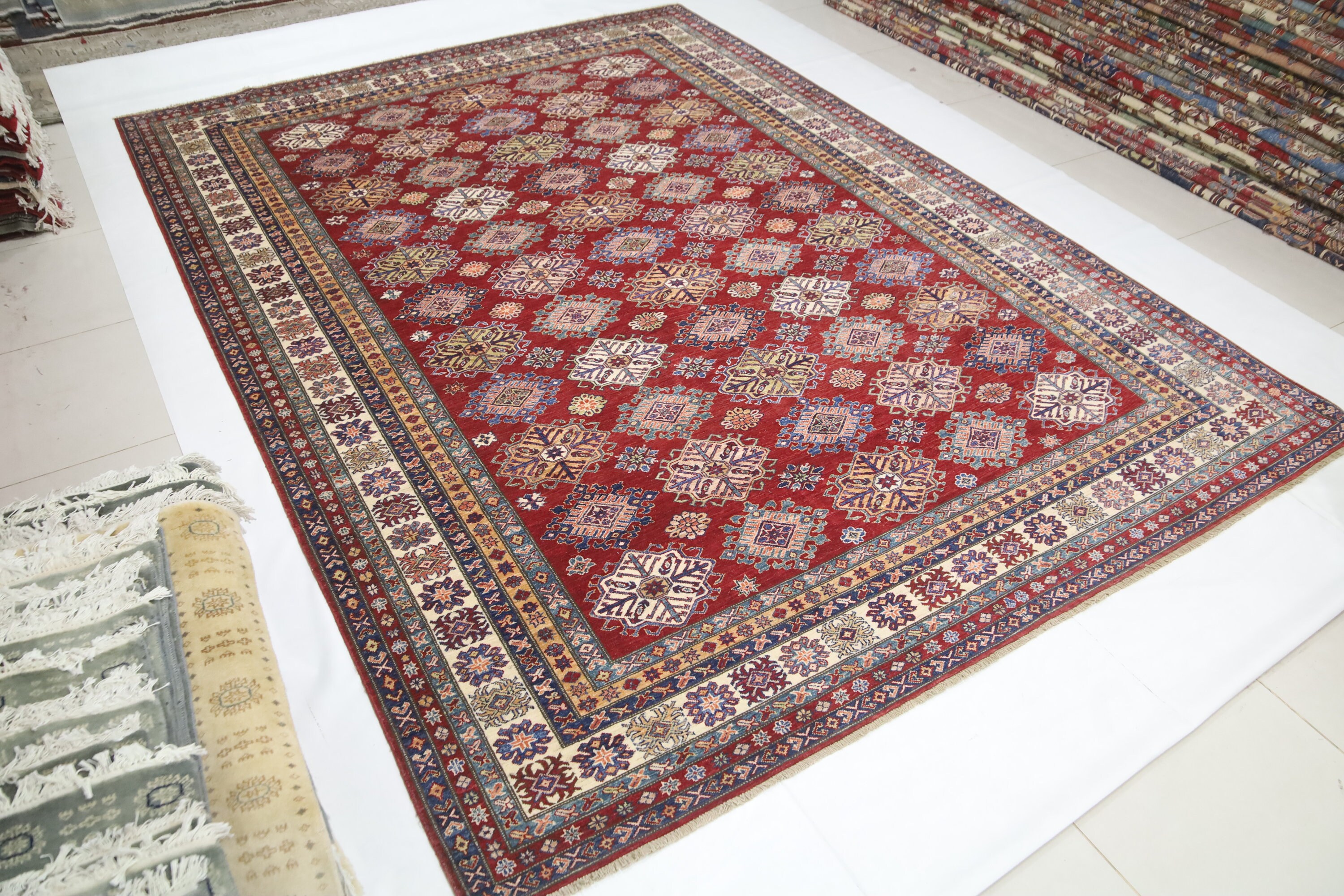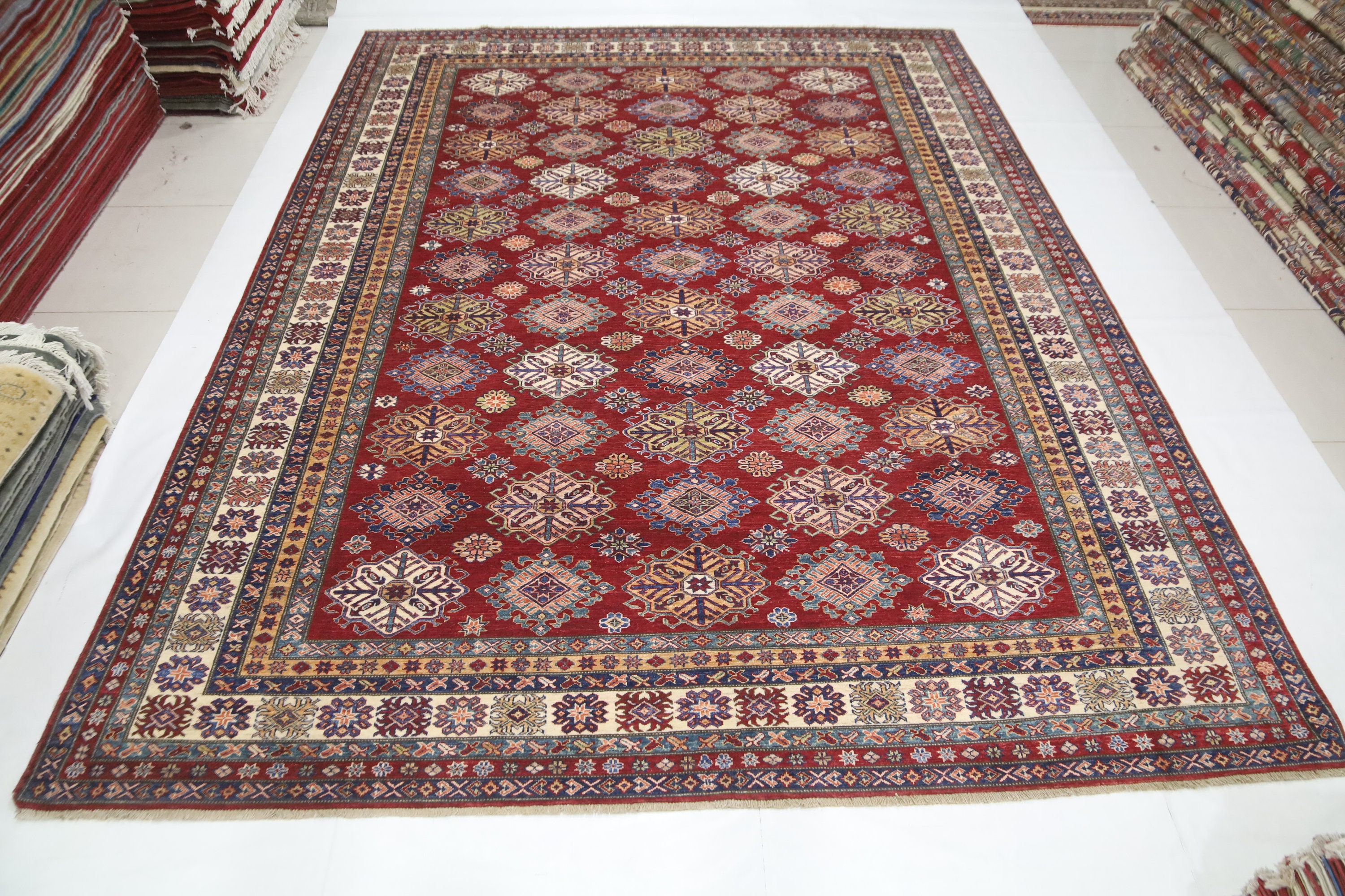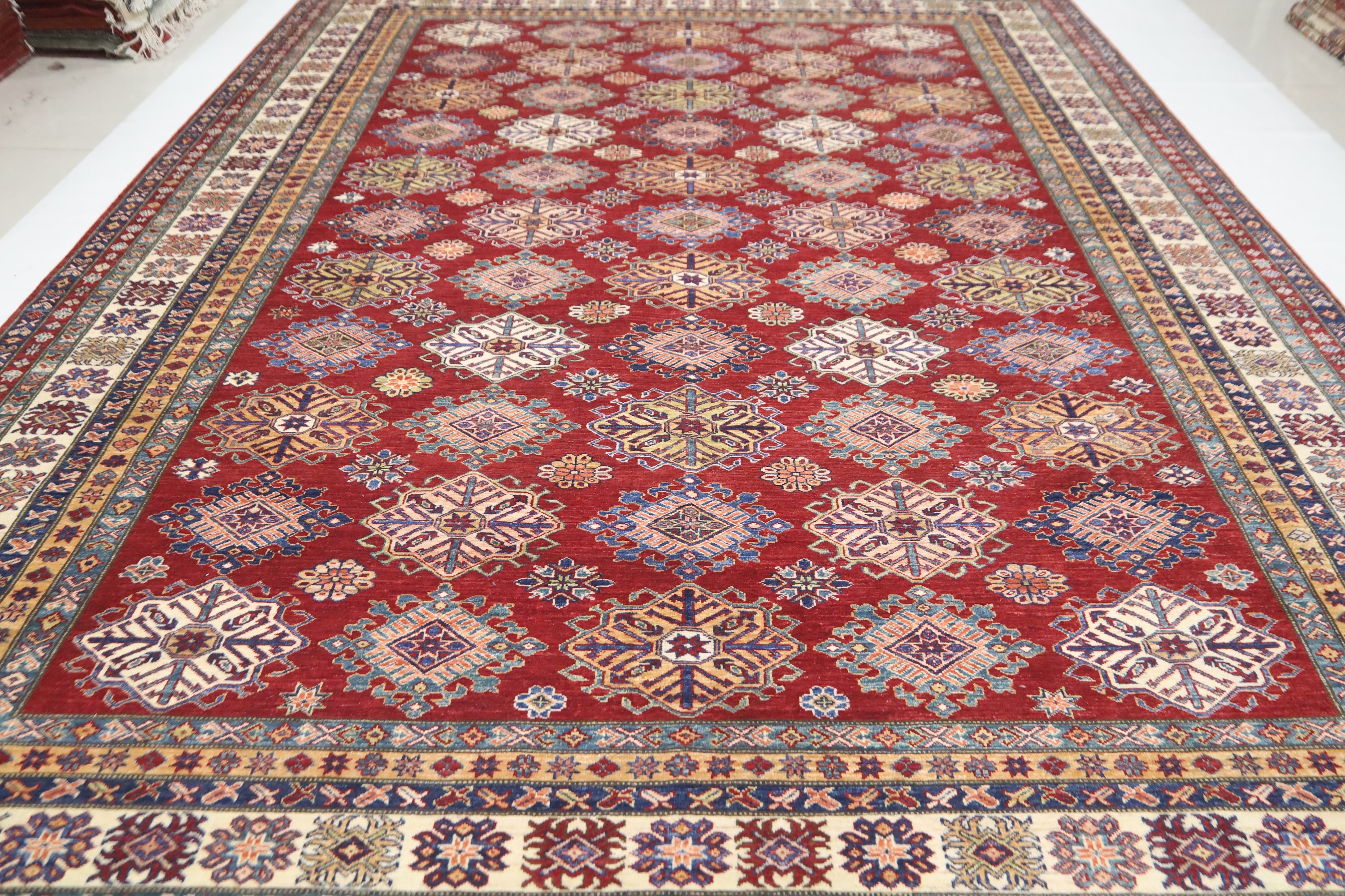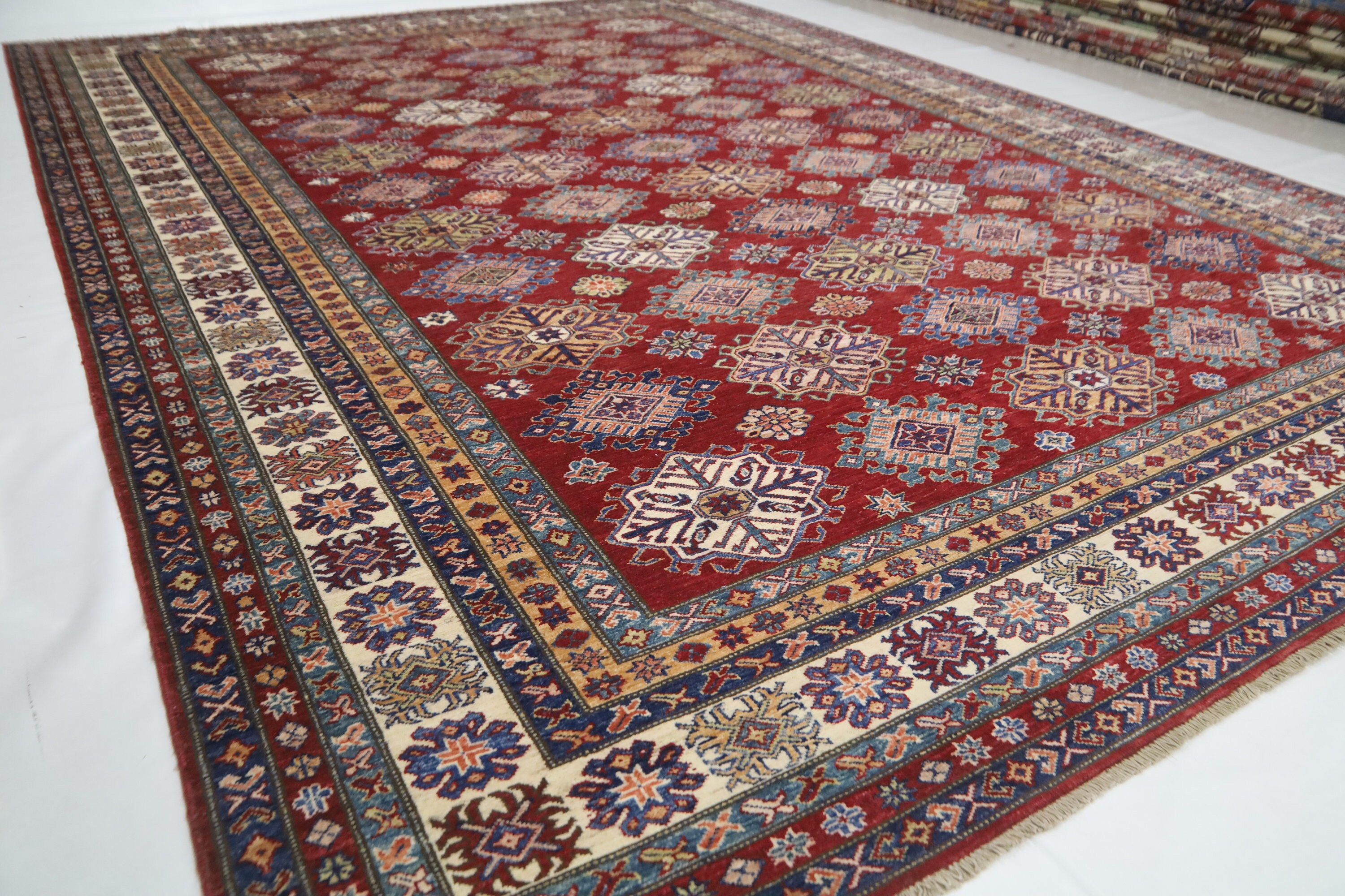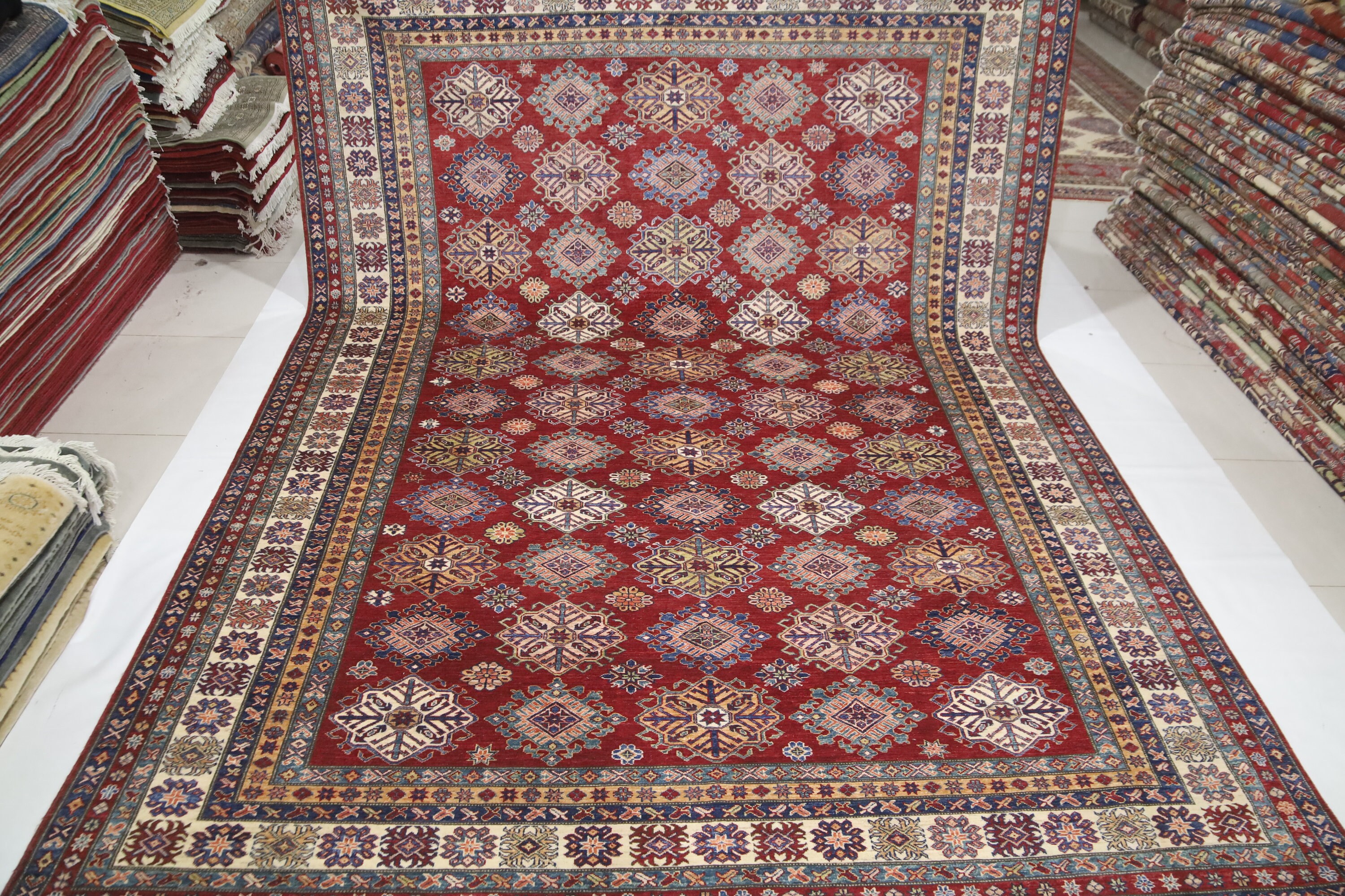 Red 9x12 Kazak Area Rug - Afghan Hand Made Geometric Design Fine Quality Wool Rug - Traditional Rug - Dining Room Rug - Living Room Rug