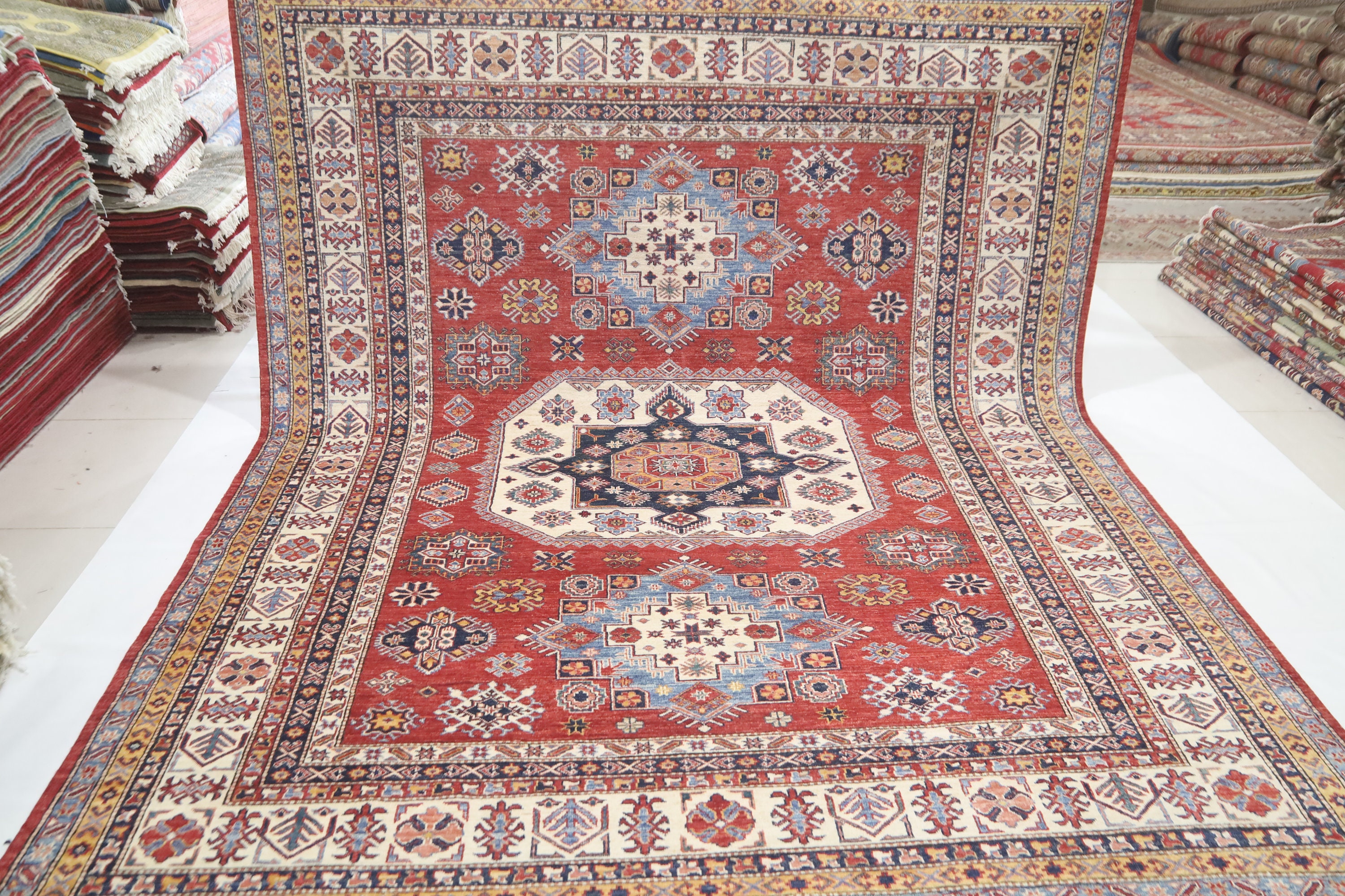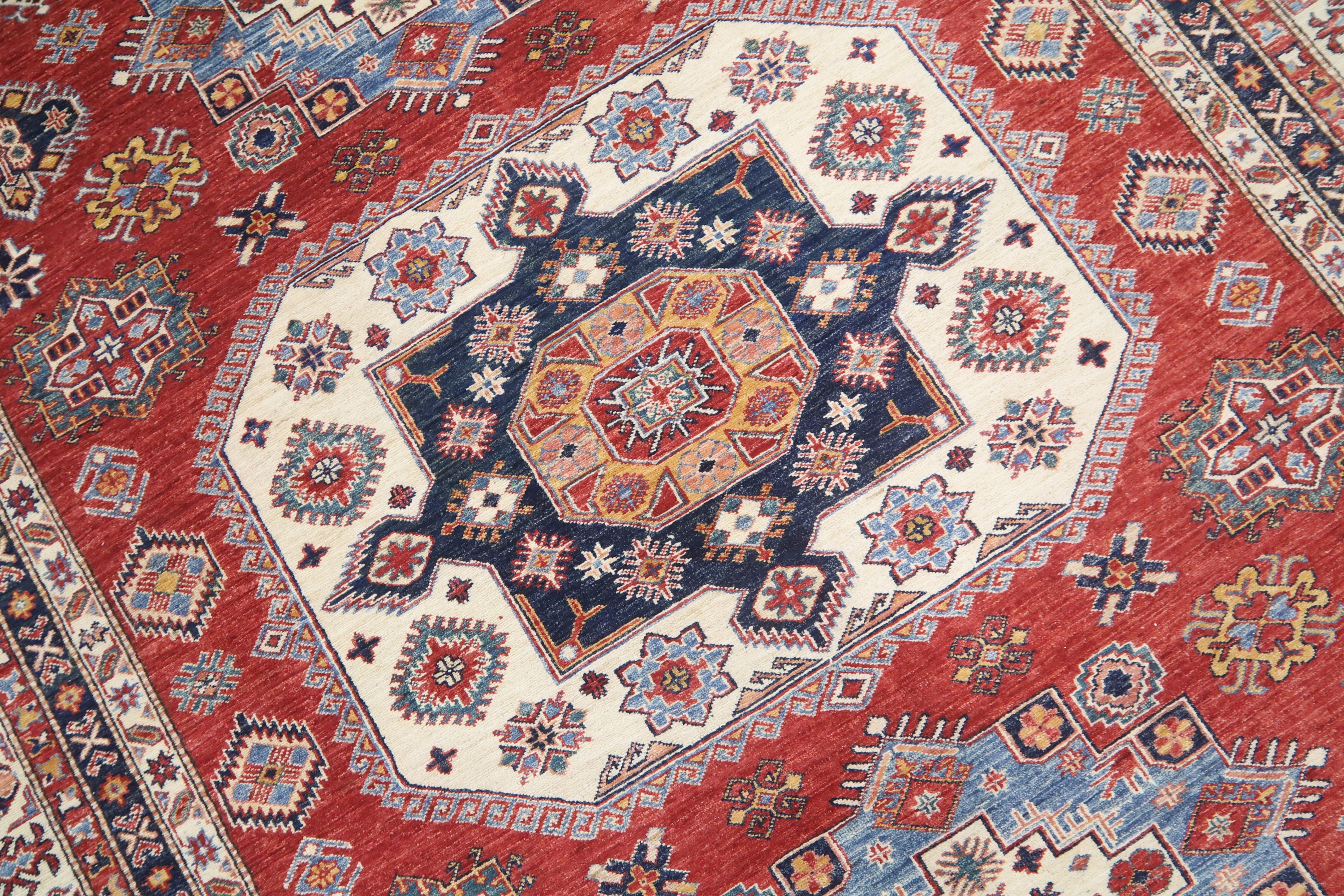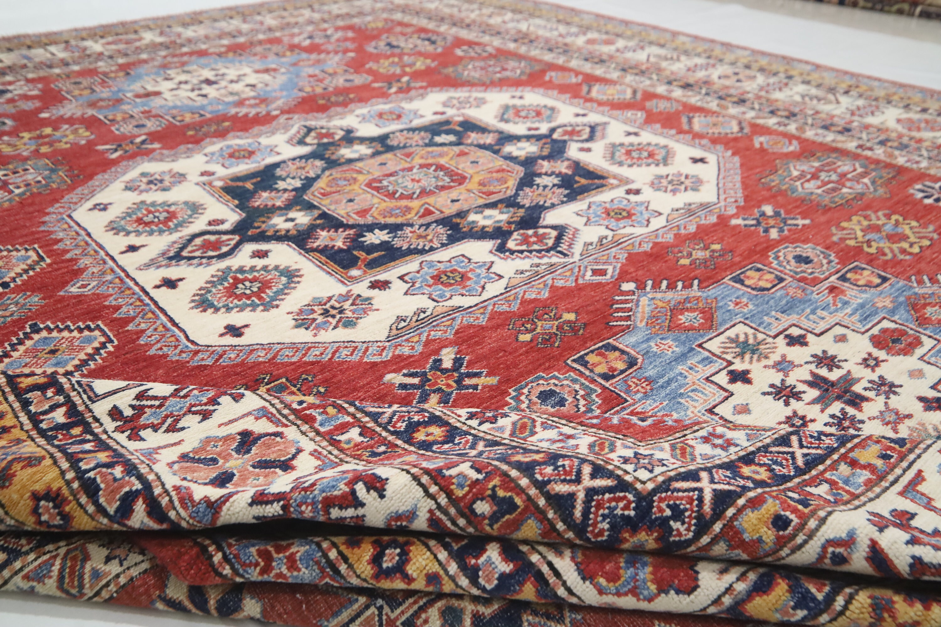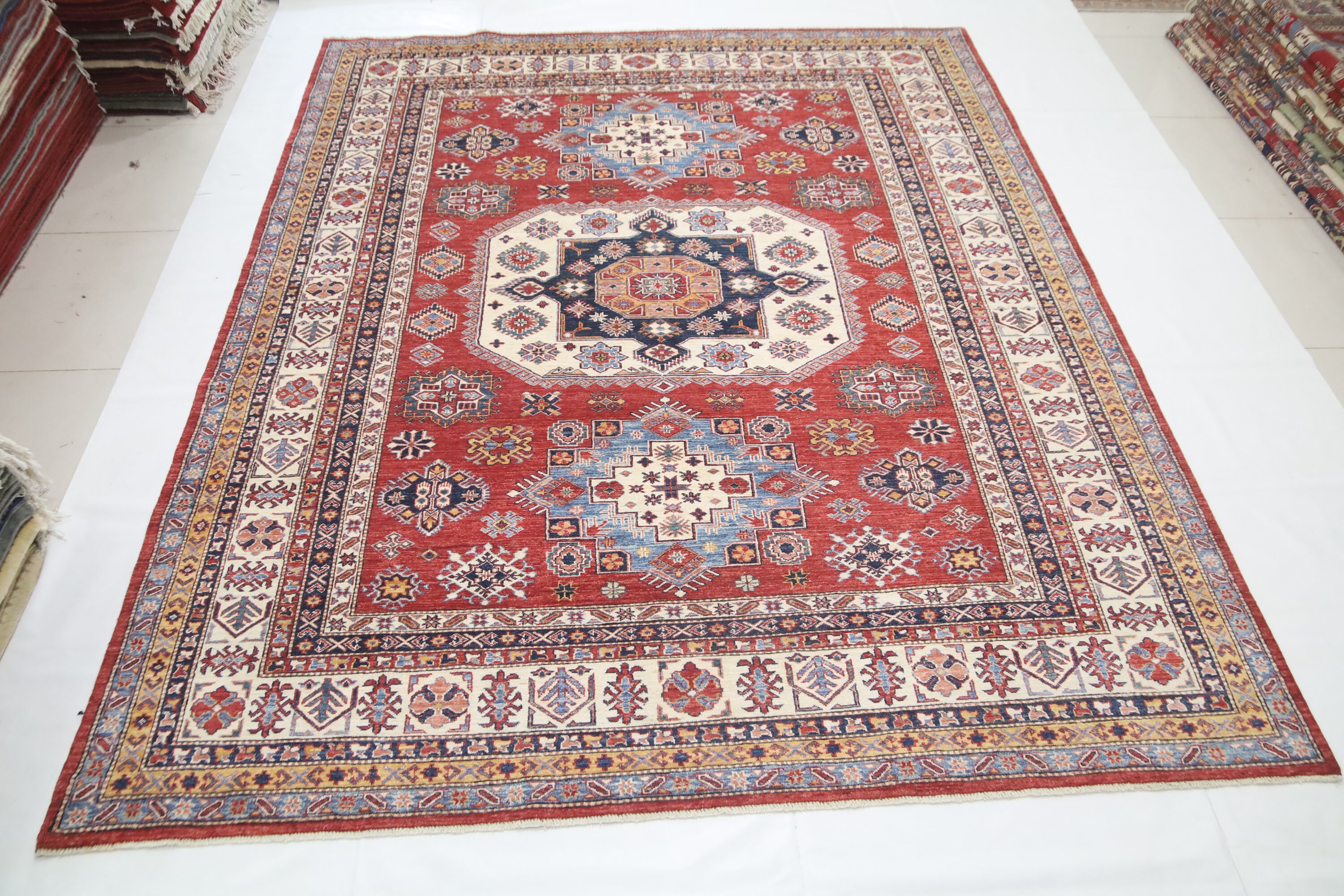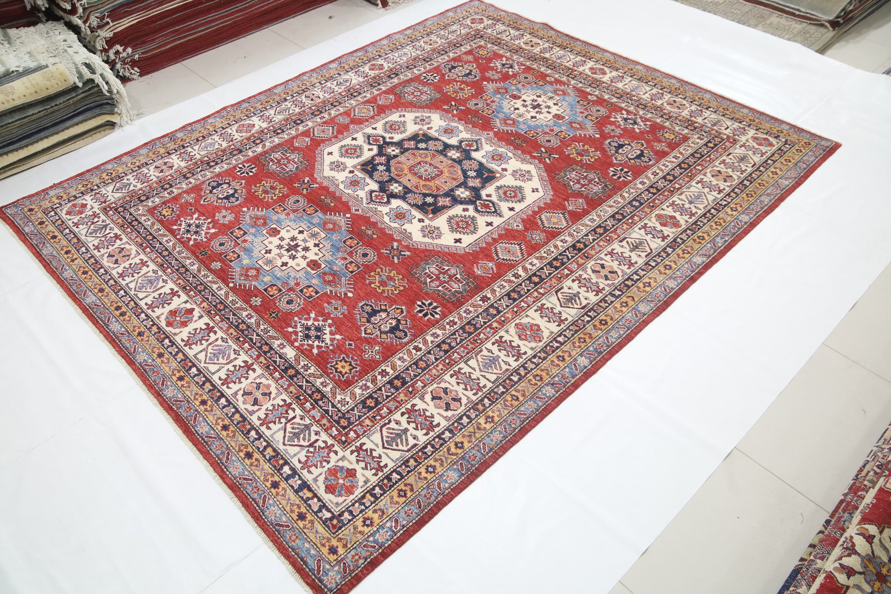 8x10 Kazak Fine Quality Area Rug - Red Afghan Handmade Geometric Organic Dye Wool Rug - Dining Room Rug - Living Room Rug - Bedroom Rug