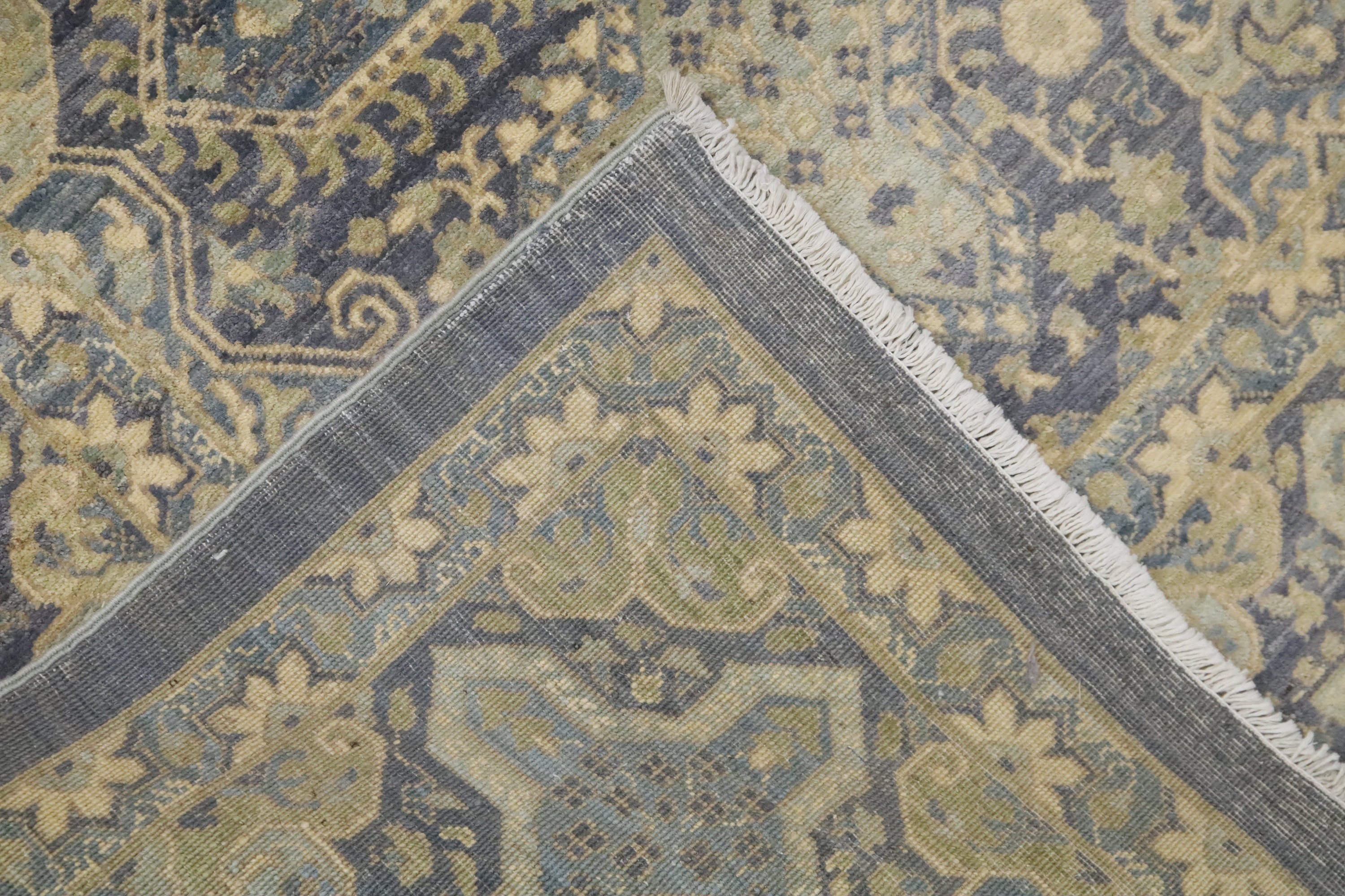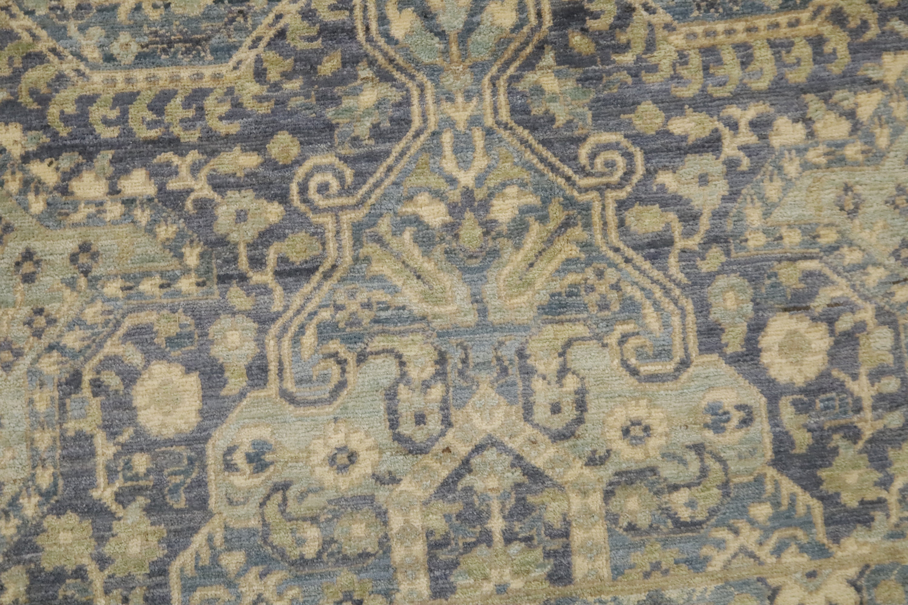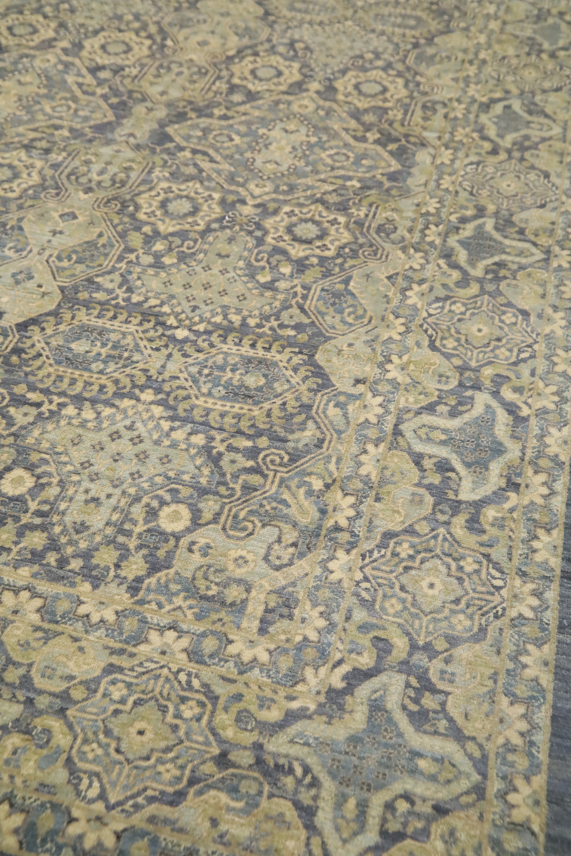This hand-knotted pile rug is crafted using 100% natural dyes and handspun wool, giving it a rich texture and vibrant colors.