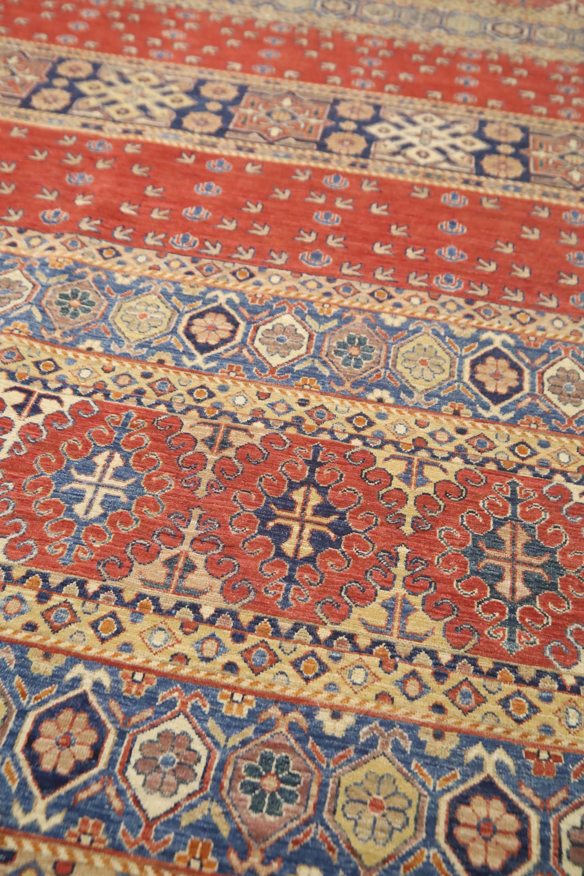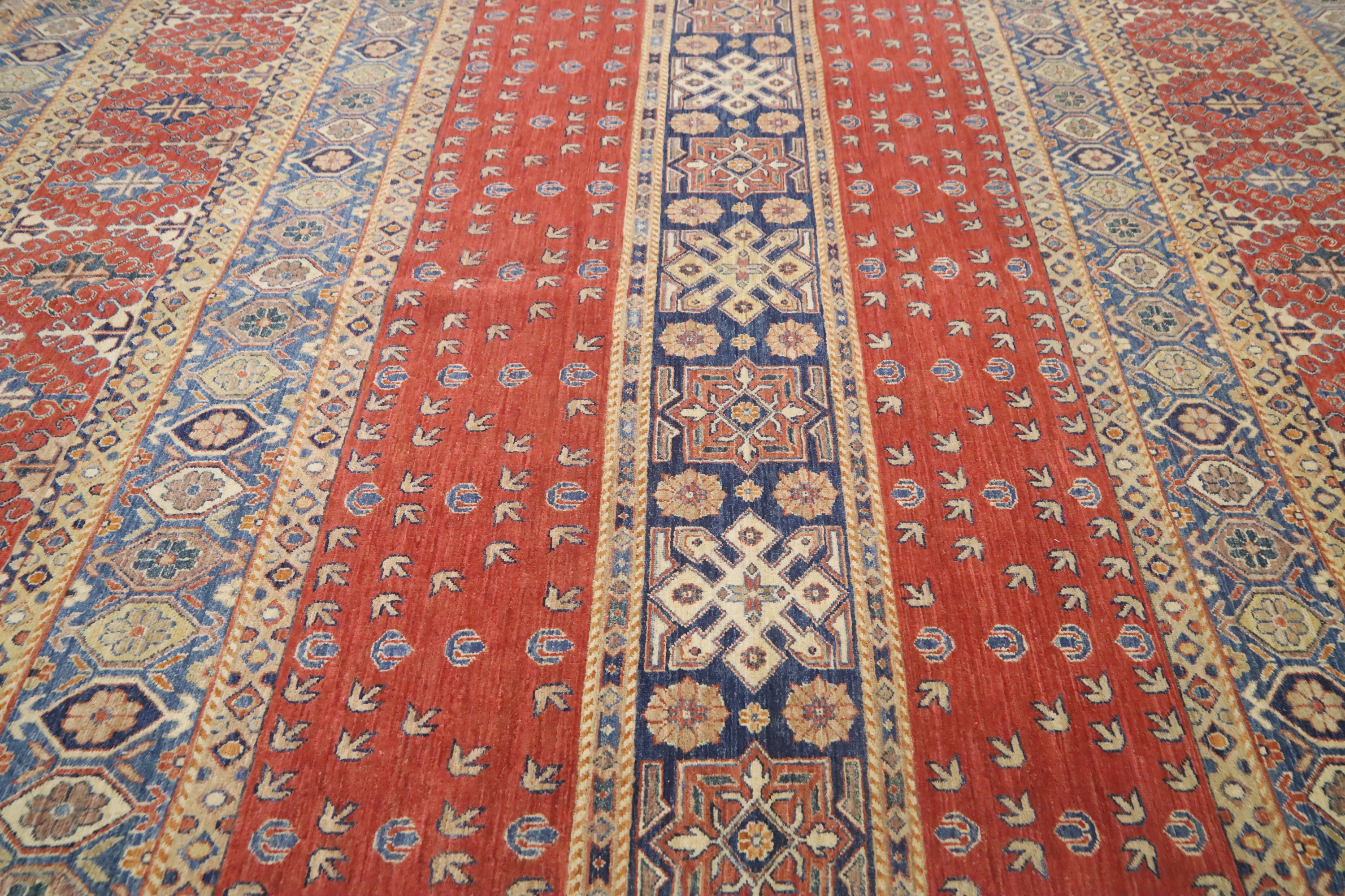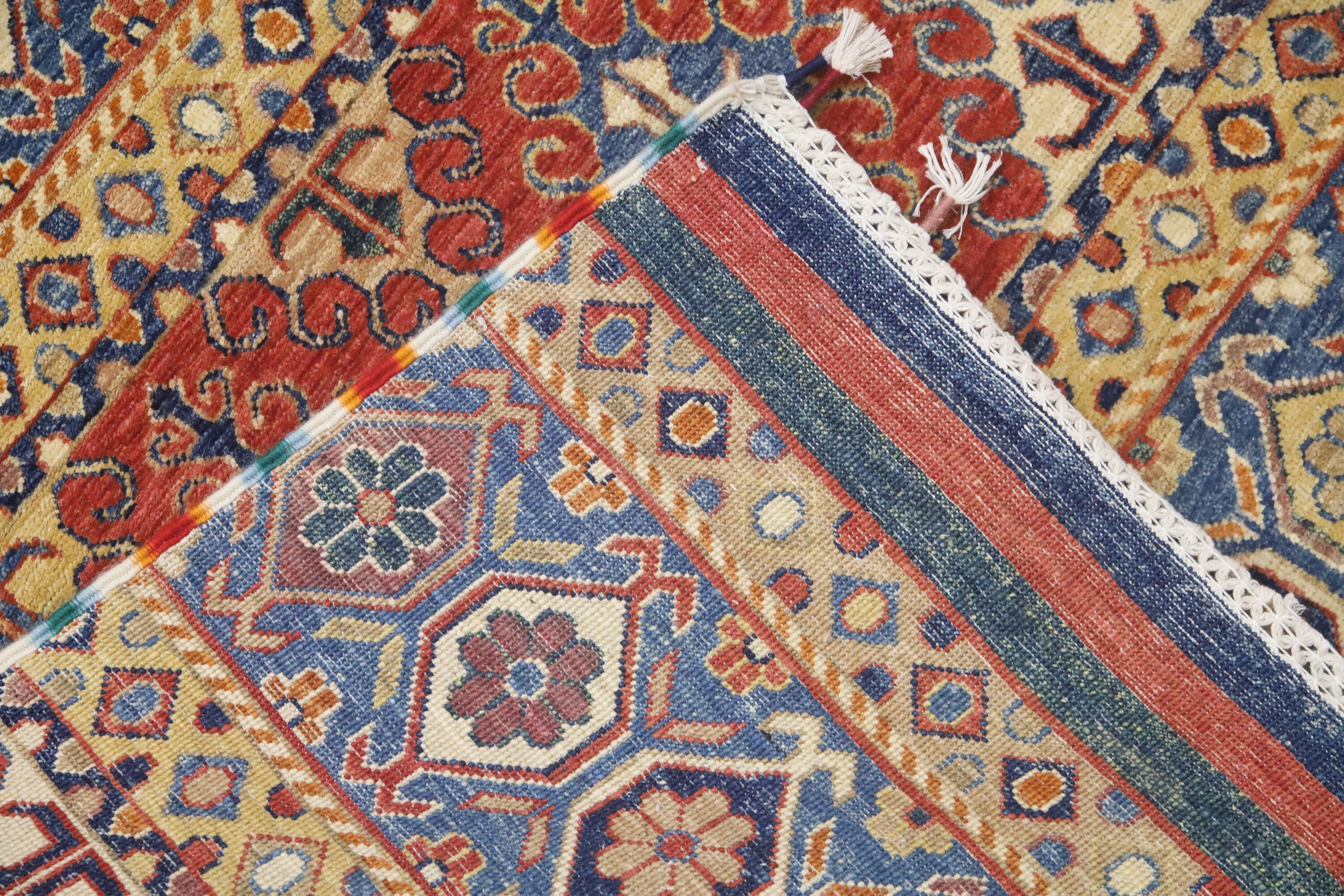 This hand-knotted pile rug is crafted using 100% natural dyes and handspun wool, giving it a rich texture and vibrant colors.