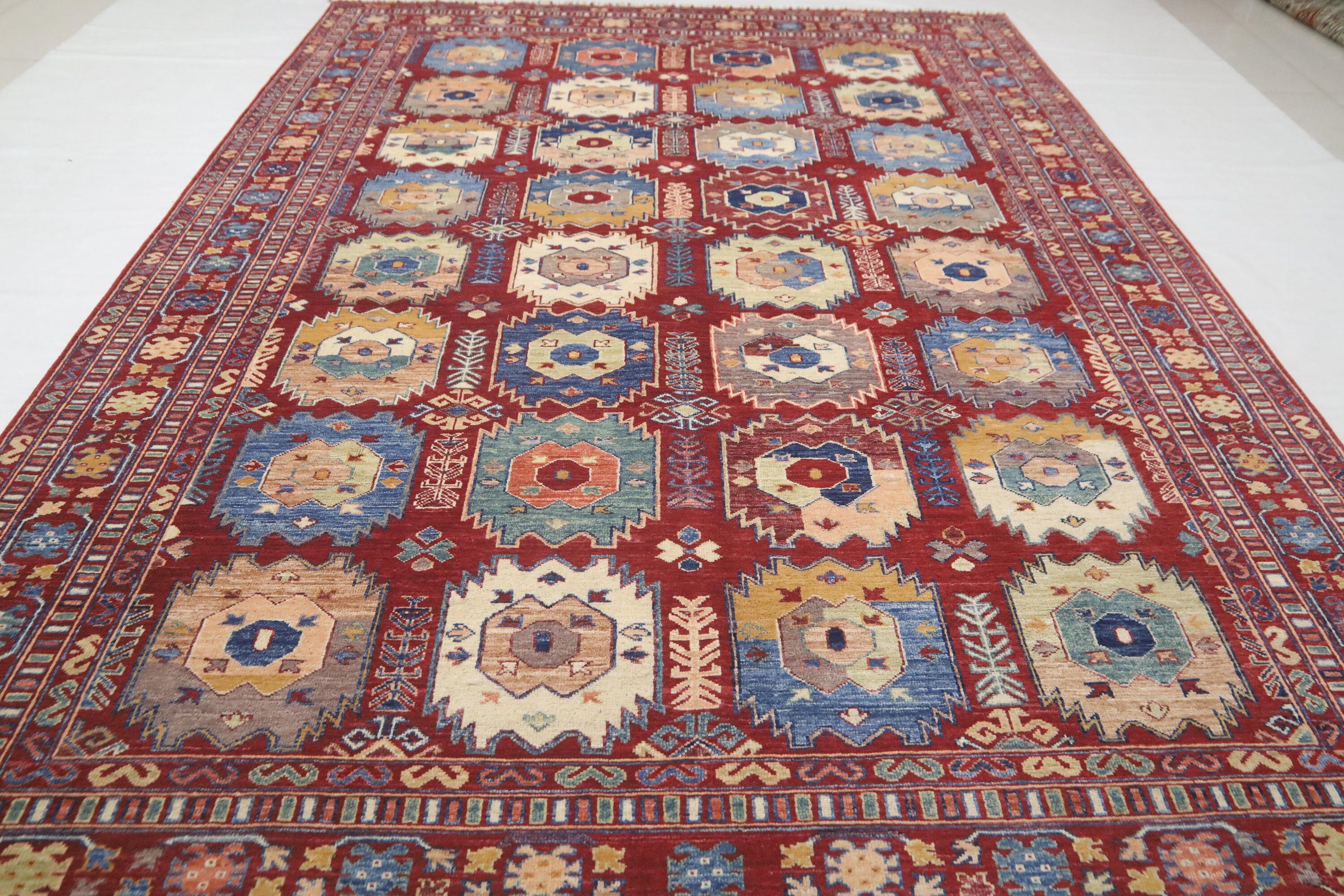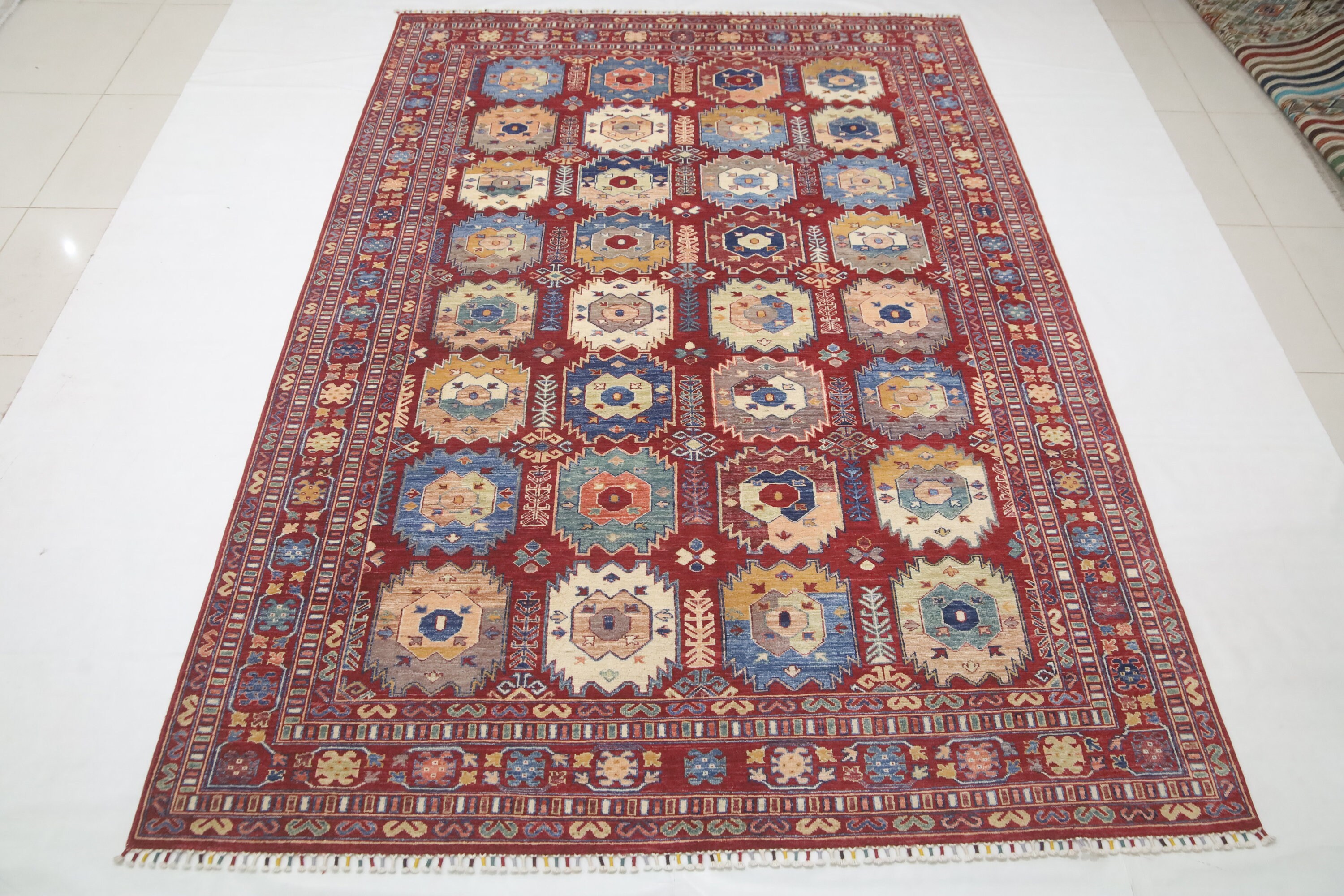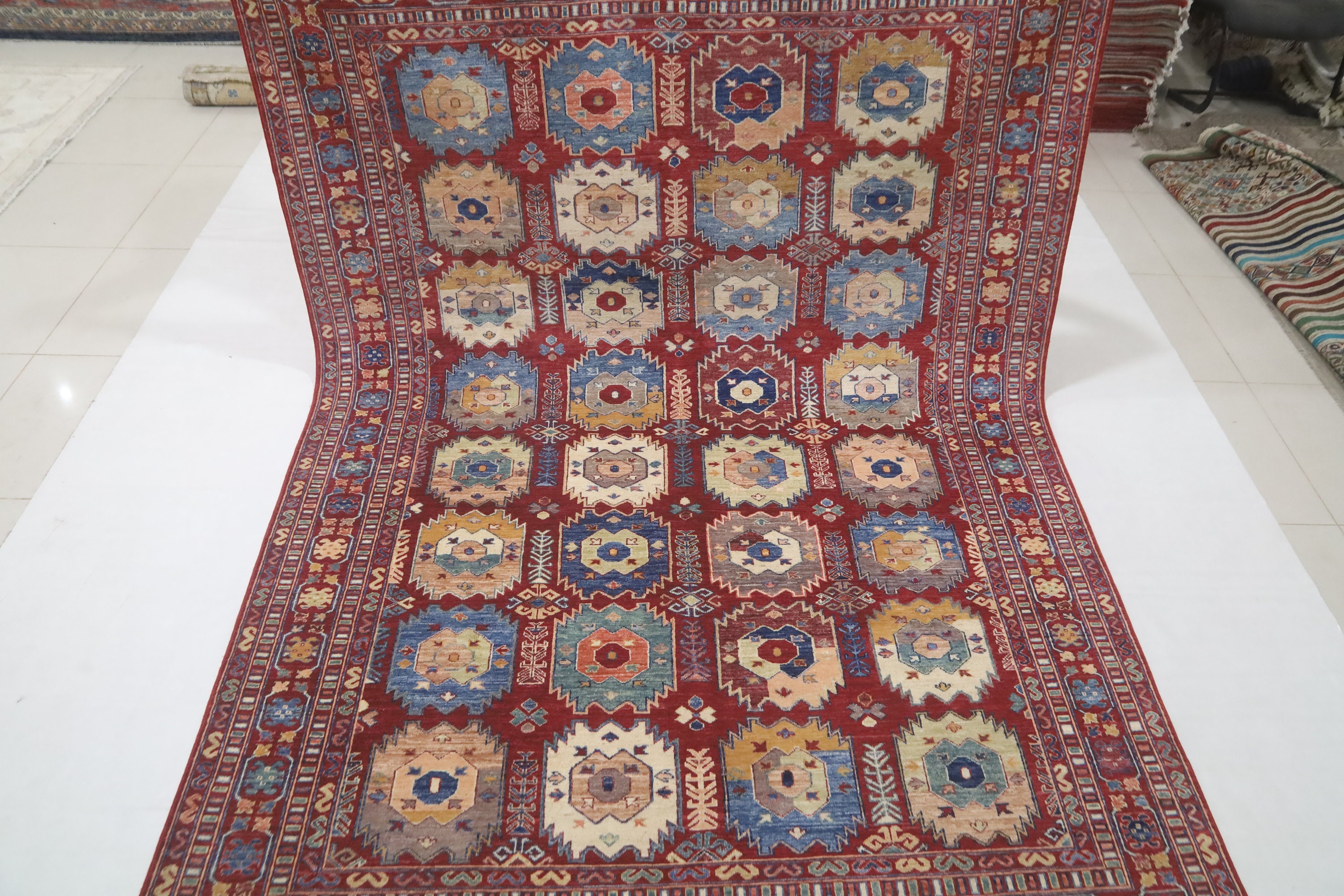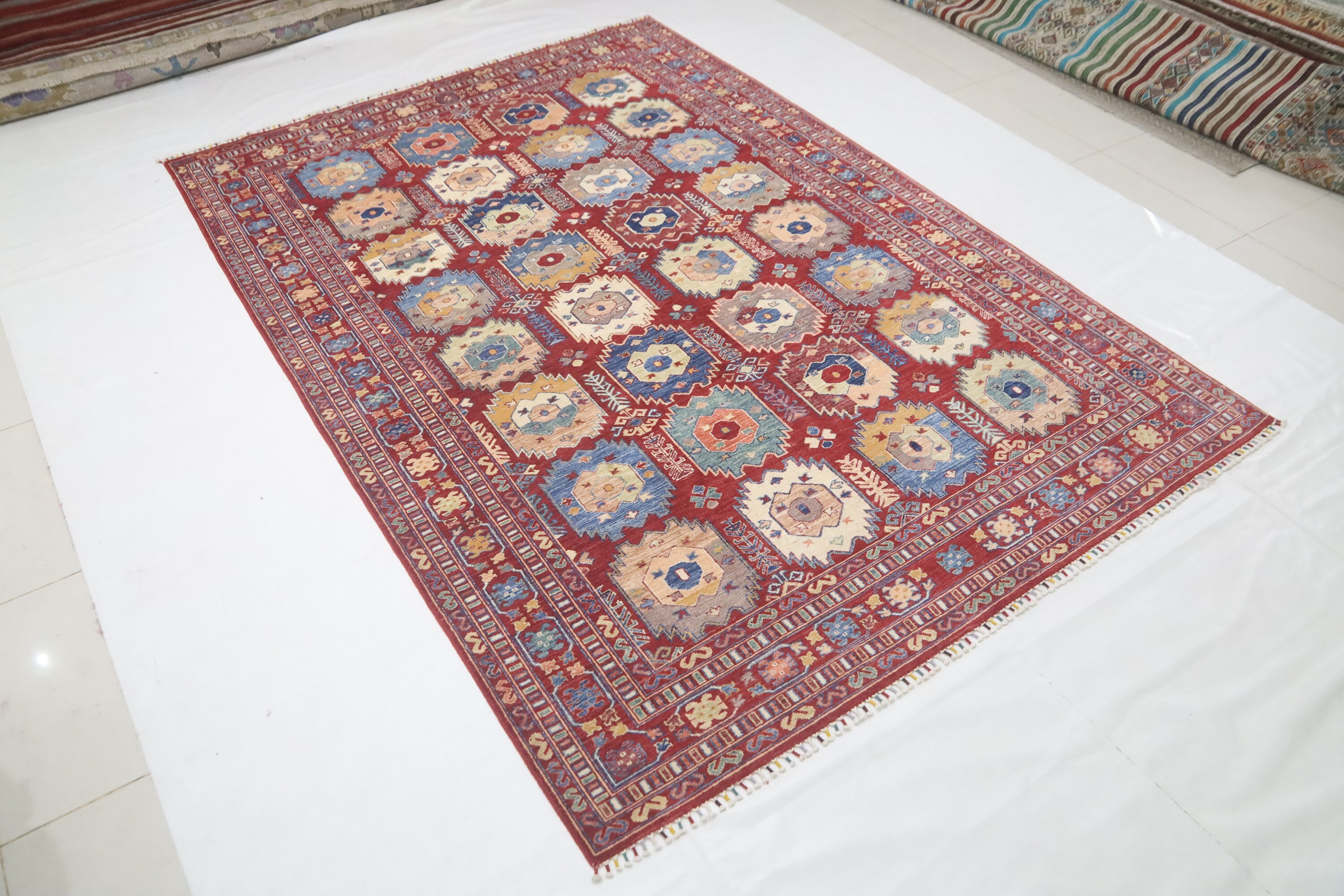 Red 7x10 Feet Ersari Area Rug - Afghan Hand Made Geometric Organic Dye Wool Rug - Tribal Rug - Traditional Rug - Living Room Rug - Foyer Rug