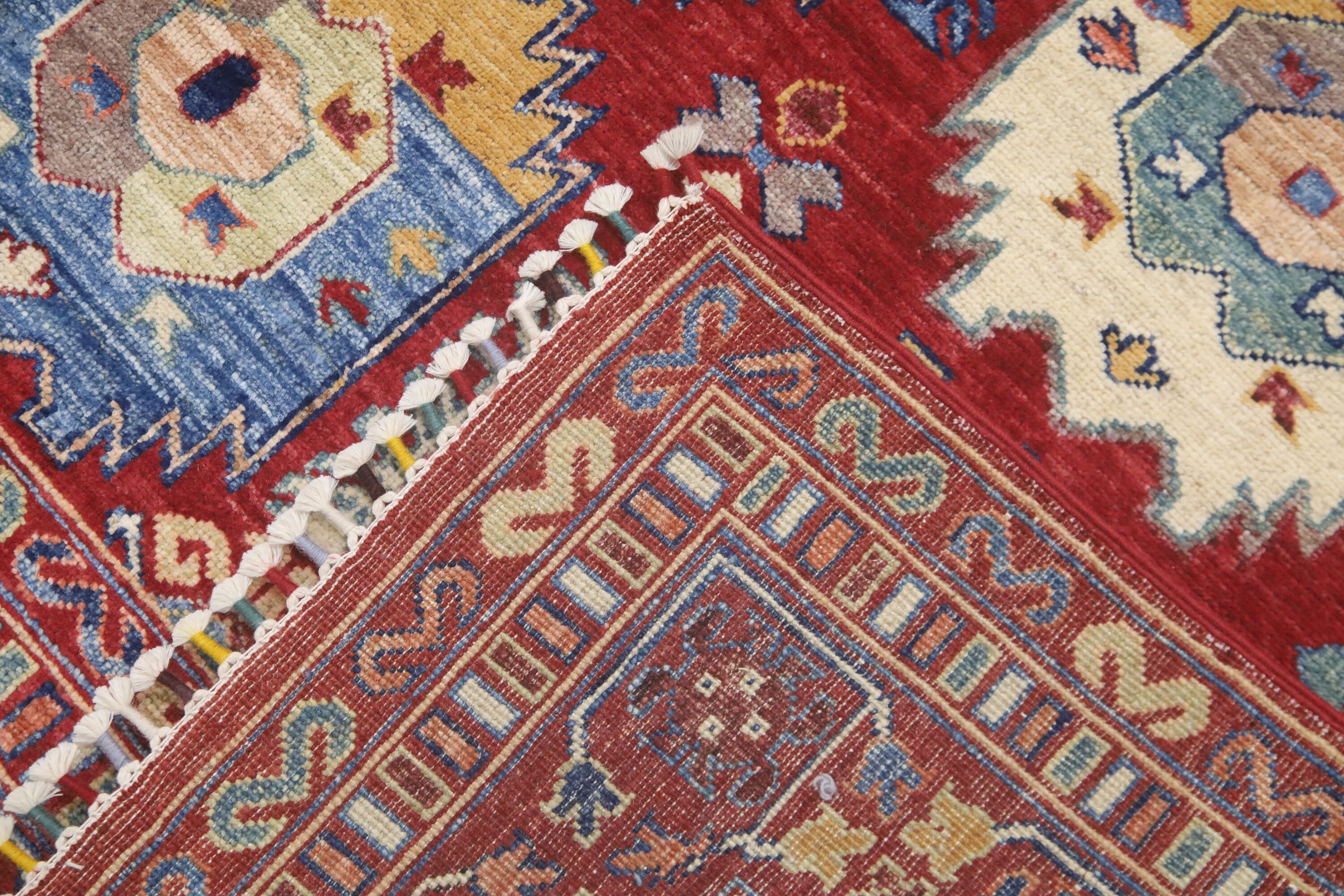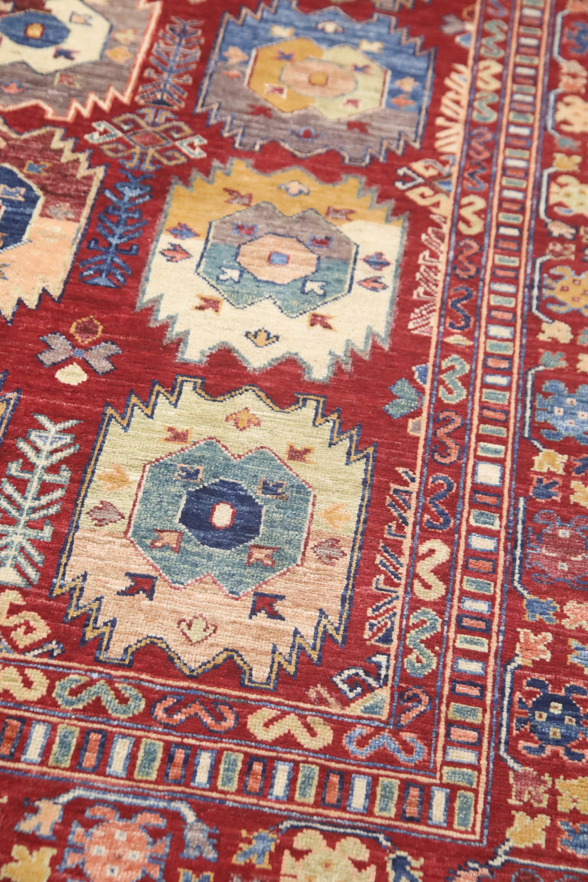This hand-knotted pile rug is crafted using 100% natural dyes and handspun wool, giving it a rich texture and vibrant colors.