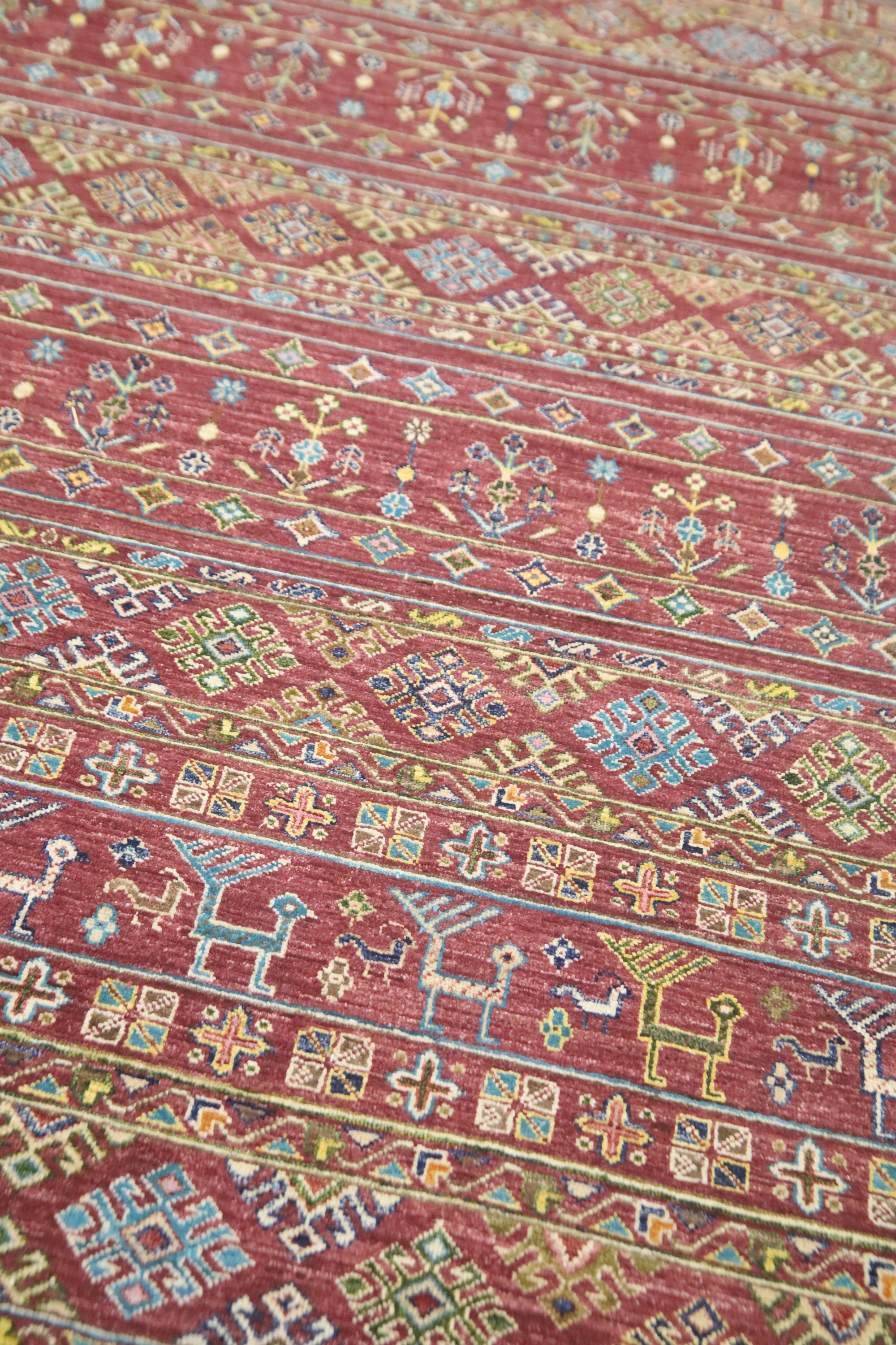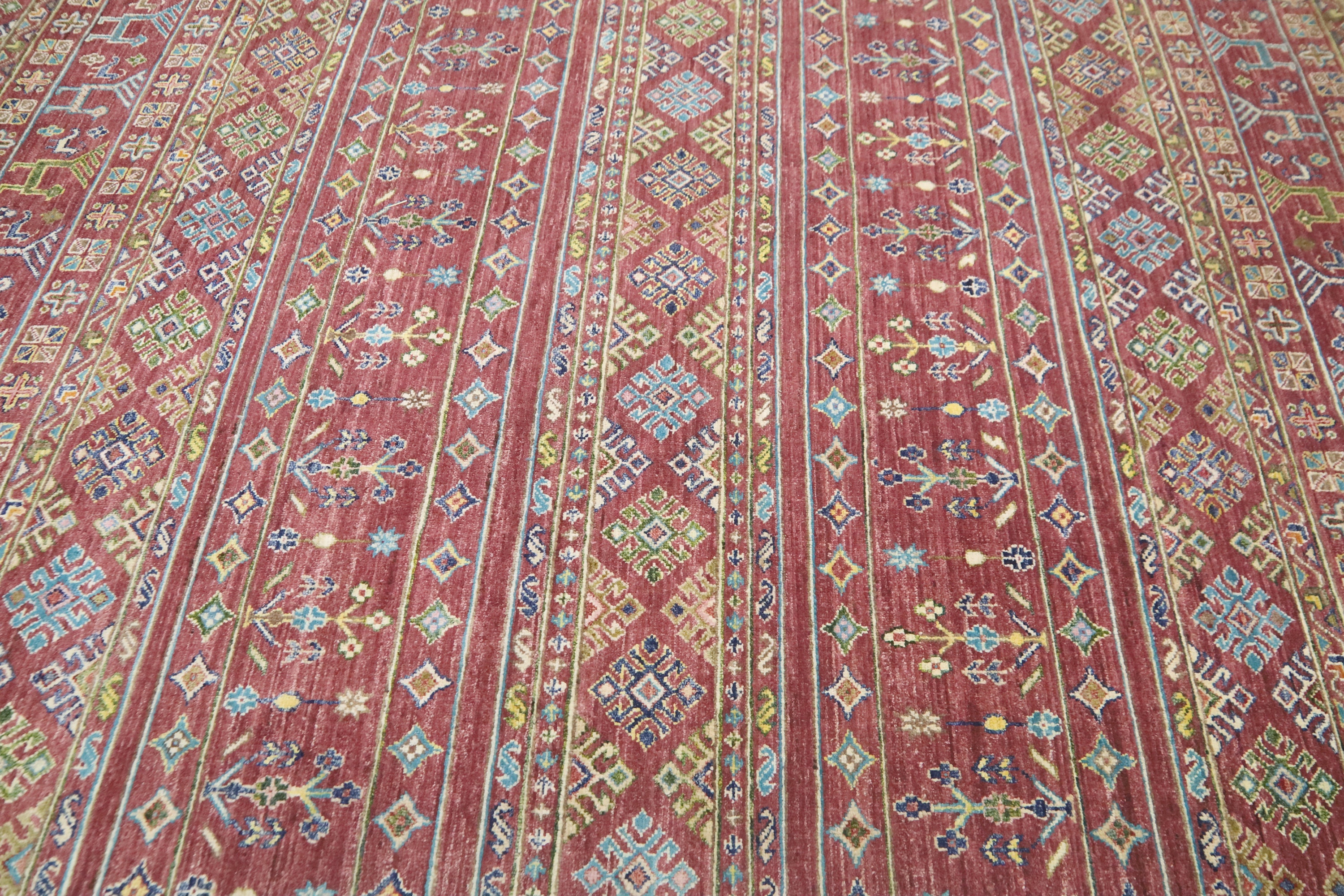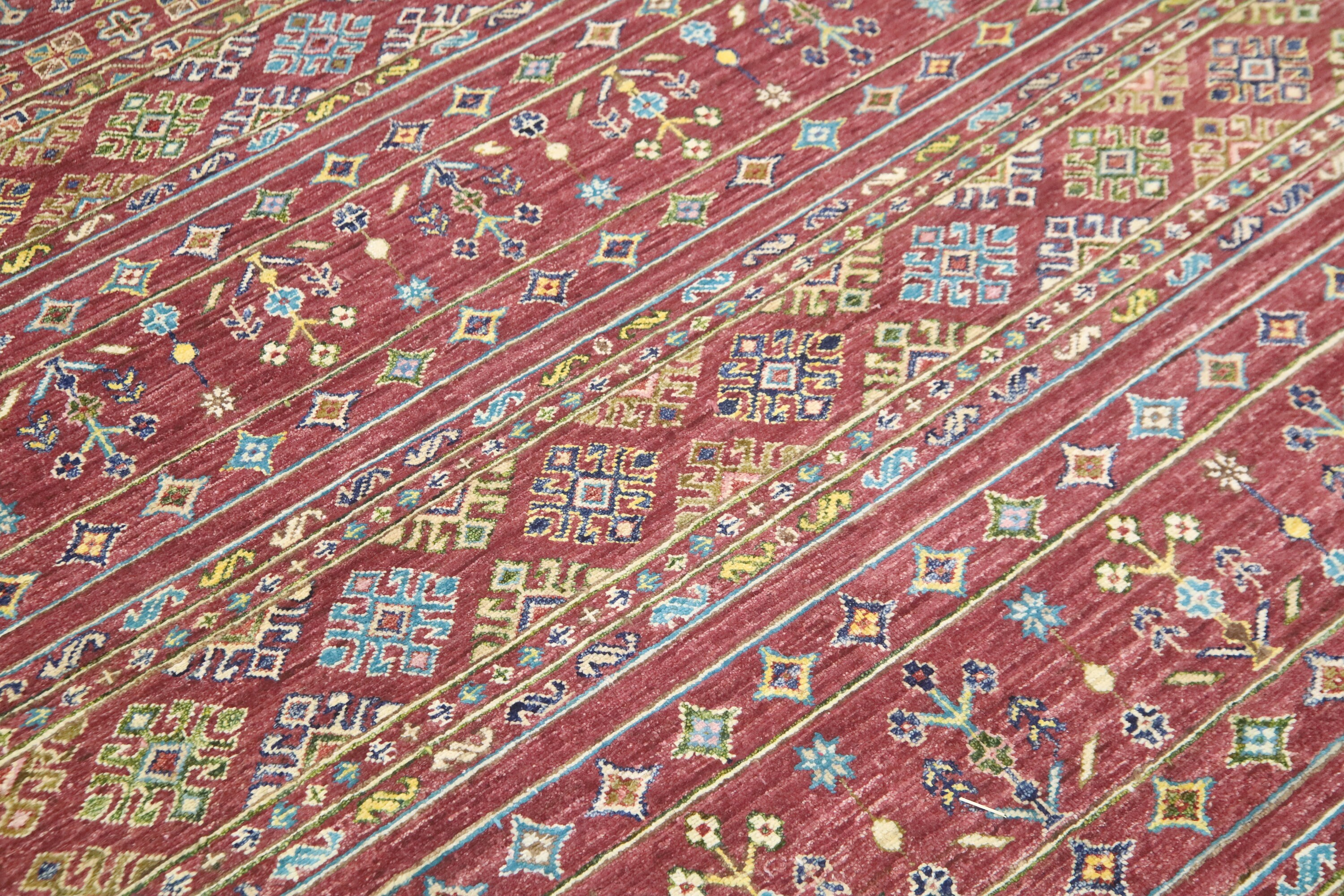 This hand-knotted pile rug is crafted using 100% natural dyes and handspun wool, giving it a rich texture and vibrant colors.