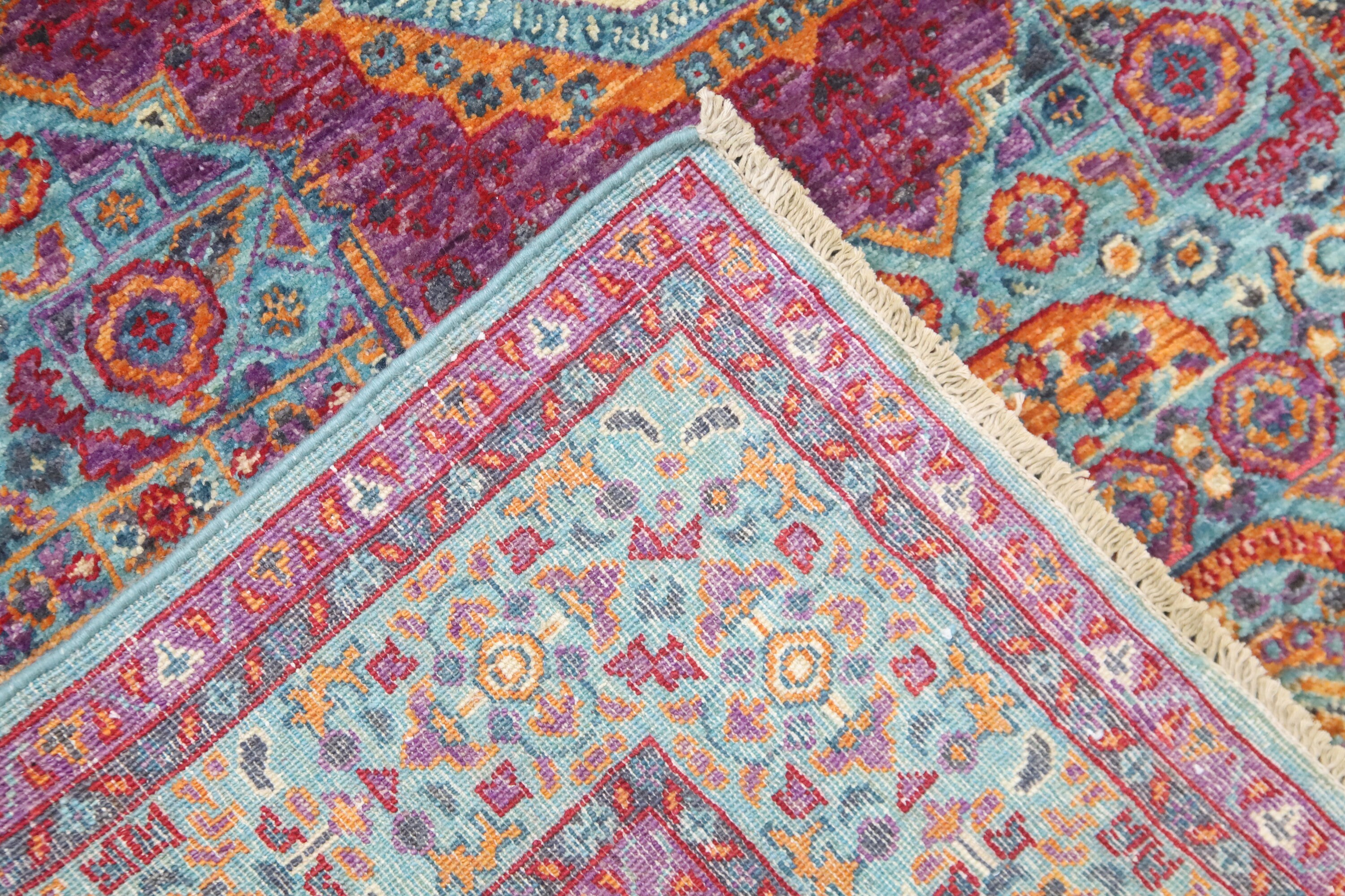 This hand-knotted pile rug is crafted using 100% natural dyes and handspun wool, giving it a rich texture and vibrant colors.