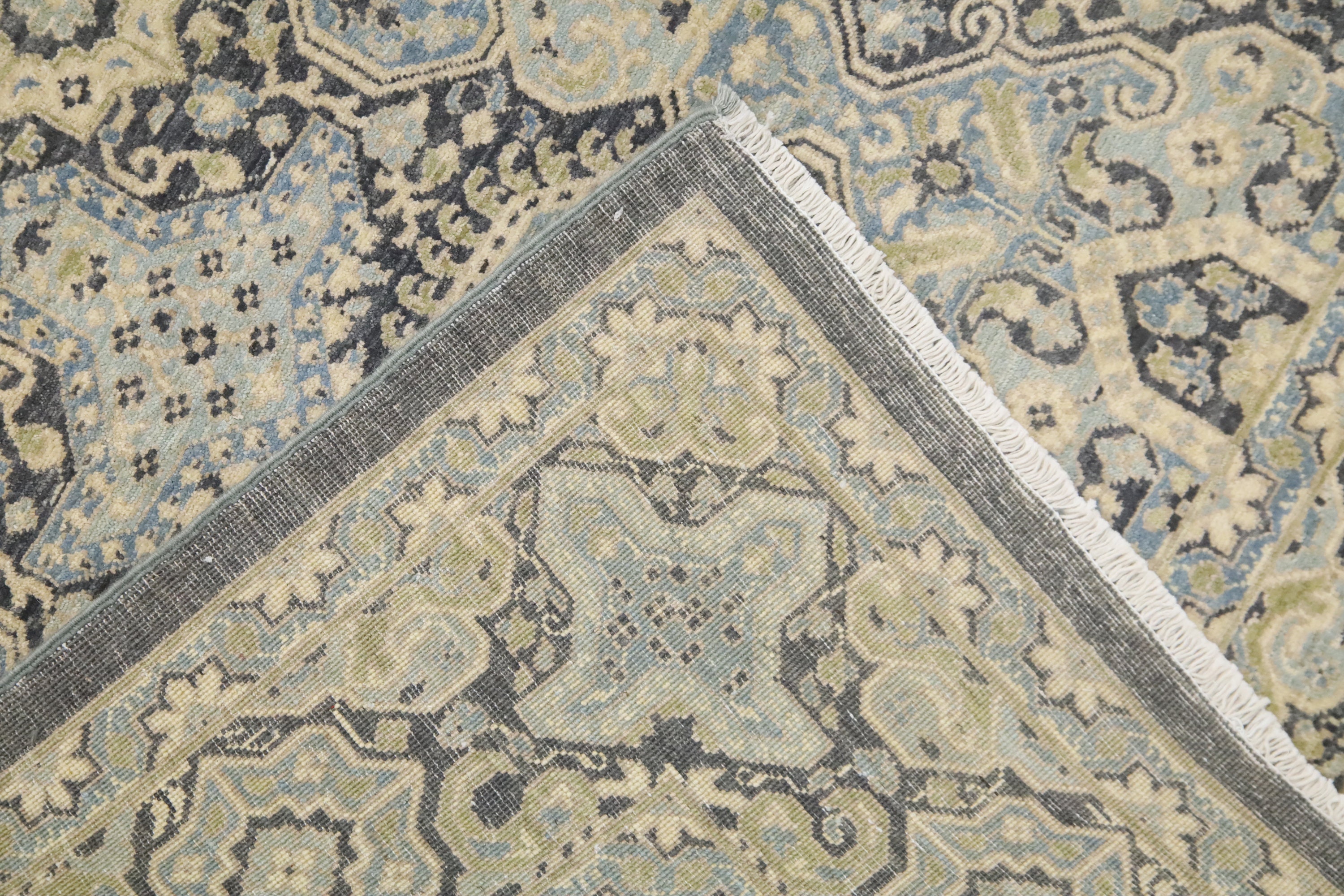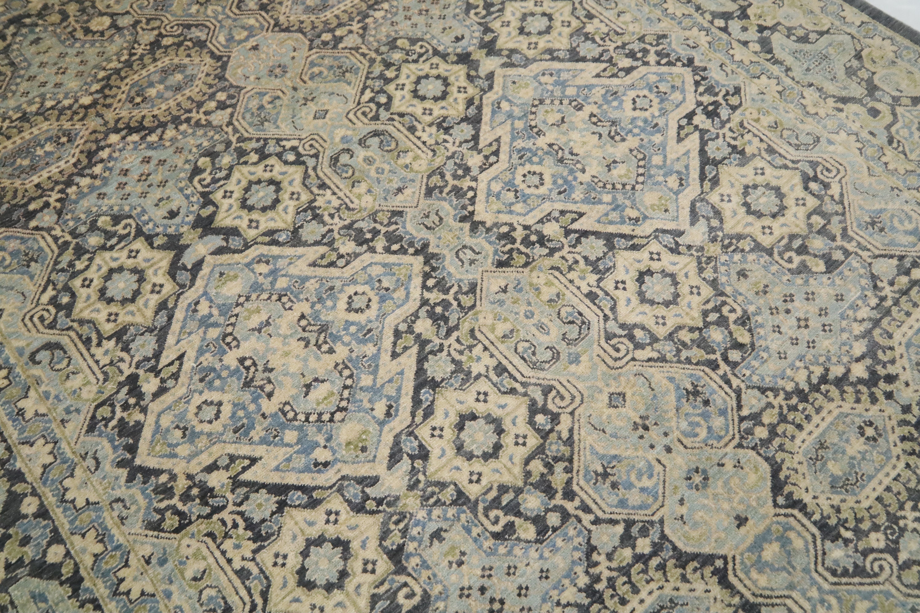 This hand-knotted pile rug is crafted using 100% natural dyes and handspun wool, giving it a rich texture and vibrant colors.
