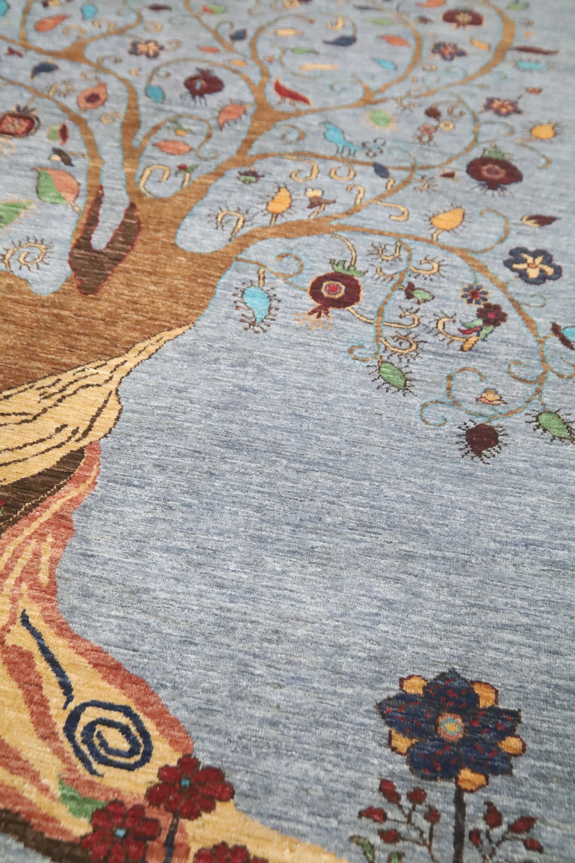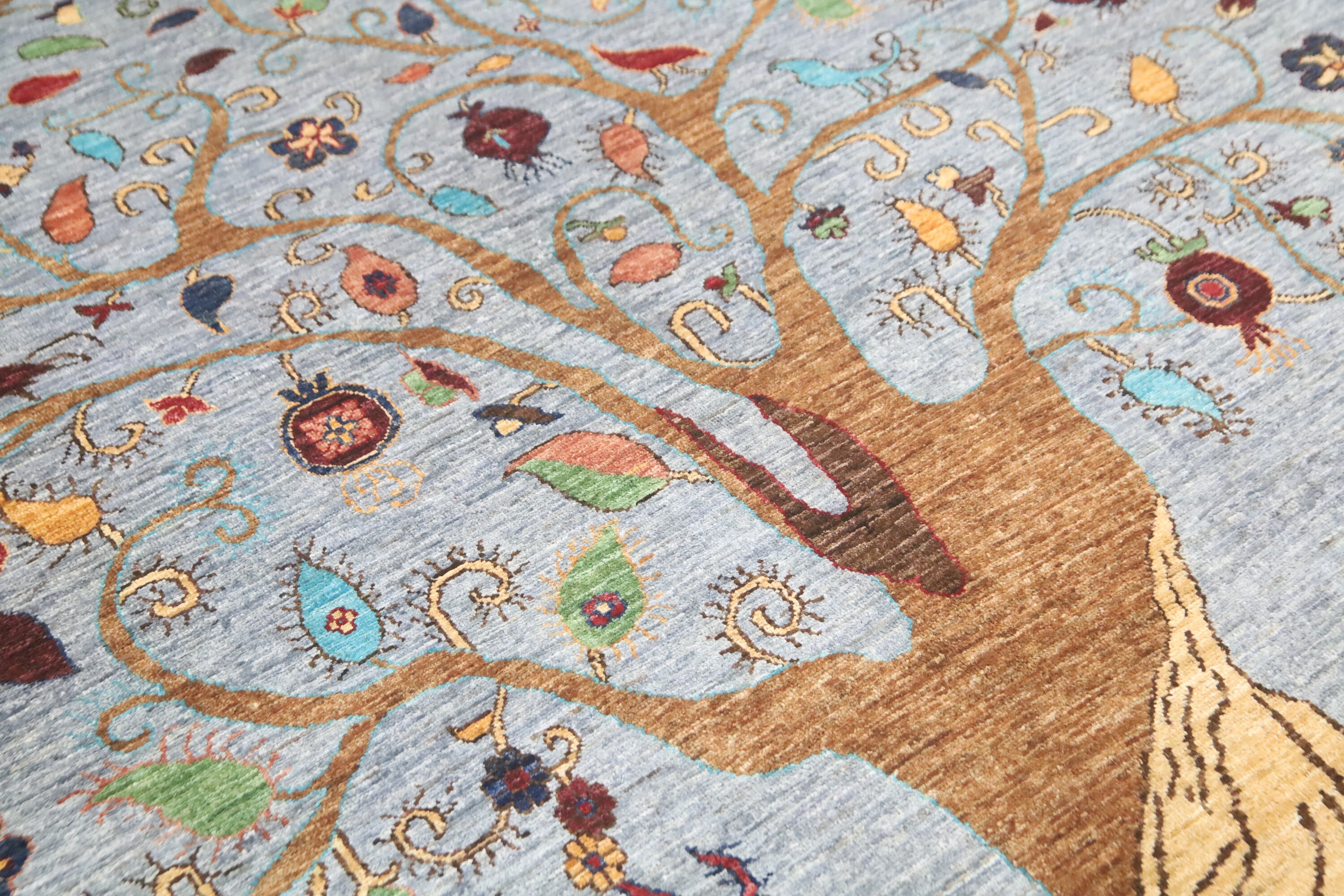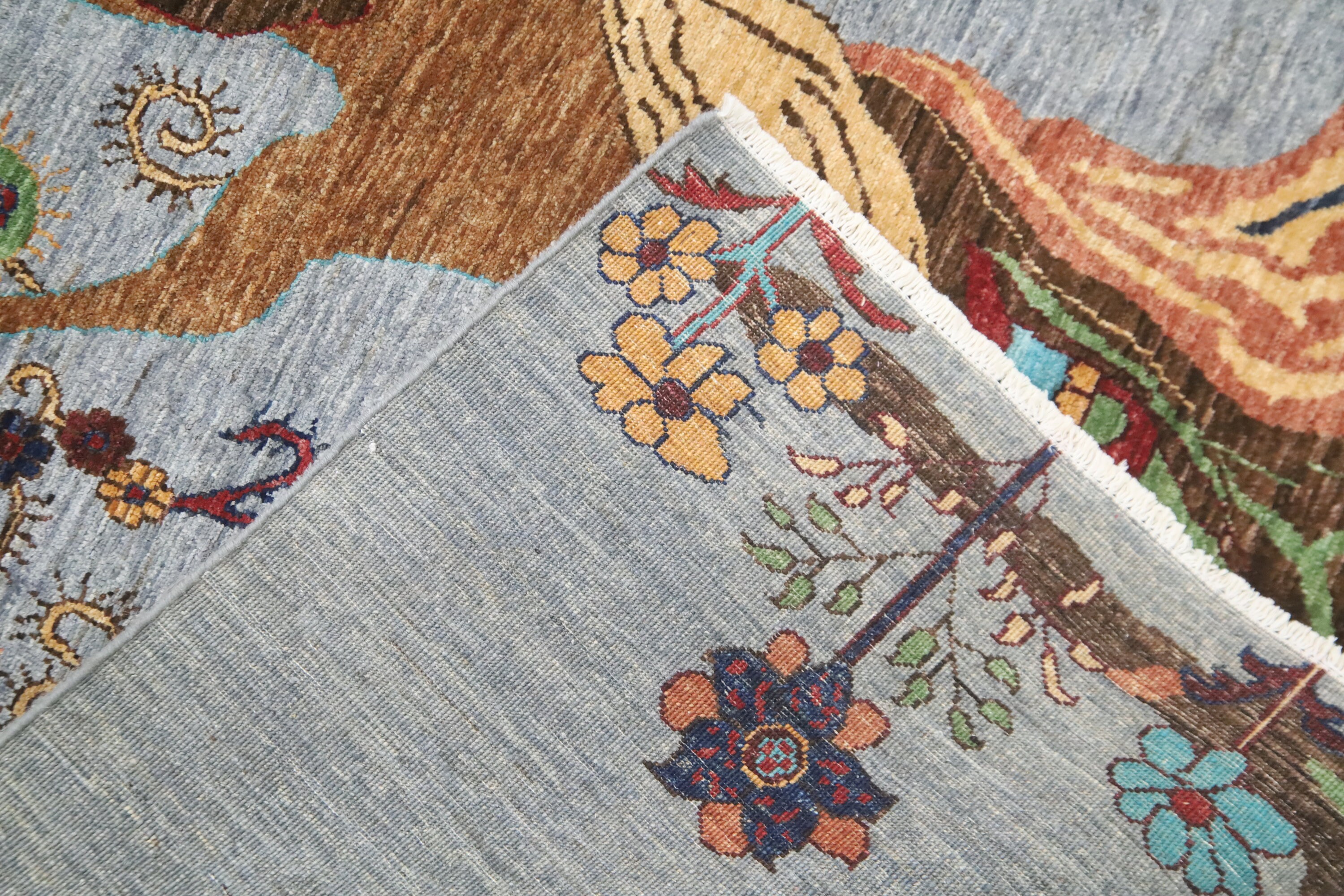 This hand-knotted pile rug is crafted using 100% natural dyes and handspun wool, giving it a rich texture and vibrant colors.
