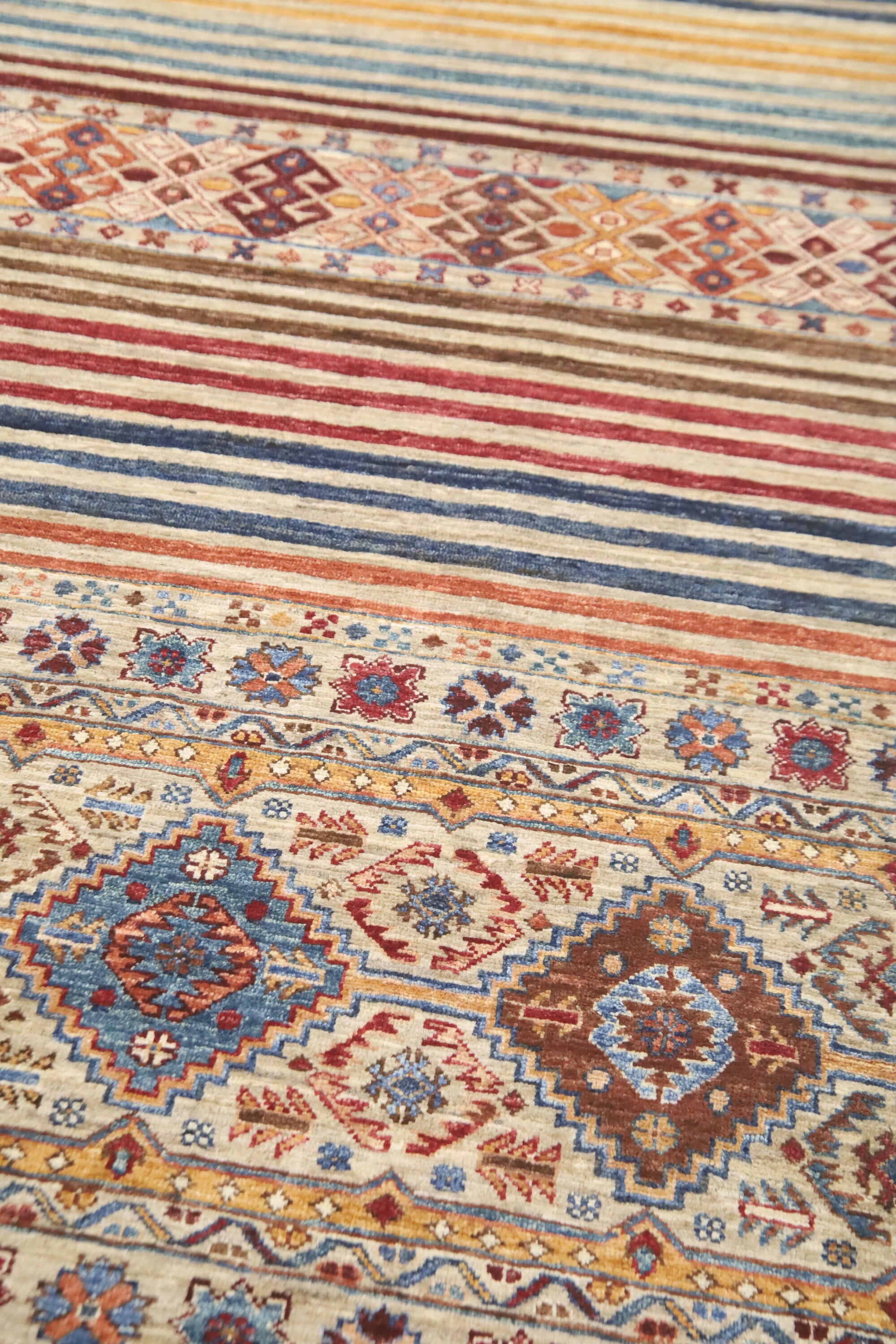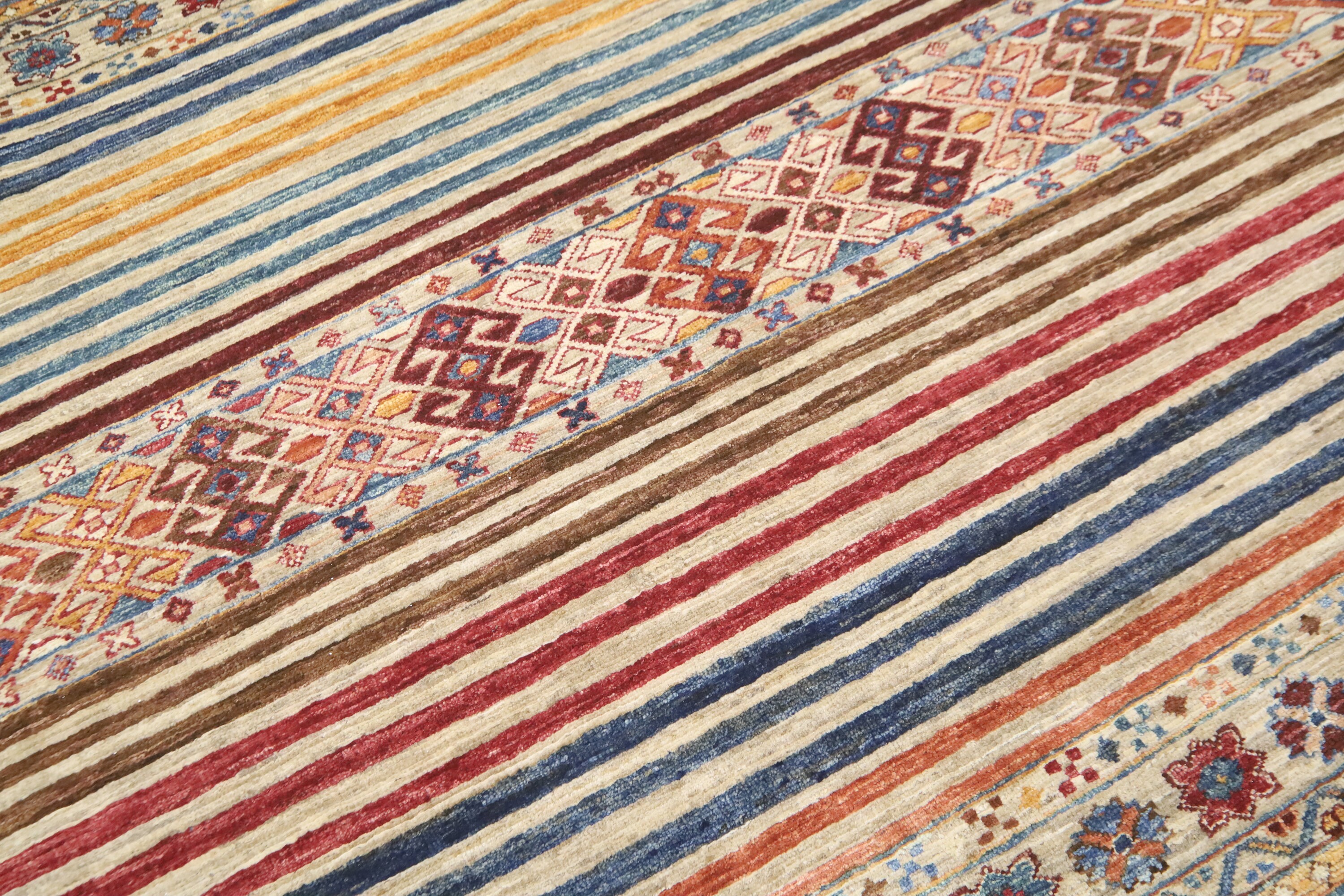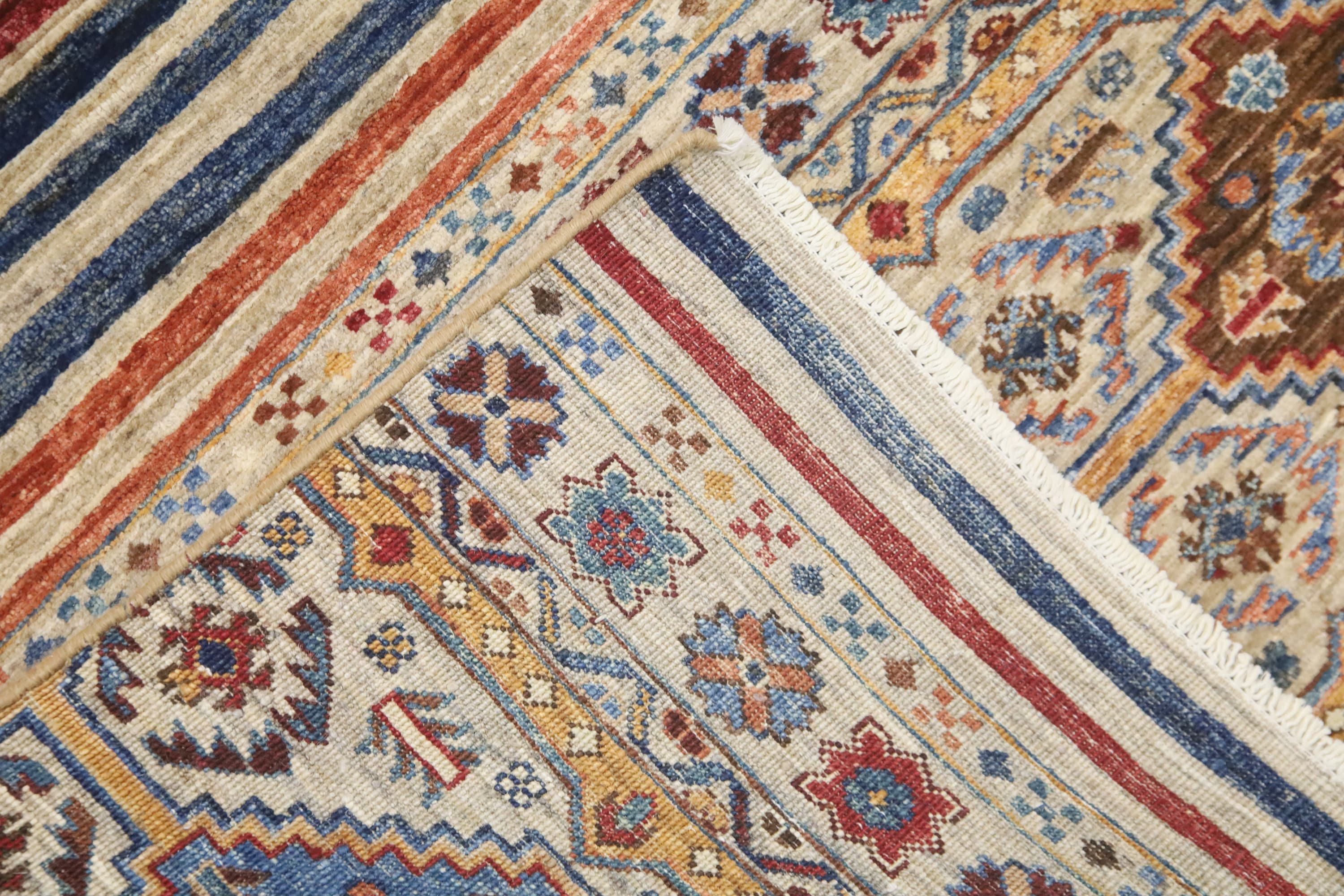 This hand-knotted pile rug is crafted using 100% natural dyes and handspun wool, giving it a rich texture and vibrant colors.