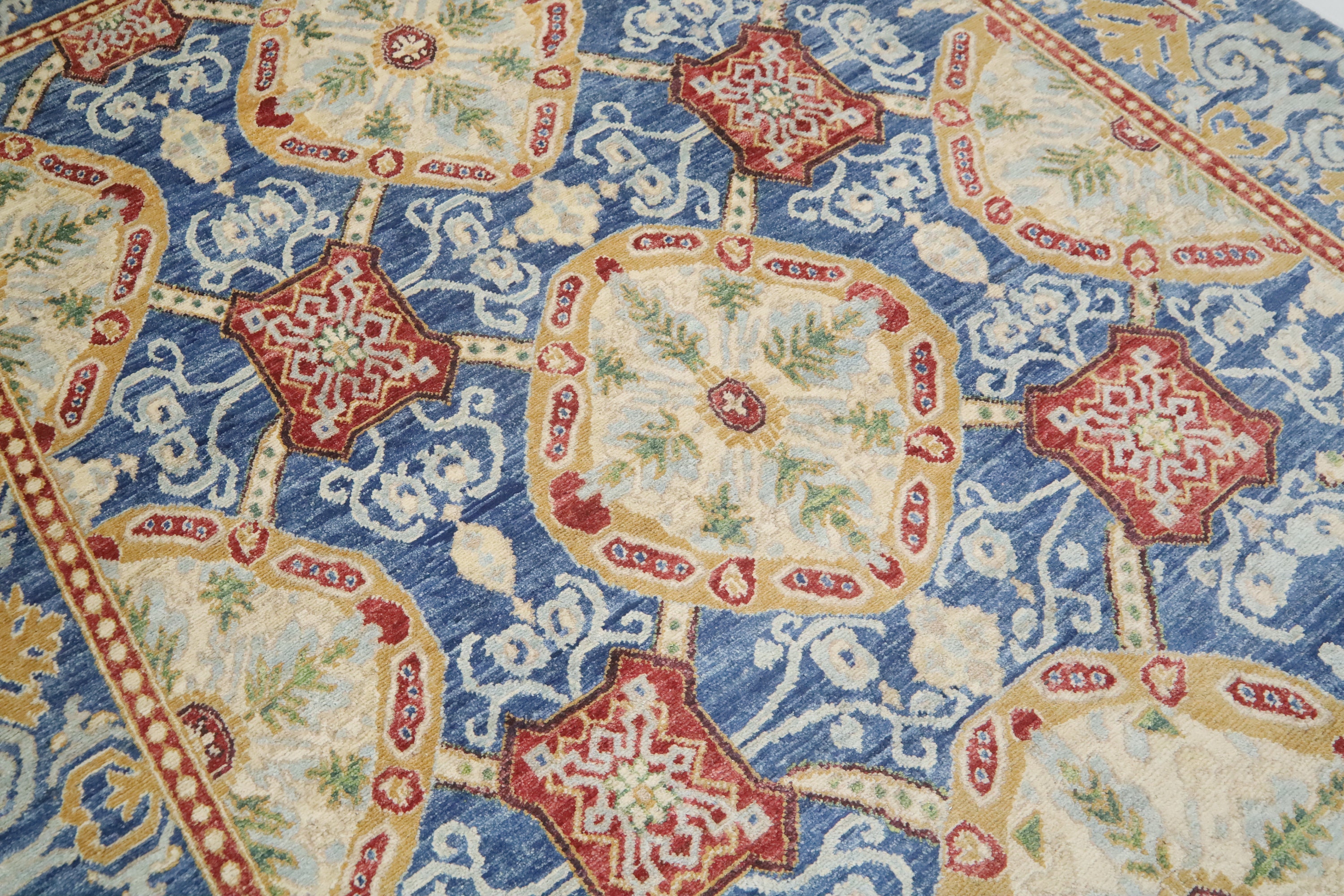 This hand-knotted pile rug is crafted using 100% natural dyes and handspun wool, giving it a rich texture and vibrant colors.