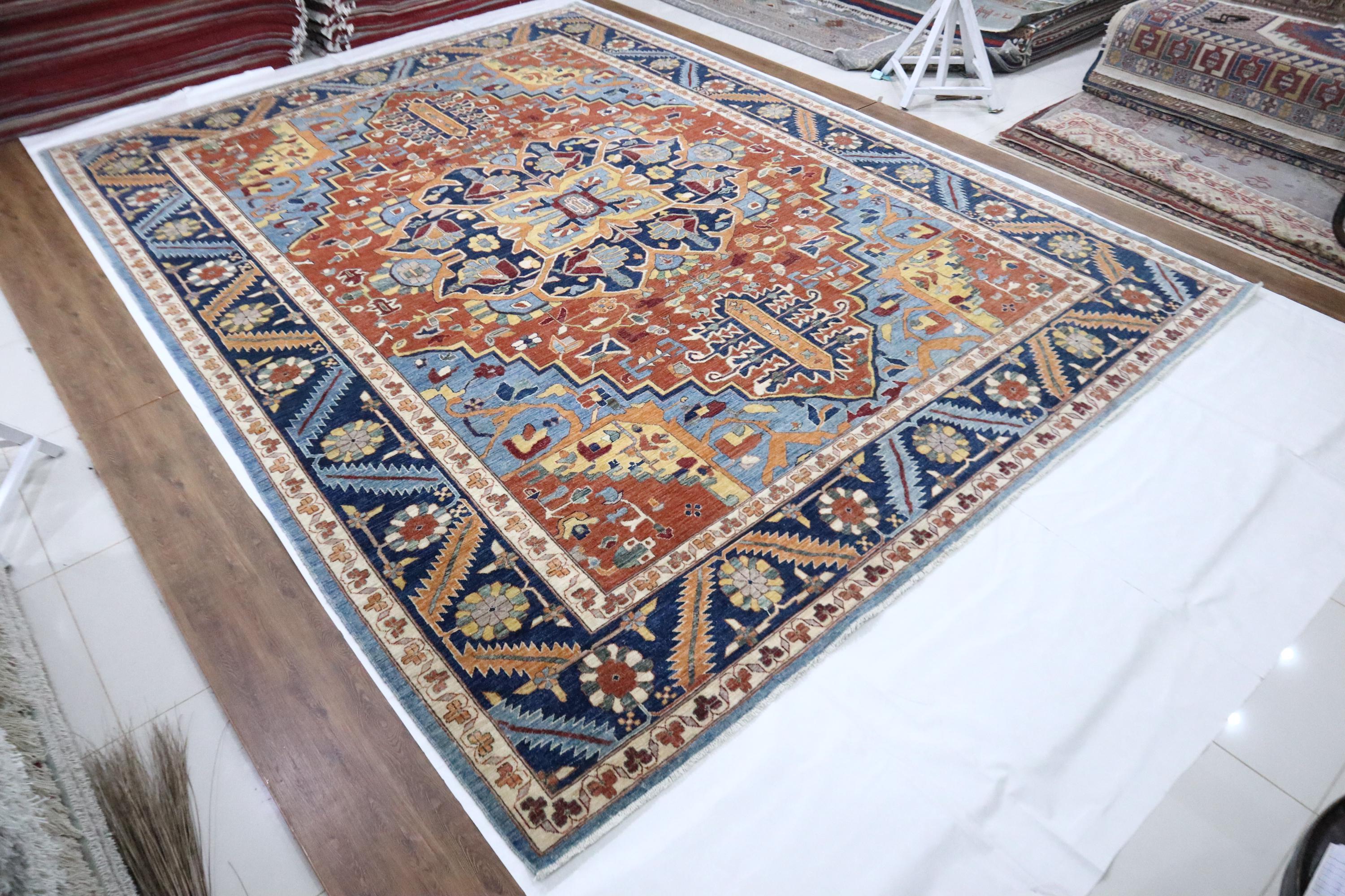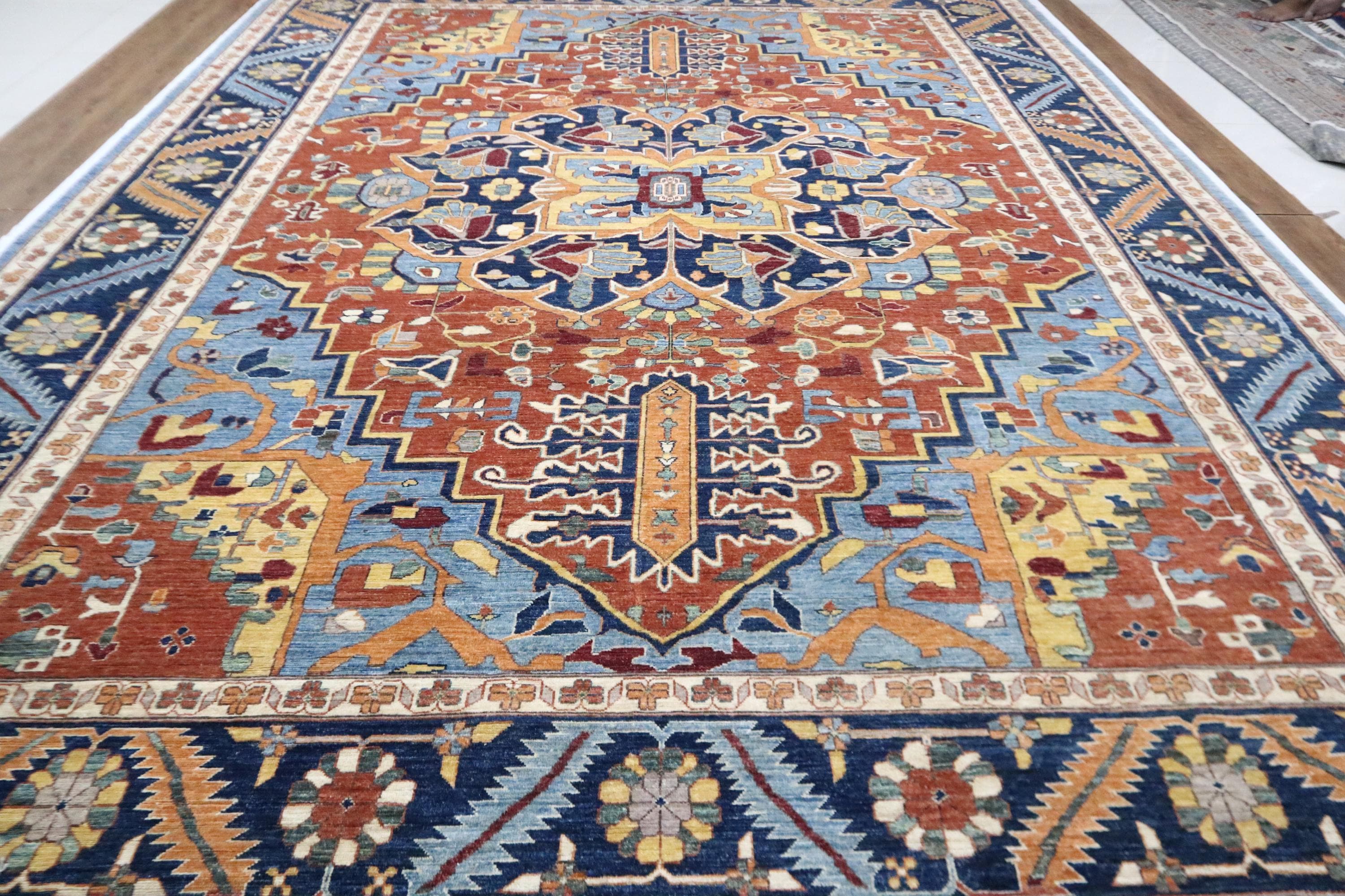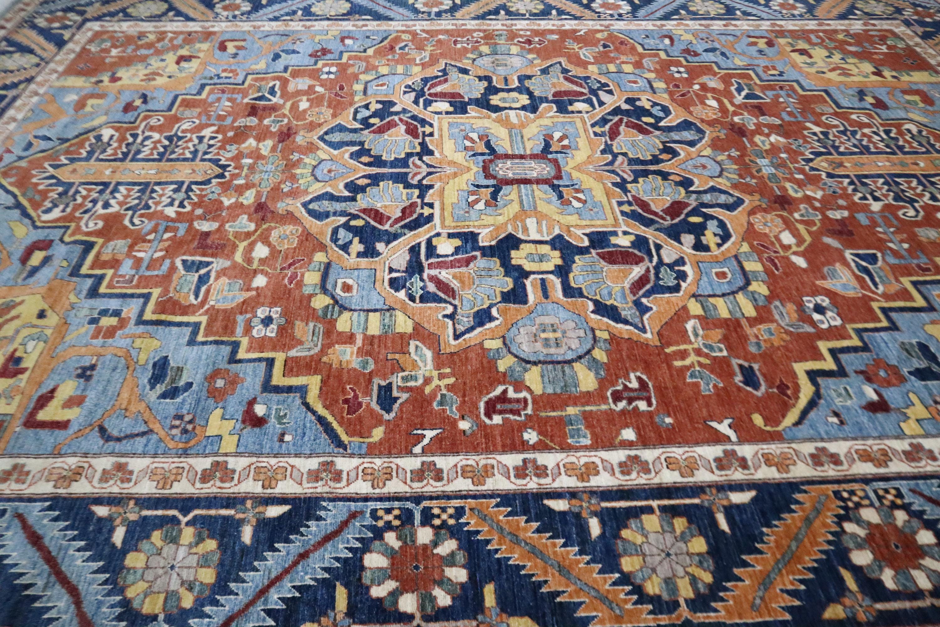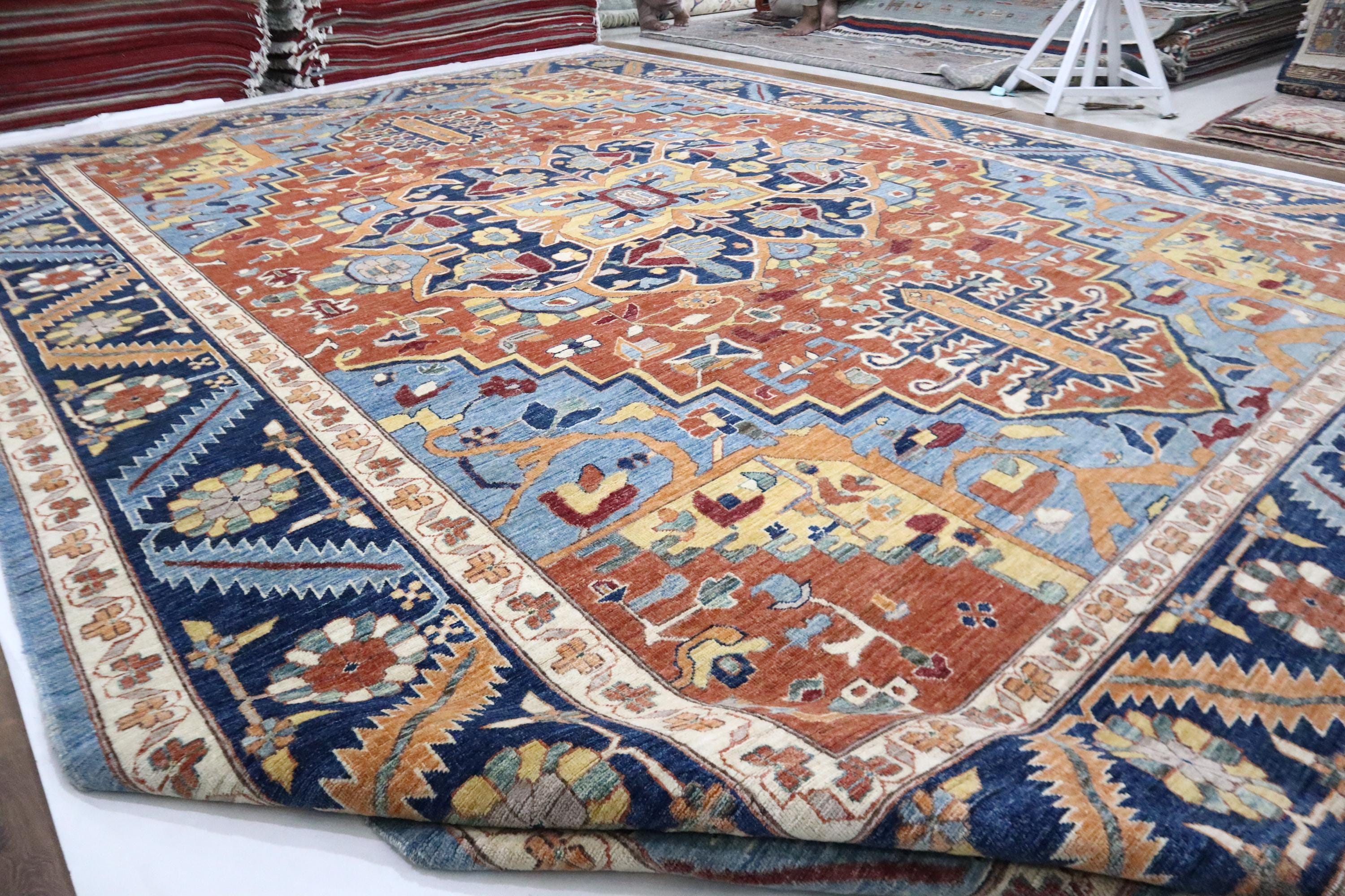 10x14 Heriz Area Rug - Rust Blue Persian Style Afghan Handmade Traditional Fine Quality Wool Rug - Geometric Rug - Oversize Rug - Office Rug
