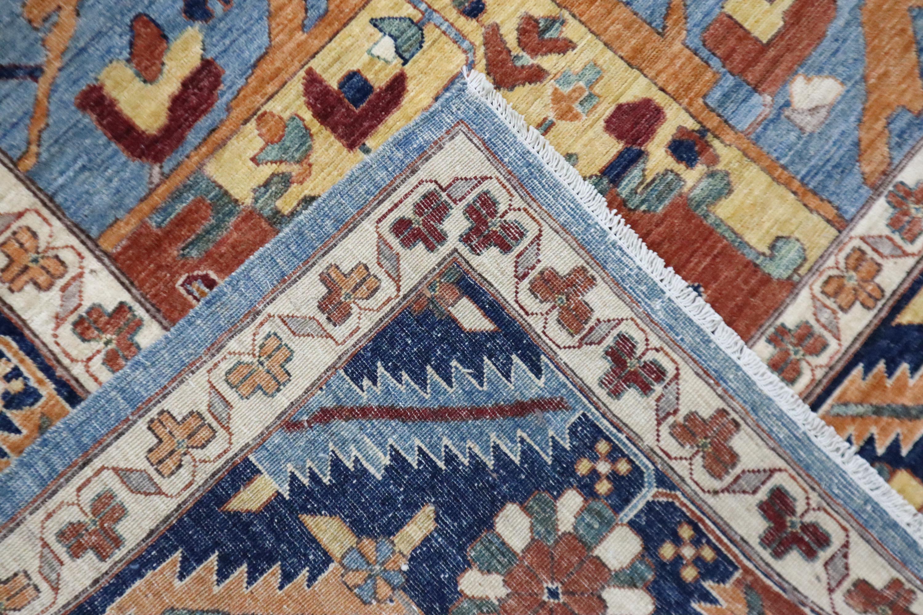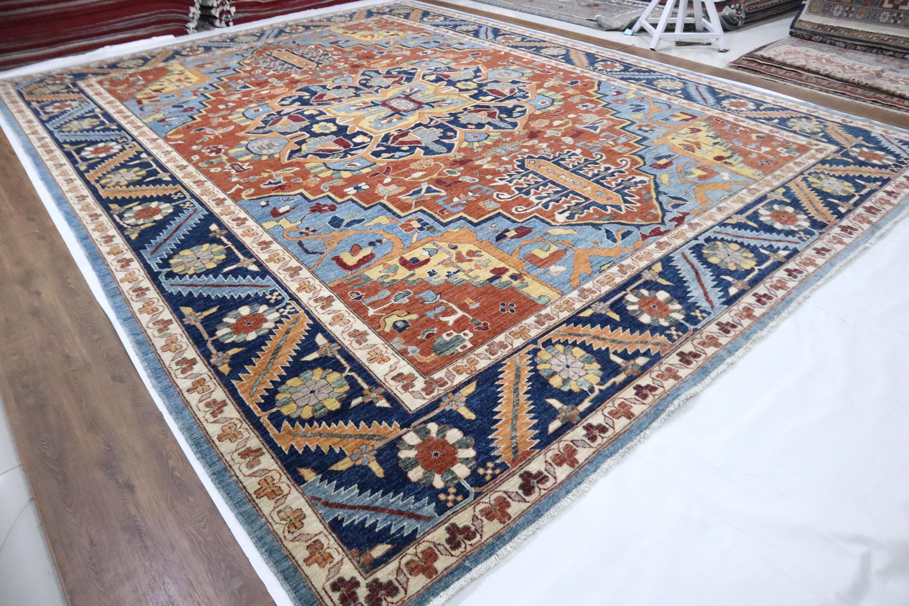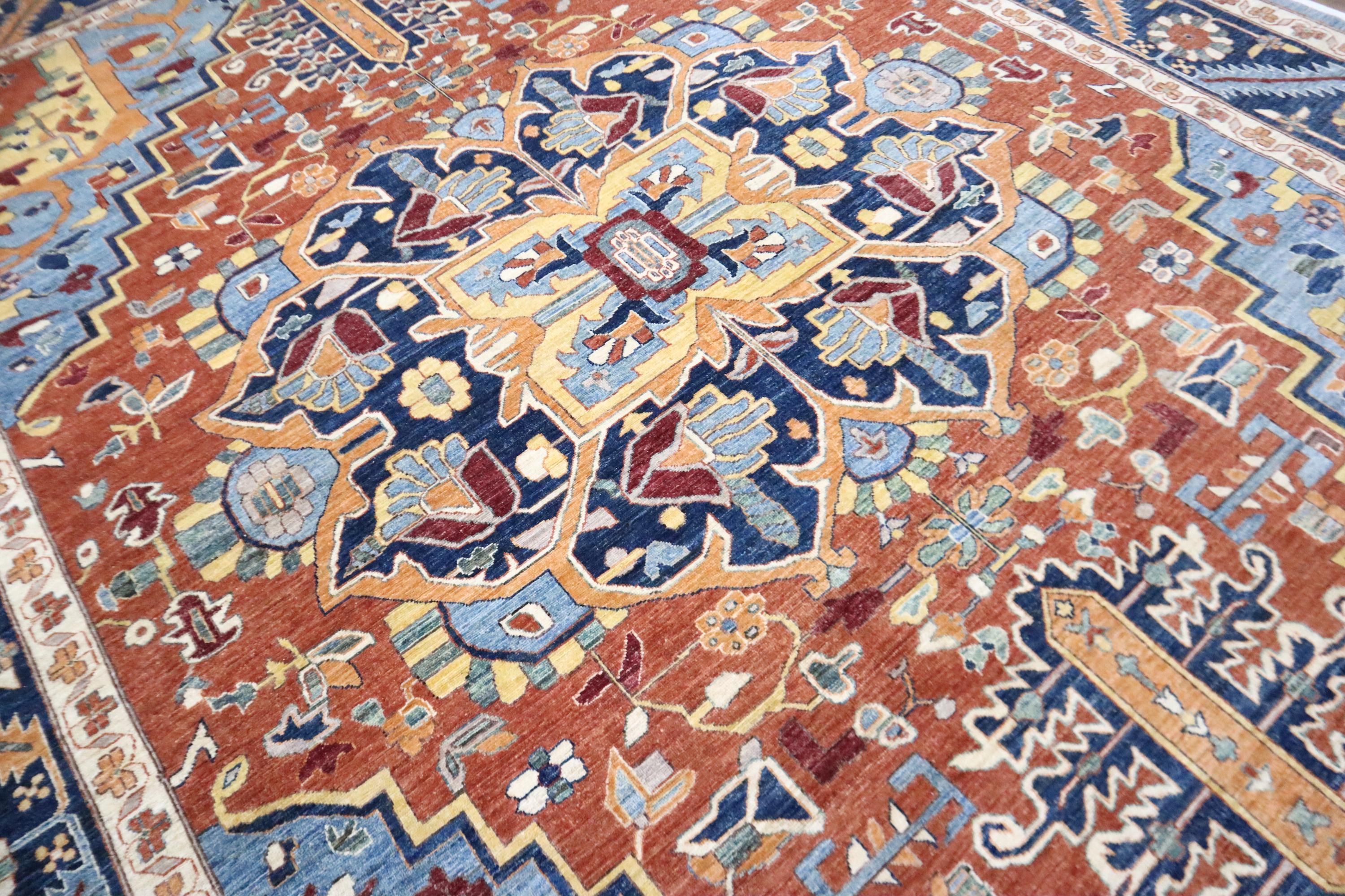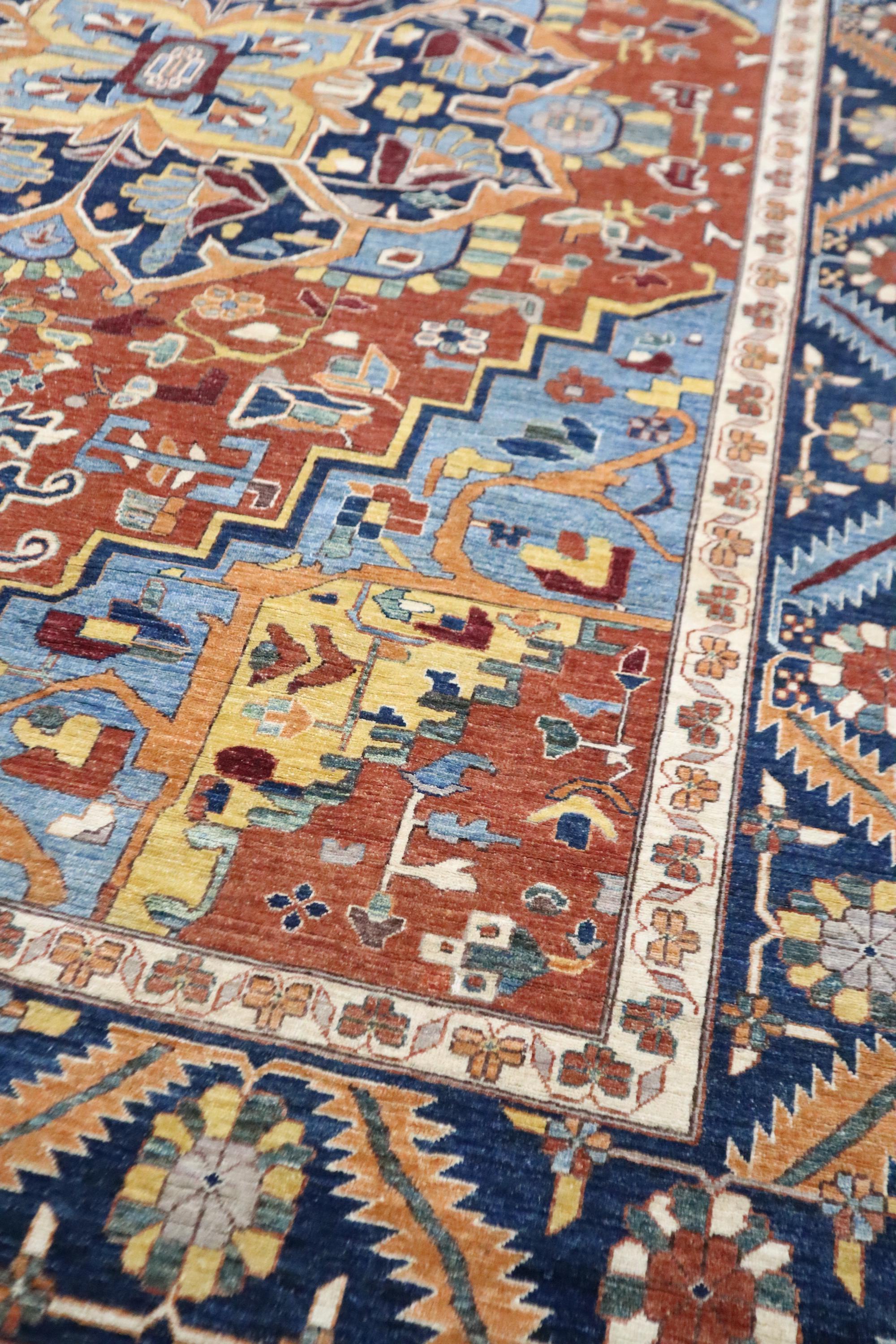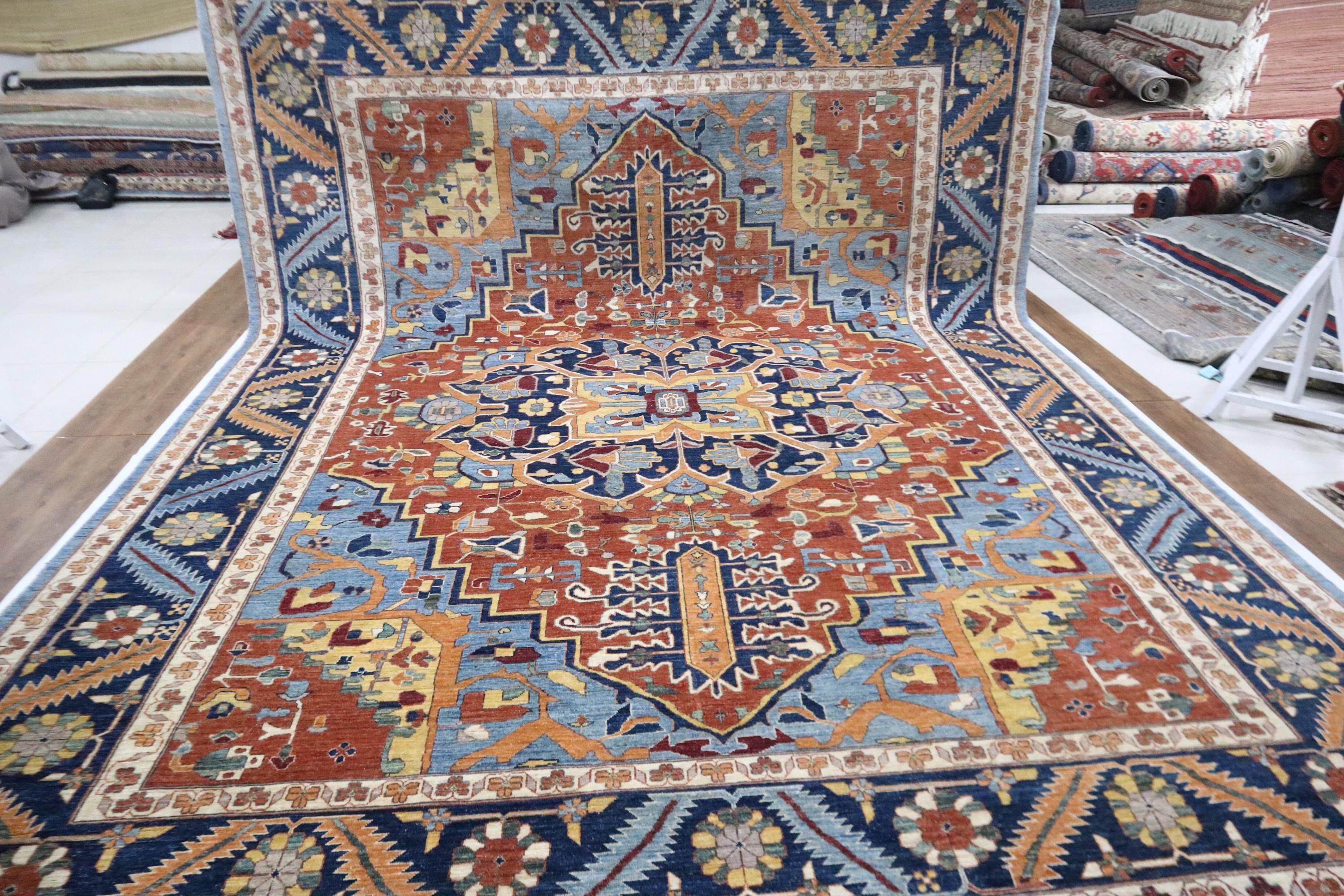 10x14 Heriz Area Rug - Rust Blue Persian Style Afghan Handmade Traditional Fine Quality Wool Rug - Geometric Rug - Oversize Rug - Office Rug