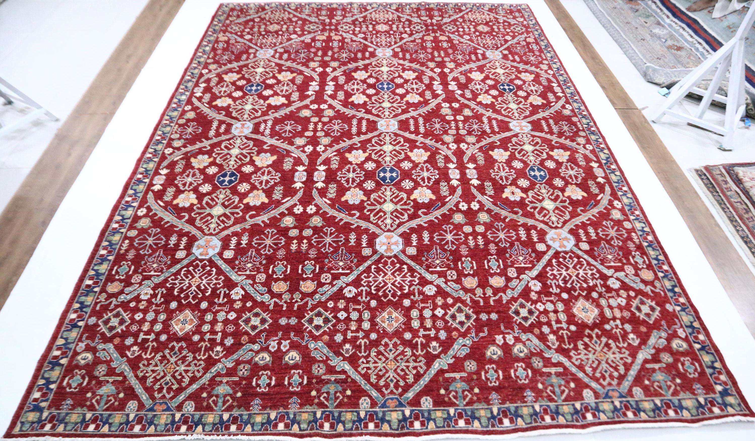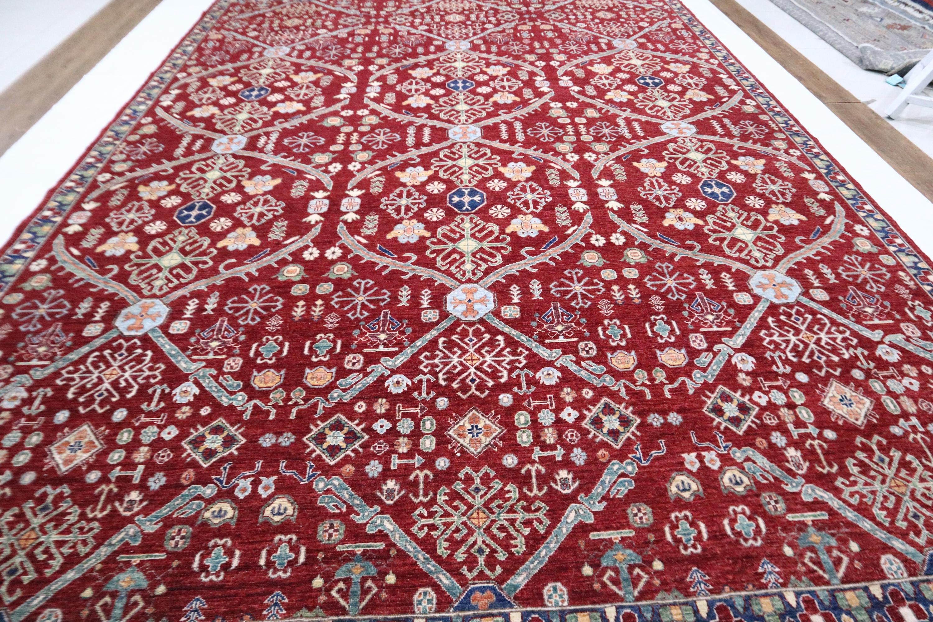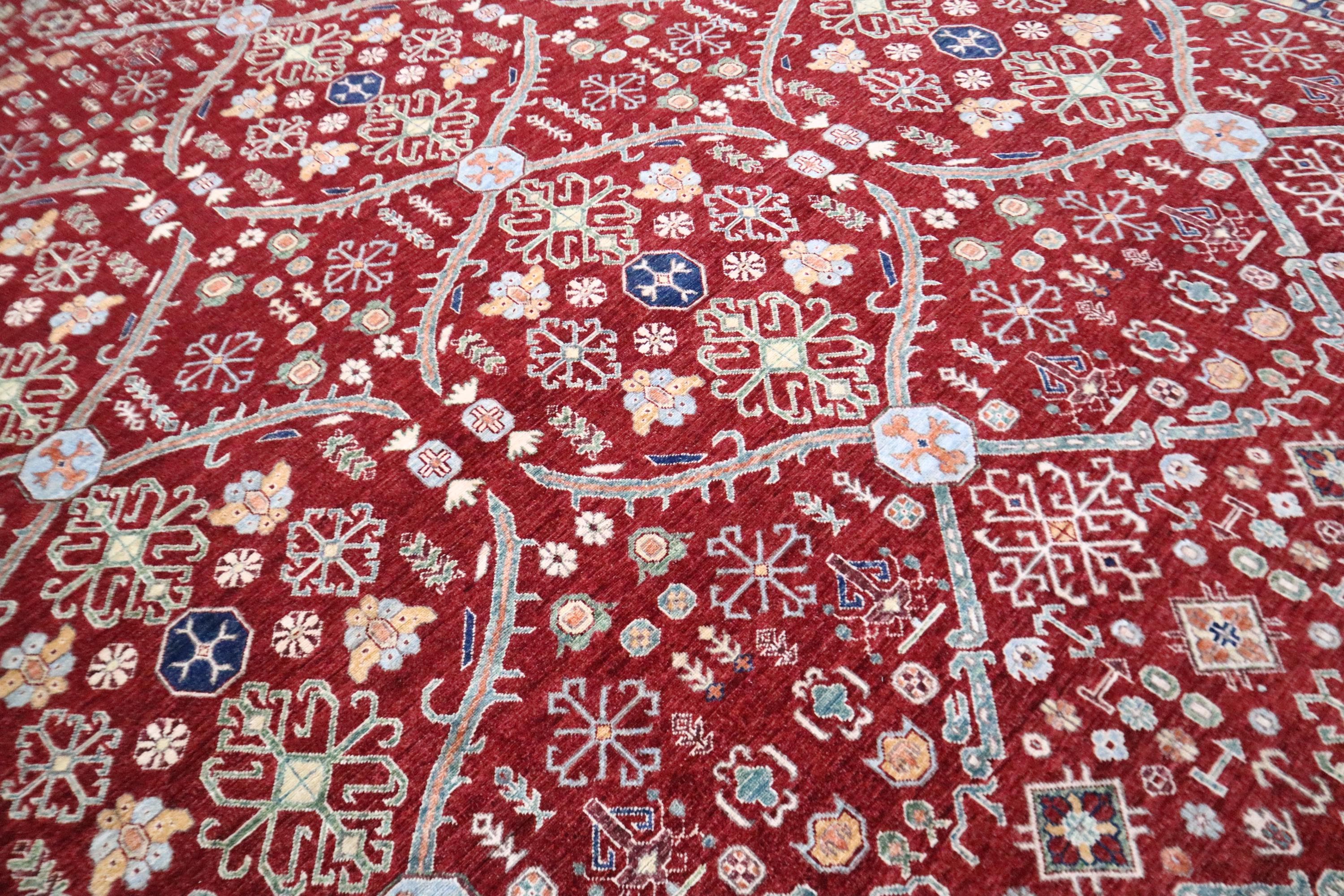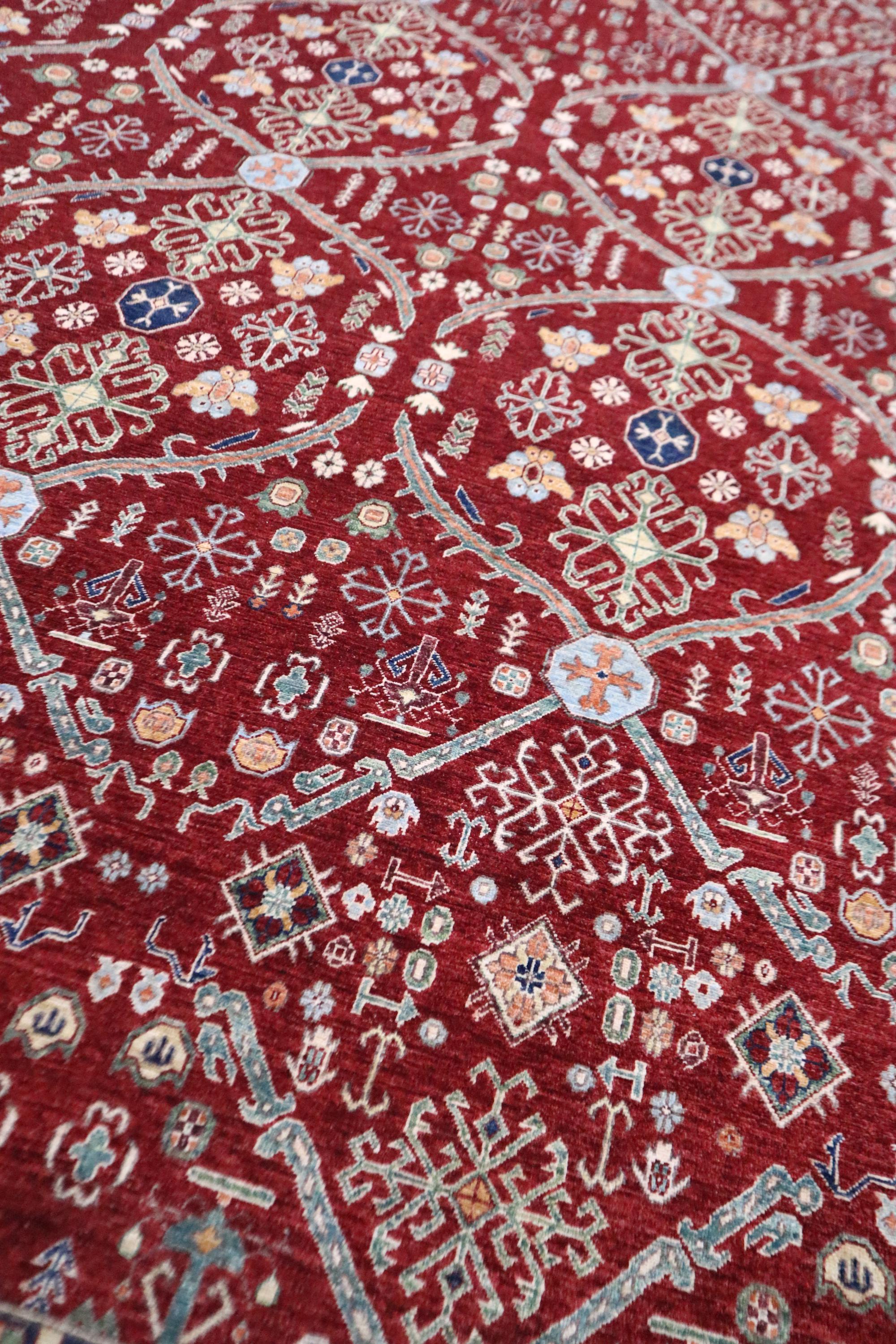 This hand-knotted pile rug is crafted using 100% natural dyes and handspun wool, giving it a rich texture and vibrant colors.