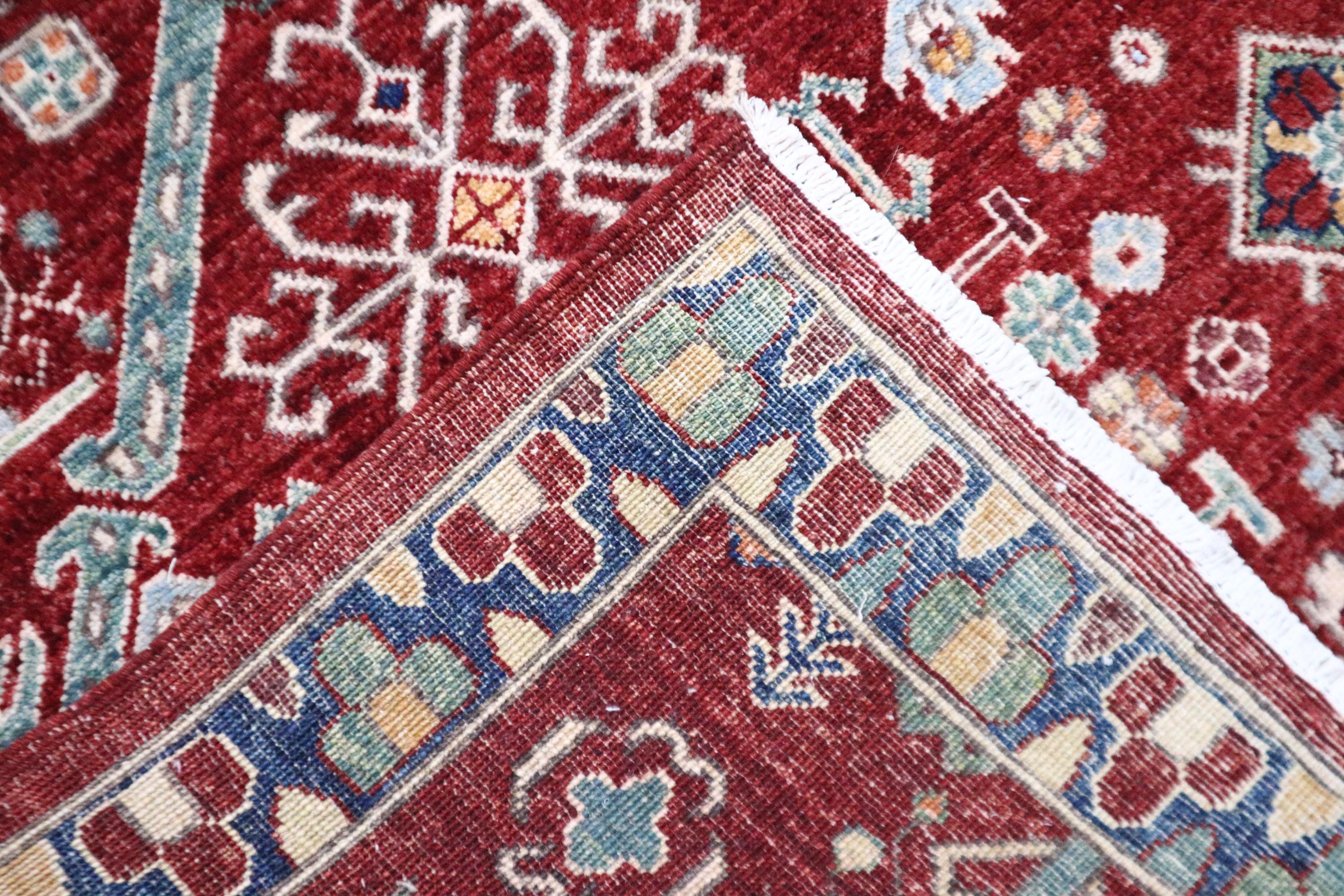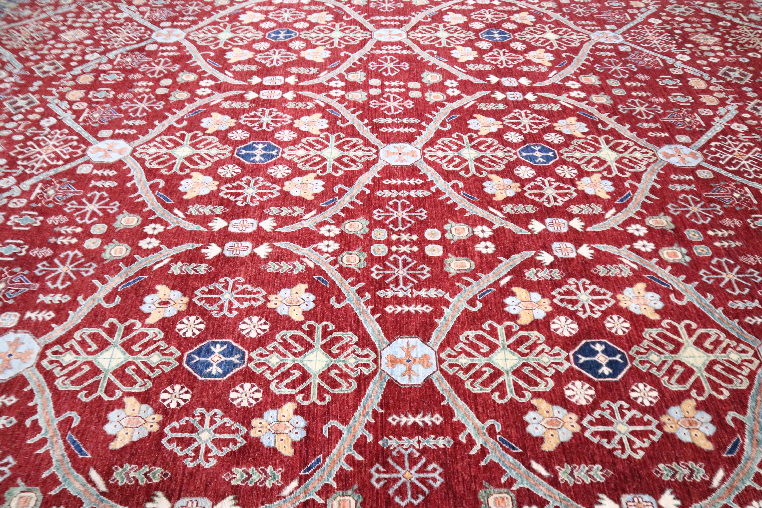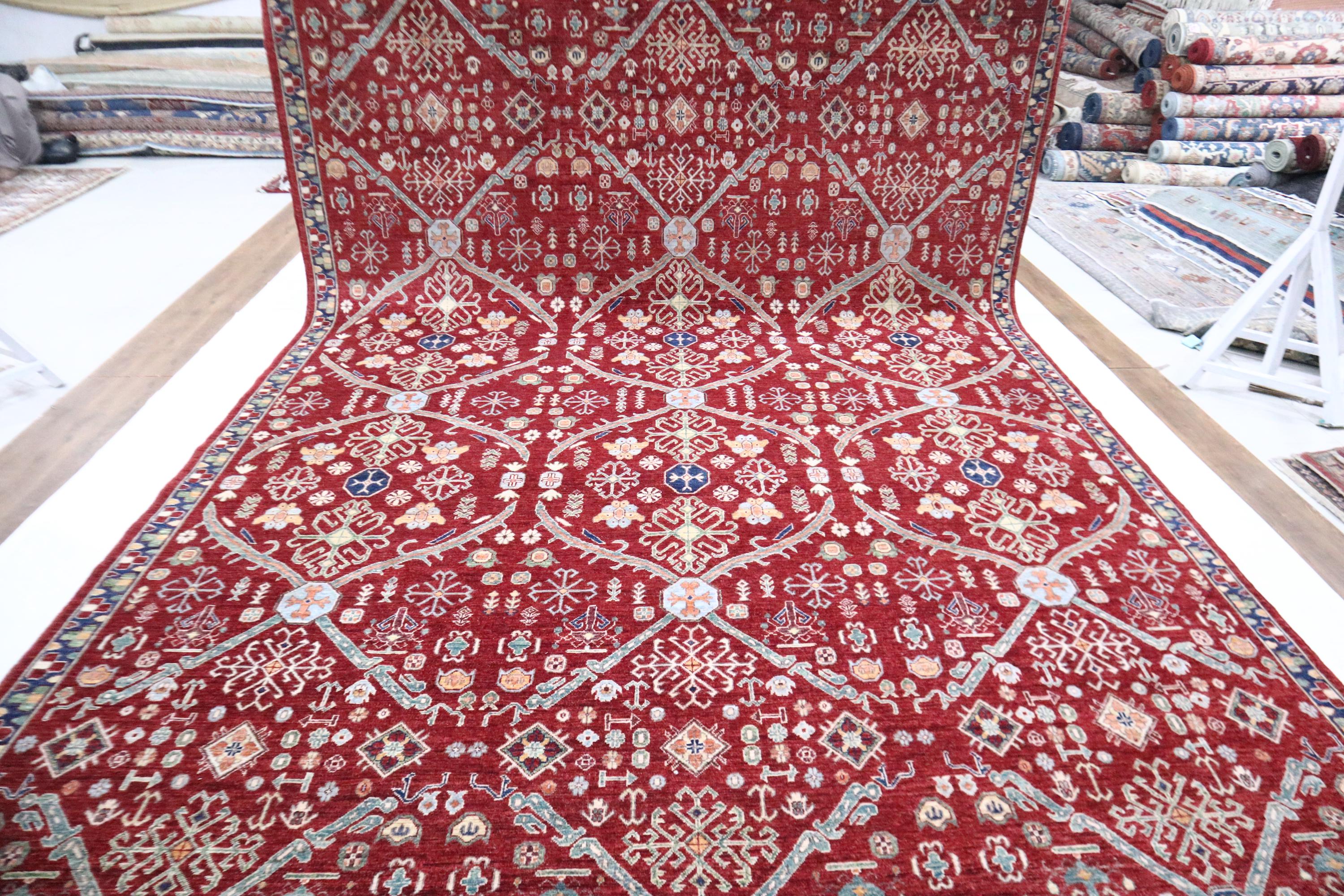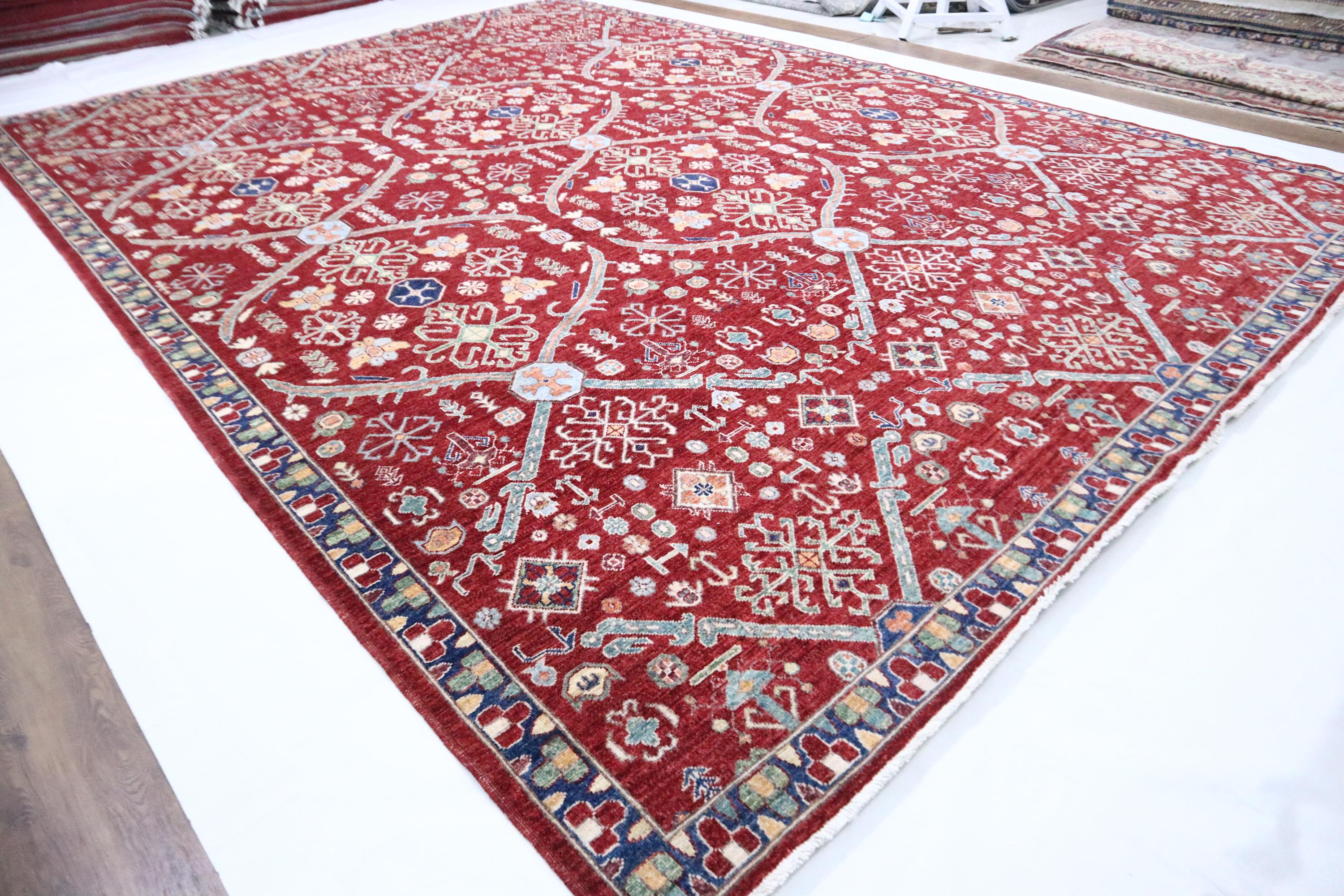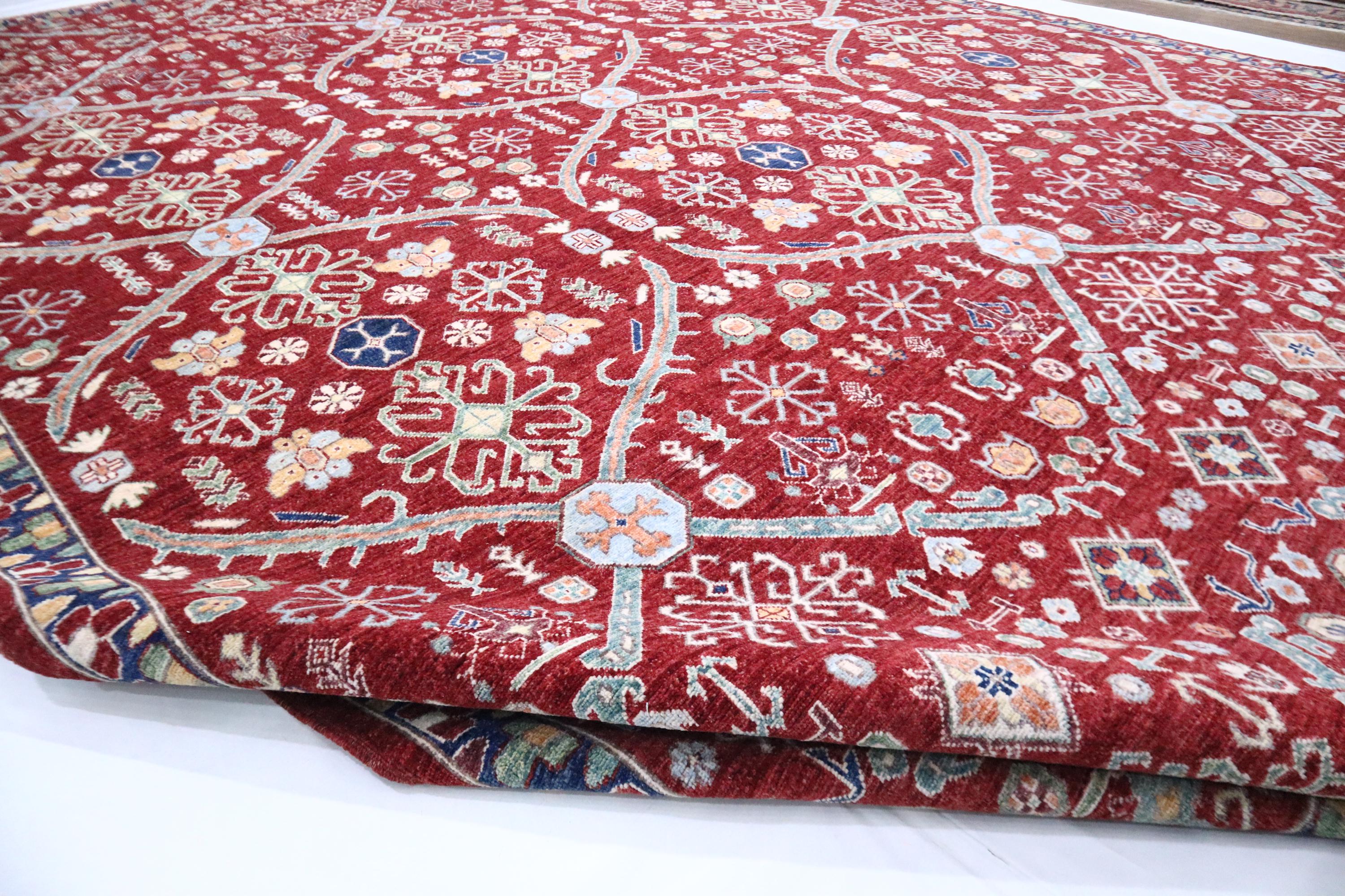 This hand-knotted pile rug is crafted using 100% natural dyes and handspun wool, giving it a rich texture and vibrant colors.