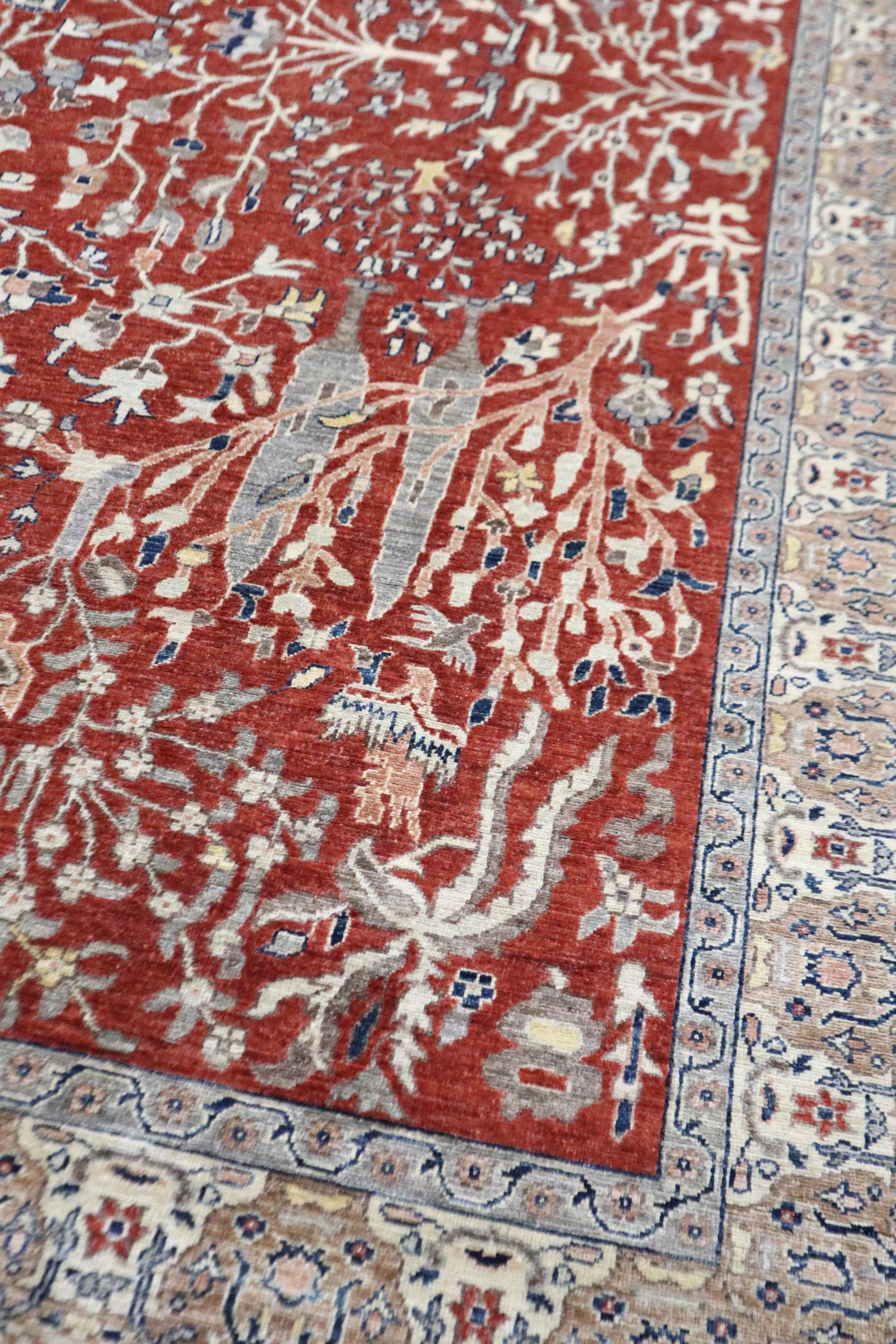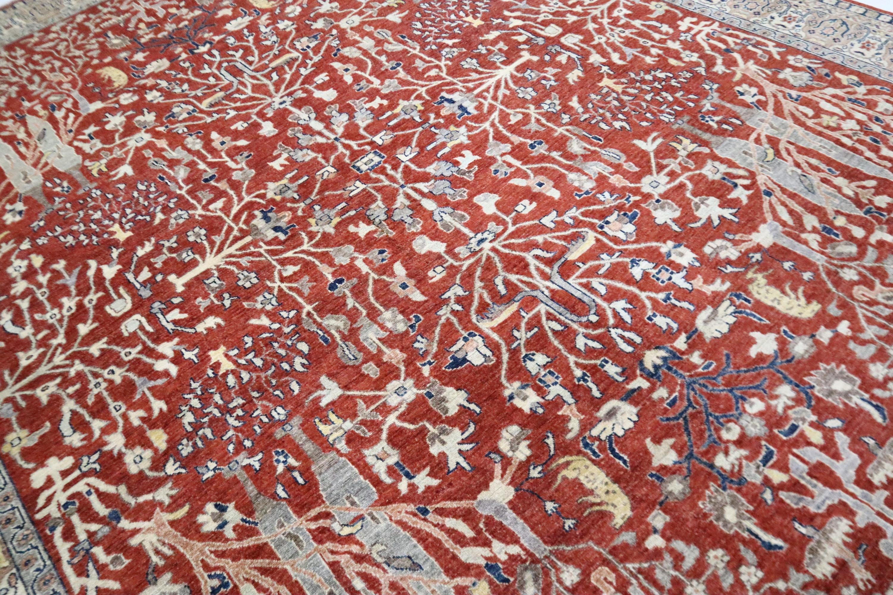 This hand-knotted pile rug is crafted using 100% natural dyes and handspun wool, giving it a rich texture and vibrant colors.