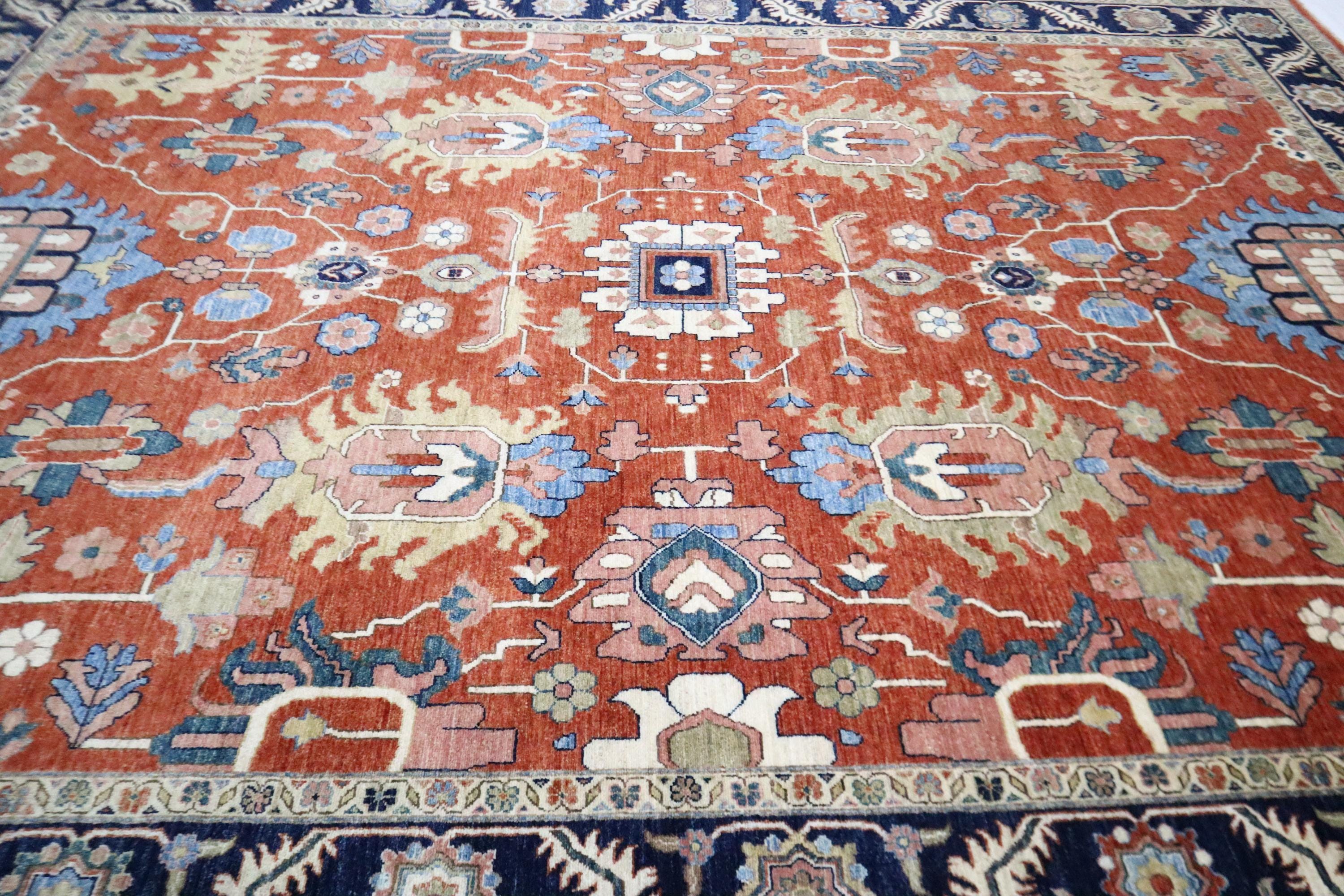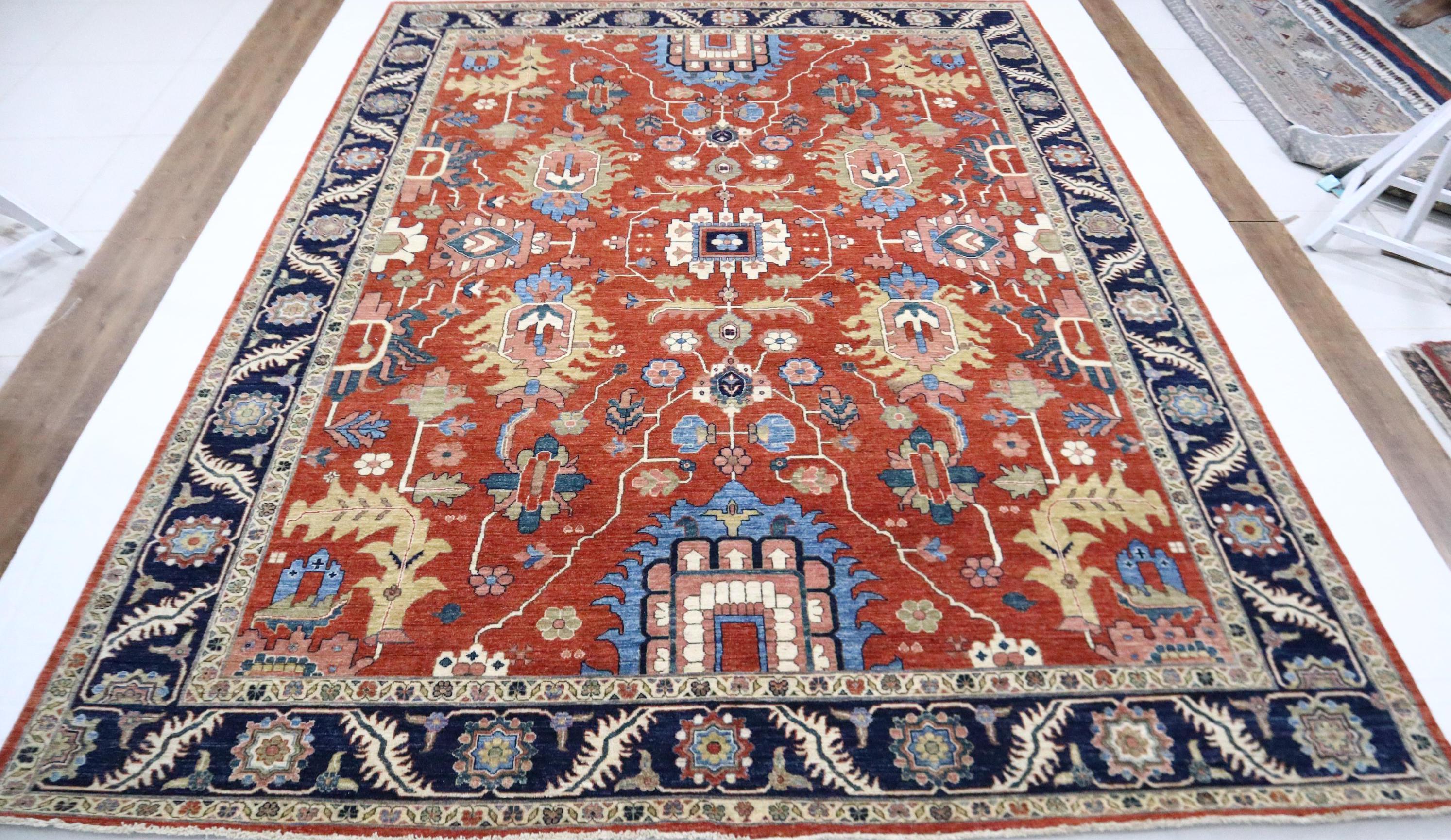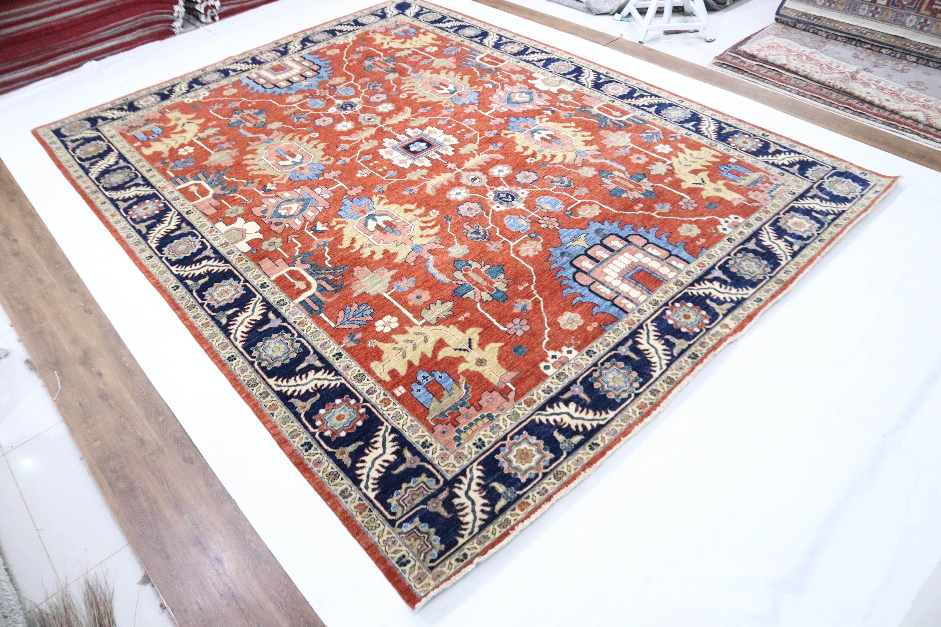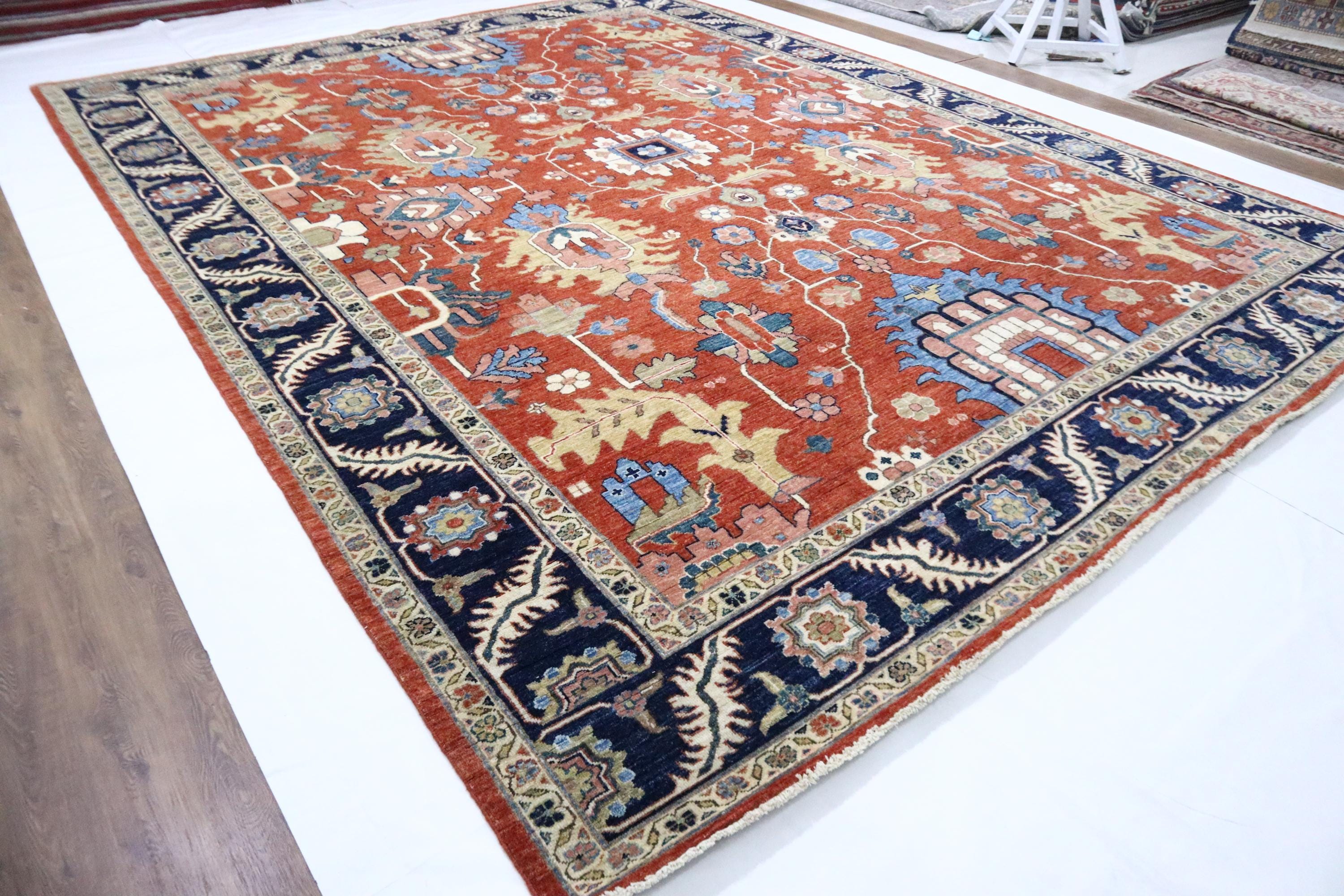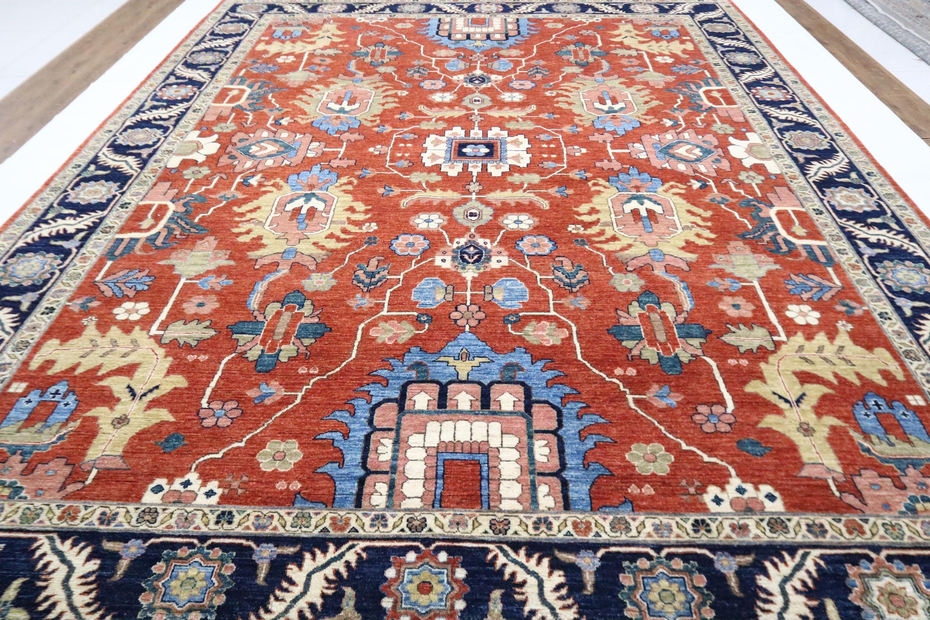 9x12 Serapi Area Rug - Red Blue Persian Style Afghan Handmade Geometric Fine Quality Wool Rug - Oriental Rug - Living Room Rug - Bedroom Rug
