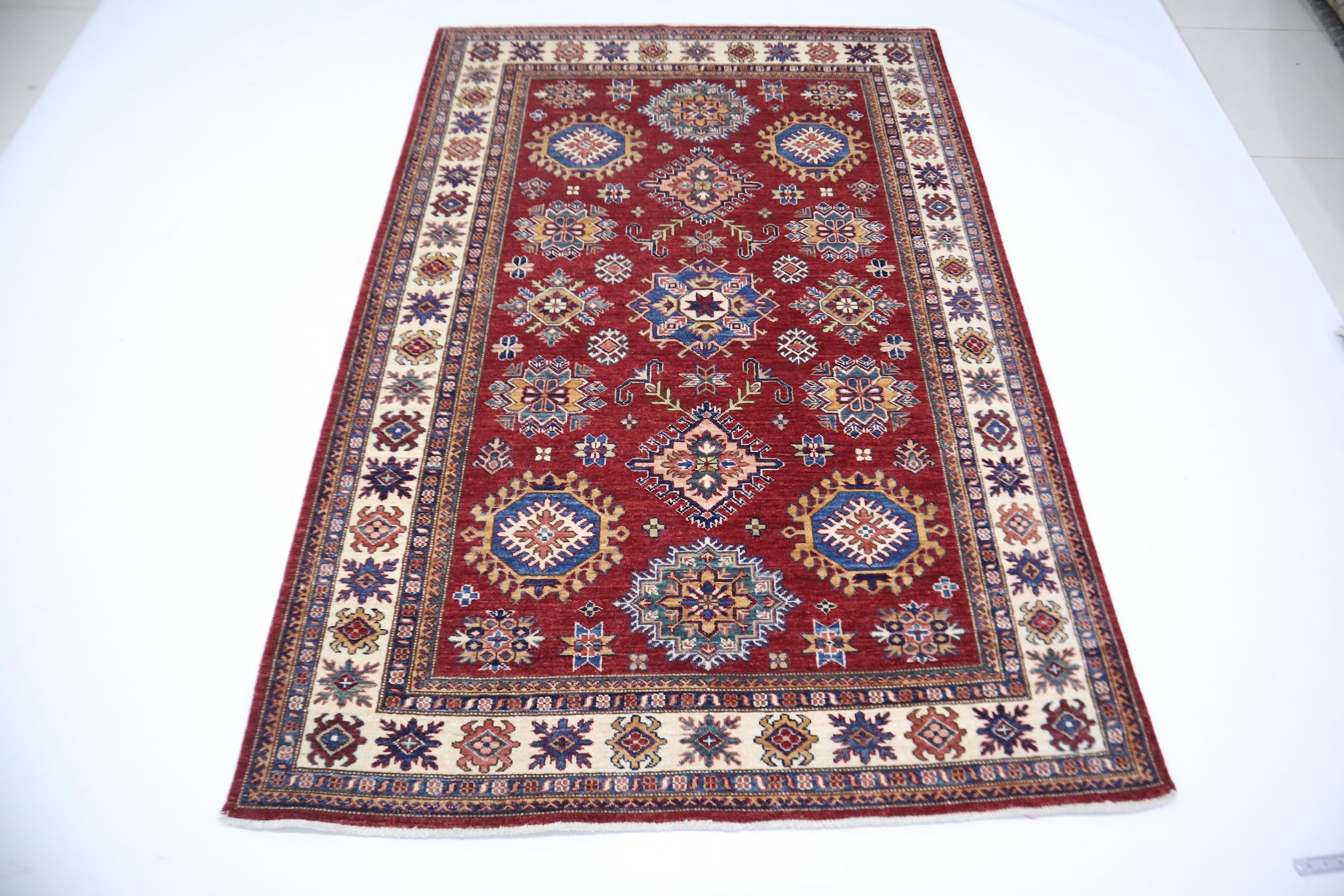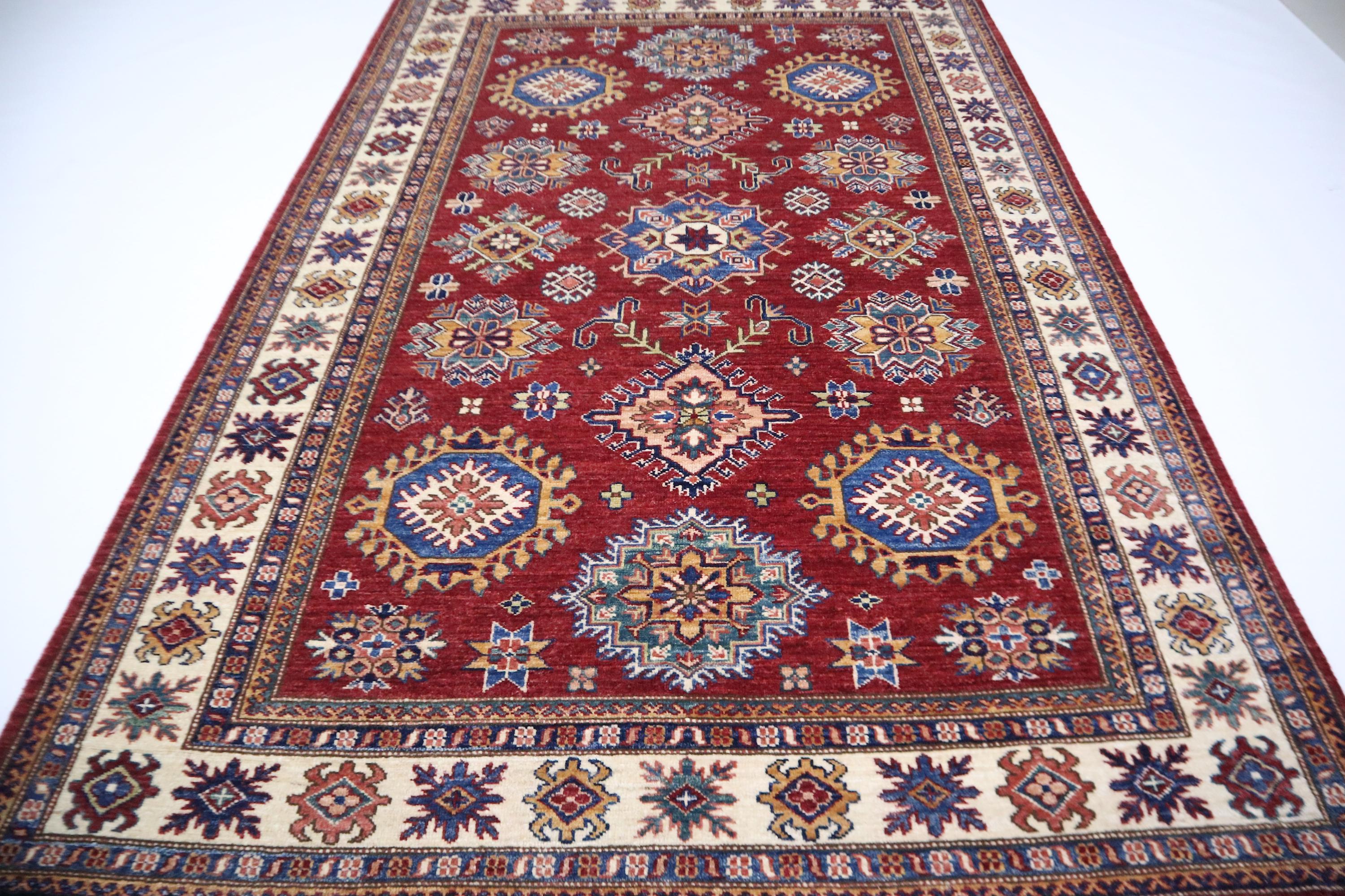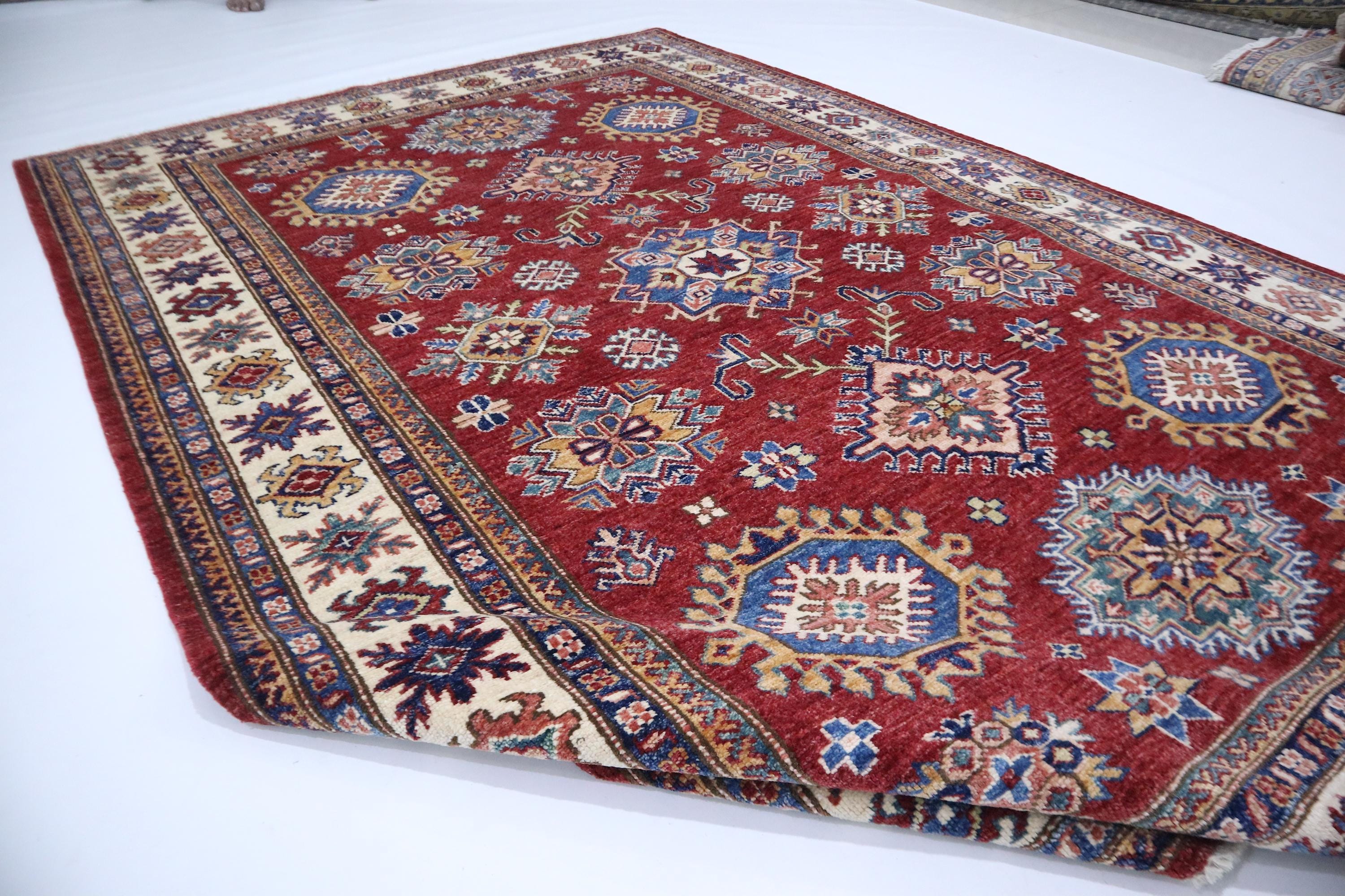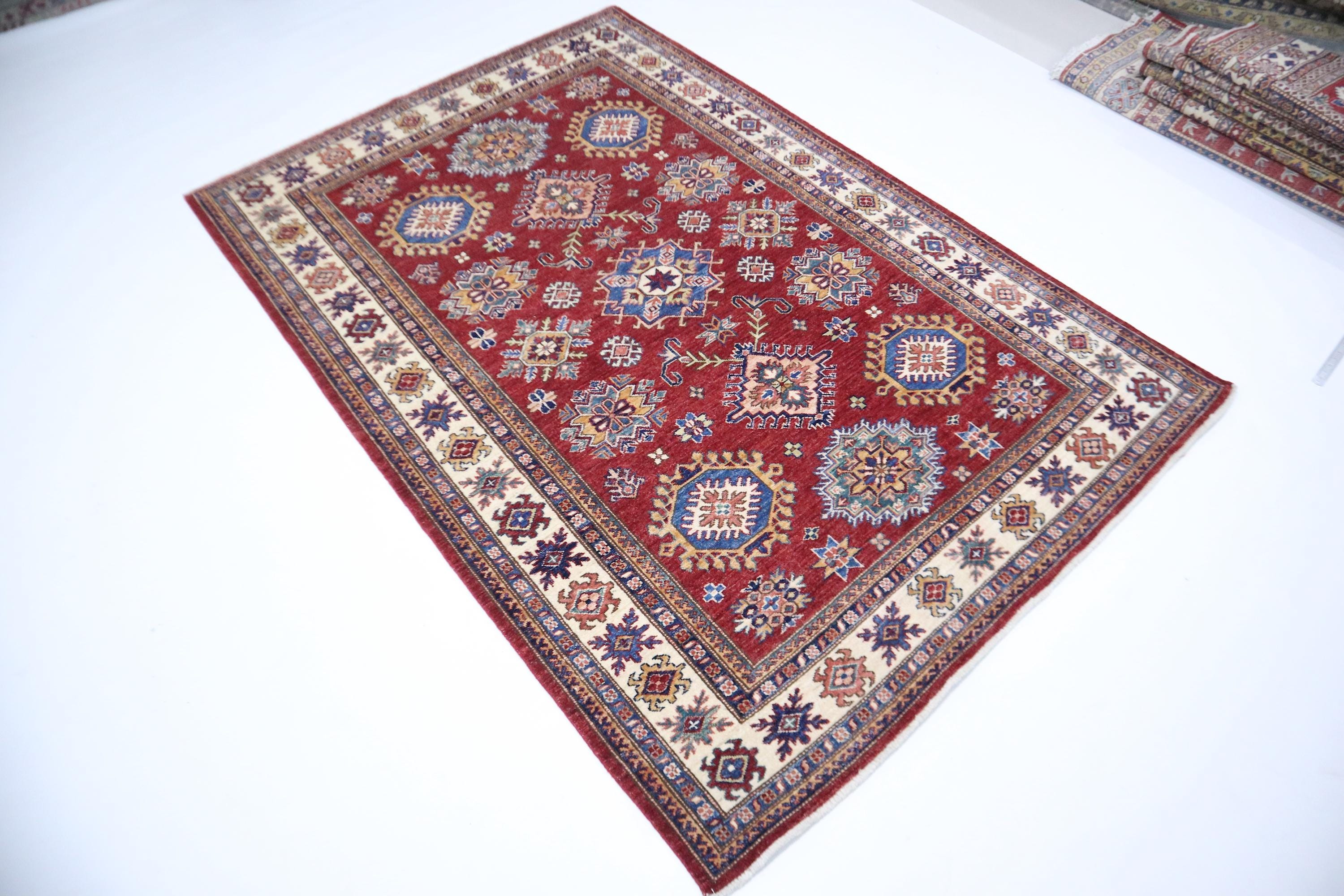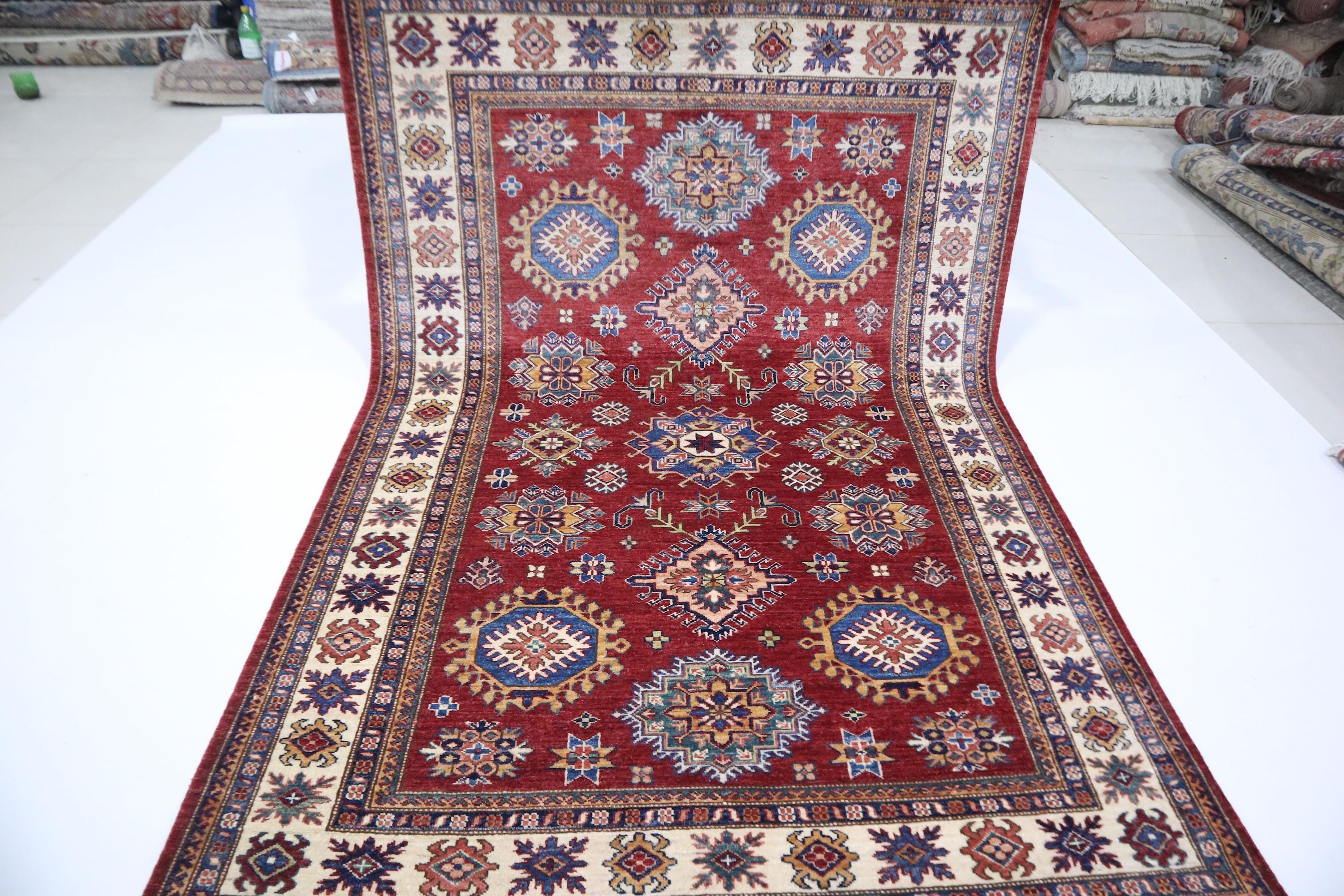 5x7 Ft Kazak Area Rug - Red Afghan Handmade Geometric Veg Dye Wool Rug - Traditional Rugs - Oriental Rugs - Bedroom Rug - Living Room Rug