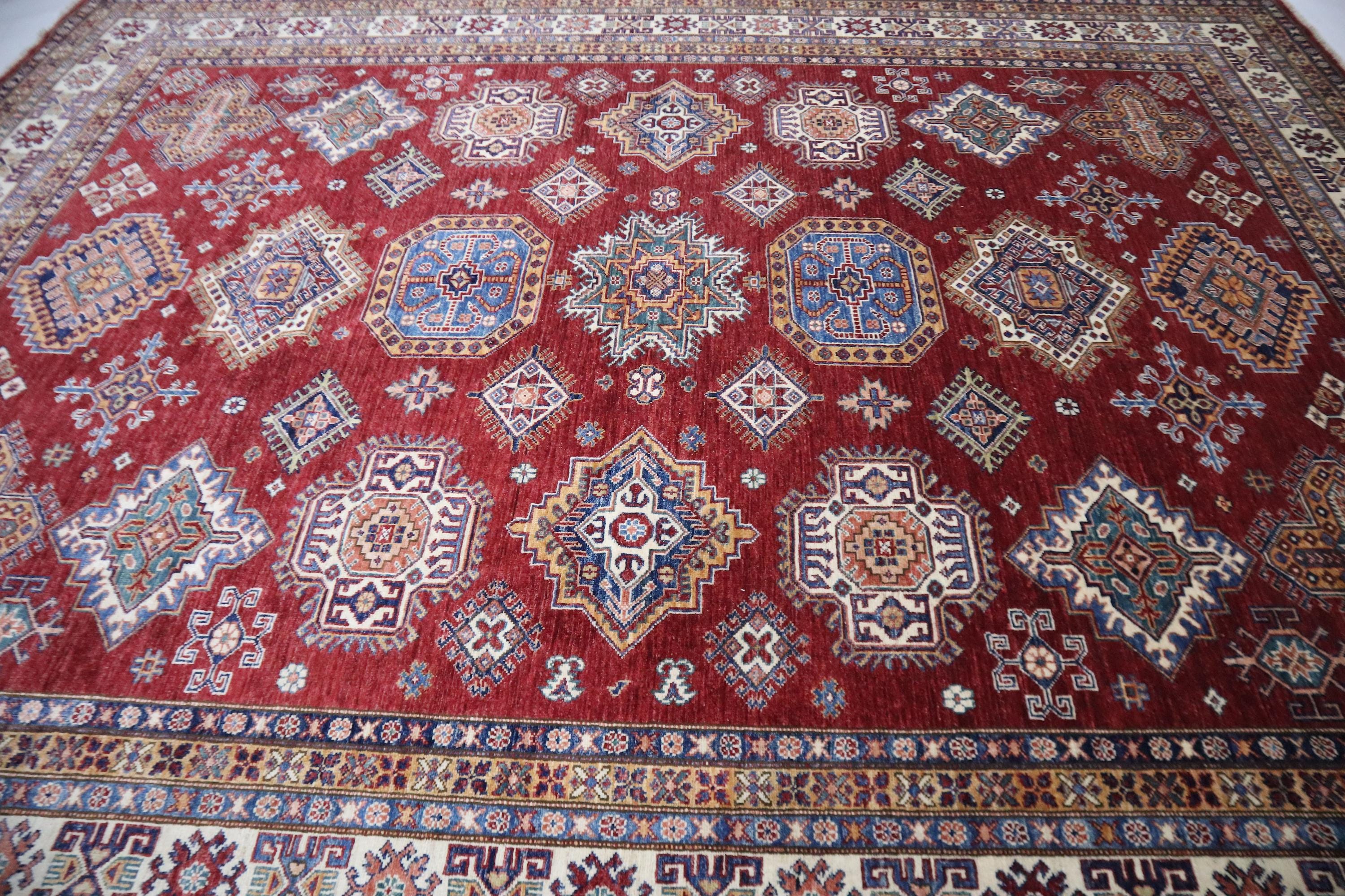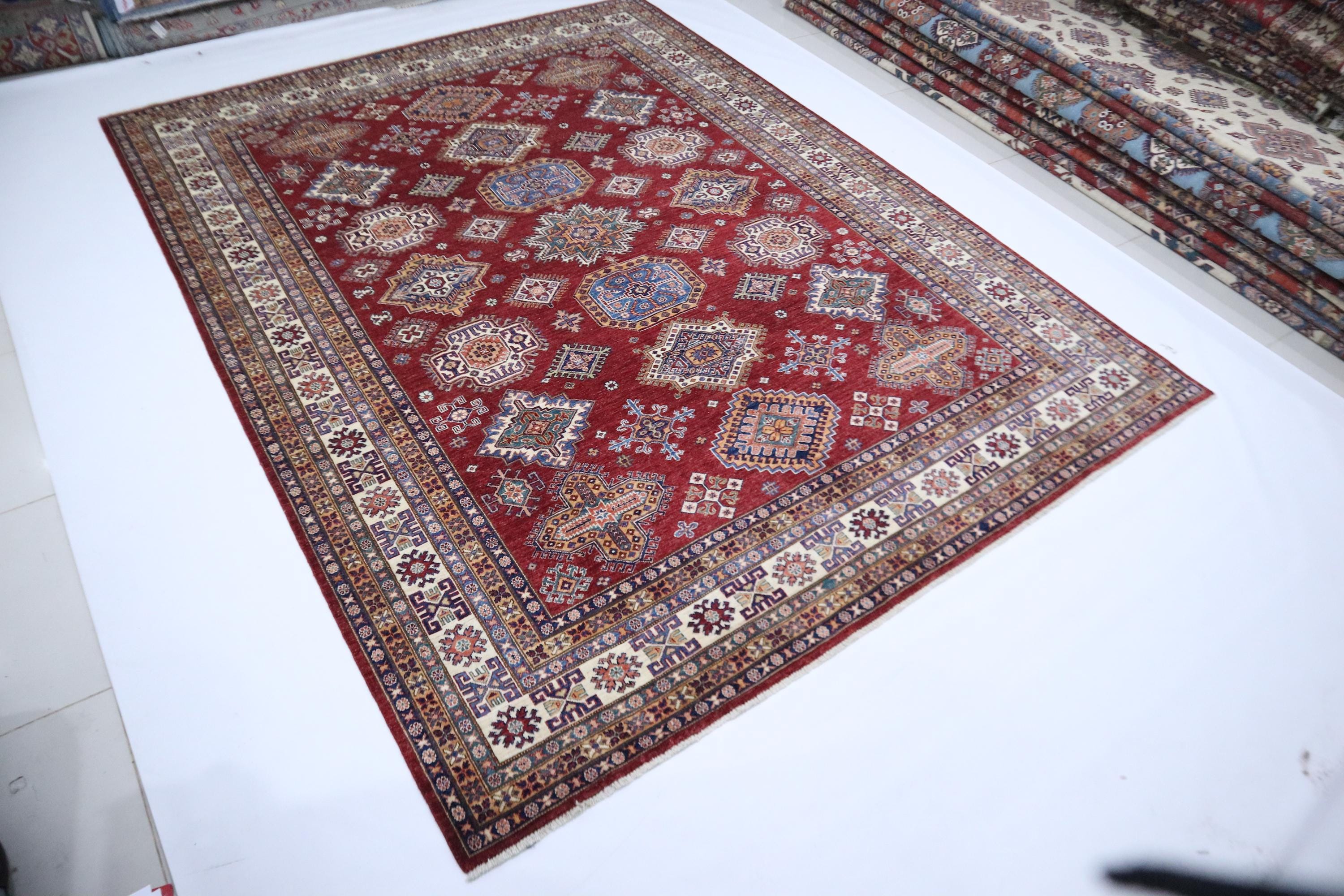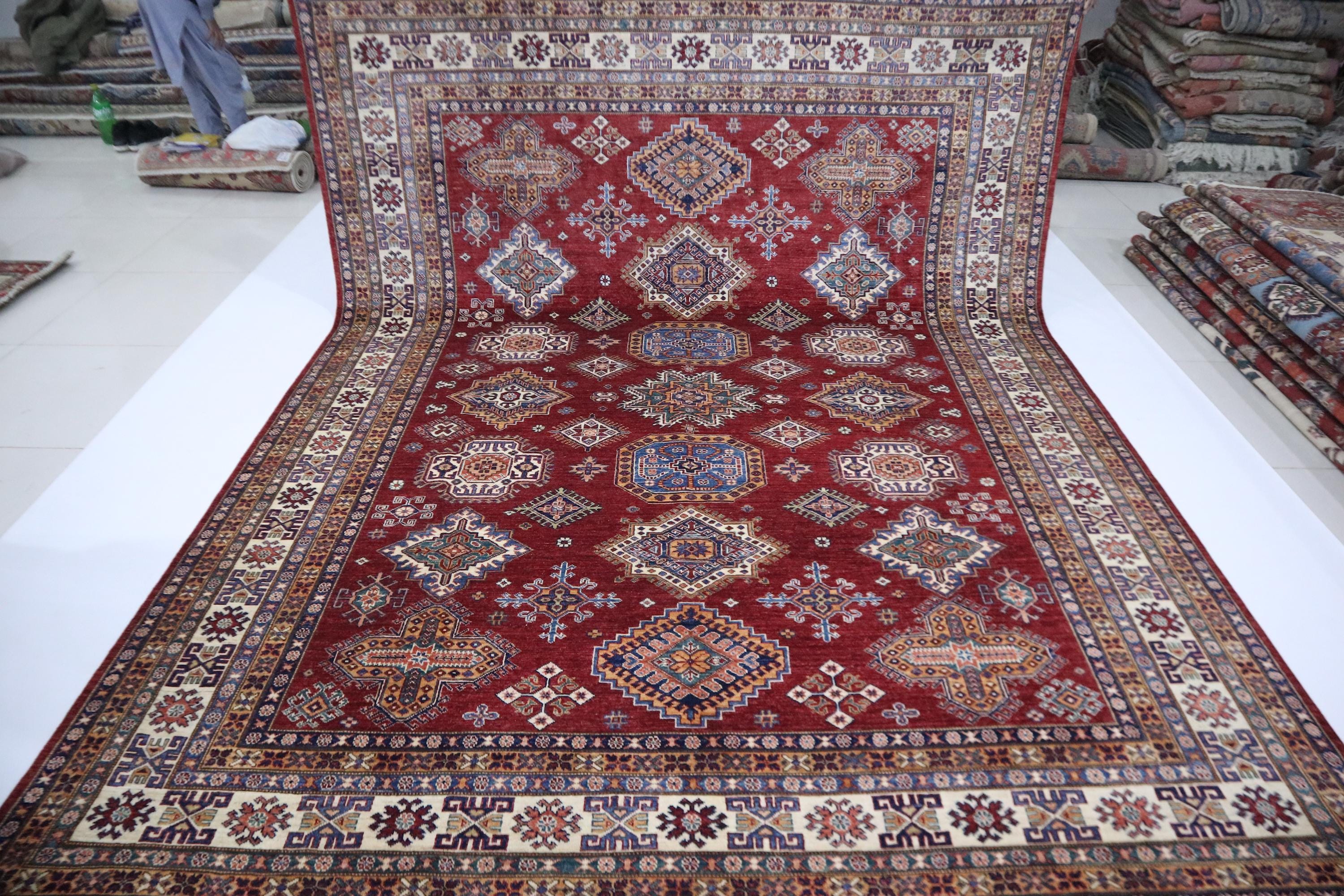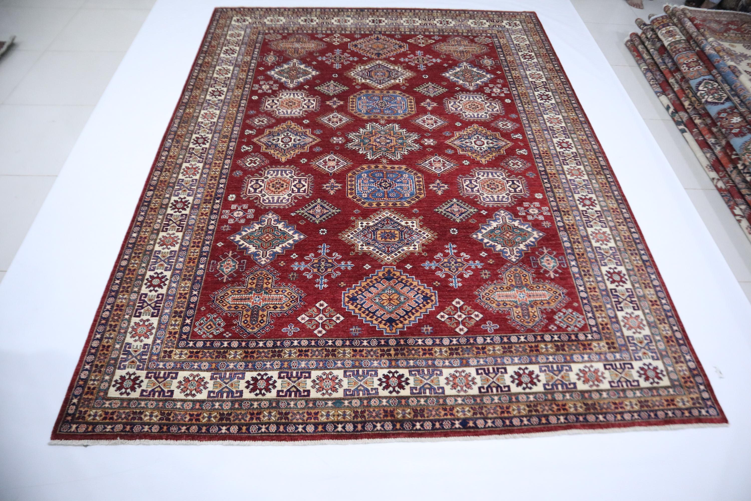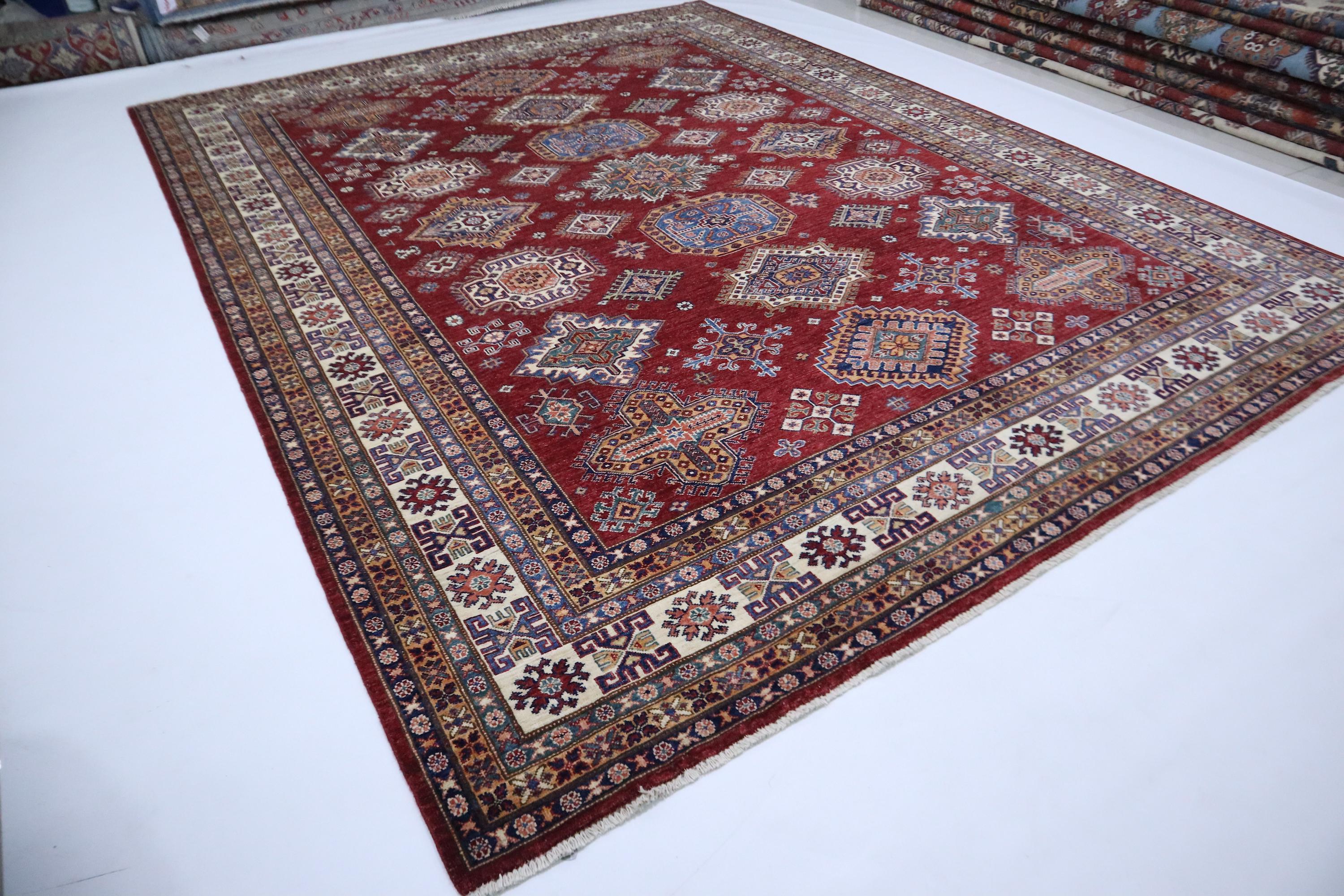 8x11 Kazak Area Rug - Red Afghan Handmade Caucasian Veg Dye Wool Rug - Geometric Design Rug - Traditional Design Rug - Living Room Rug