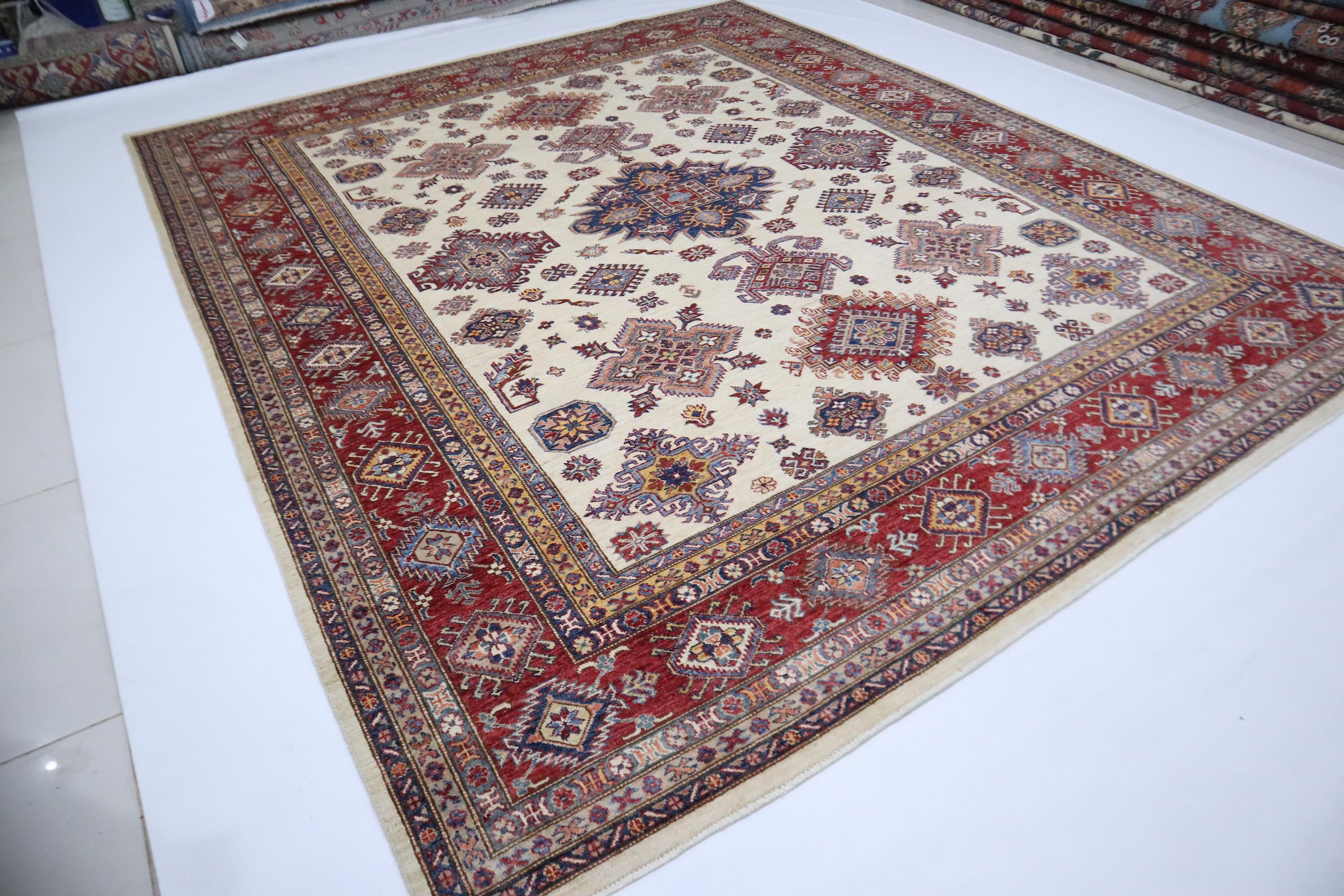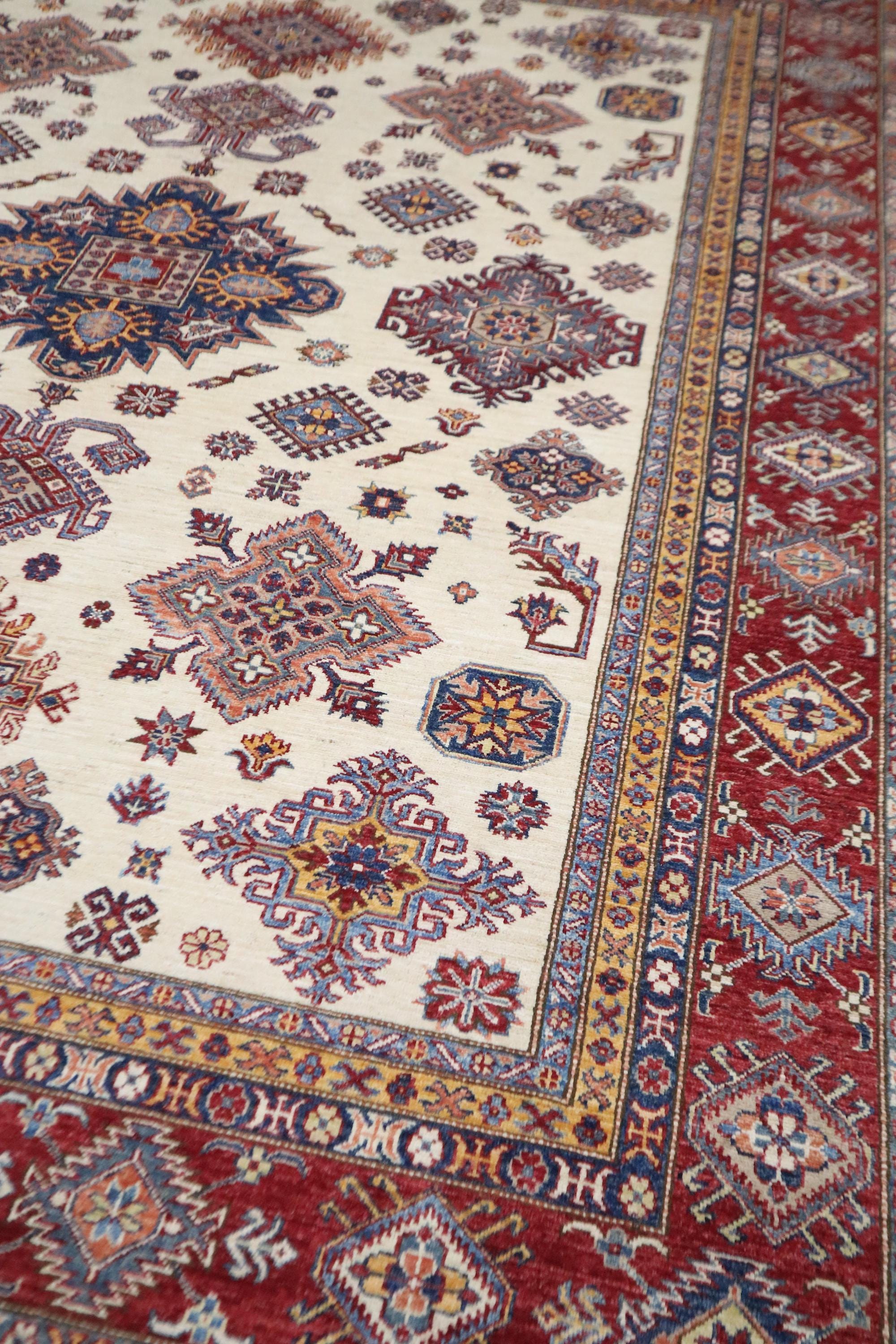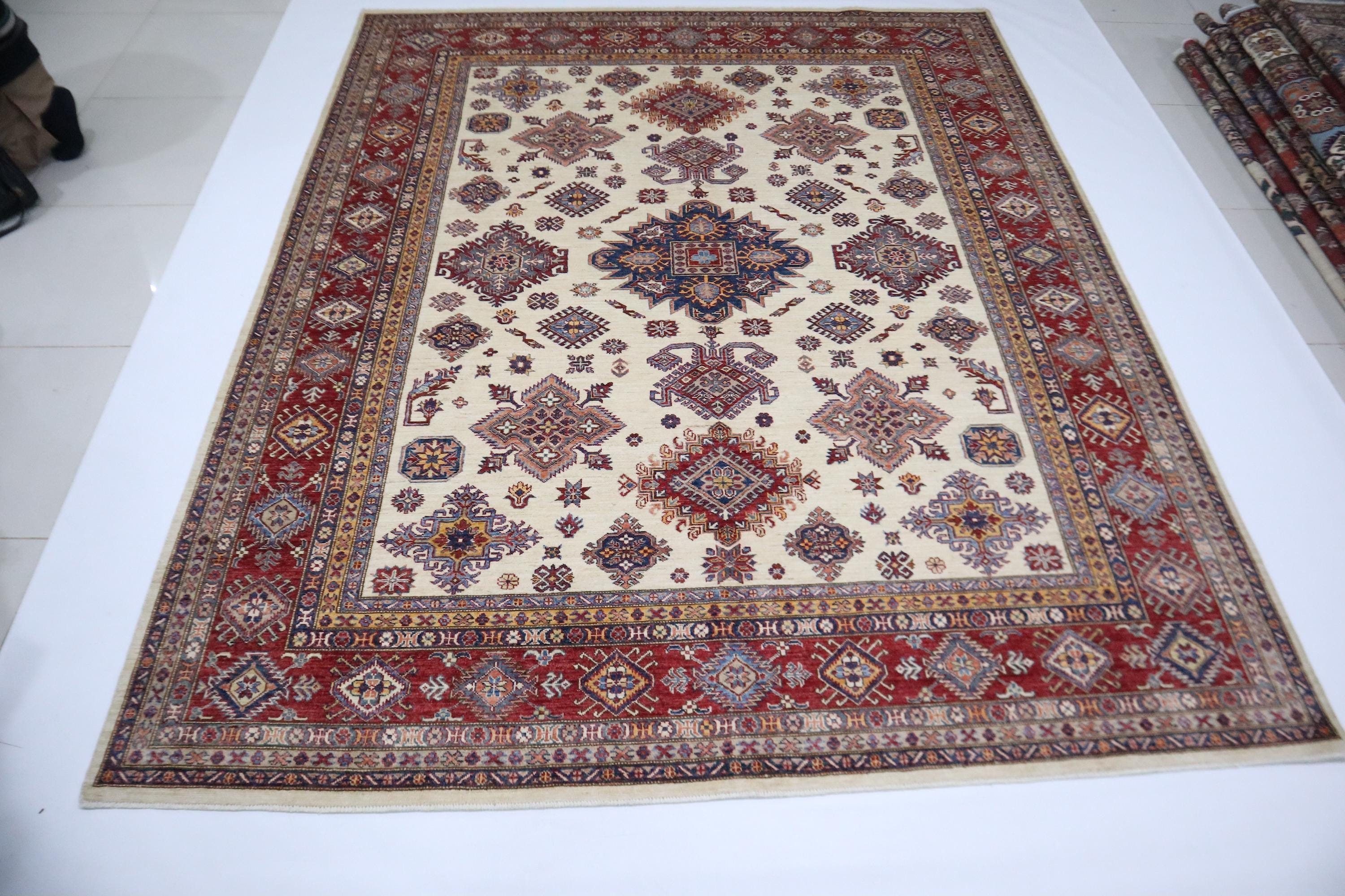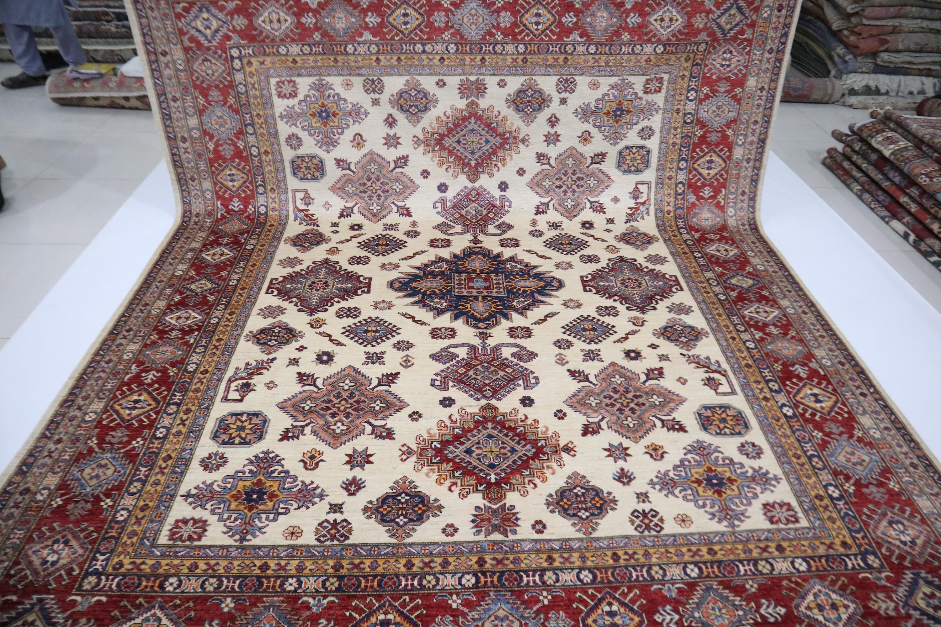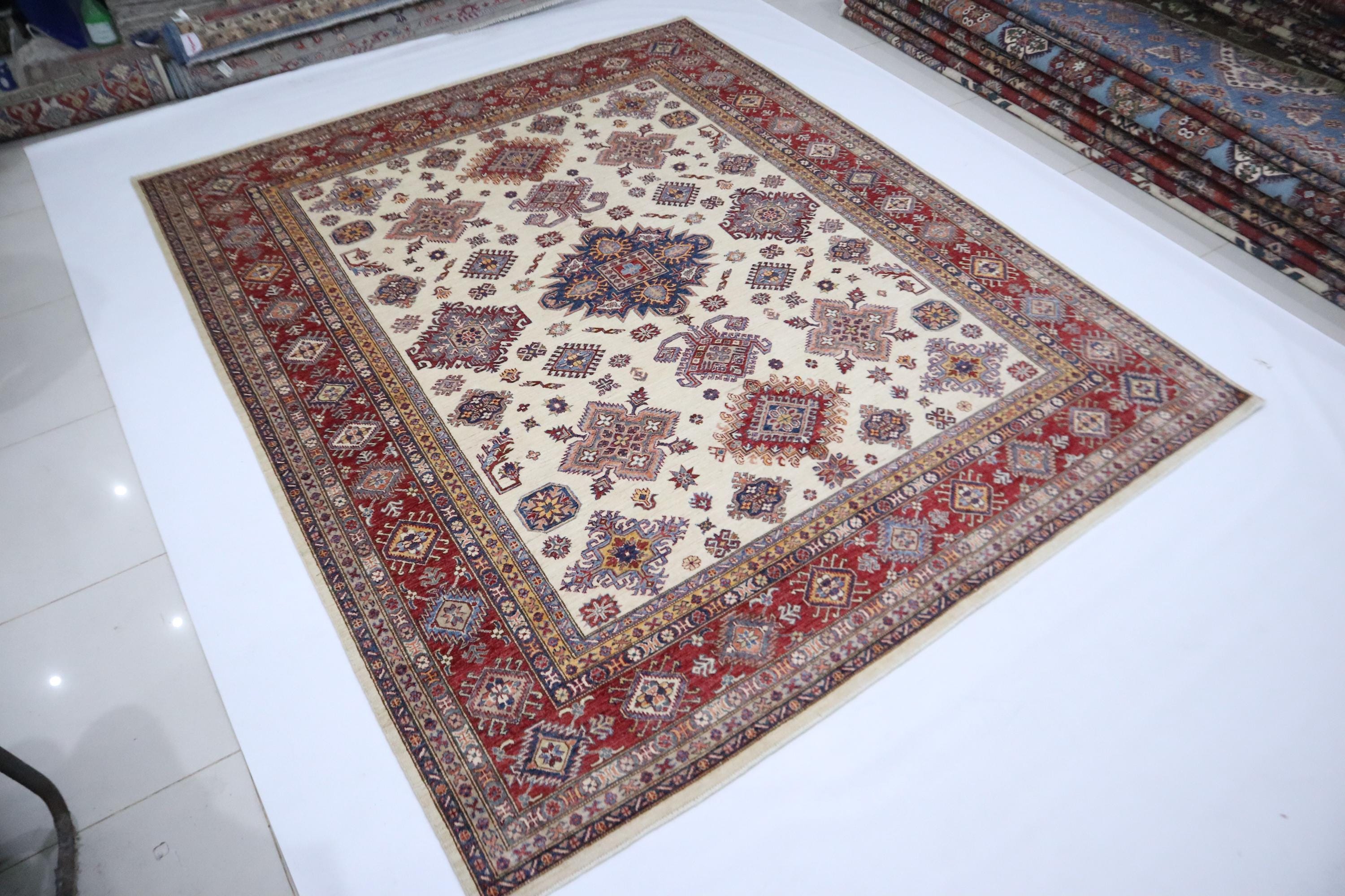 8x10 Feet Kazak Area Rug - Beige Red Afghan Handmade Traditional Authentic Wool Rug - Geometric Rug - Living Room Rug - Dining Room Rug
