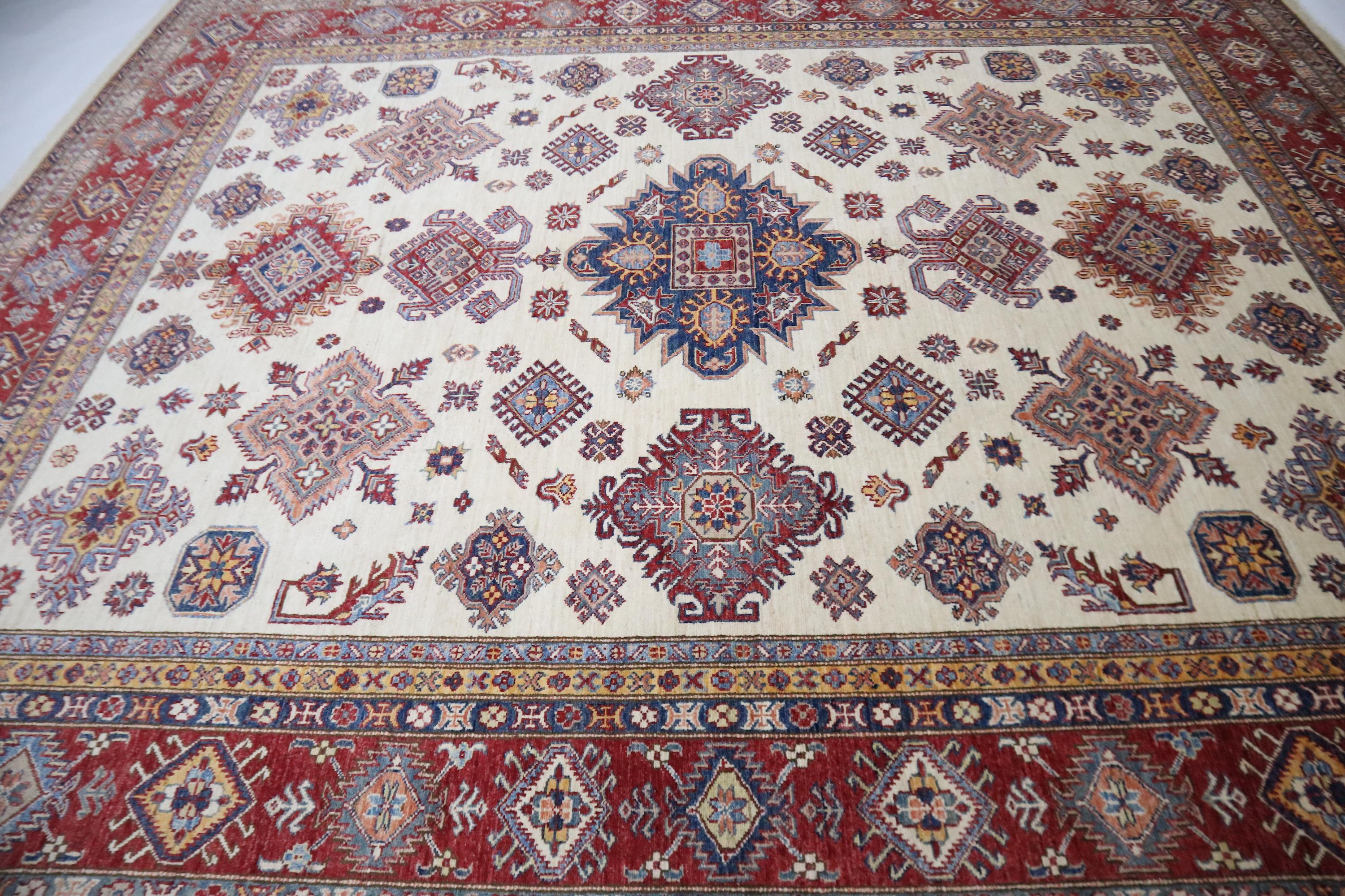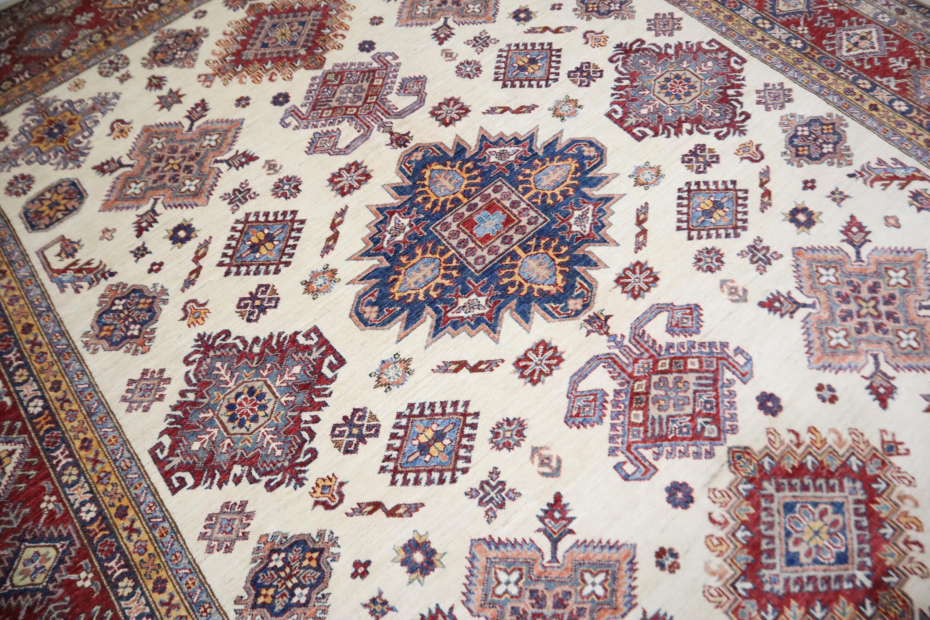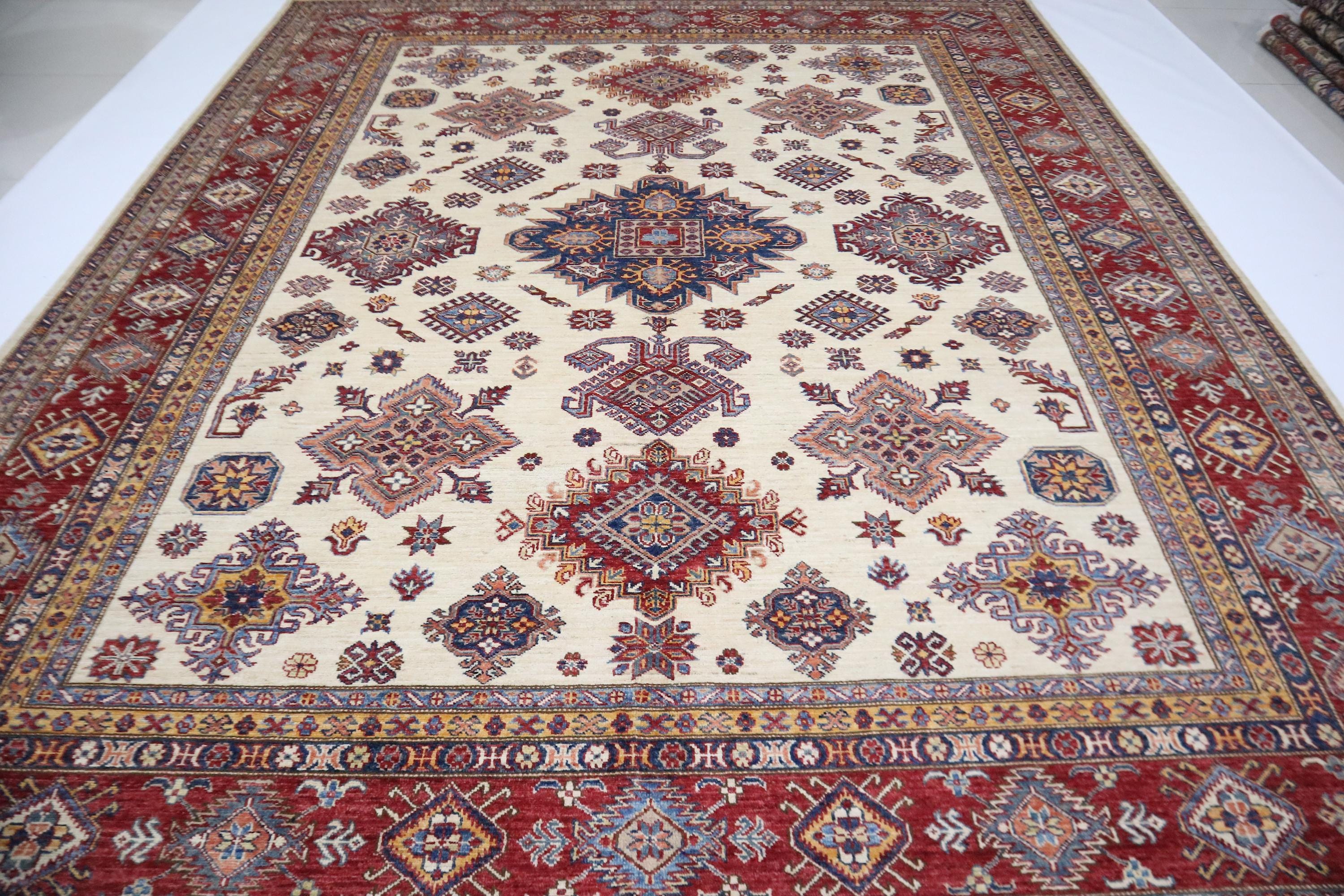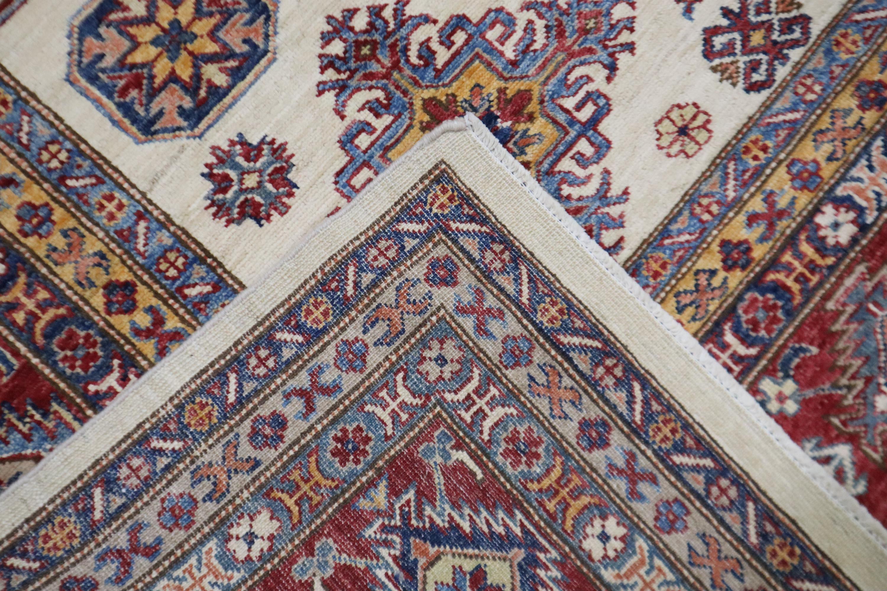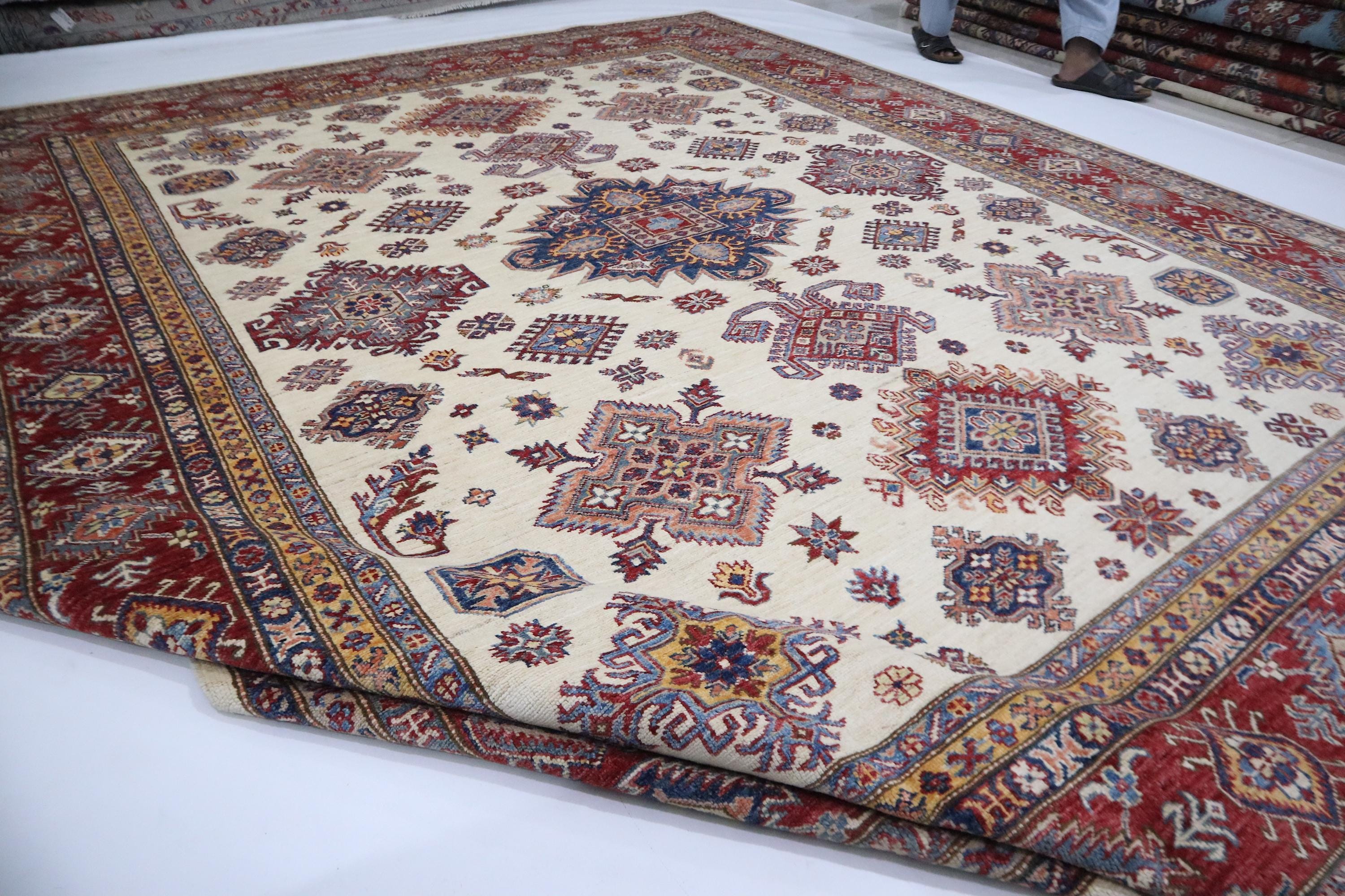 8x10 Feet Kazak Area Rug - Beige Red Afghan Handmade Traditional Authentic Wool Rug - Geometric Rug - Living Room Rug - Dining Room Rug