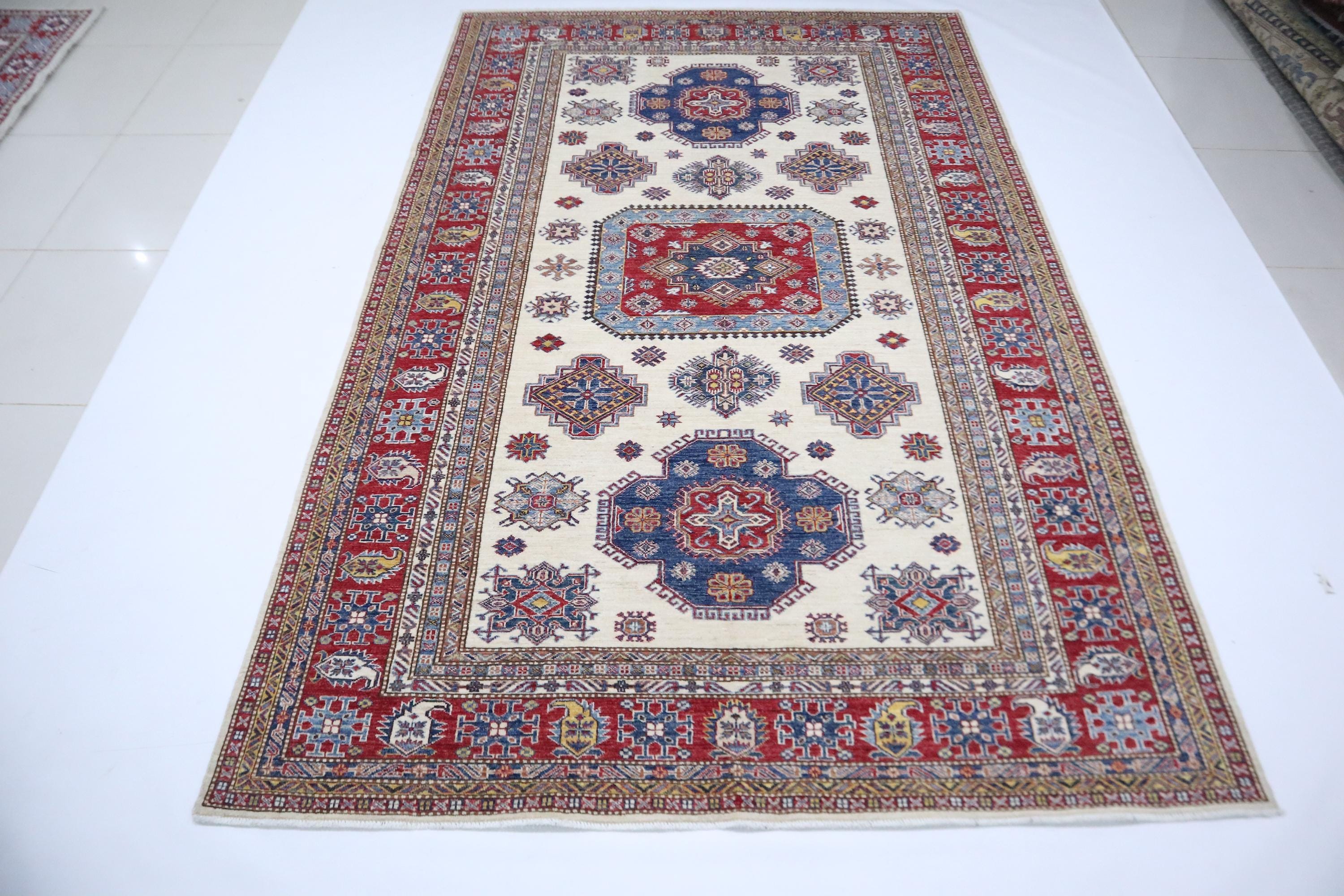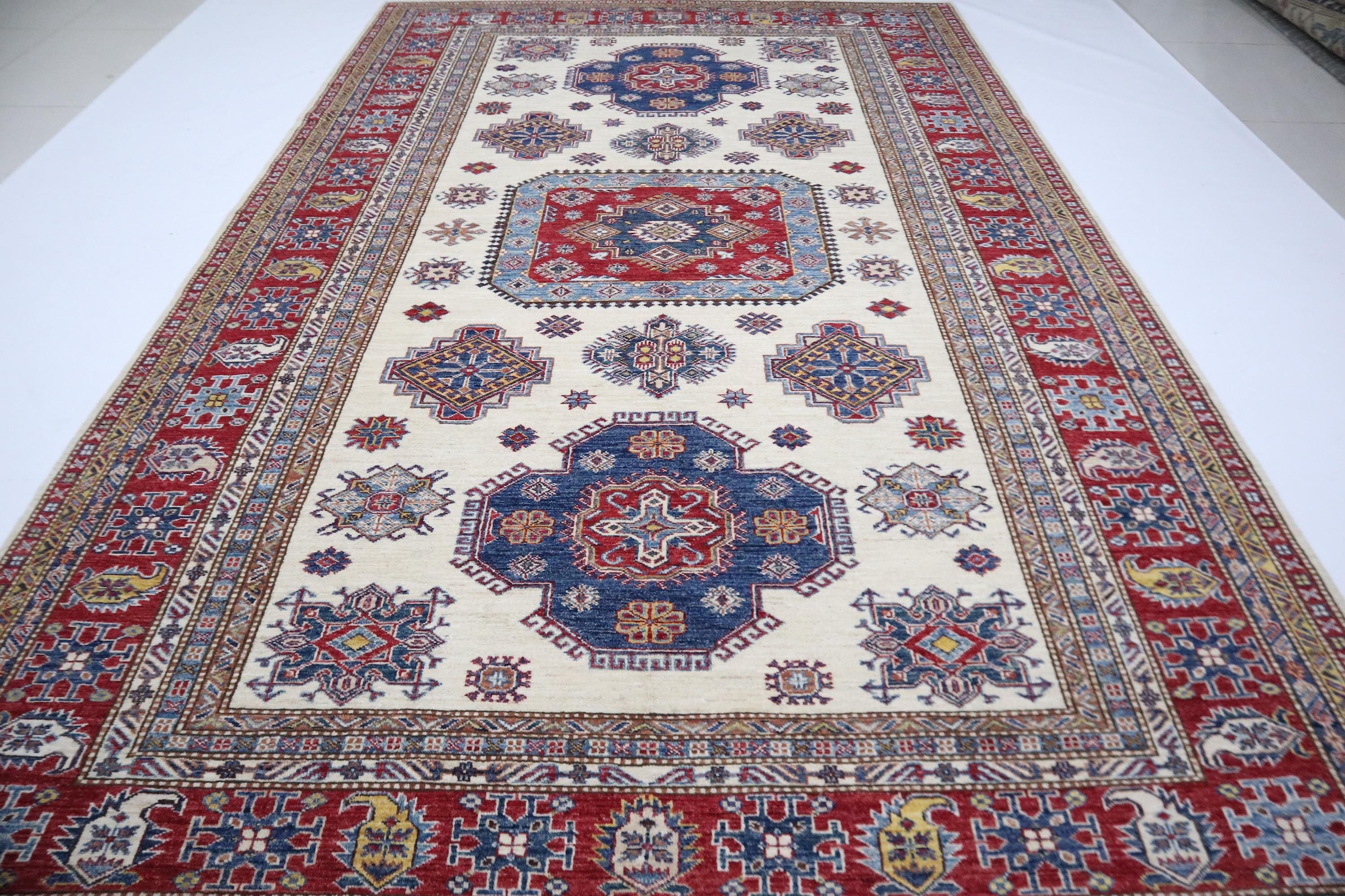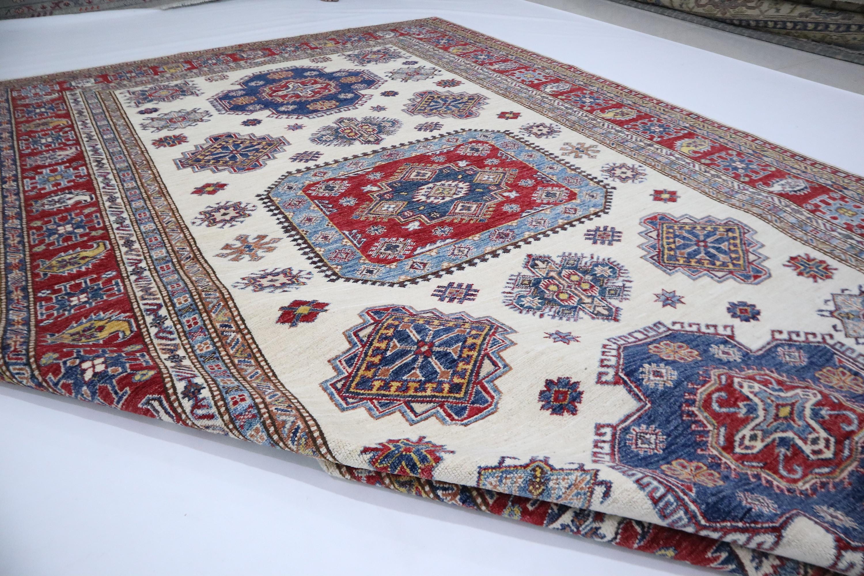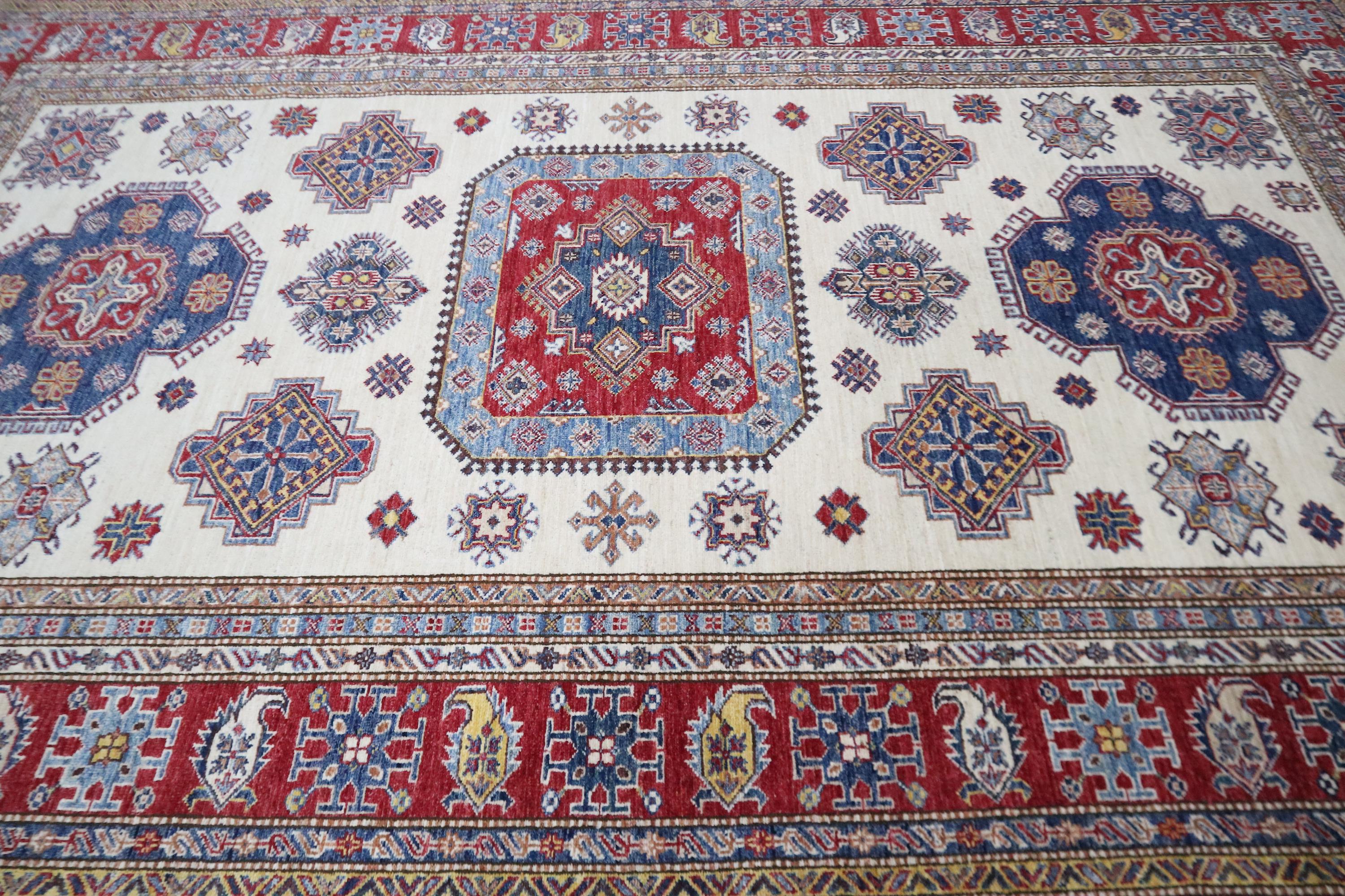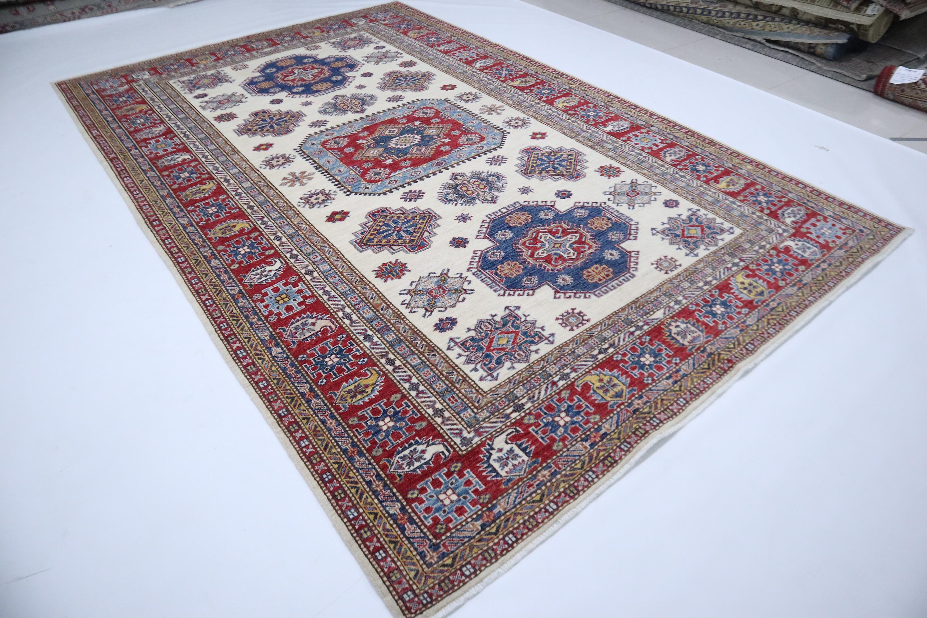 Hand Knotted 7x10 Kazak Area Rug - Beige Red Rug - Afghan Geometric Wool Rug - Traditional Rug - Bedroom Rug - Living Room Rug - Office Rug
