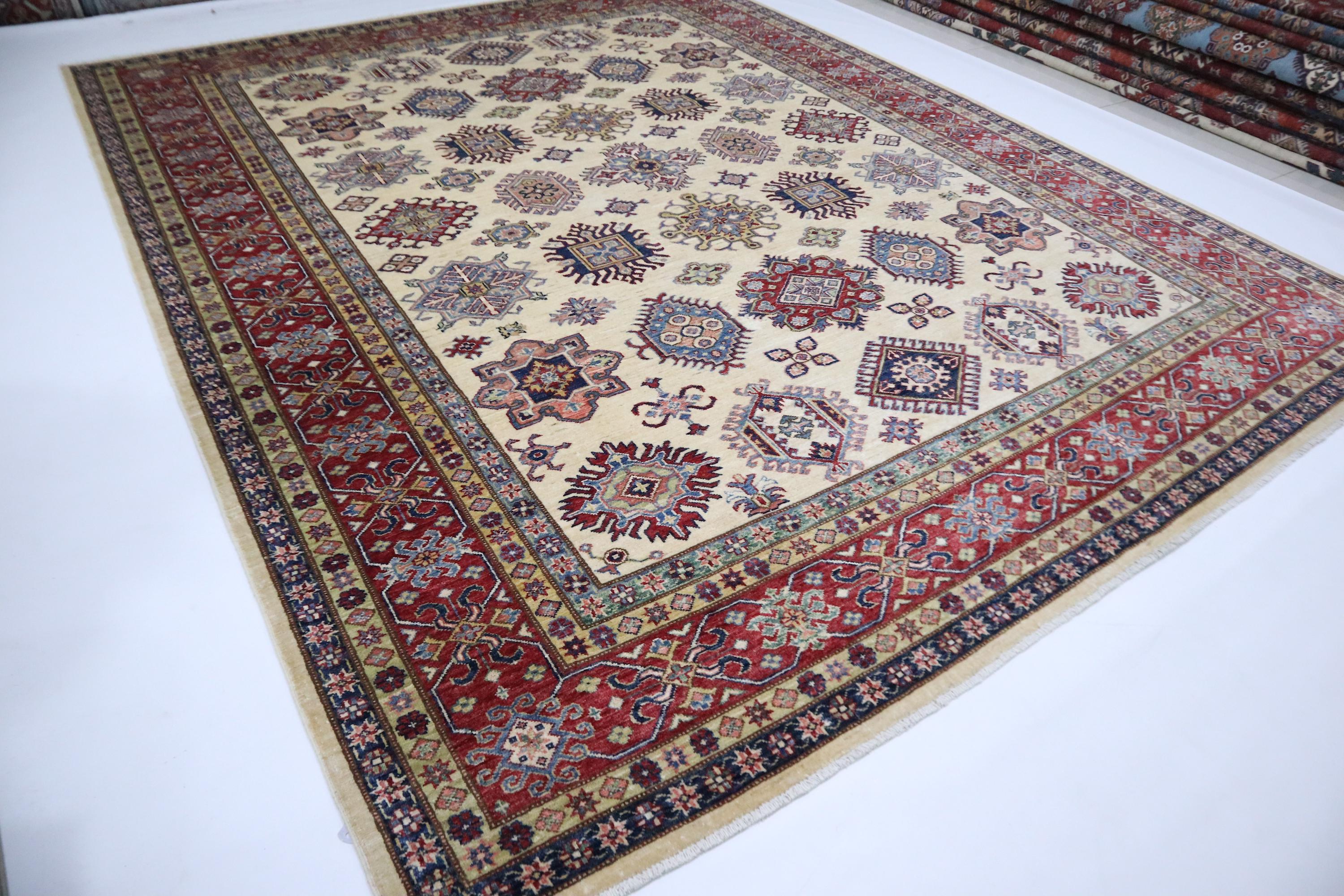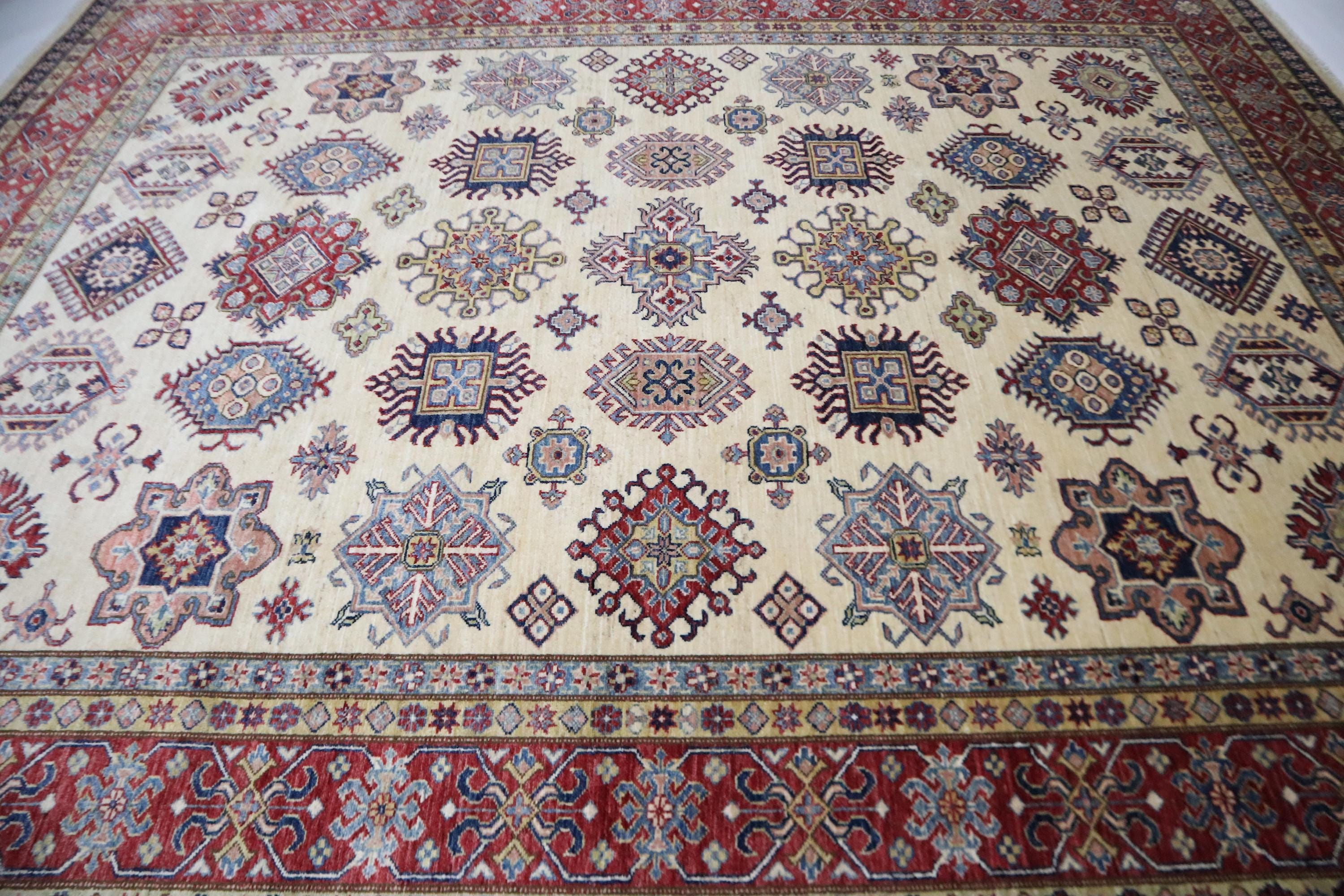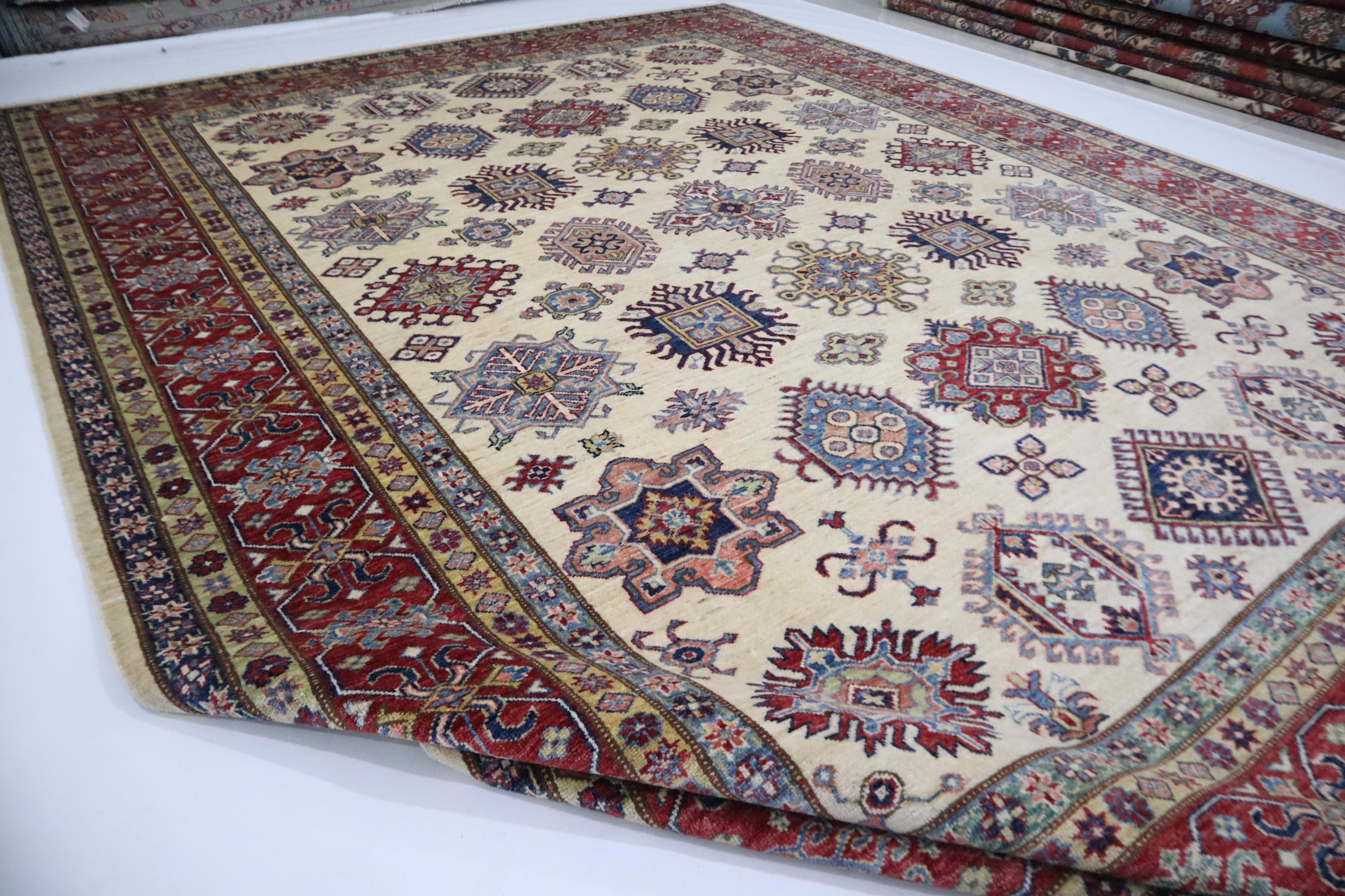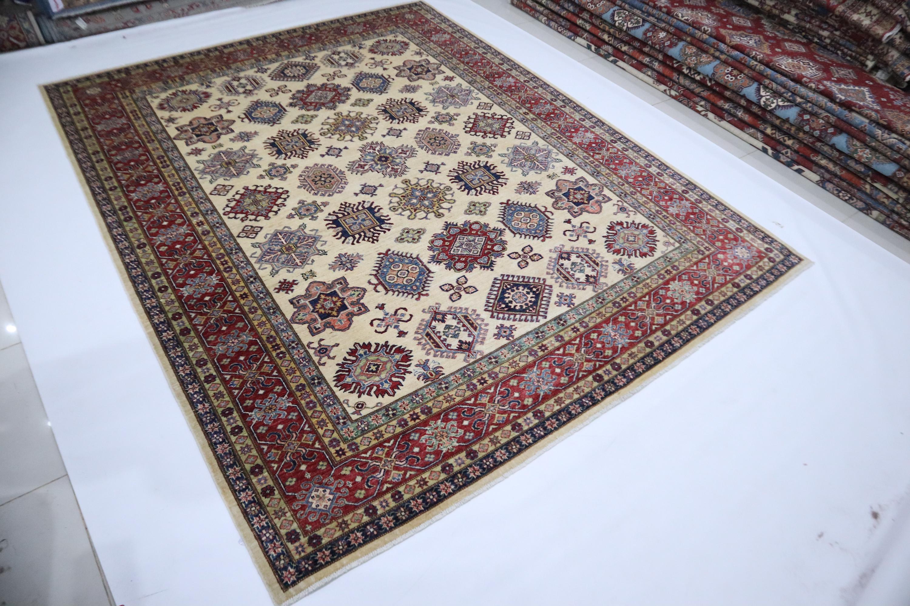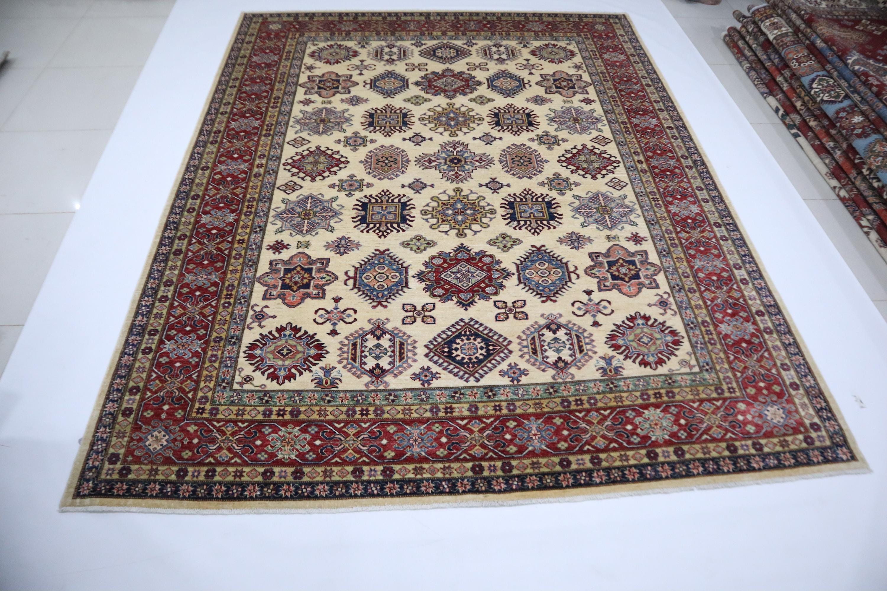 8x10 Kazak Area Rug - Beige Red Afghan Handmade Geometric Veg Dye Wool Rug - Traditional Rug - Oriental Rug - Bedroom Rug - Living Room Rug