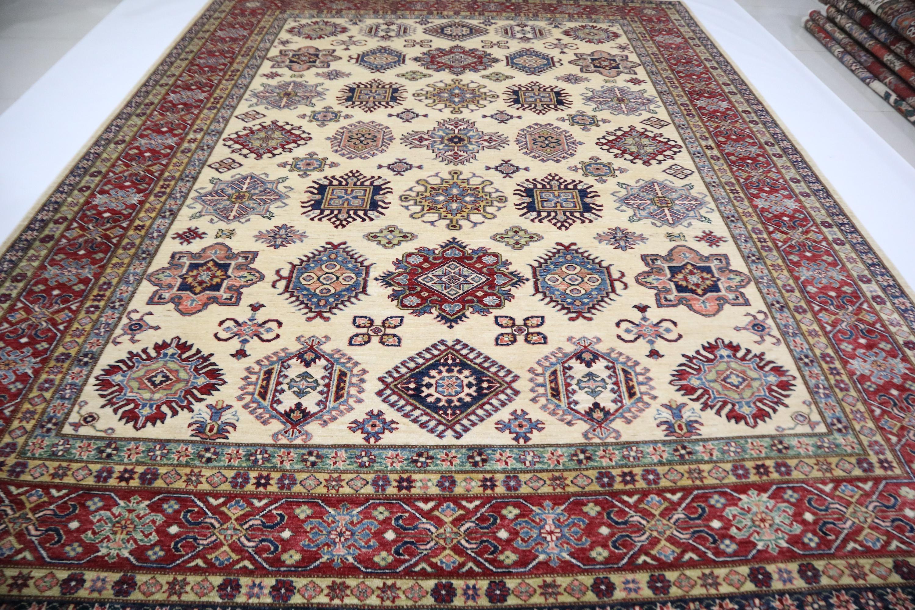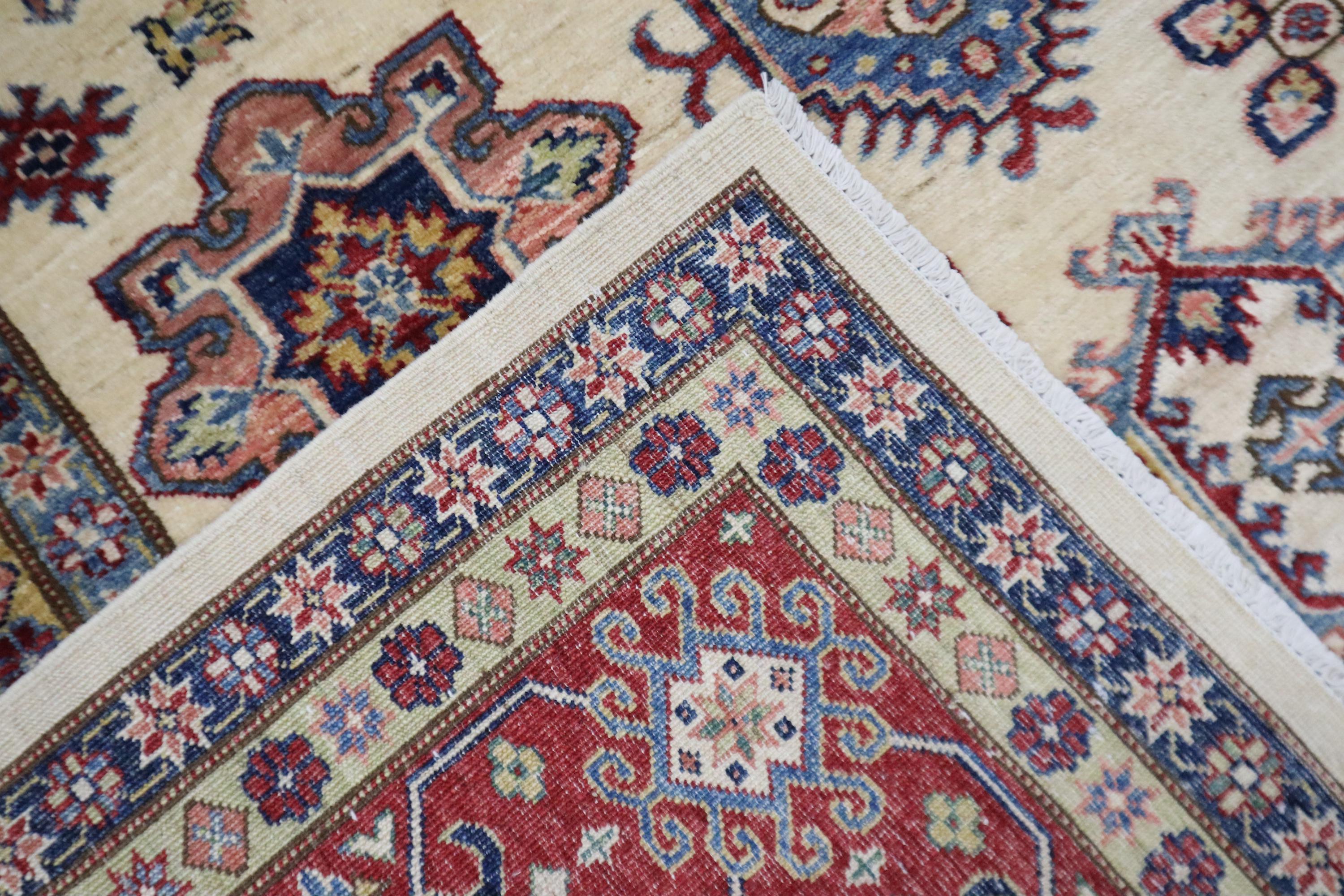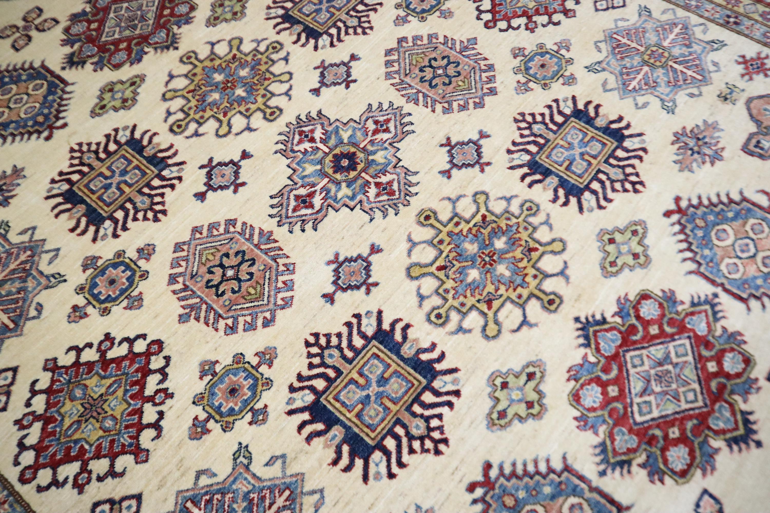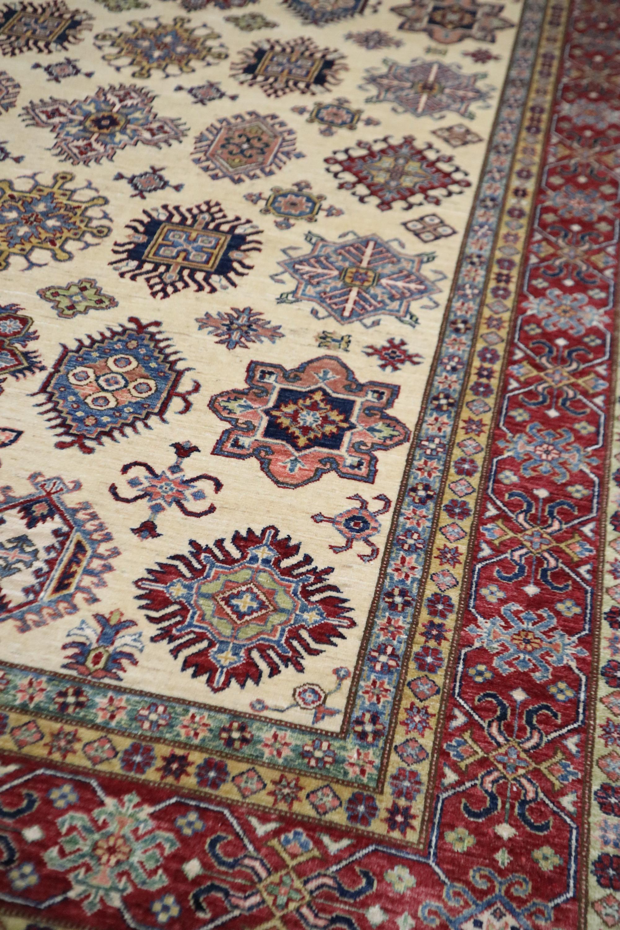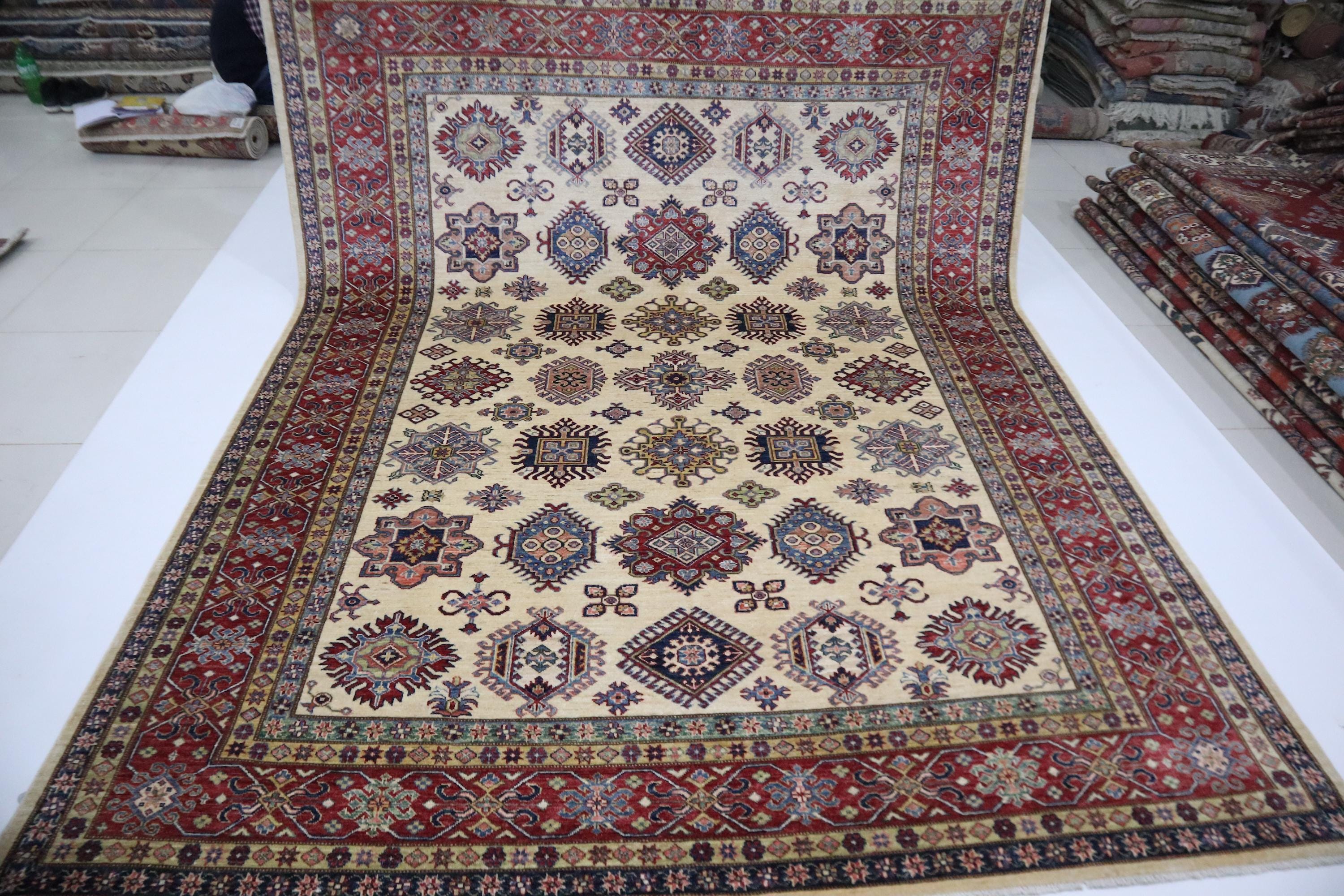 8x10 Kazak Area Rug - Beige Red Afghan Handmade Geometric Veg Dye Wool Rug - Traditional Rug - Oriental Rug - Bedroom Rug - Living Room Rug