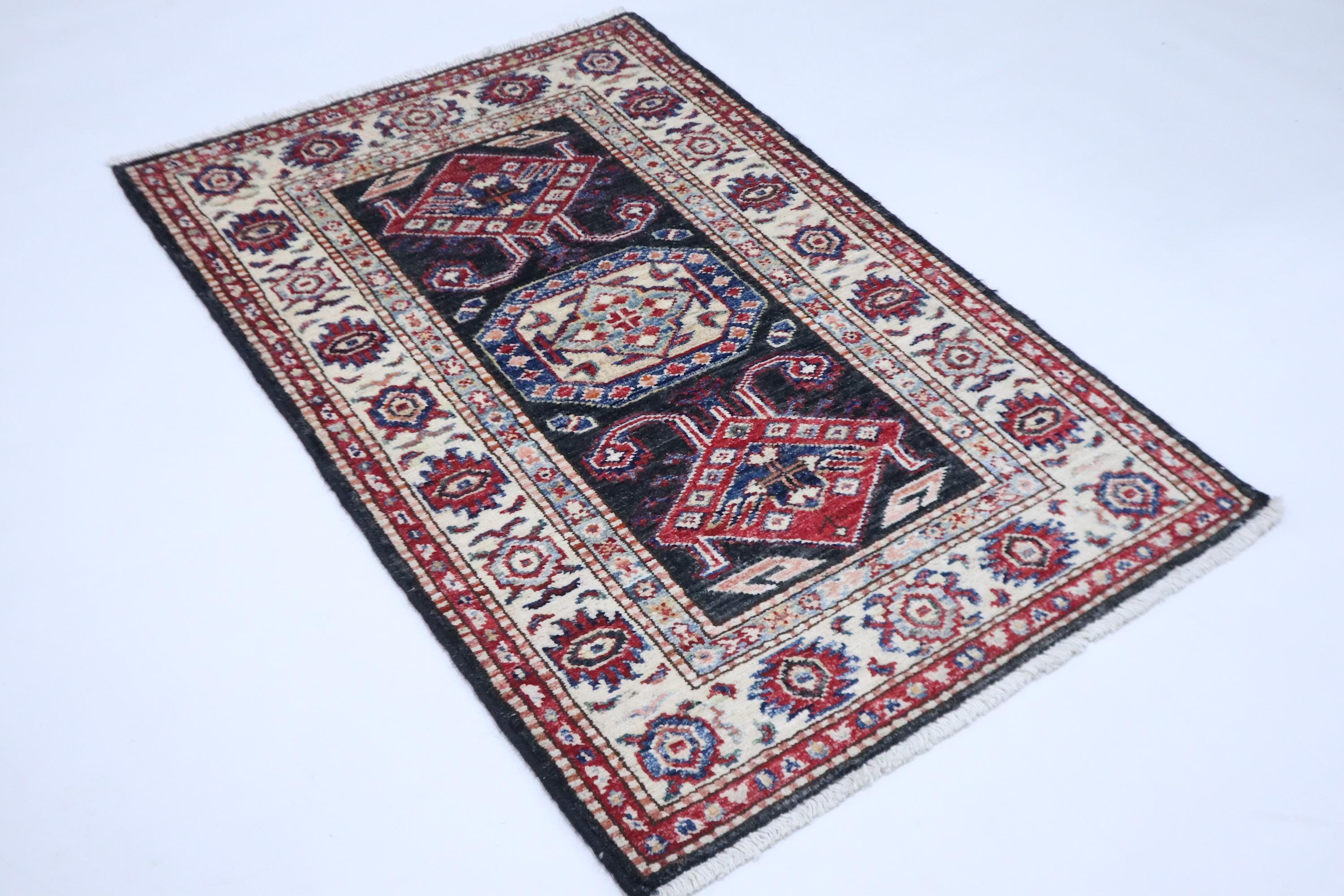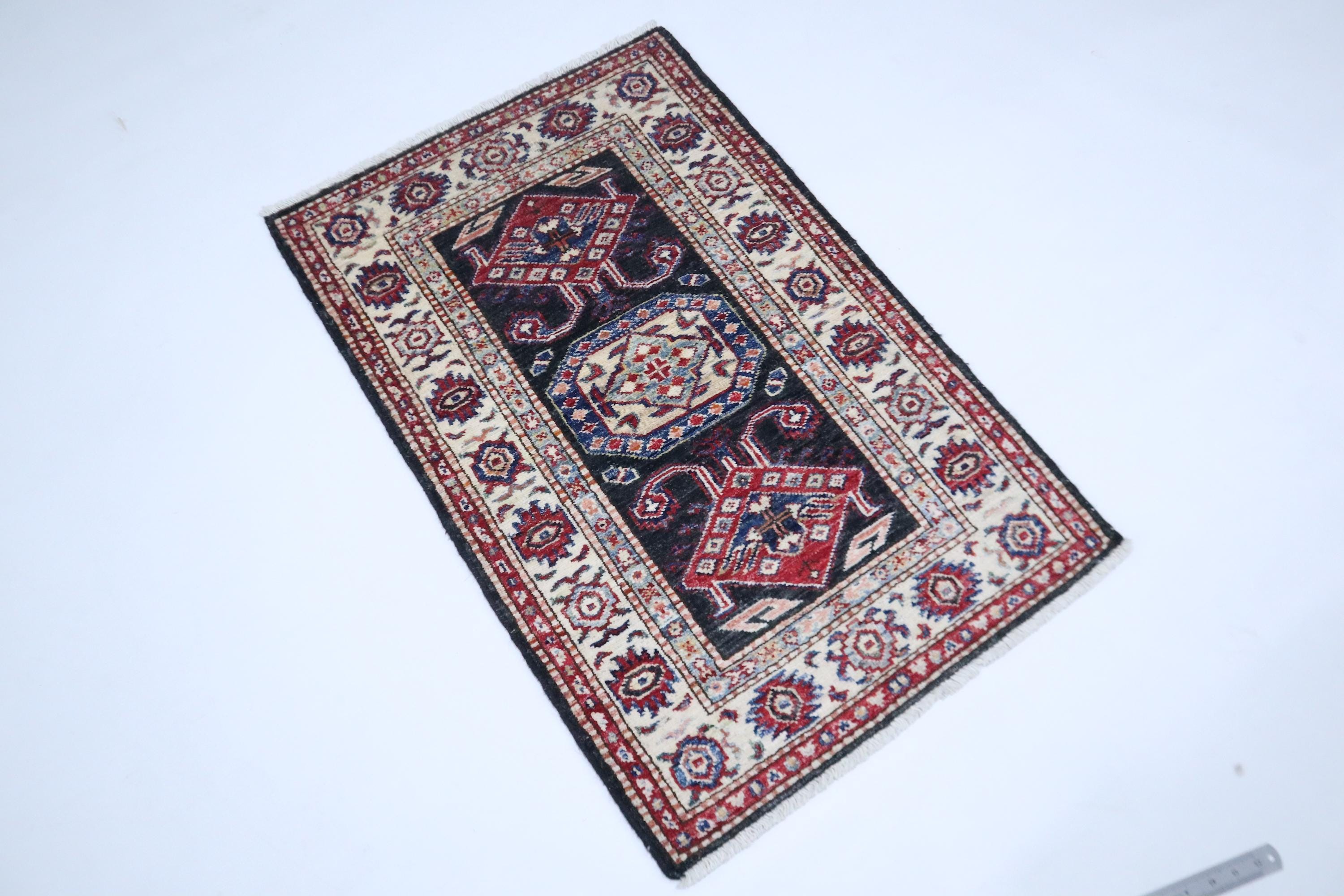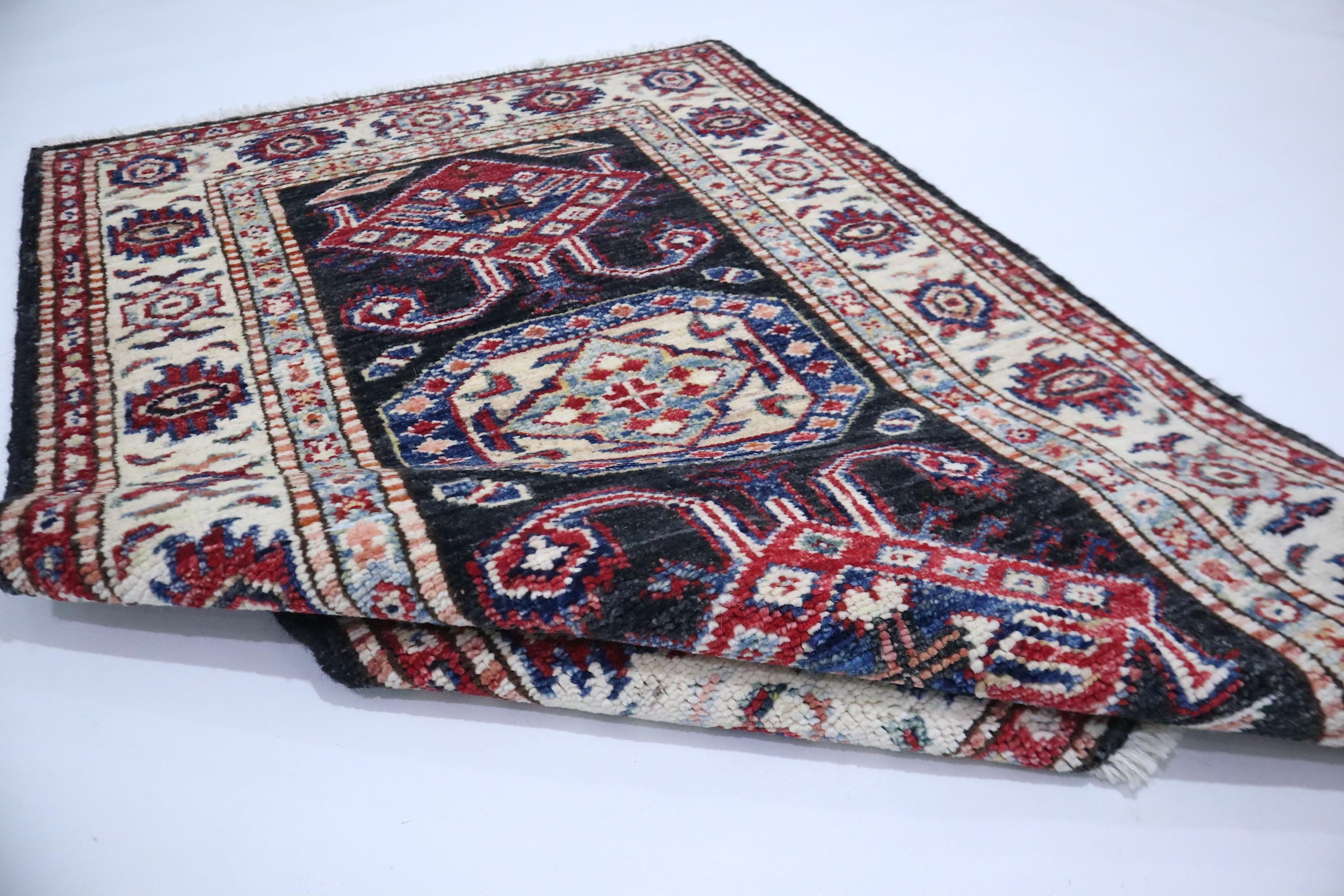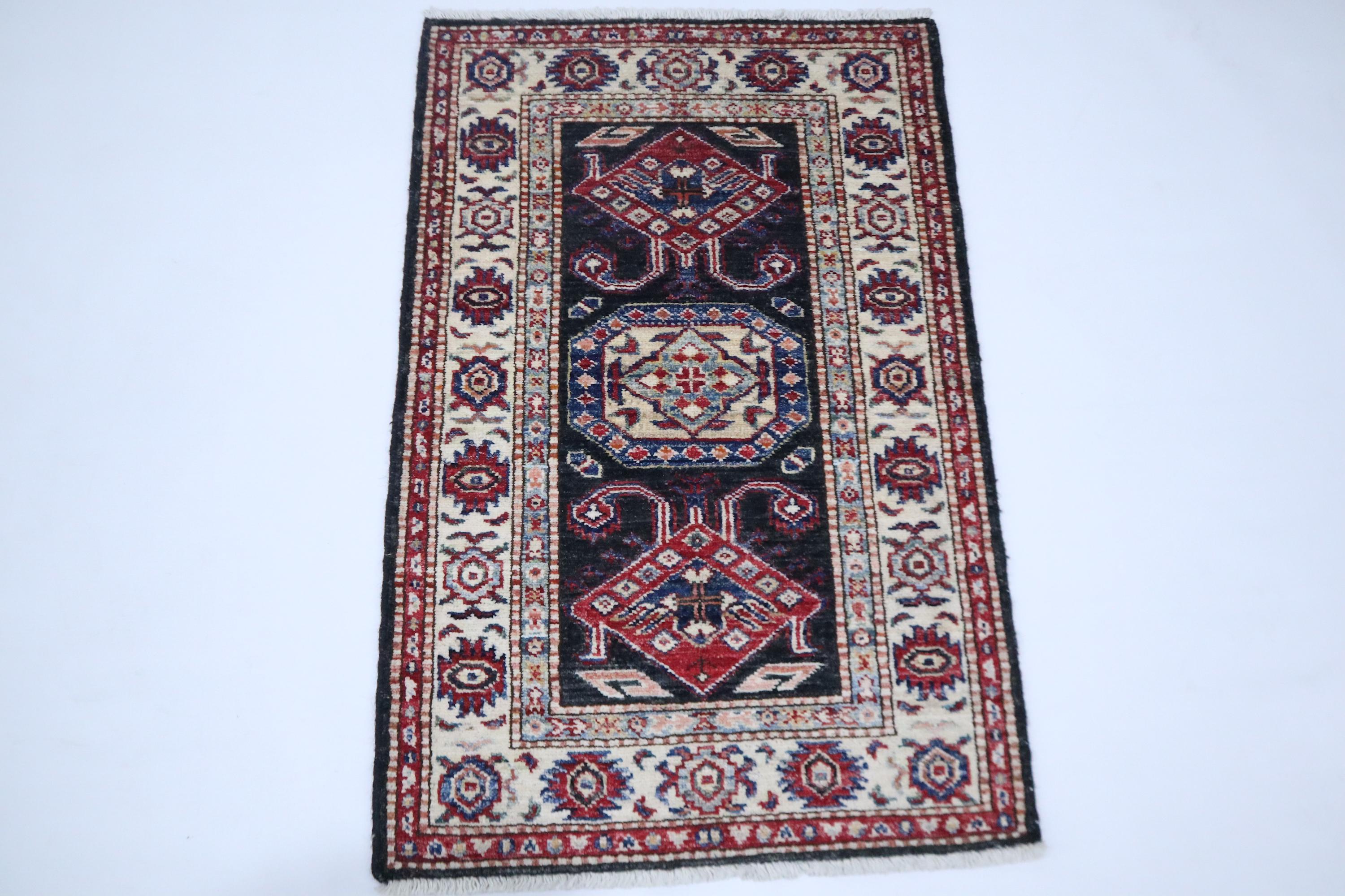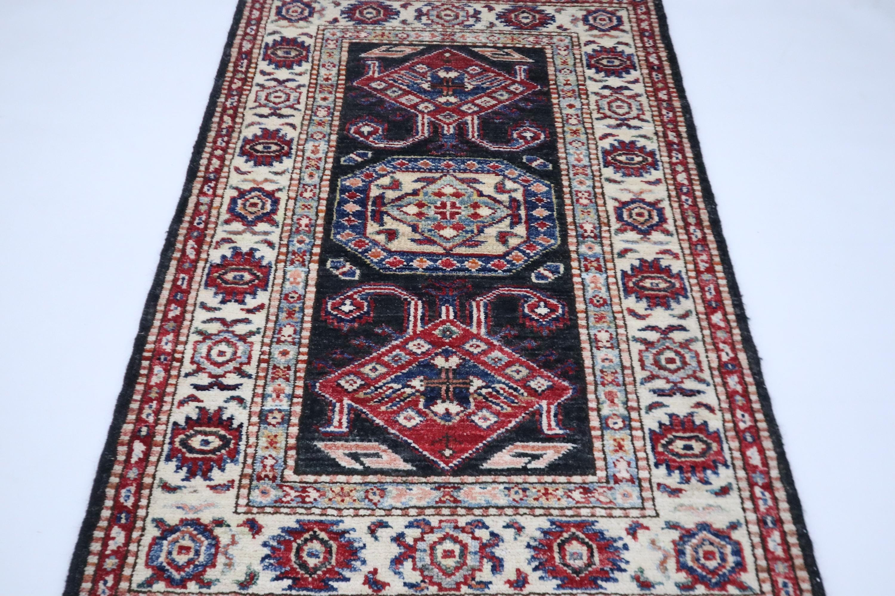 2x3 Black Kazak Area Rug - Afghan Hand Knotted Geometric Veg Dye Wool Rug - Caucasian Rug - Traditional Rug - Accent Rug - Dorm Rug - Rug