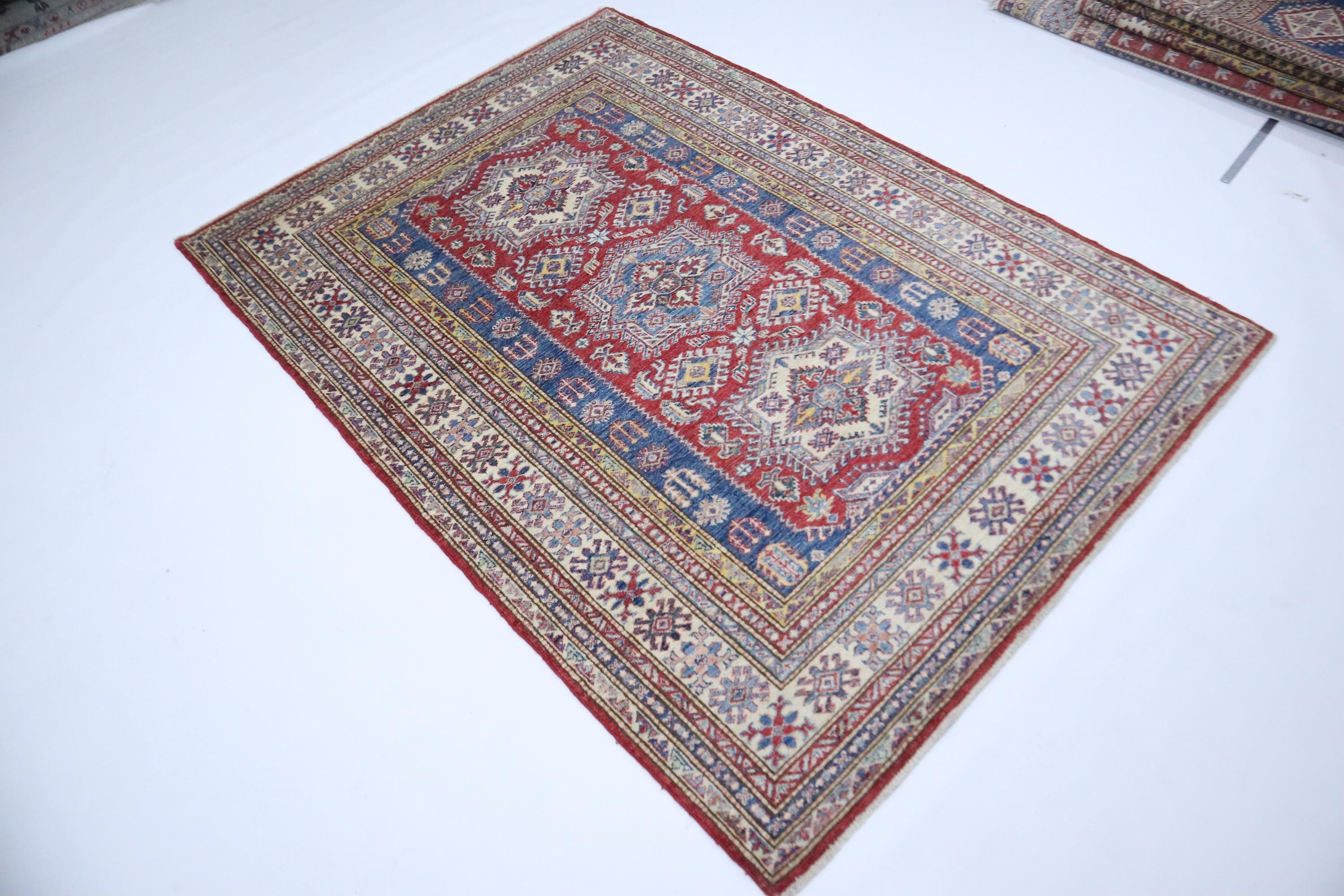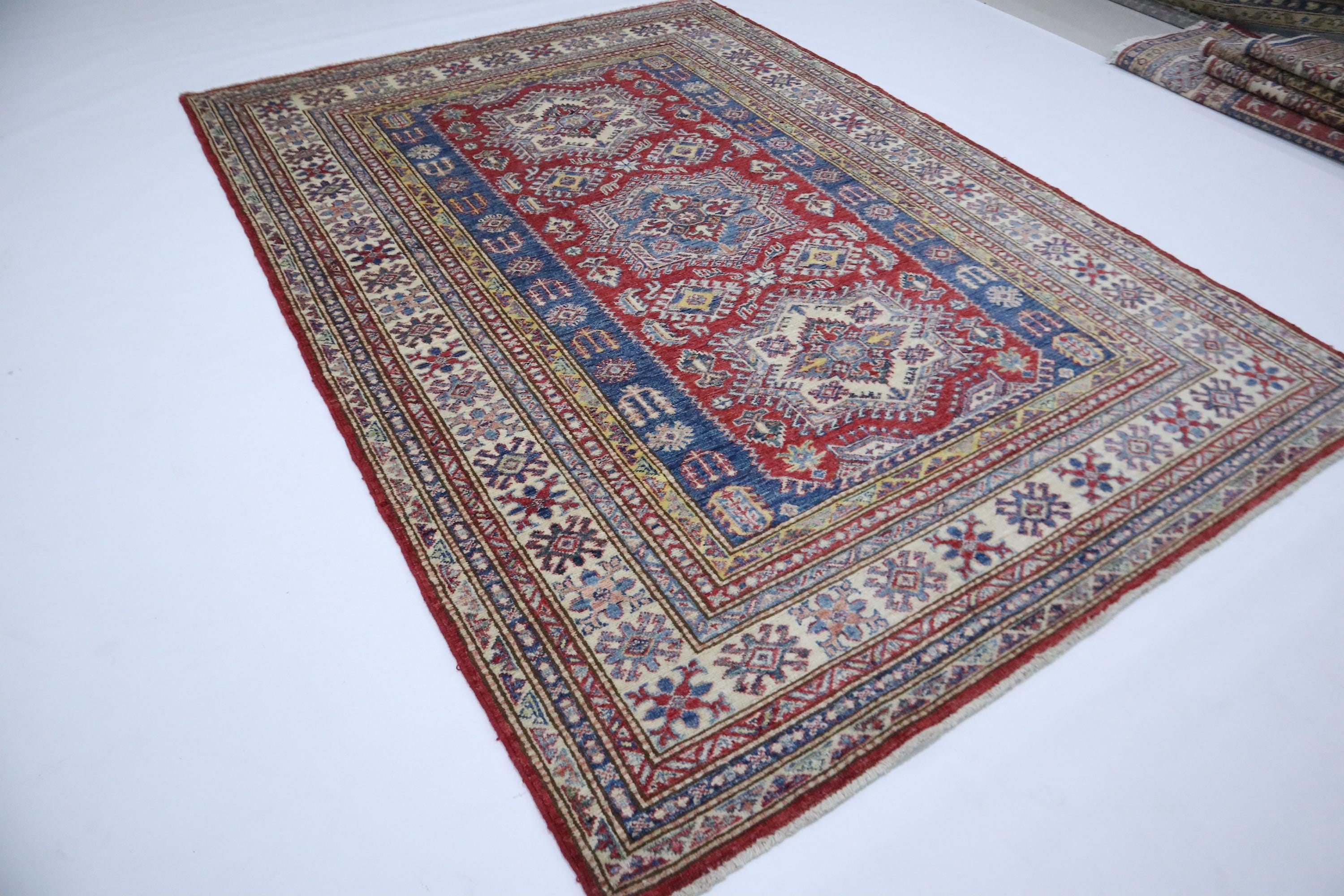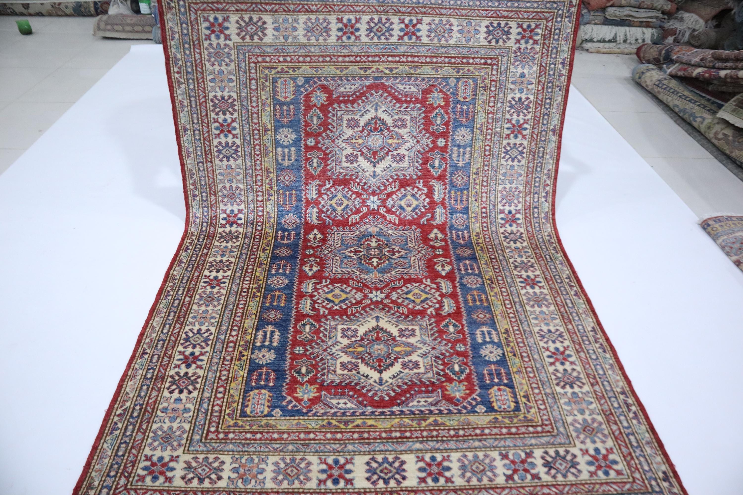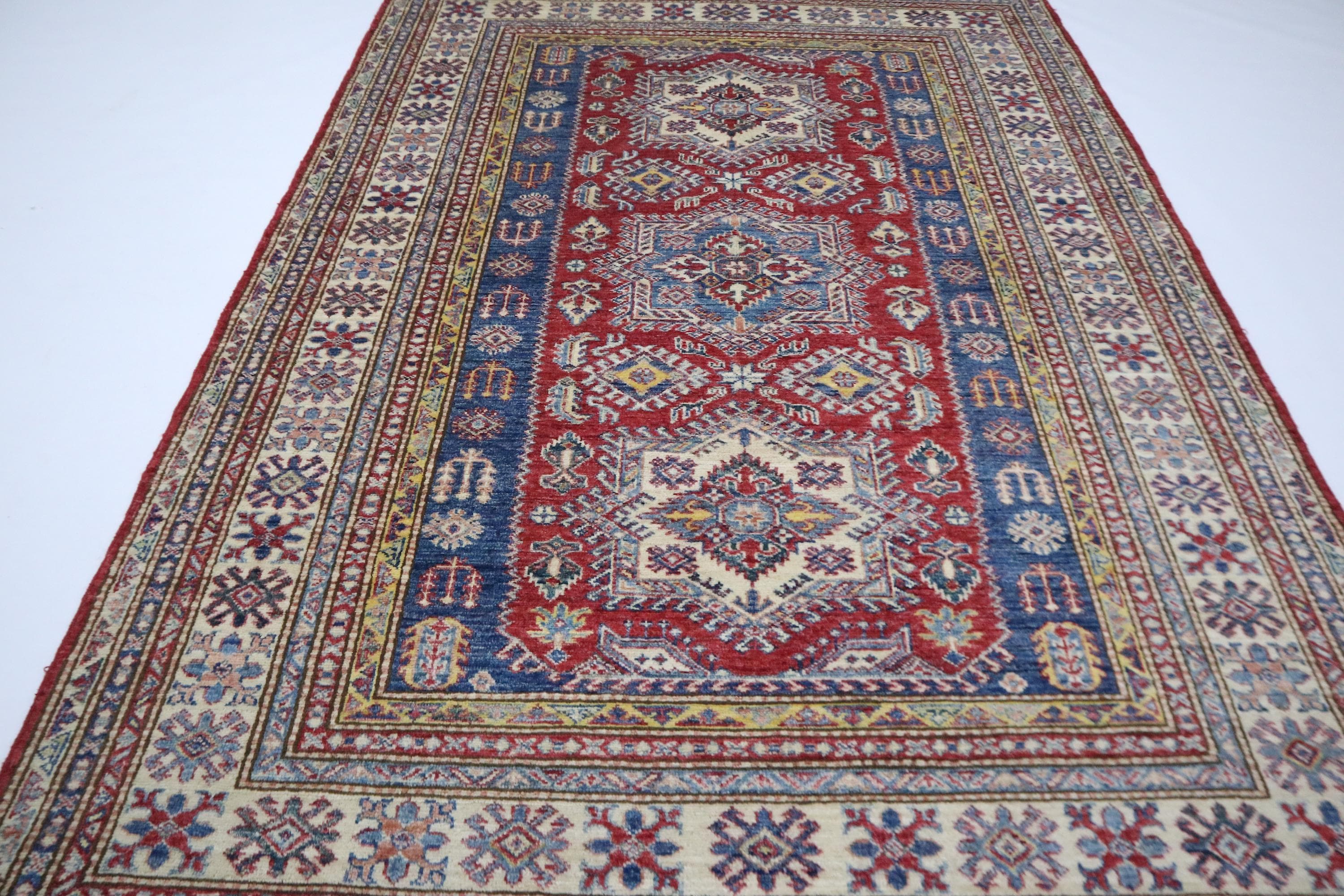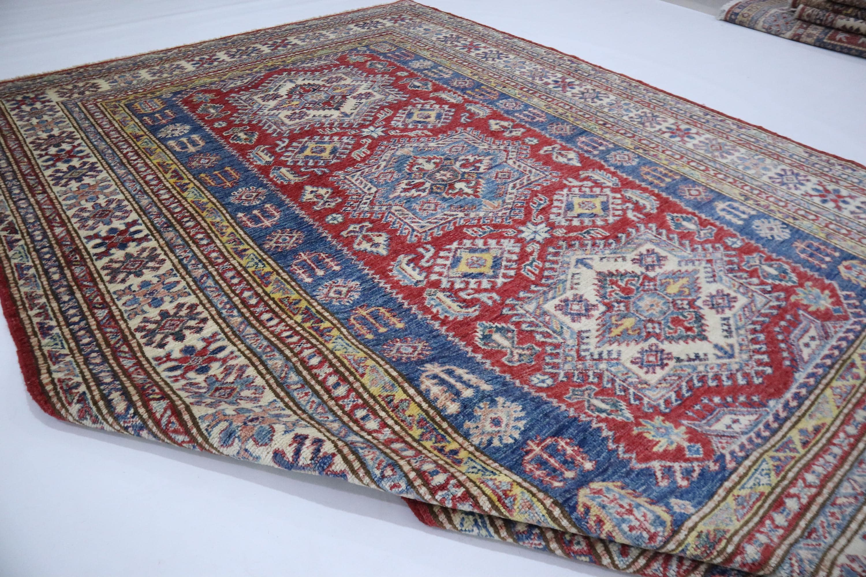 5x7 Ft Kazak Area Rug - Red Blue Afghan Handmade Traditional Organic Dye Wool Rug - Caucasian Rug - Oriental Rug - Bedroom Rug - Office Rug