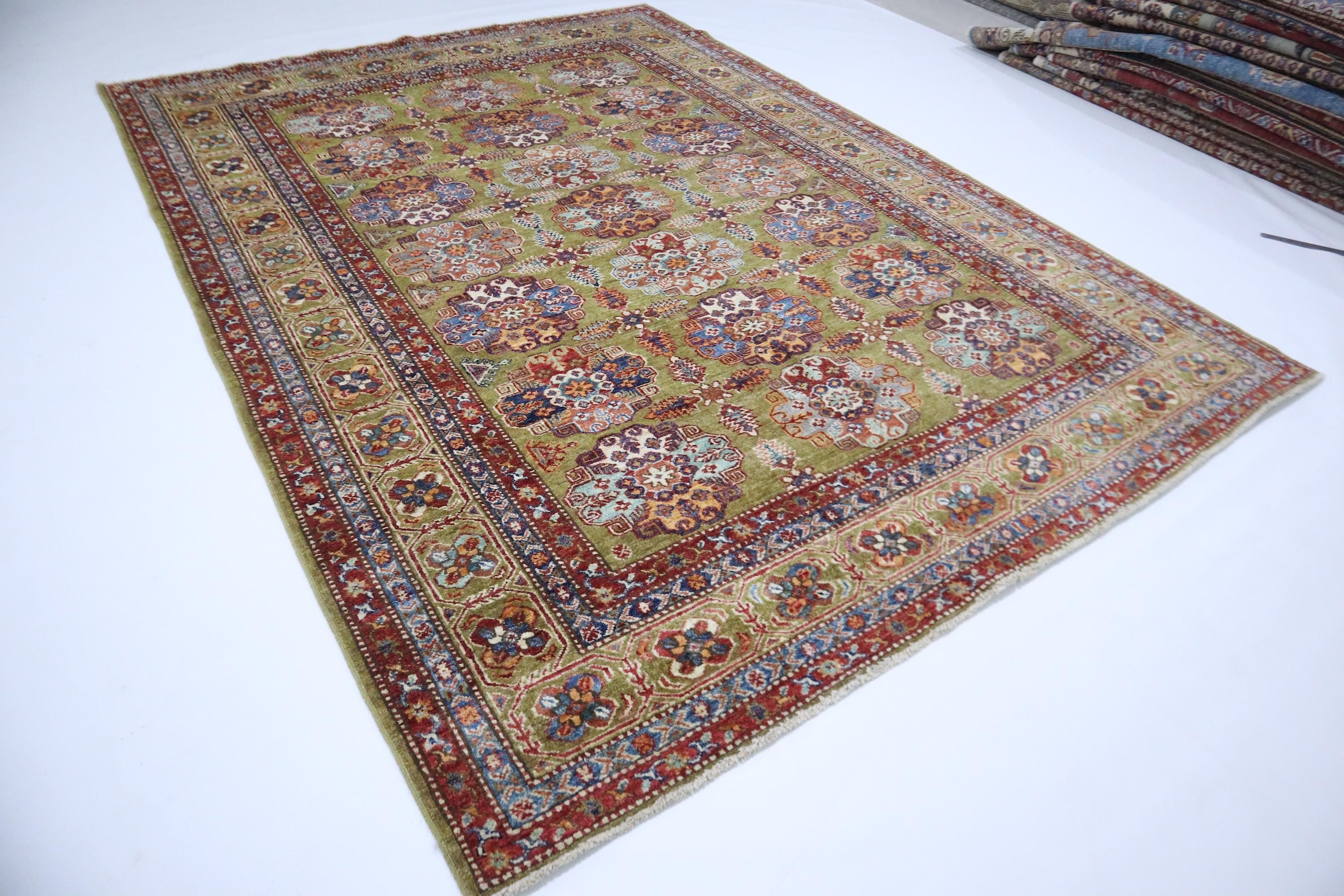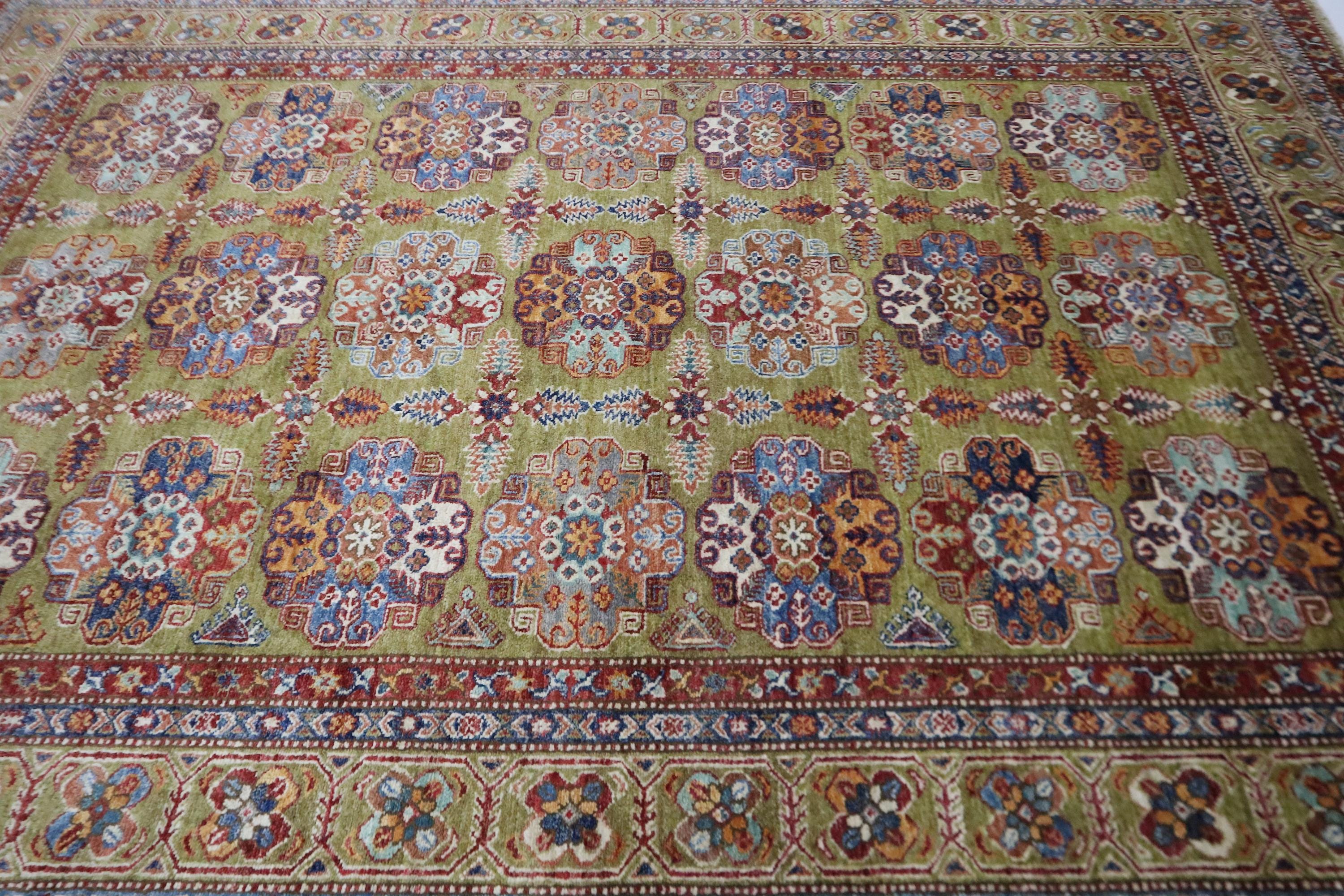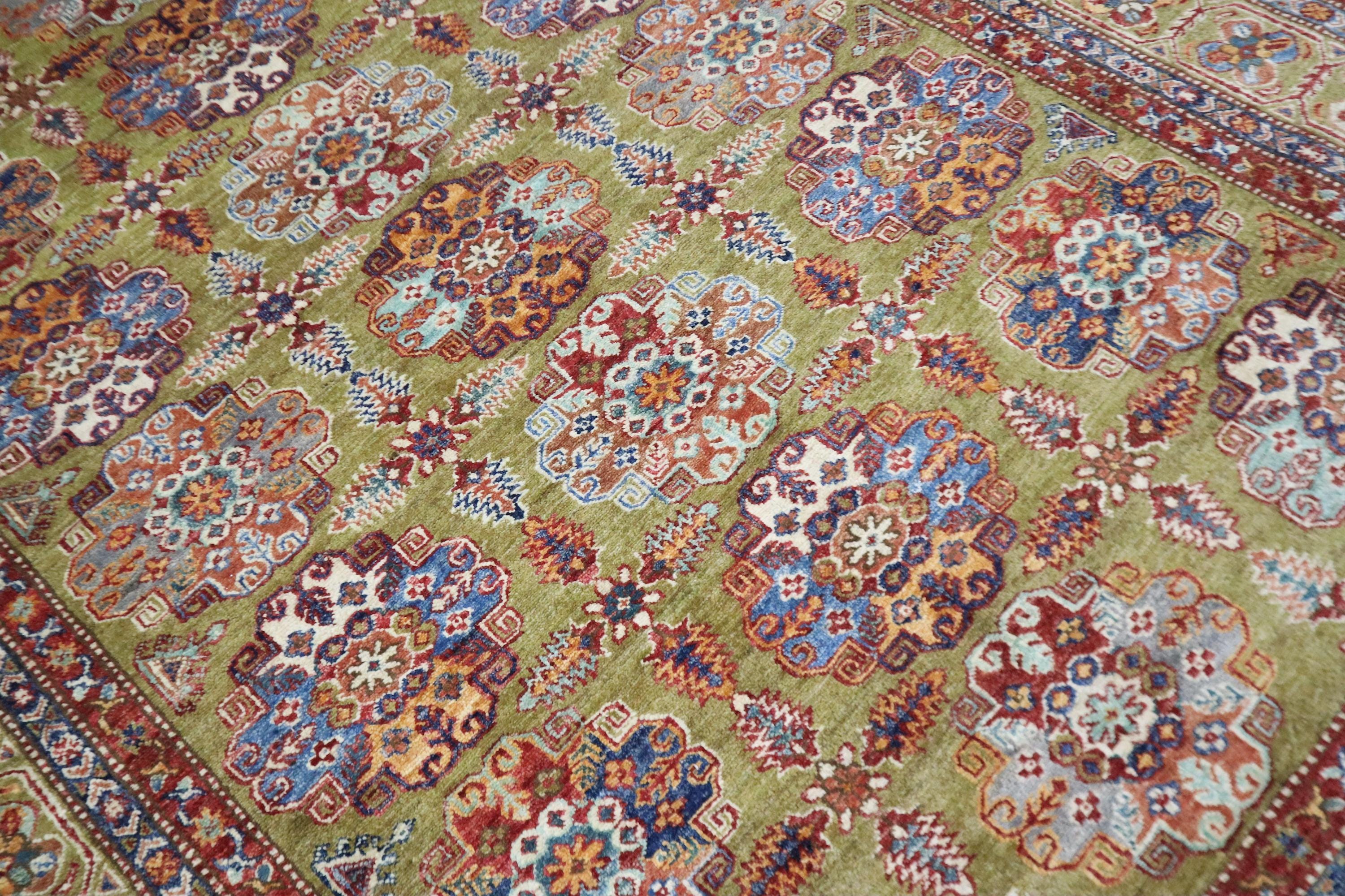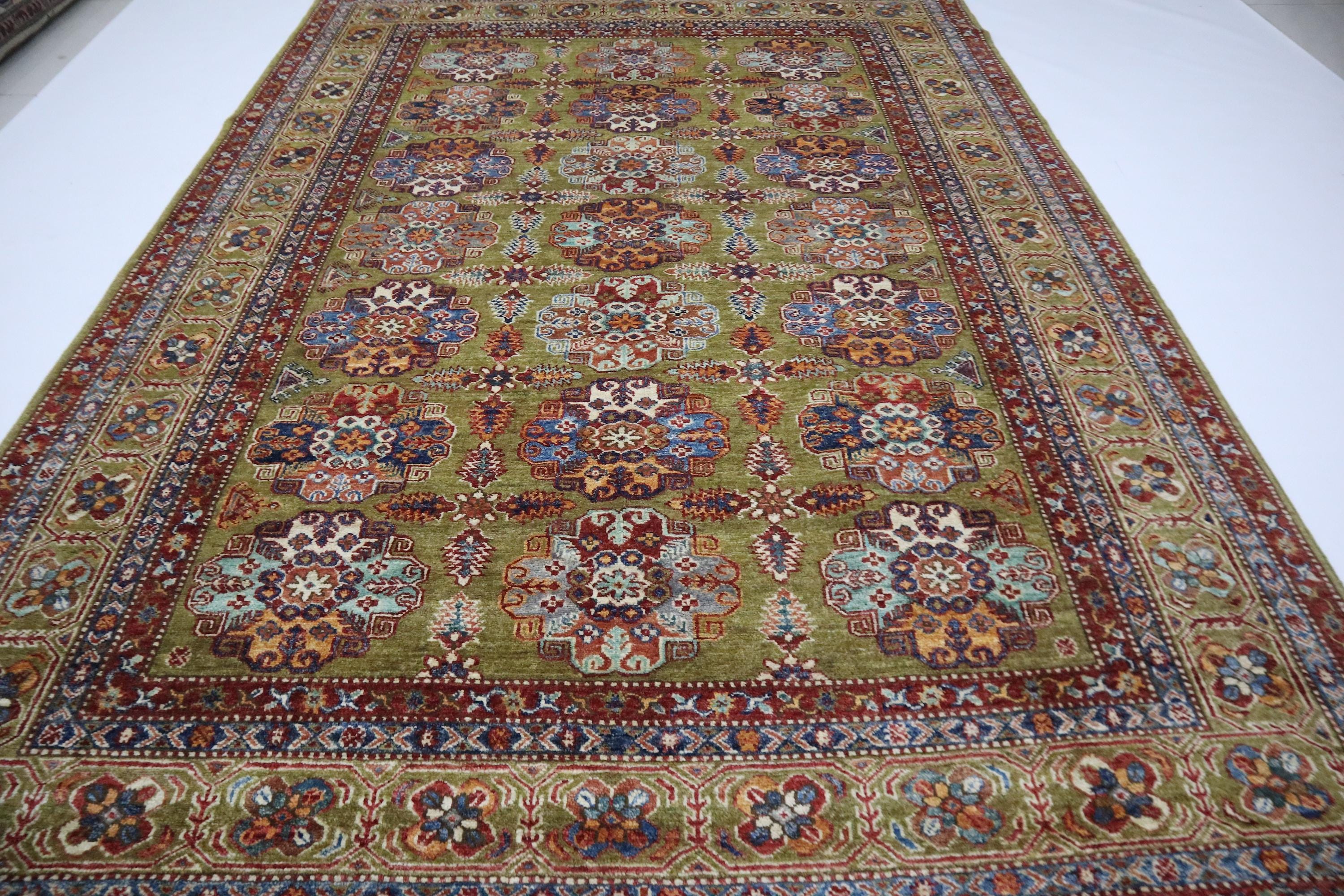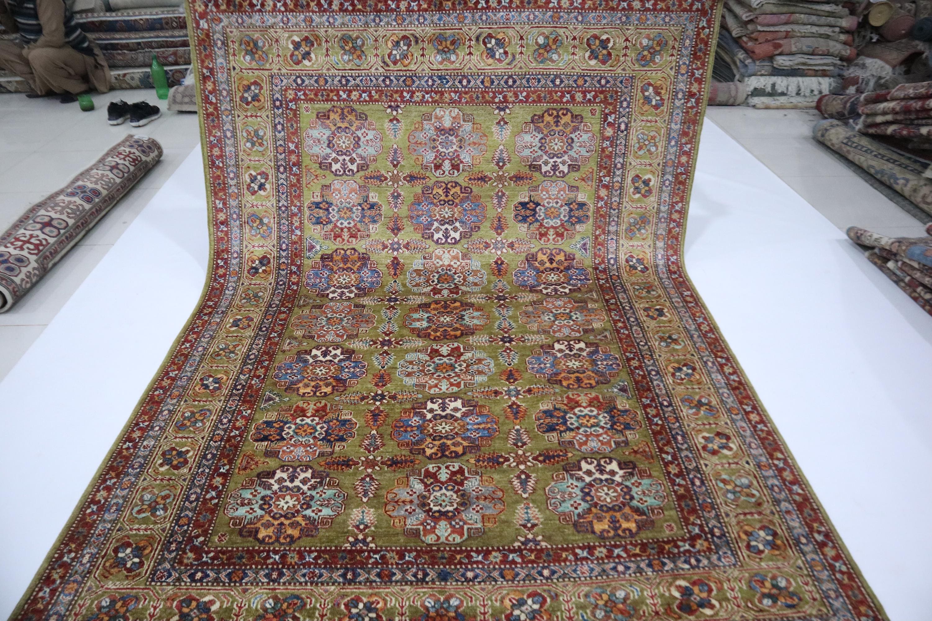 6x9 Feet Kazak Area Rug - Green Afghan Hand Knotted Geometric Organic Dye Wool Rug - Traditional Rug - Bedroom Rug - Living Room Rug